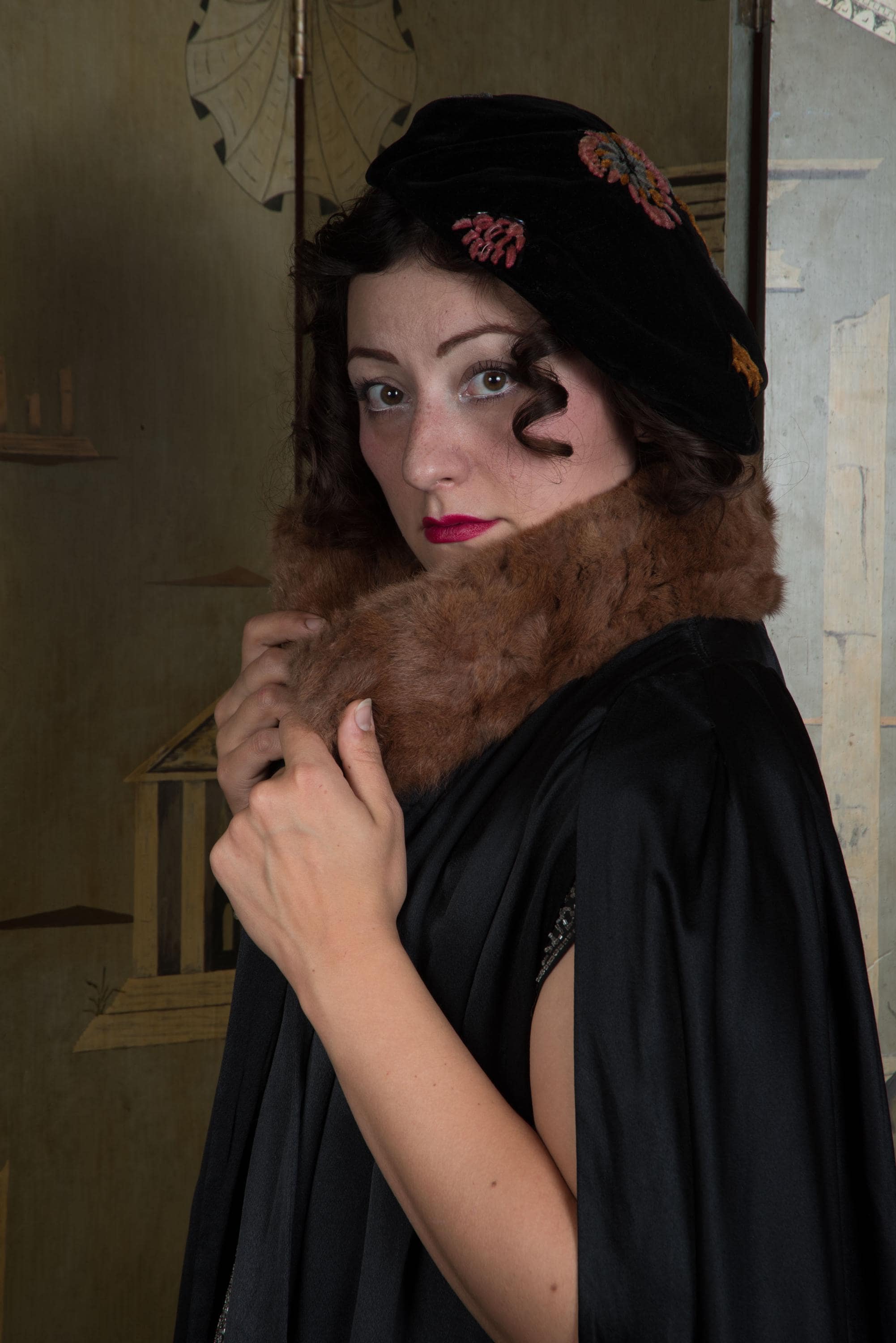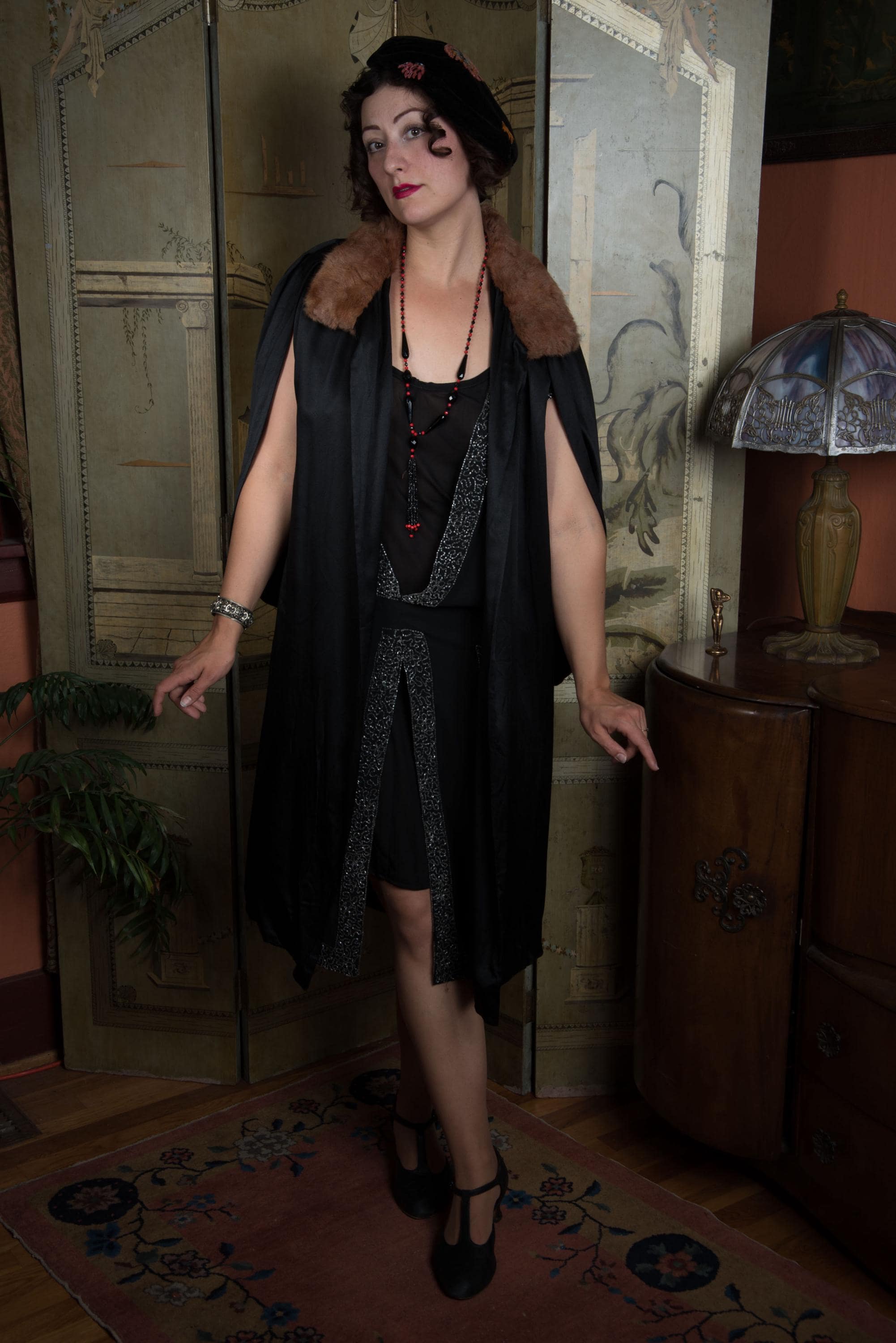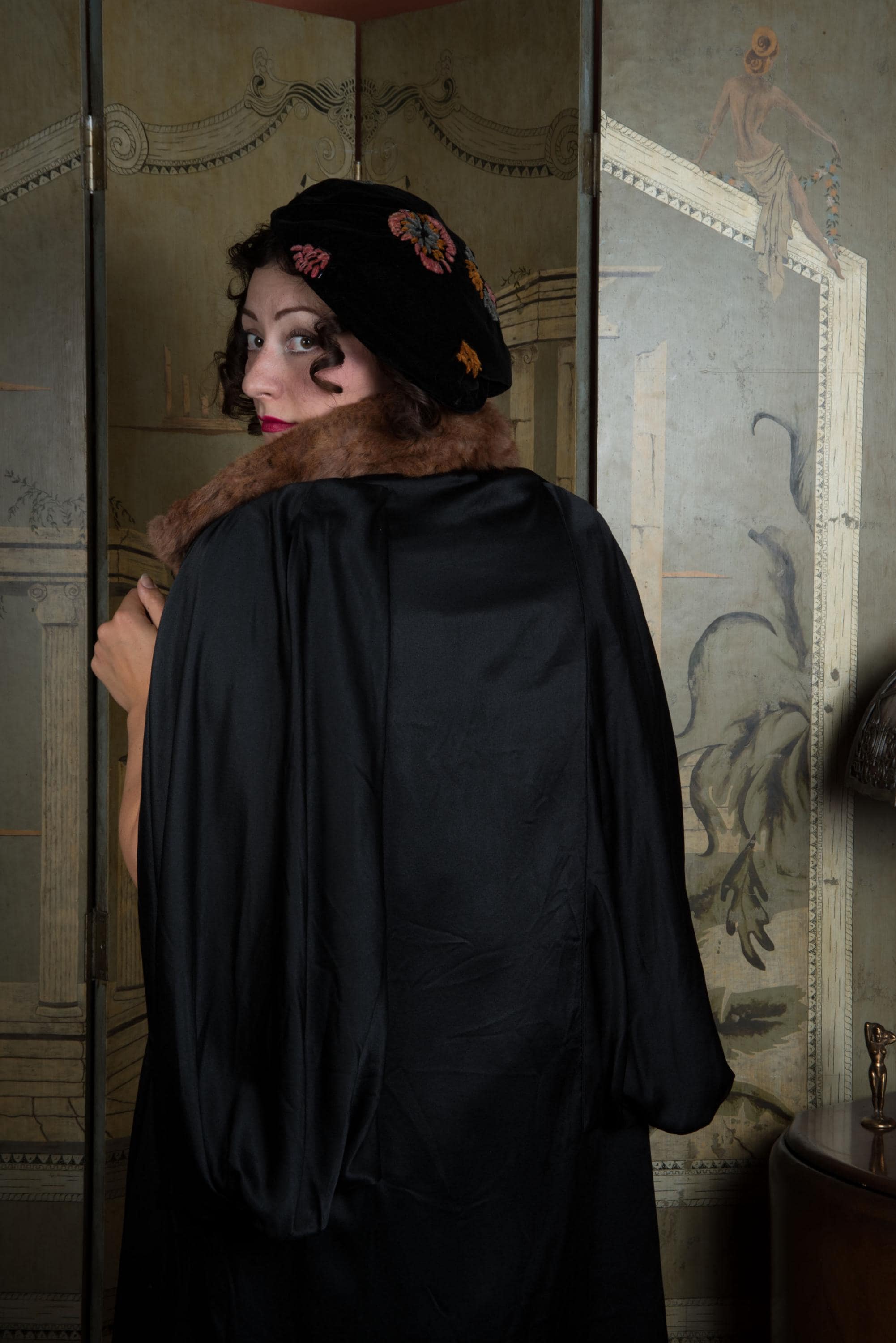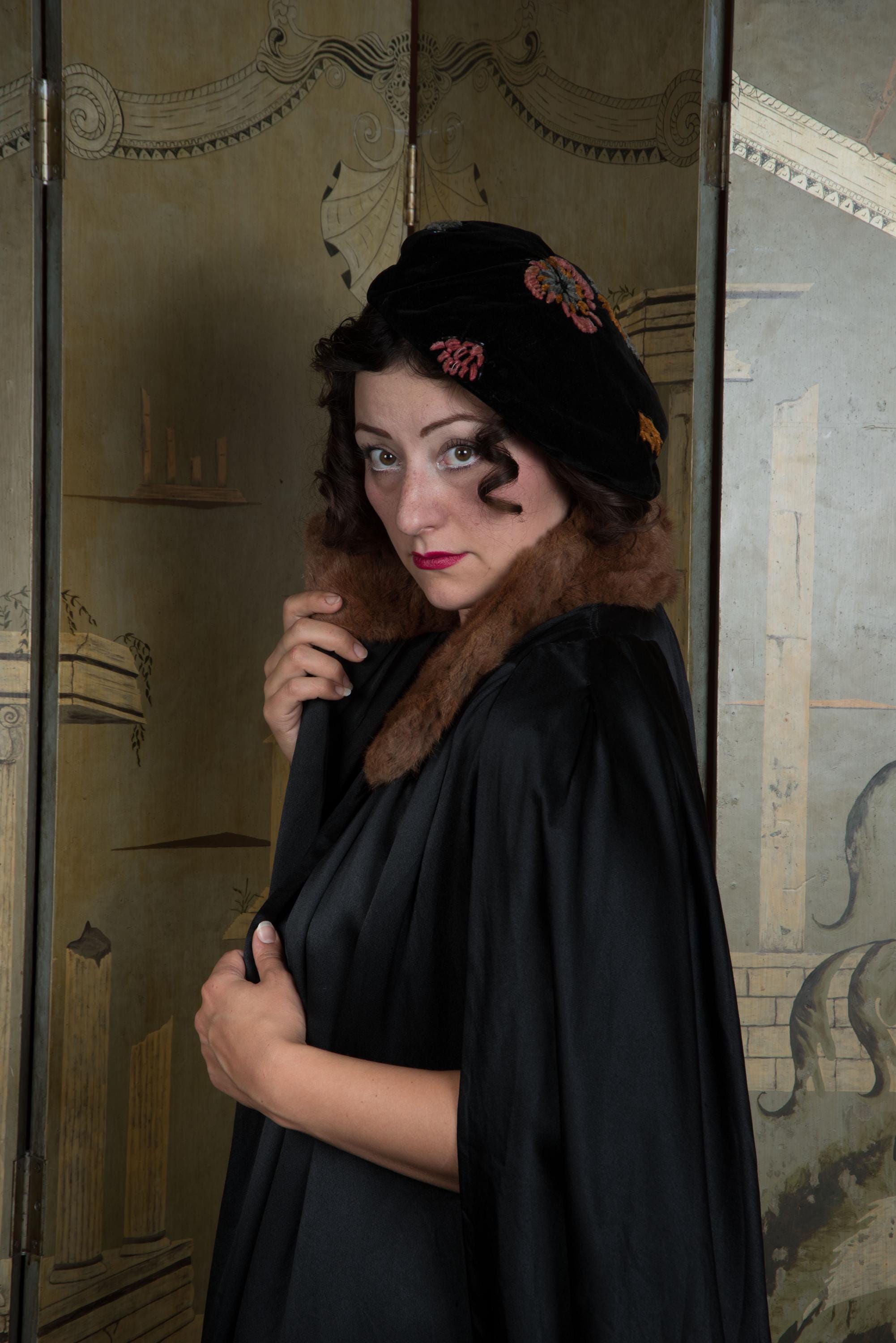 This cape has been gently hand cleaned from the shoulders down using a soaked sponge, and vinegar steamed to improve softness and gleam. The charmeuse is sleek and supple - not a hint of dryness. The crepe de chine lining has a light water line from where I had to stop, to preserve the fur collar, and is slightly dry, but still strong, not at risk for breaking - it just tends to hold wrinkles. I find no other issues to note!