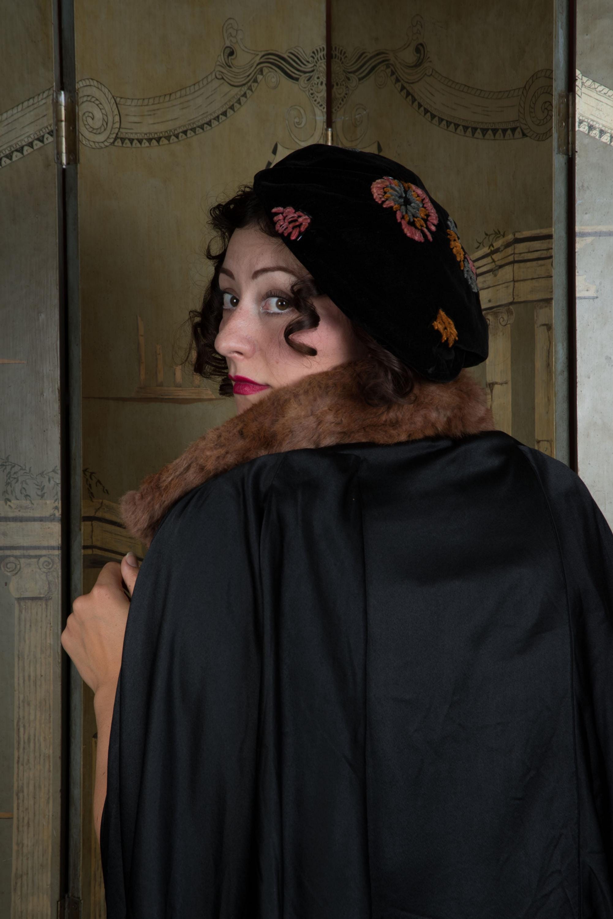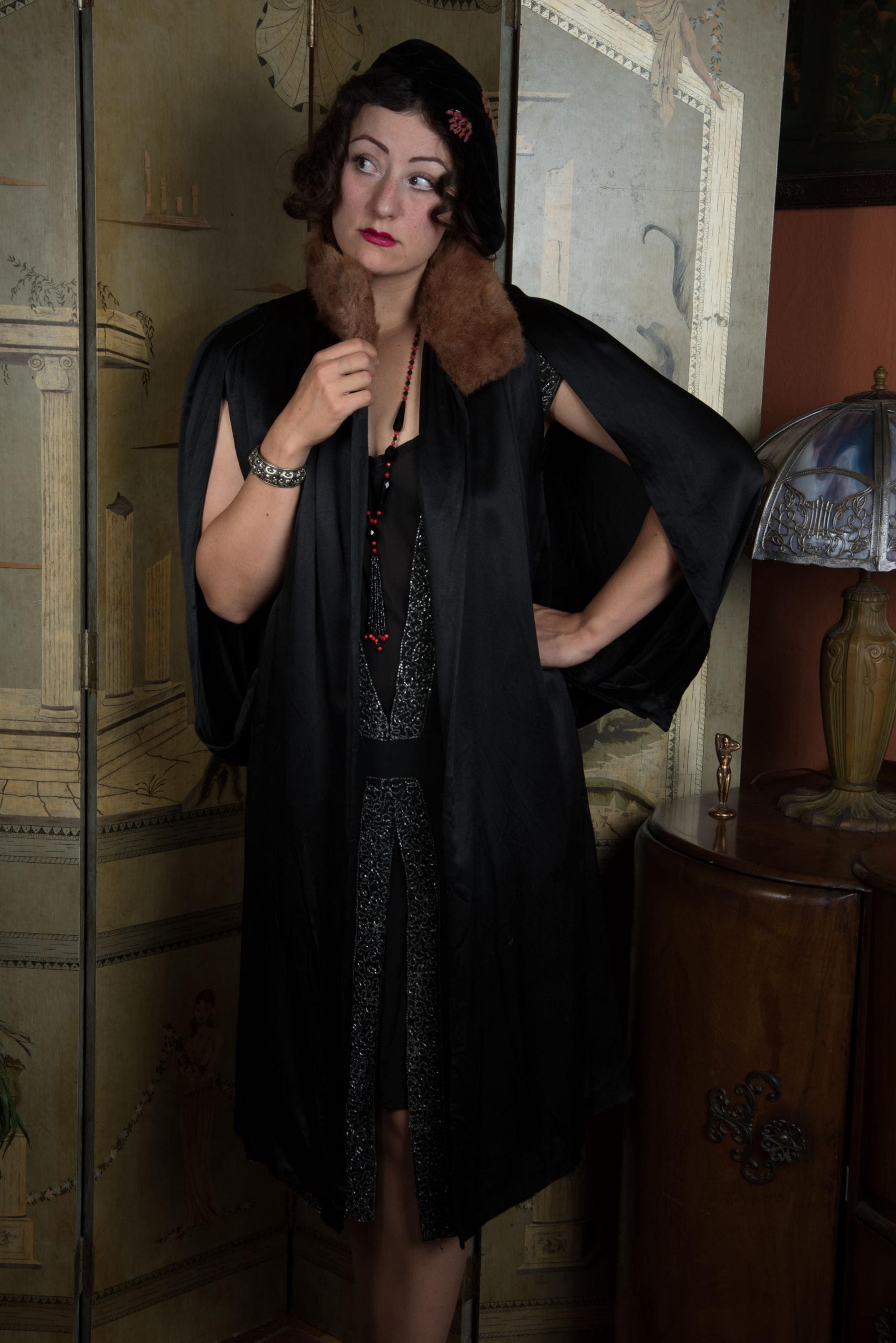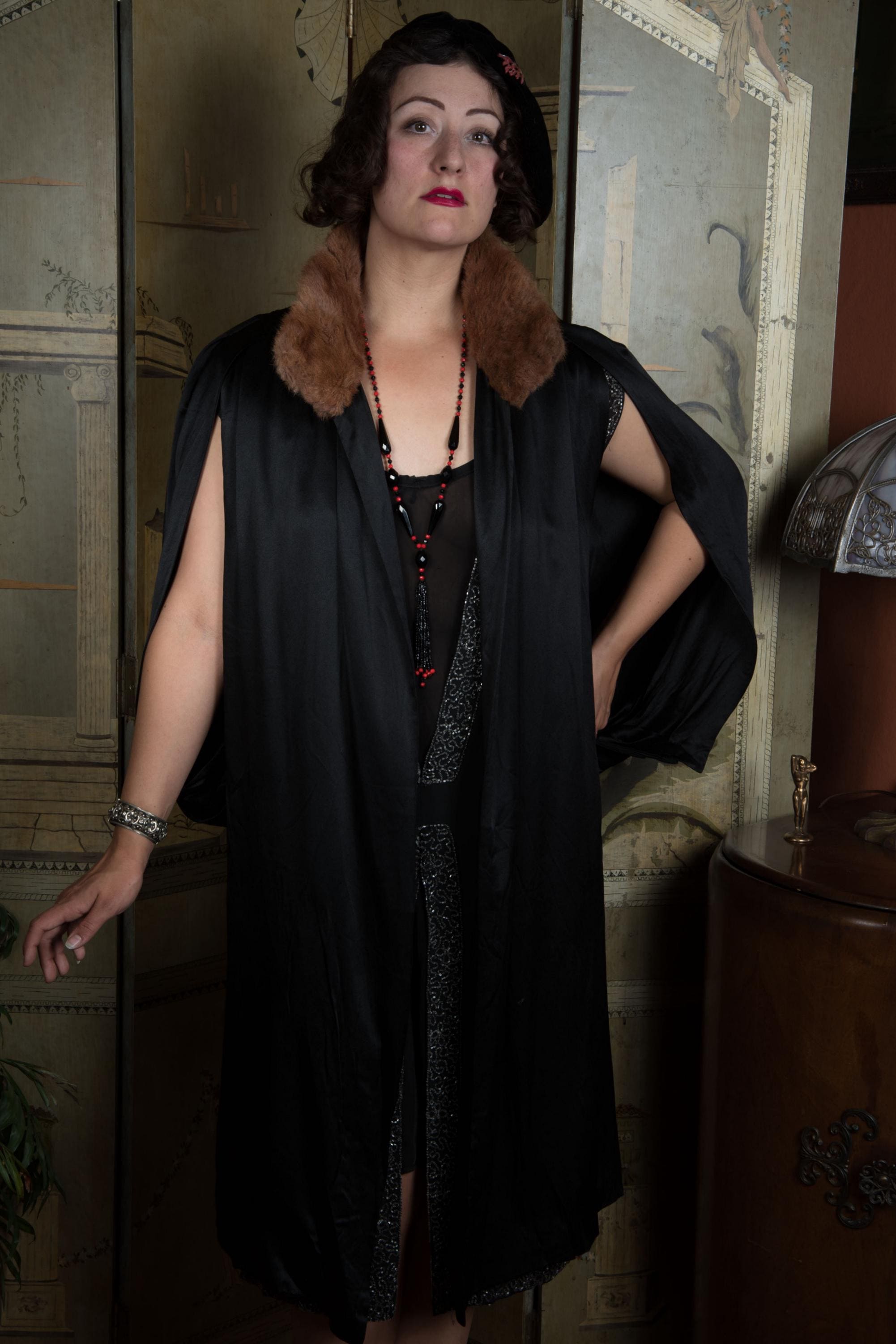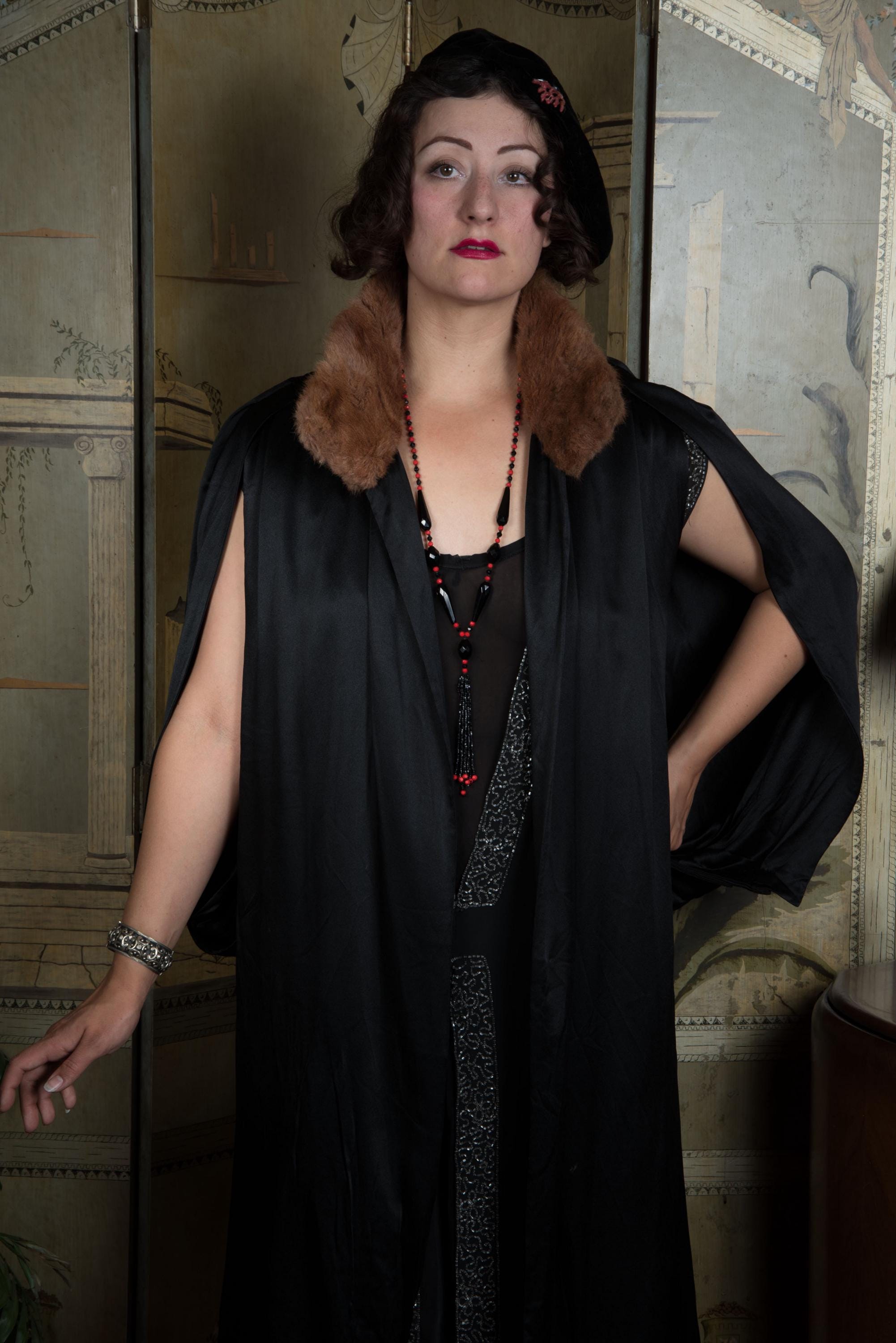 Lush, soft and gleaming, this antique 1920s evening coat is easy wearing luxury. A perfect choice for wearing over sleeveless dresses or dresses with large, dramatic sleeves, it has a unique and striking open sleeve treatment. The front panels area sleeveless, but the arm is then enveloped by cape-like pieces pleated at the shoulder and hem, so they curve closed when at rest. The collar is covered in soft brown fur that does not have guard hairs - I'm unsure what it is. The main body of the piece is lined with silk crepe de chine, but the sleeves are self-lined in that heavy, luxurious charmeuse. There are no closures. There is a single internal pocket large enough for your ID and bank cards.