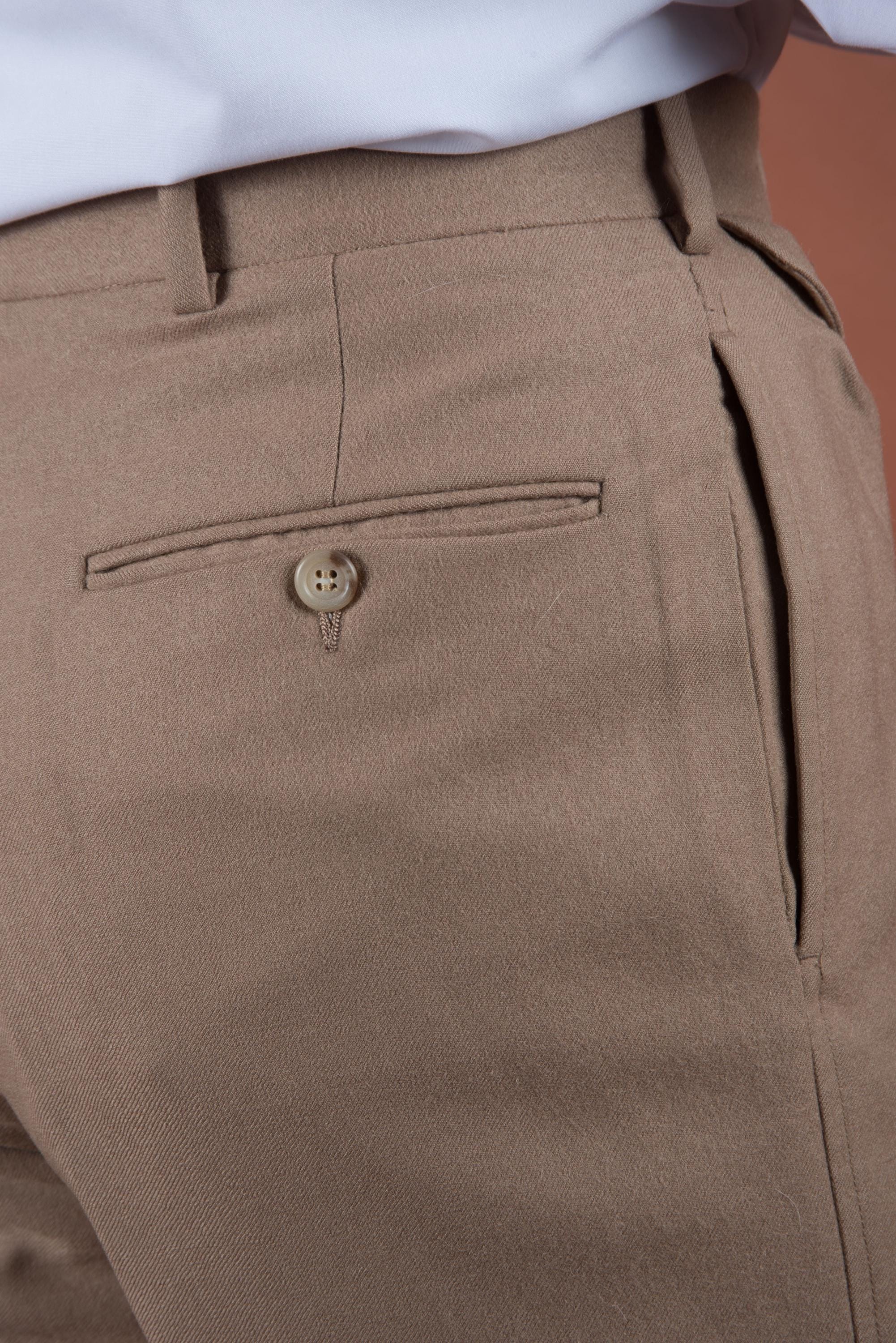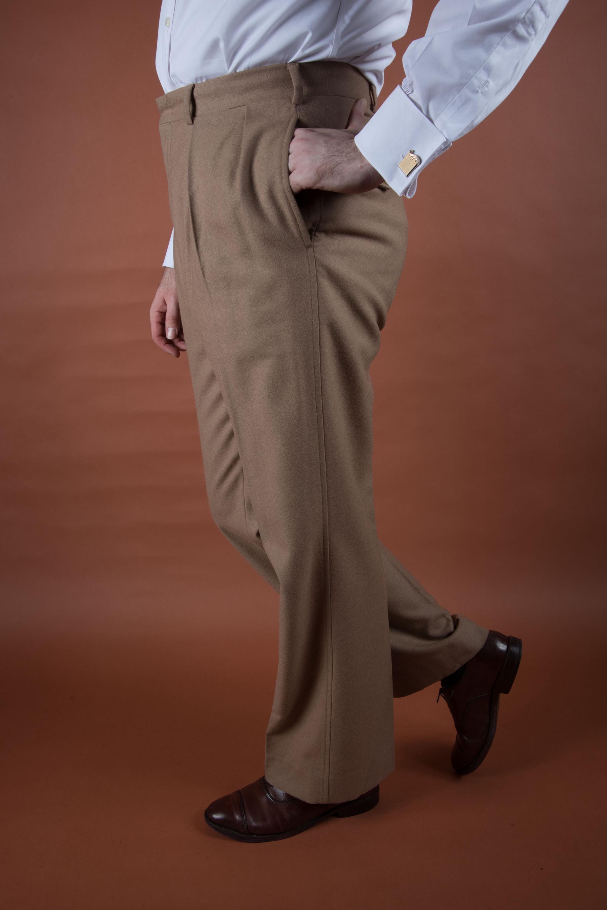 Vintage 1980s or 90s Polo Ralph Lauren slacks are done ideal copy of 30s and 40s cuts. These have a standard waistband and belt loops, single forward pleats, and a buttoning waistband watch pocket. It features branded internal suspender buttons - its all the details you want! Made of a fine, flat wool flannel in a light mocha brown hue that will go very well with both brown and blue jackets Really excellent basics from the best eras of Ralph Lauren, and a smart choice when you don't want to risk your older vintage.