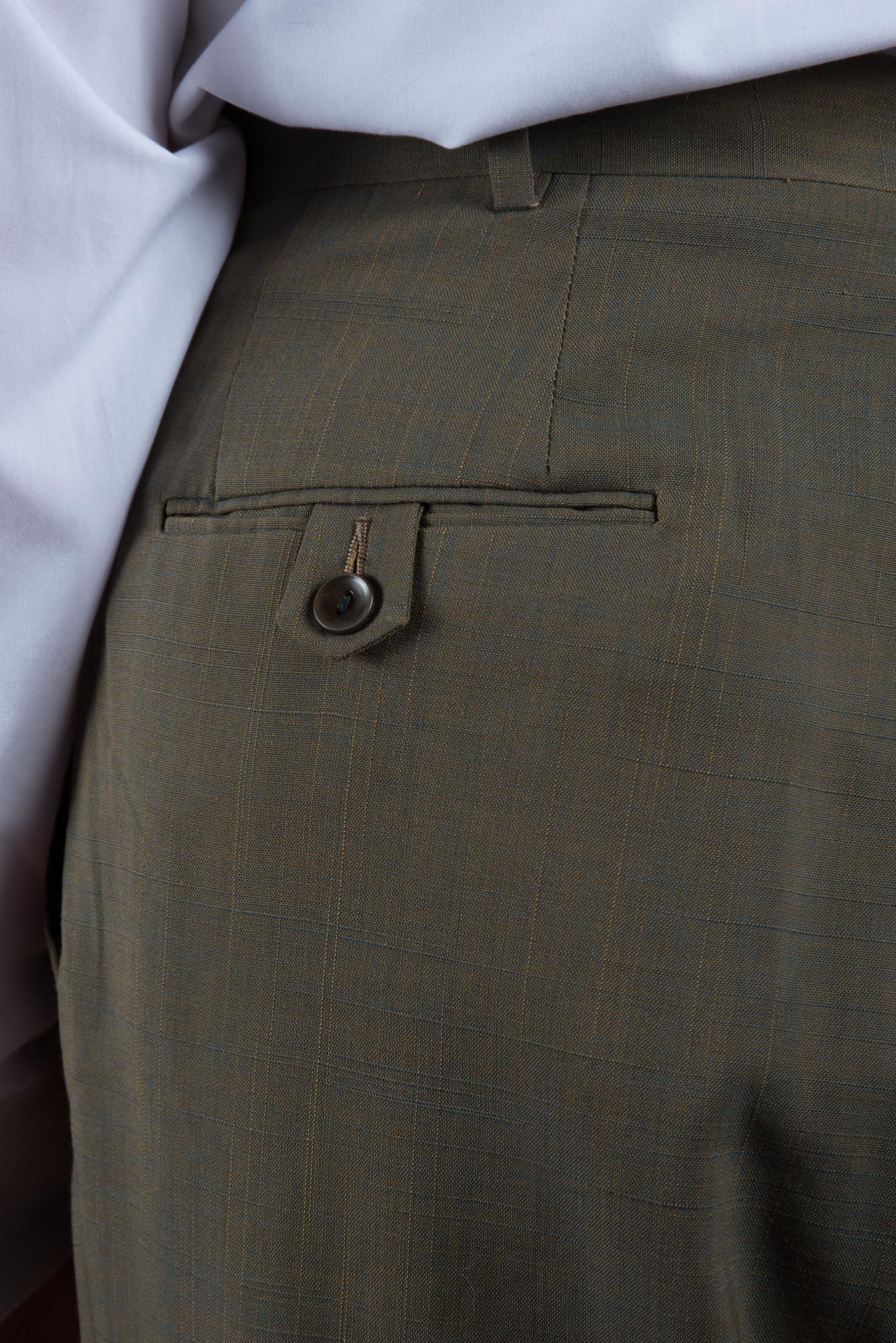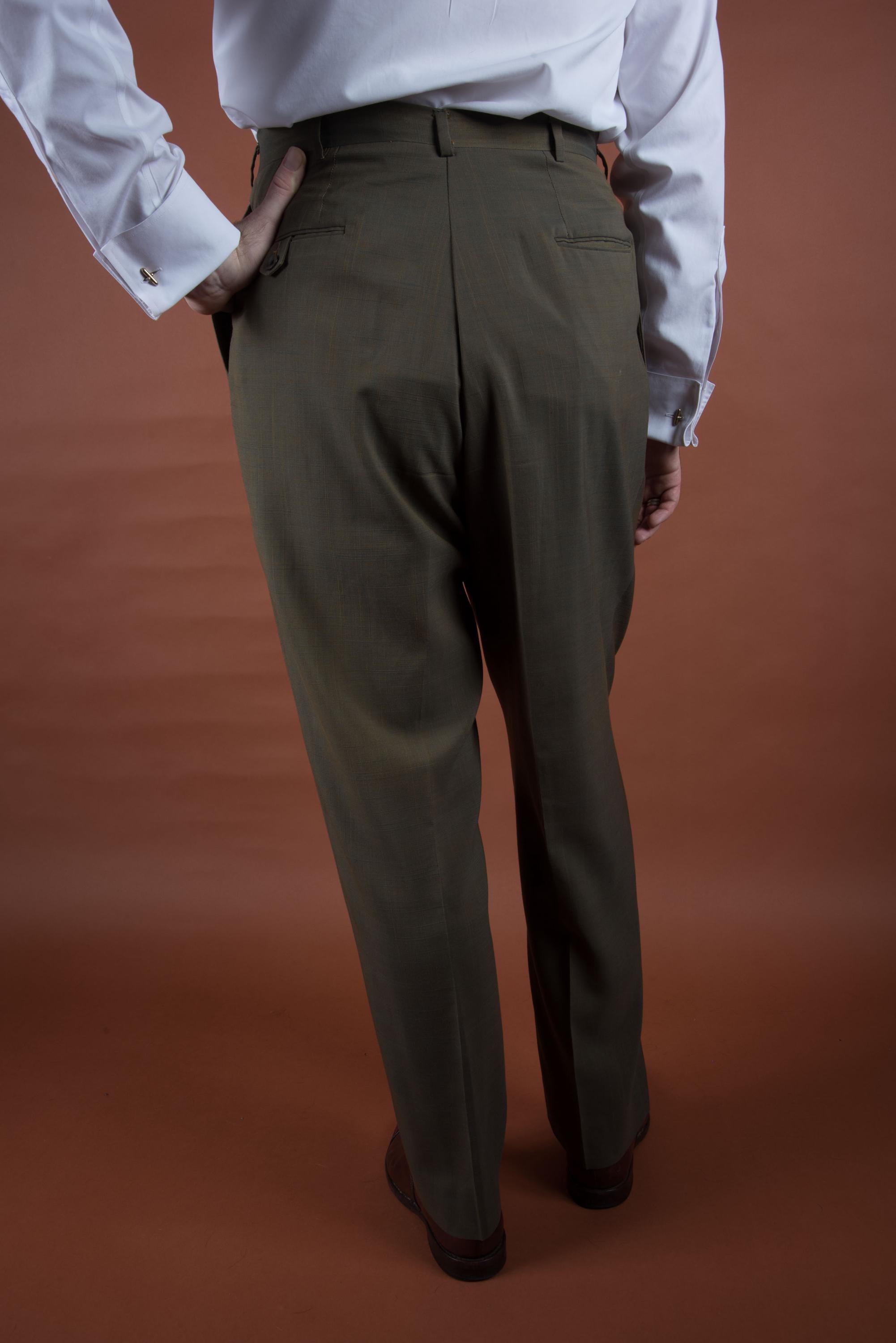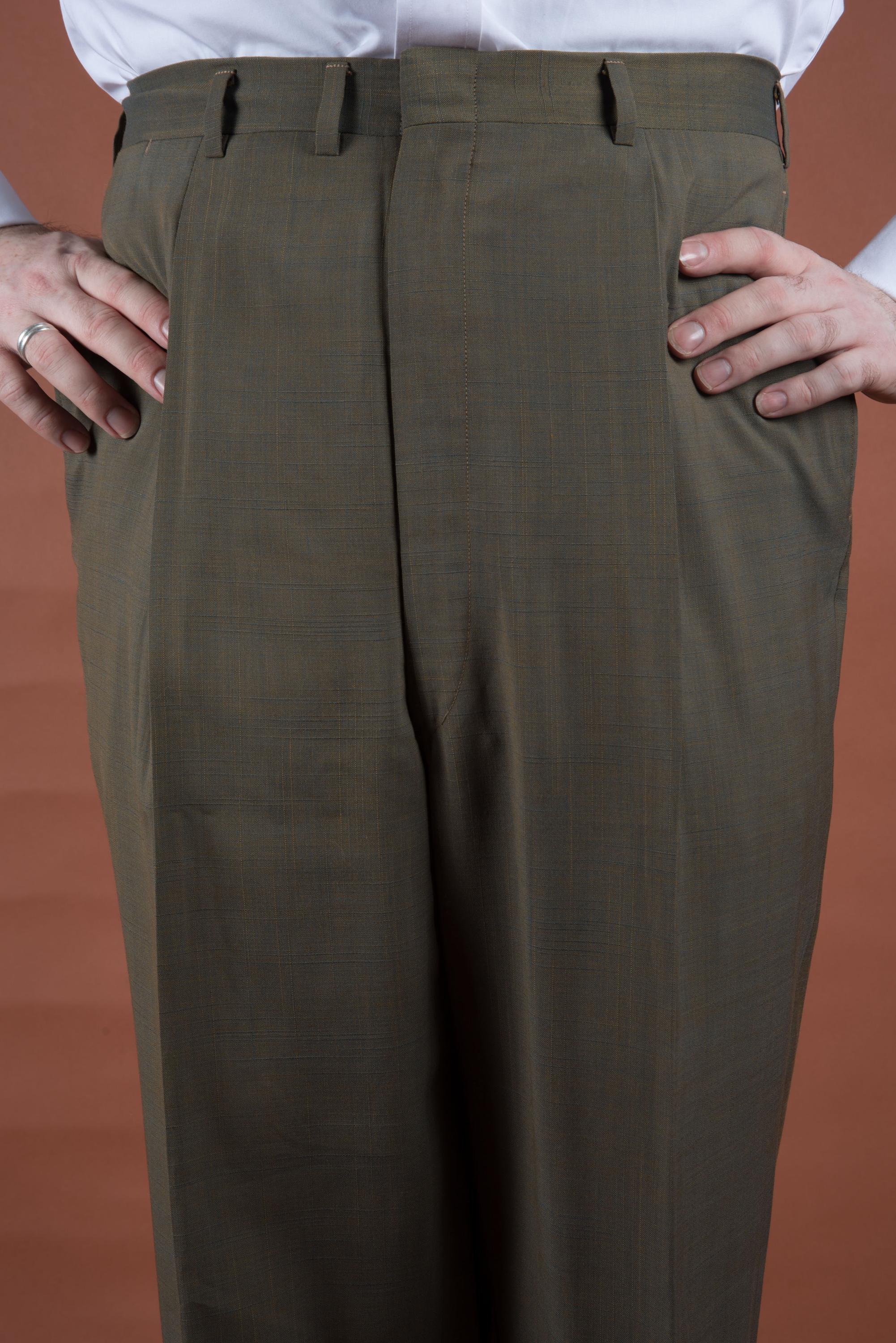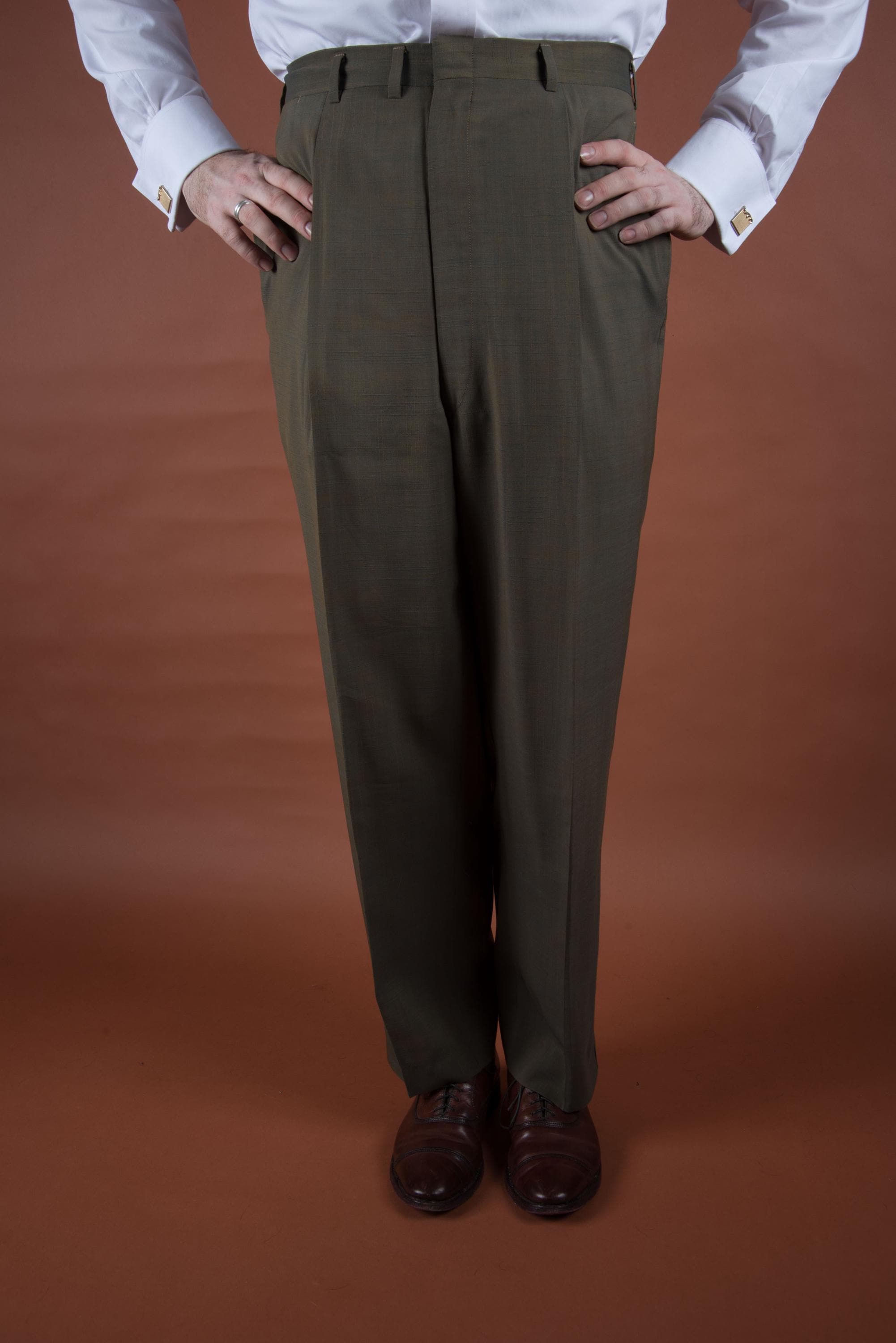 Vintage 1960s pants have an olive tone look, but they are actually woven of blue and gold tone fibers - it's not sharkskin, but woven to suggest it. These are classic suiting pants in a lightweight, summer or warm climate weight. They have a standard waistband and slightly dropped loops, single pleats and watch pocket. The hem is not cuffed. They close with a metal Talon zipper, and a heavy hook at the waist.