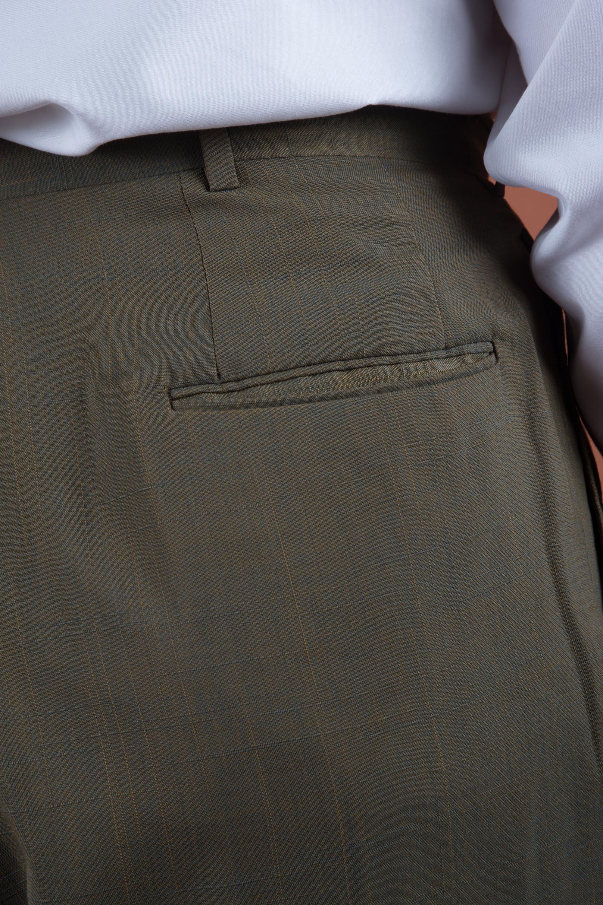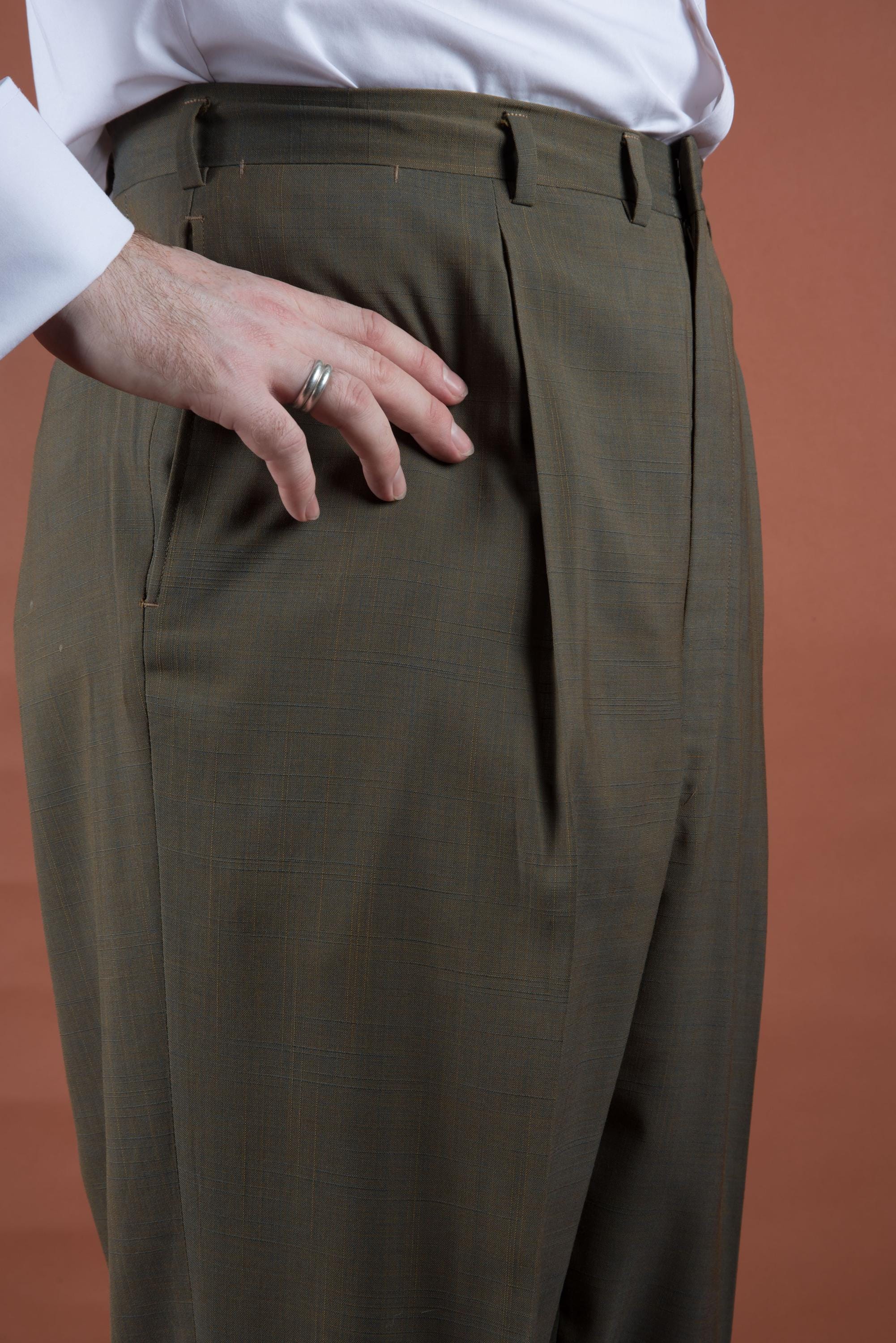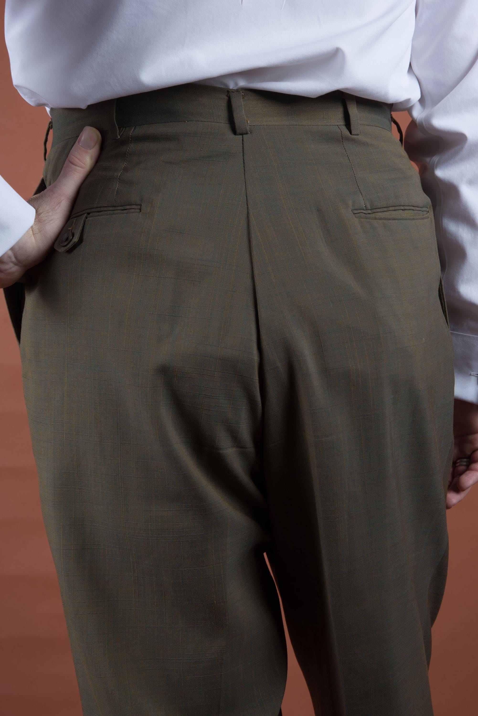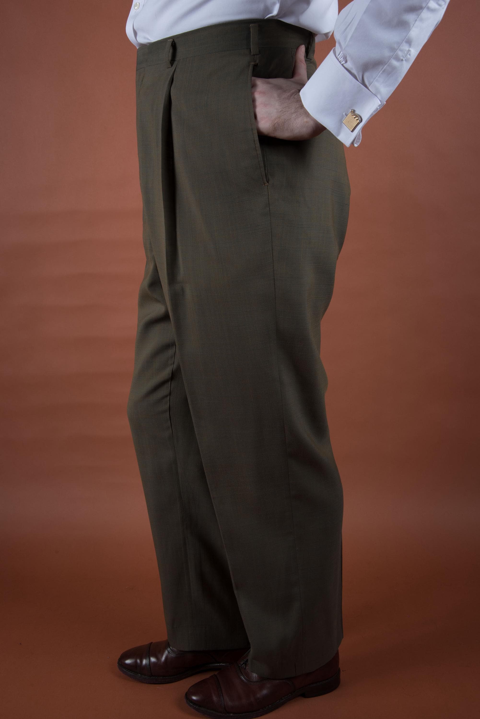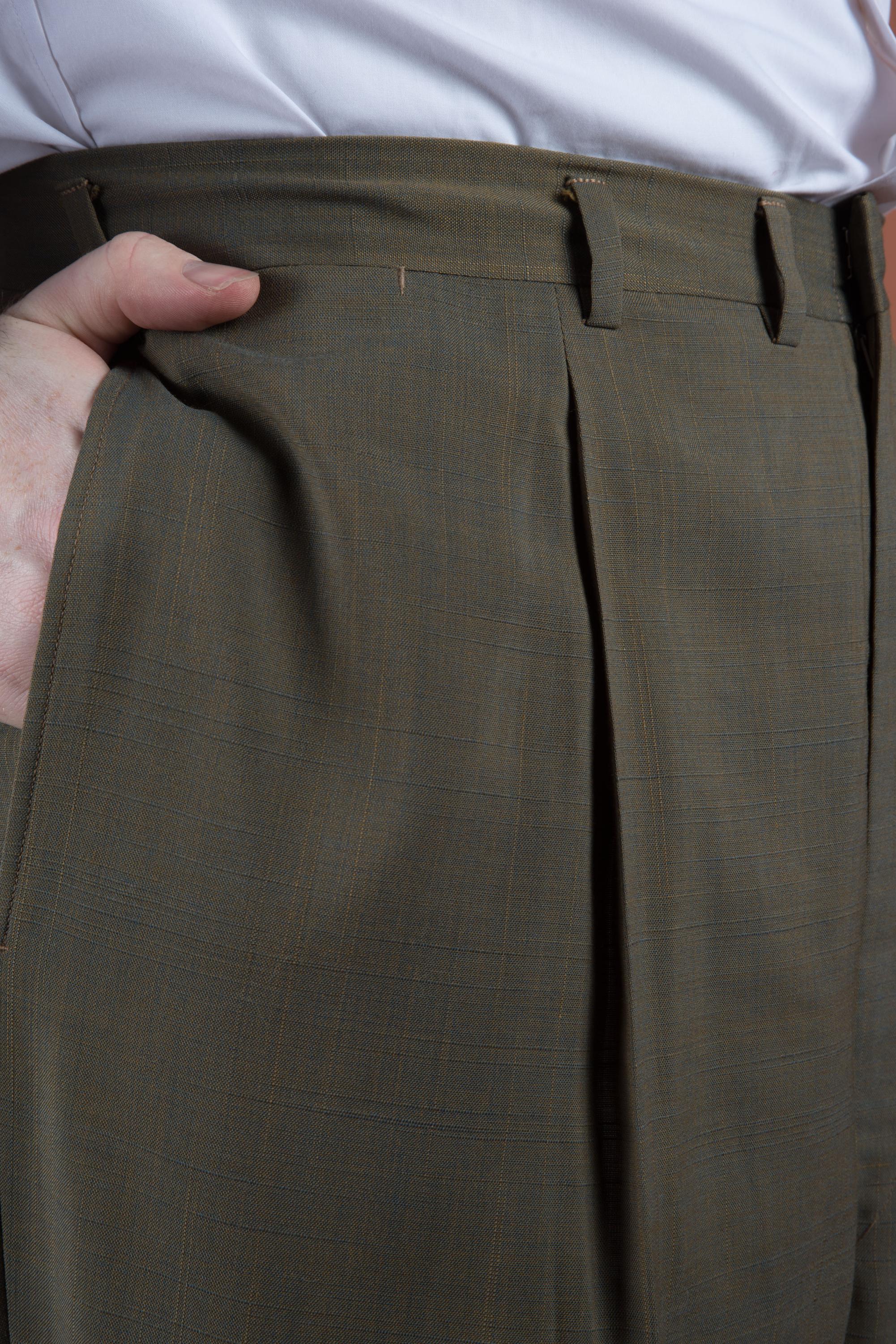 Vintage 1960s pants have an olive tone look, but they are actually woven of blue and gold tone fibers - it's not sharkskin, but woven to suggest it. These are classic suiting pants in a lightweight, summer or warm climate weight. They have a standard waistband and slightly dropped loops, single pleats and watch pocket. The hem is not cuffed. They close with a metal Talon zipper, and a heavy hook at the waist.