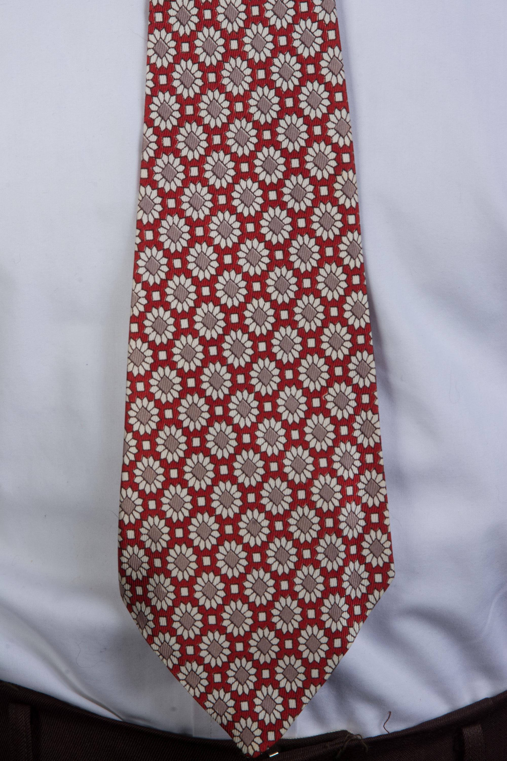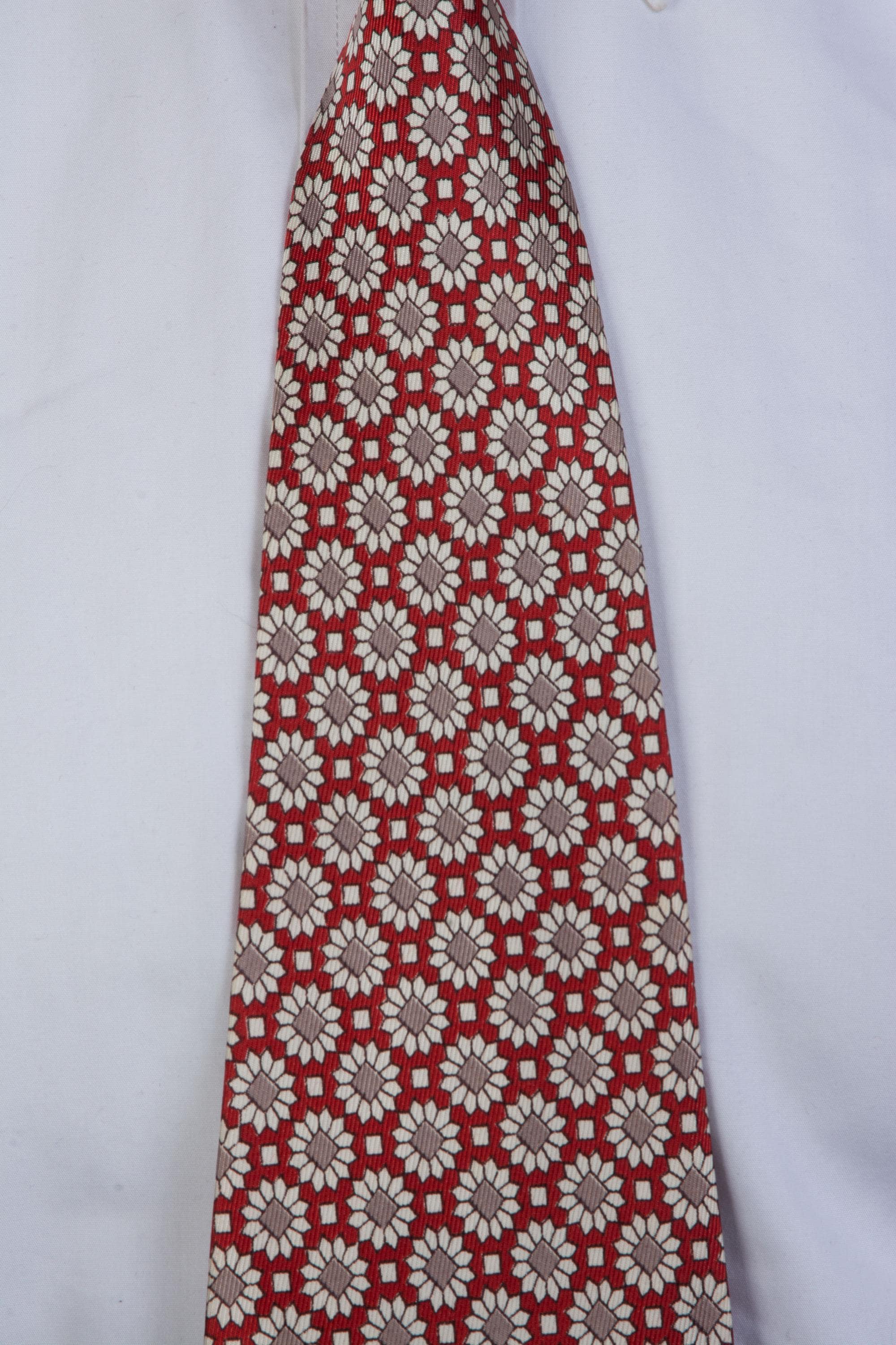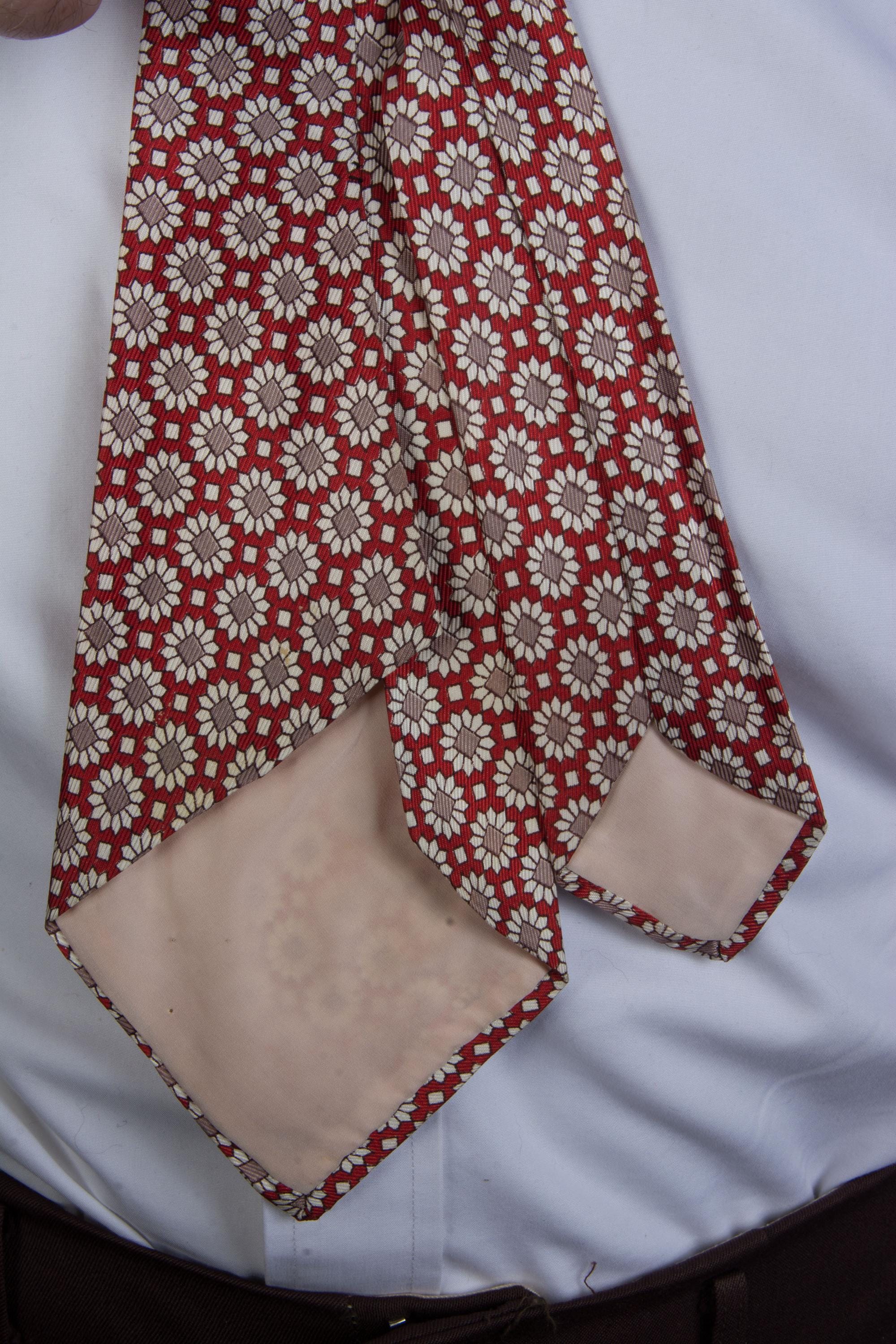 A reserved but still striking 1940s tie made of a very lustrous and slippery rayon twill. This features a print that puts in mind of elegantly framed mirrors. It's lightweight, lined in silk and wears beautifully.