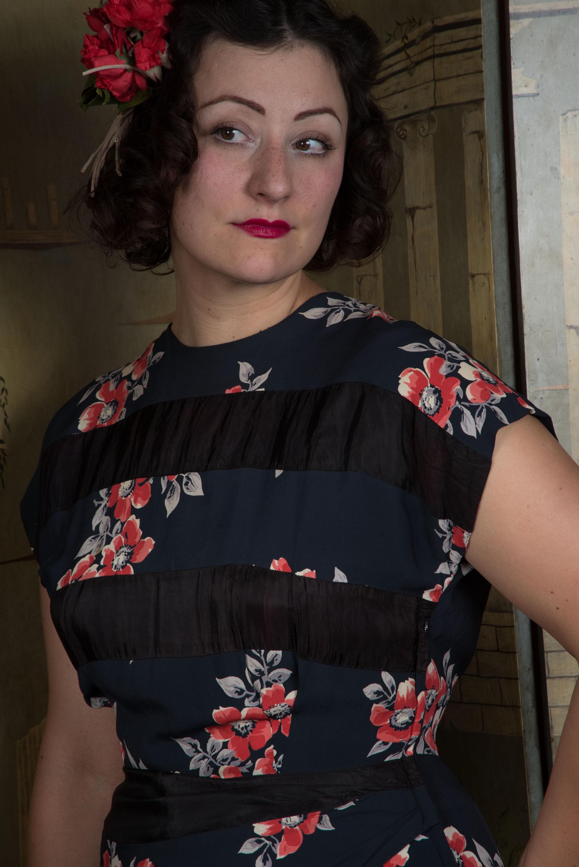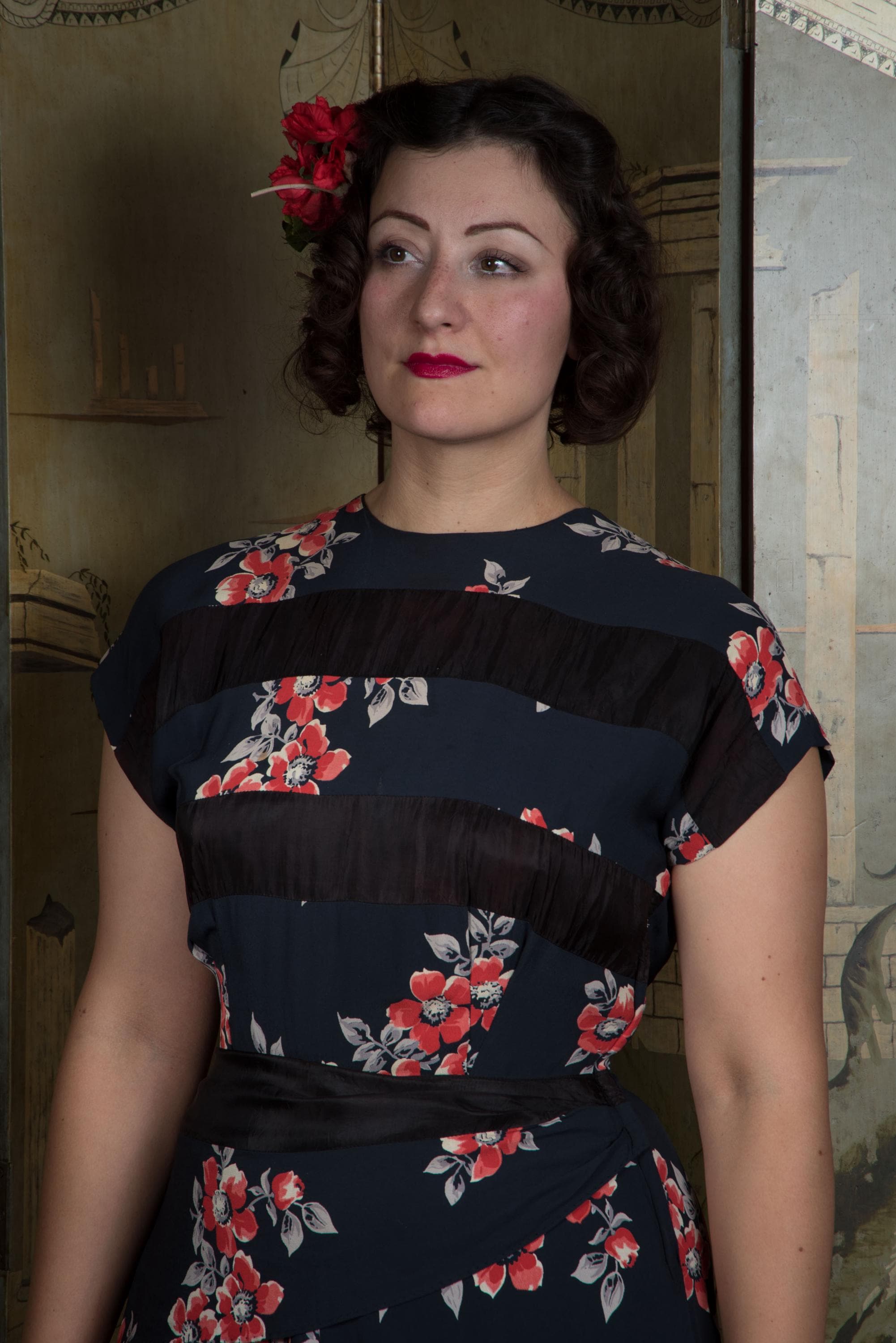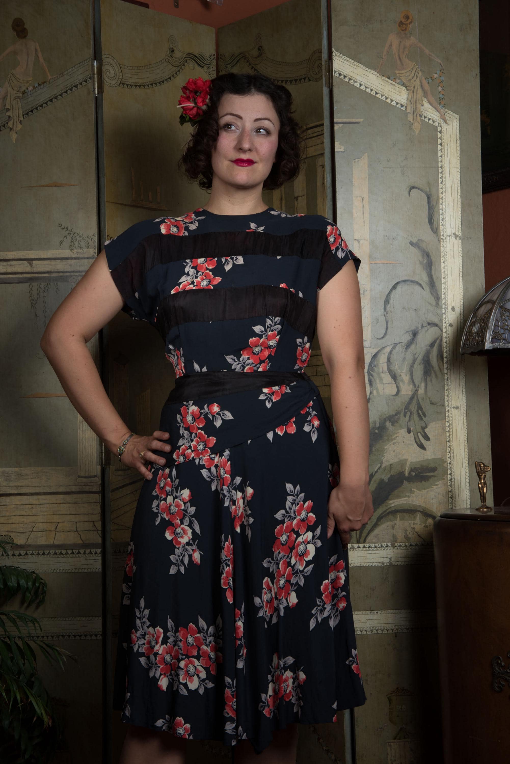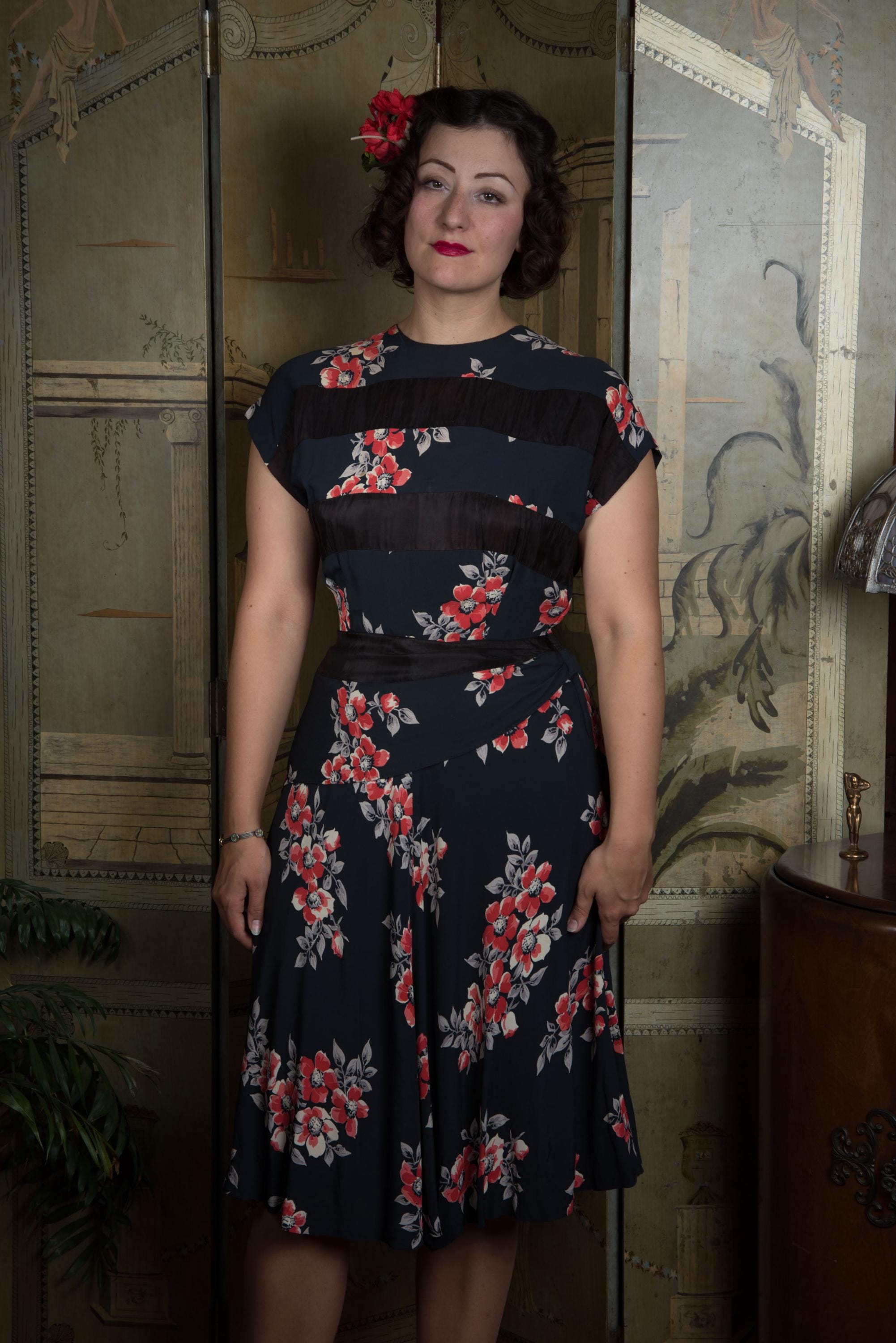 A babely 1940s made of rayon rayon crepe with the most midnight of midnight blue grounds - this looks blue in some lights and black in others. It features a vibrant coral-red dogwood print, with white accents and grey leaves, which pops on the dark background. The bodice is crossed with two satiny acetate bands, and another runs along top of the asymmetric peplum. This closes on the side and at the back of the neck with sturdy metal Klozo zippers.