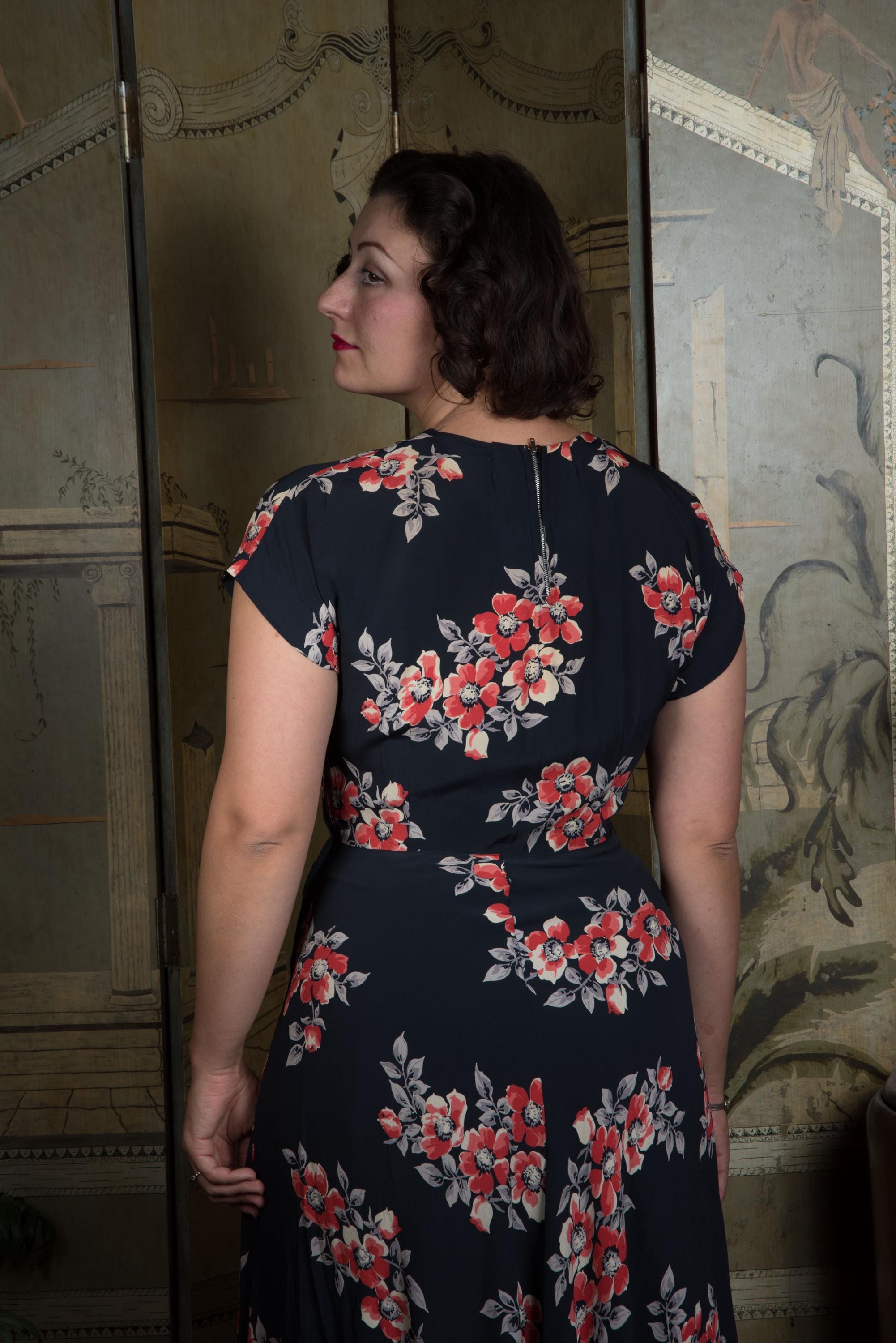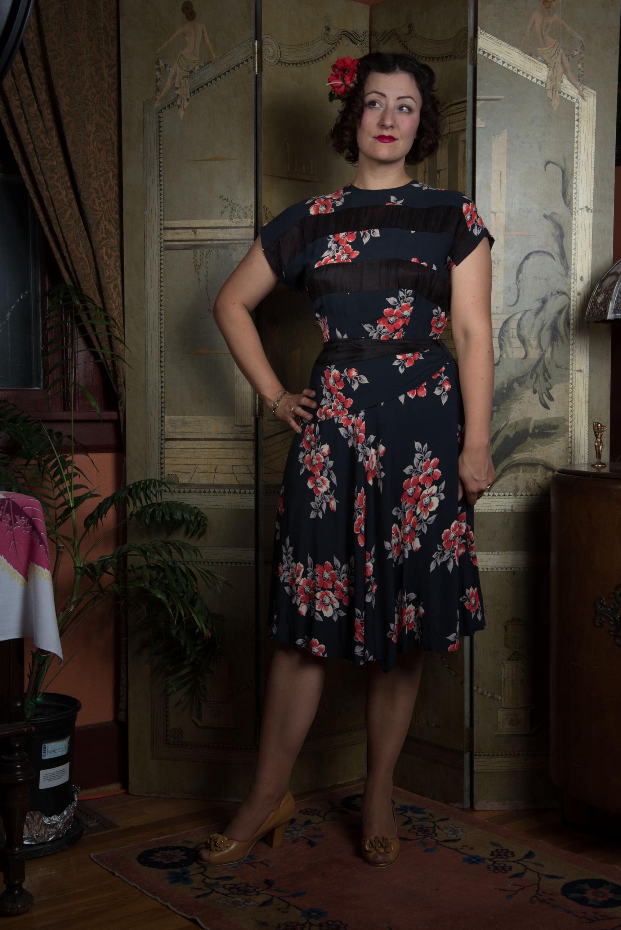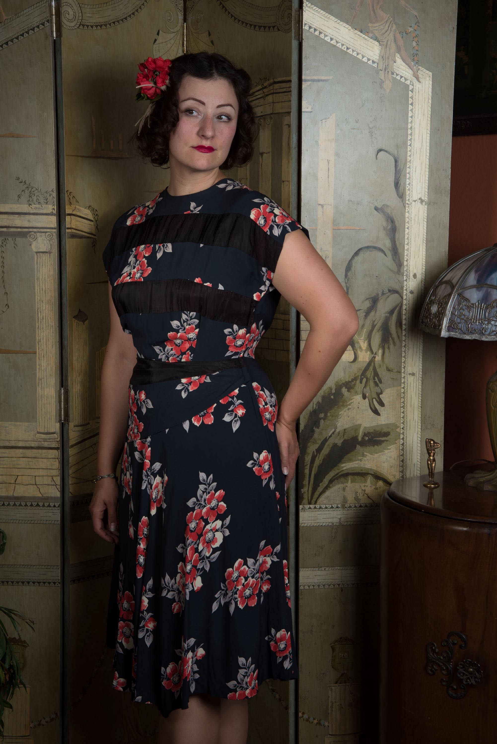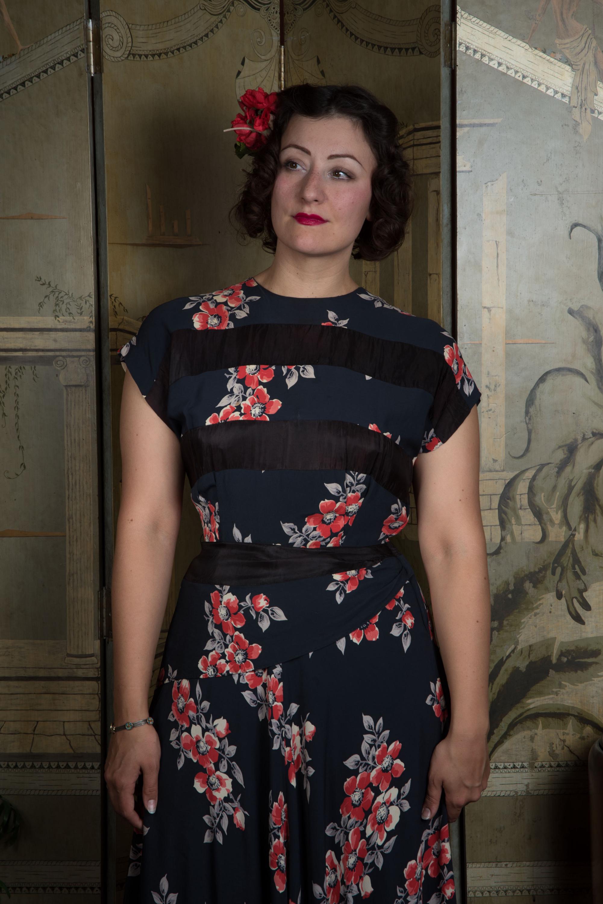 A babely 1940s made of rayon rayon crepe with the most midnight of midnight blue grounds - this looks blue in some lights and black in others. It features a vibrant coral-red dogwood print, with white accents and grey leaves, which pops on the dark background. The bodice is crossed with two satiny acetate bands, and another runs along top of the asymmetric peplum. This closes on the side and at the back of the neck with sturdy metal Klozo zippers.