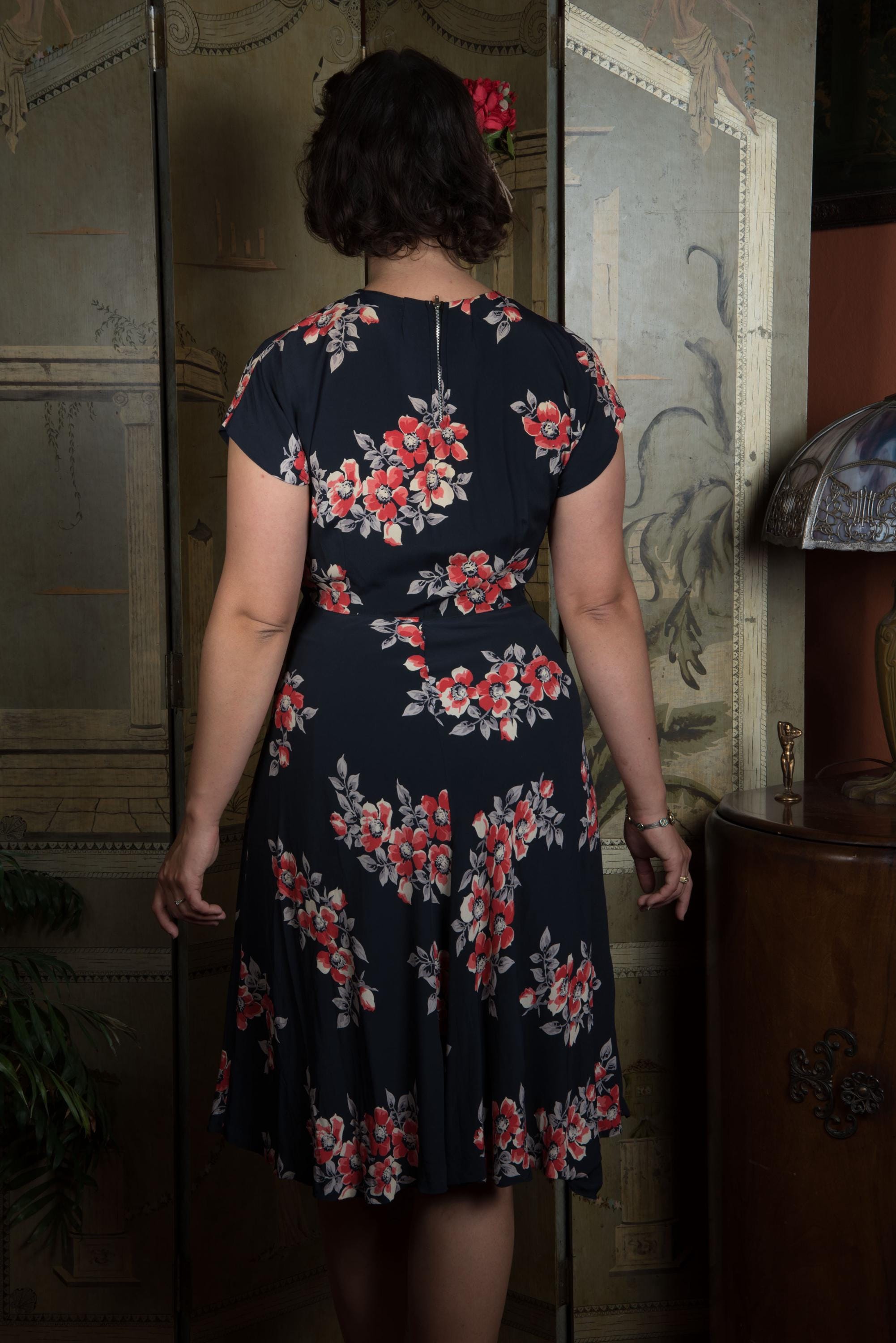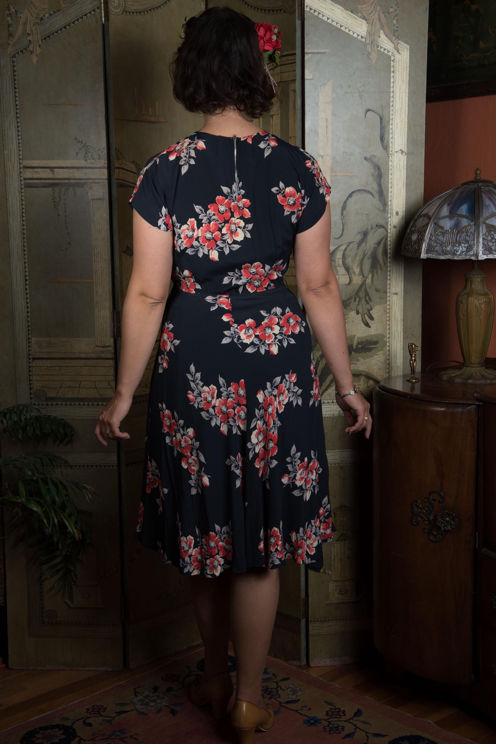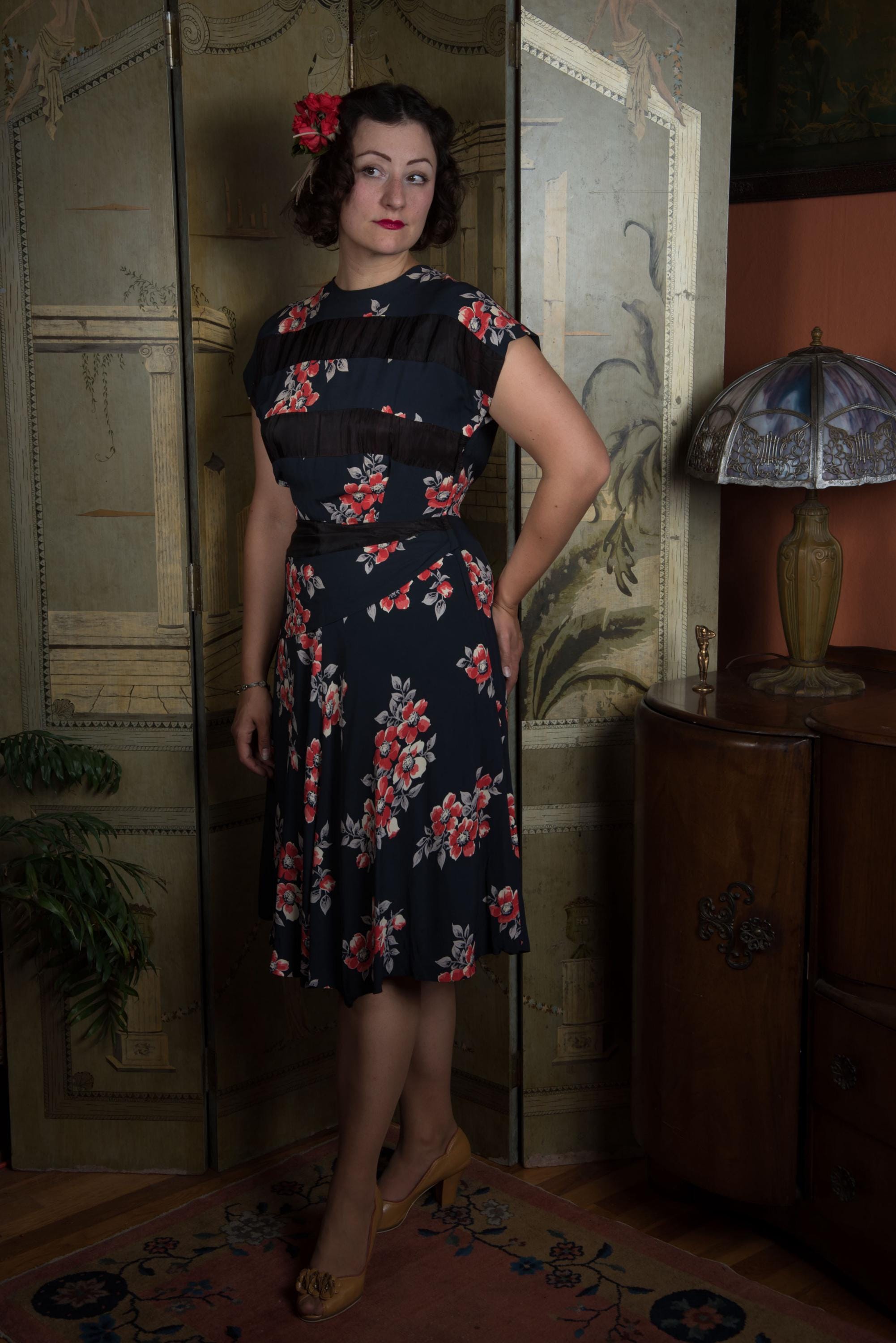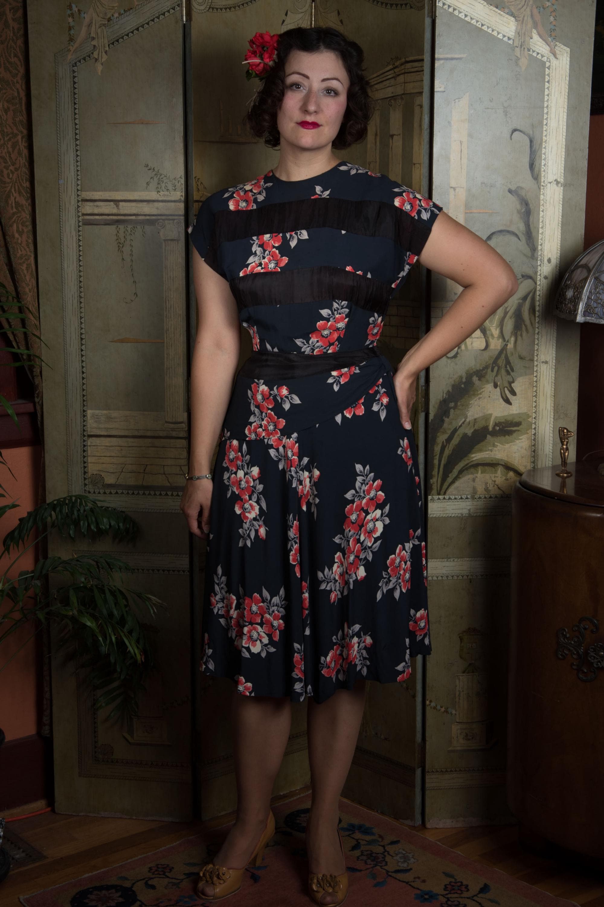 A babely 1940s made of rayon rayon crepe with the most midnight of midnight blue grounds - this looks blue in some lights and black in others. It features a vibrant coral-red dogwood print, with white accents and grey leaves, which pops on the dark background. The bodice is crossed with two satiny acetate bands, and another runs along top of the asymmetric peplum. This closes on the side and at the back of the neck with sturdy metal Klozo zippers.