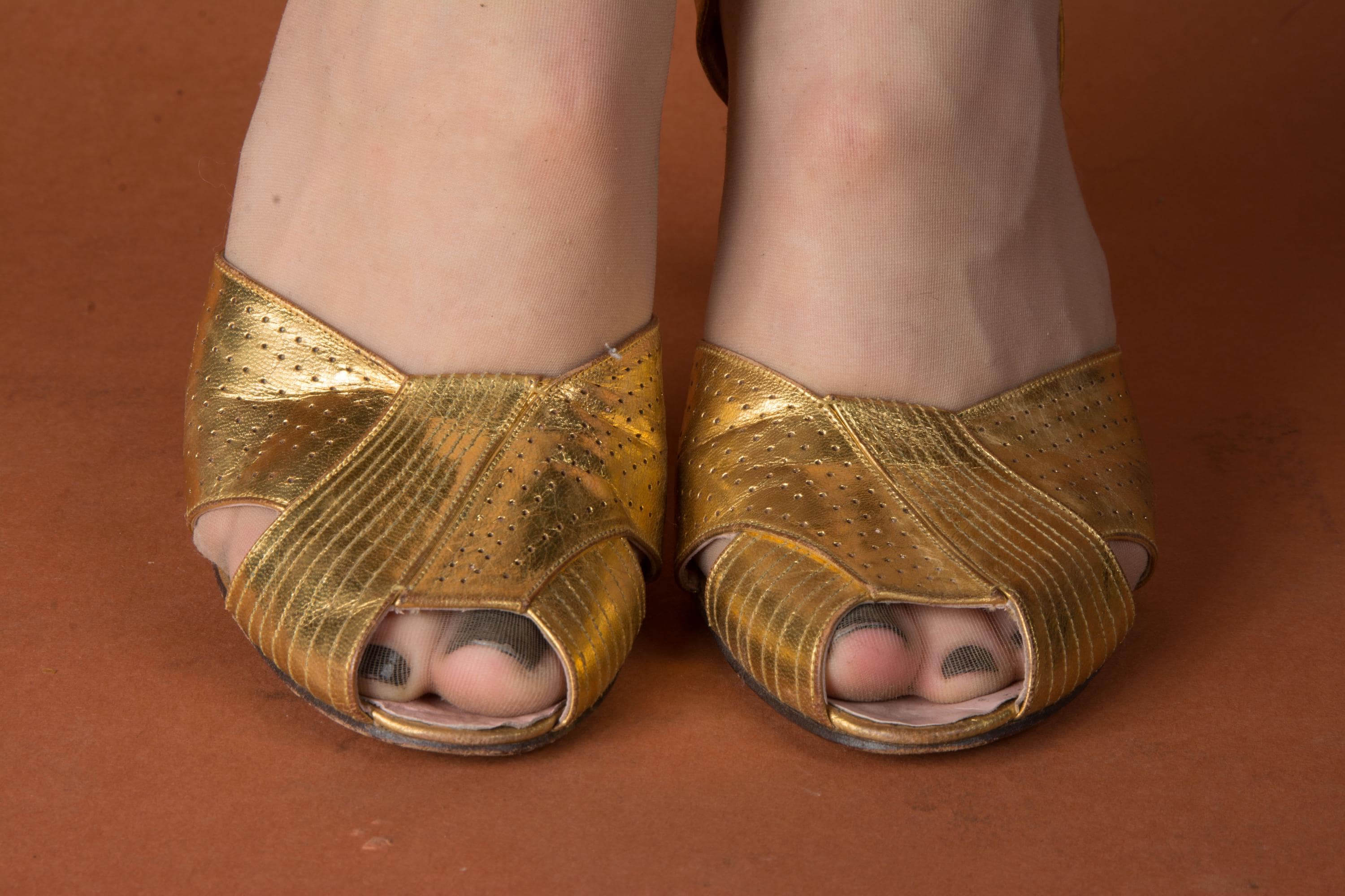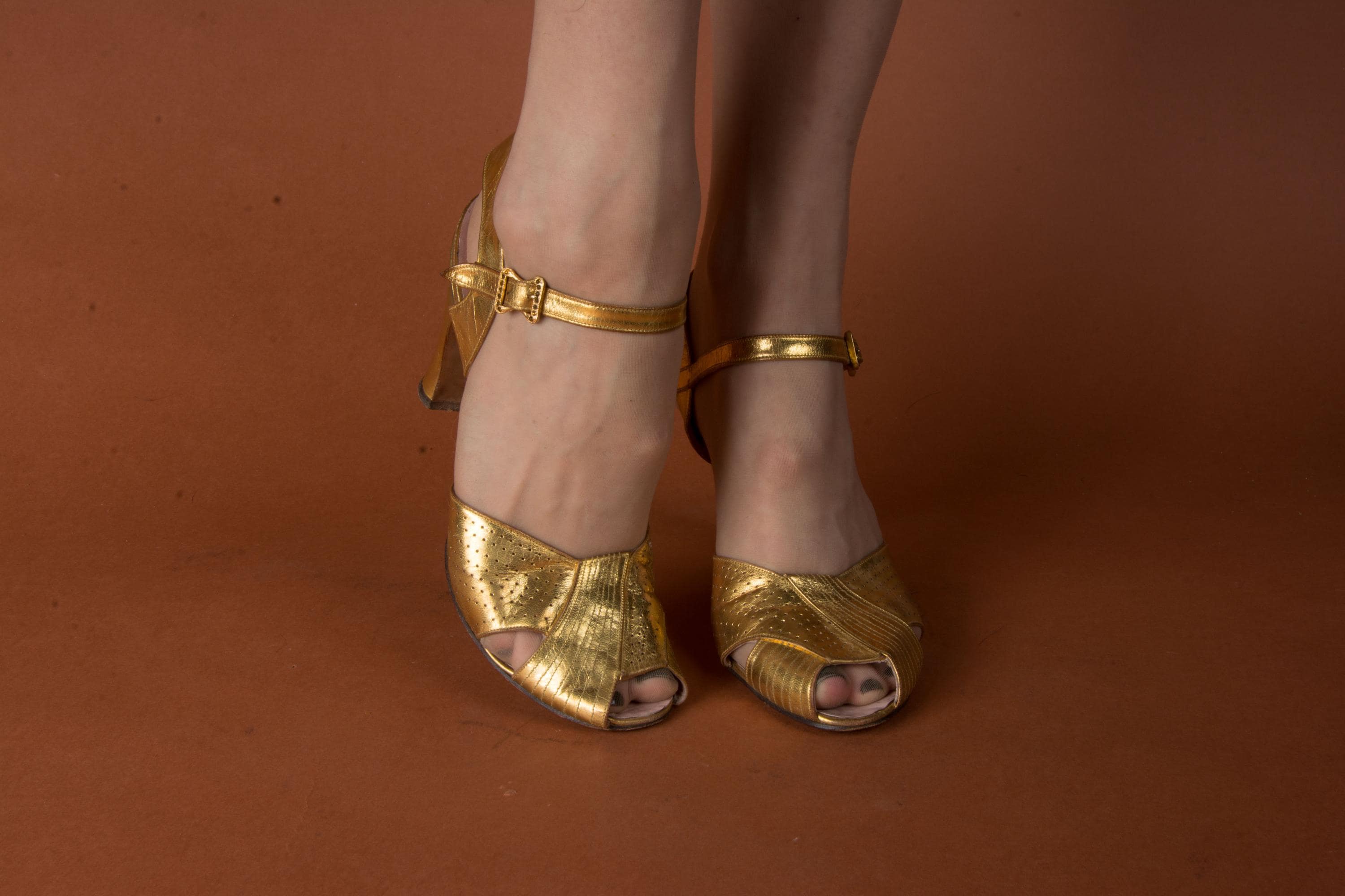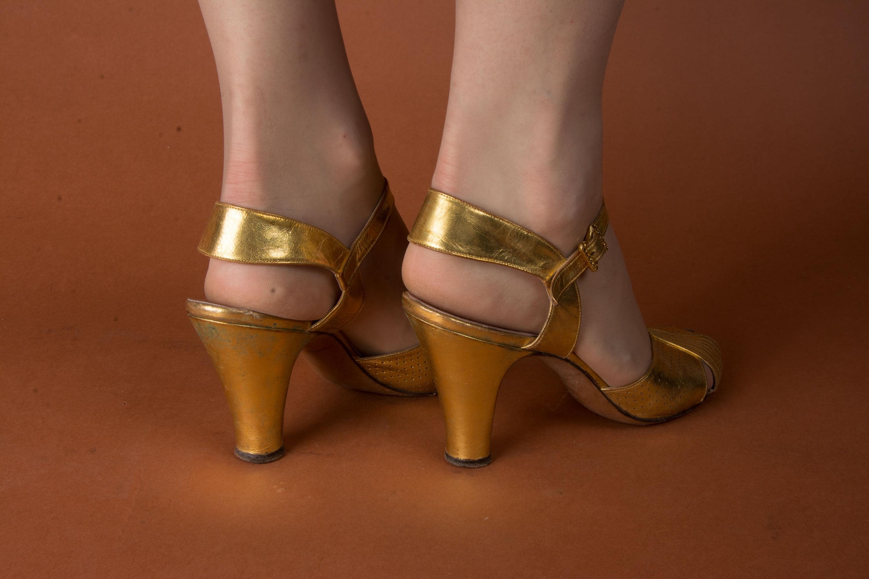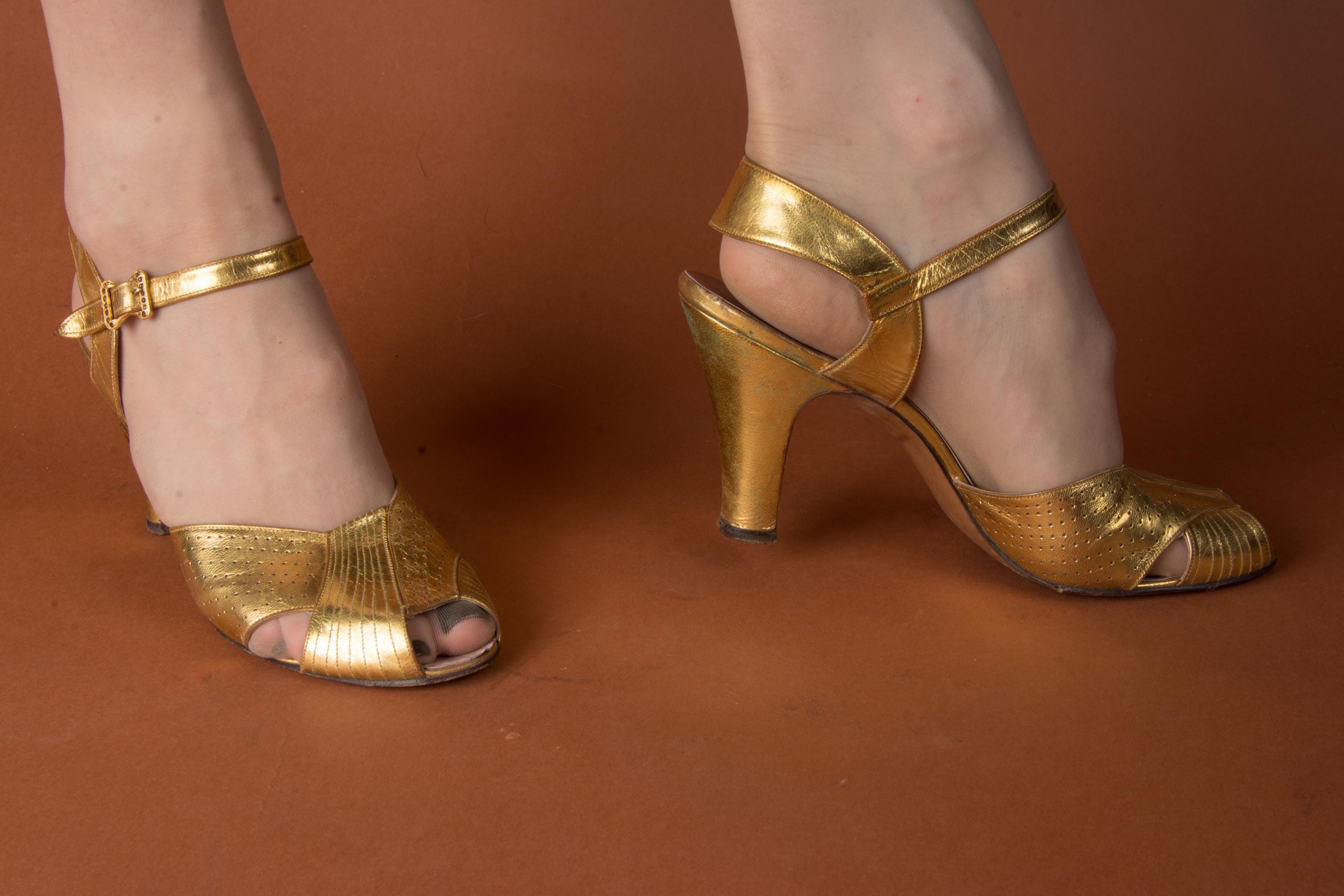 Vintage late 1930s to evening heels are made to pair with an elegant ensemble. These evening babes are made of an absolutely glowing metallic gold treated leather The front vamp has an open toe. It's made up of two pieces of leather pleated over each other, one perforated and the other top stitched (I just love this textural variation!) The heel is tall and sturdy but sleek lined. The ankle straps fasted with amber rhinestone studded buckles. They are lined with leather, have a leather heel tip and sole.