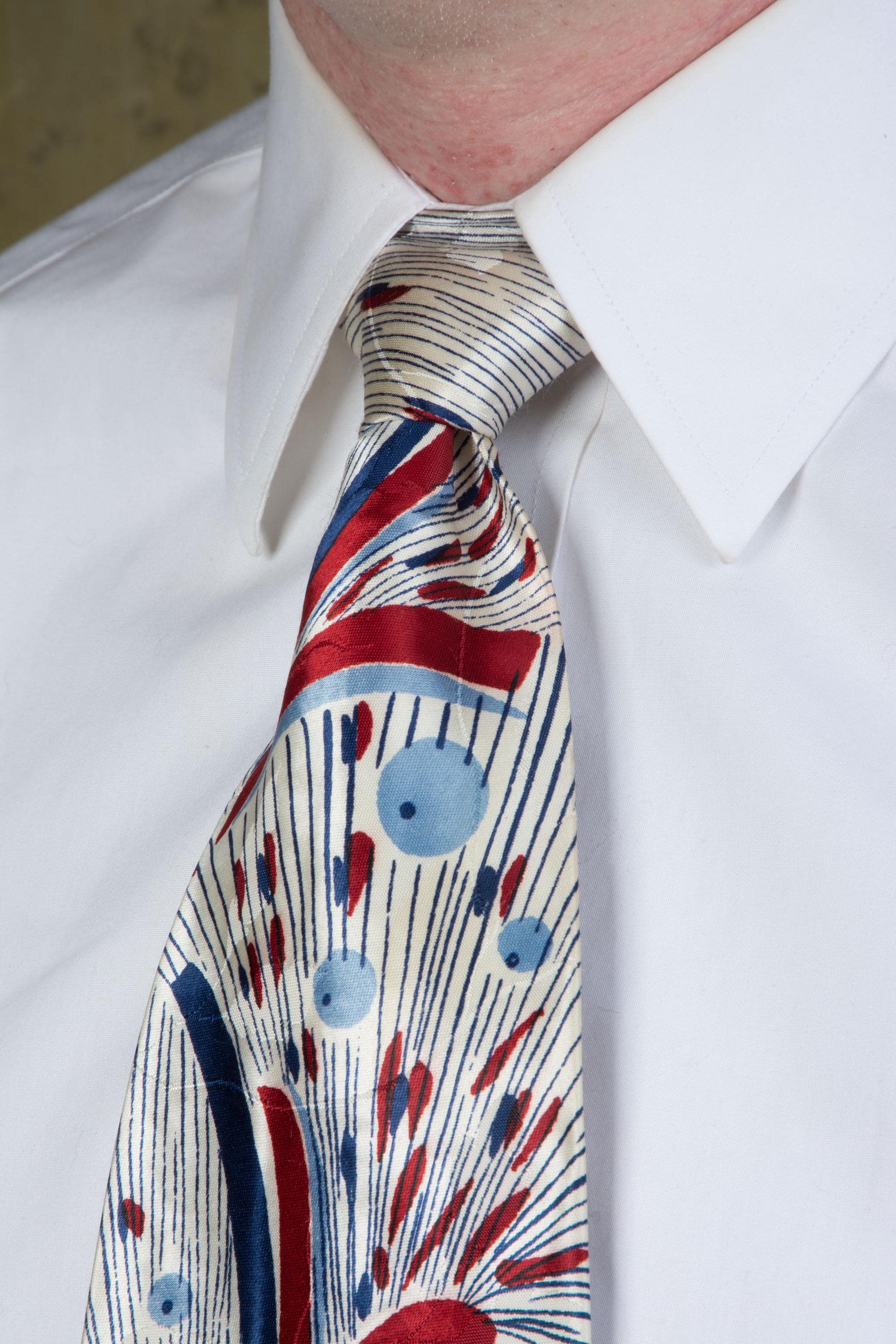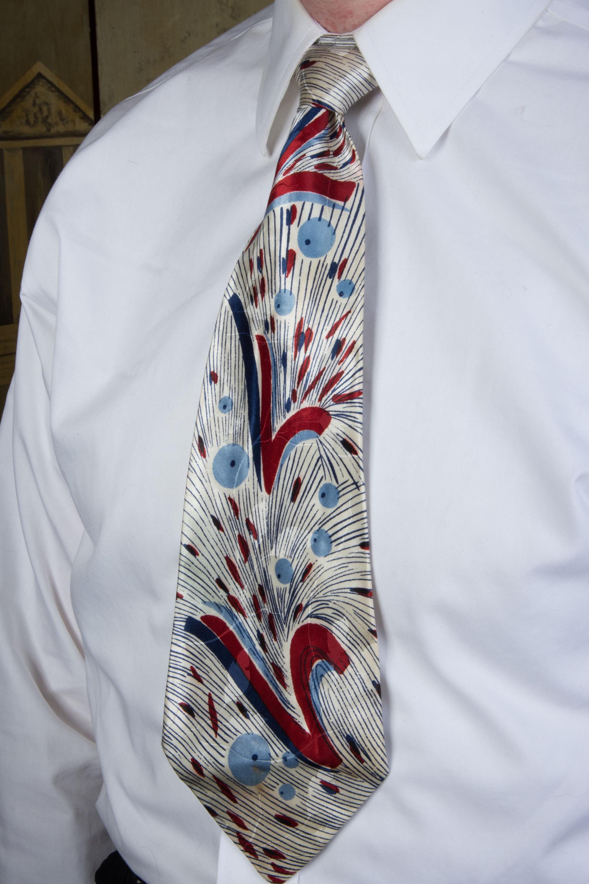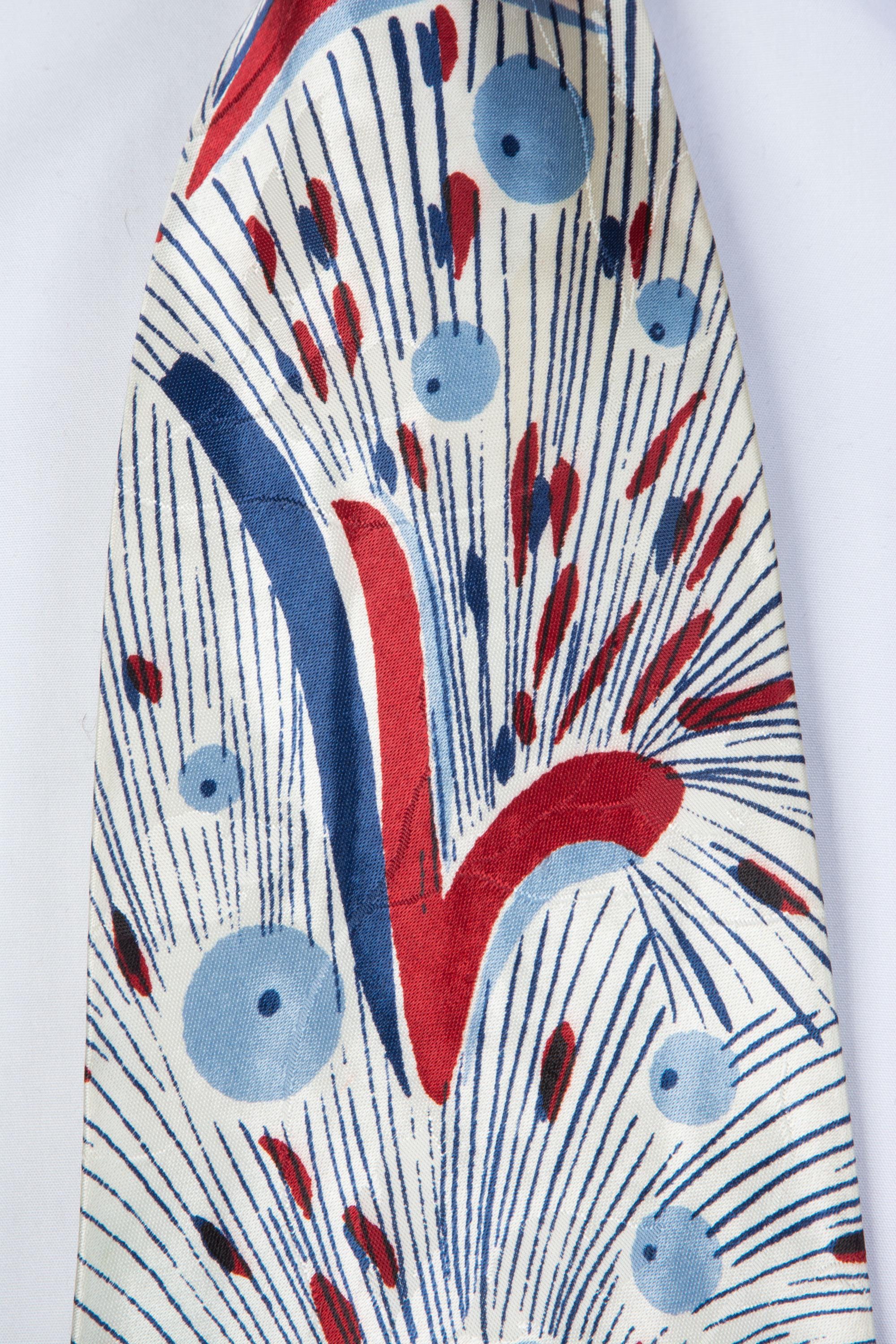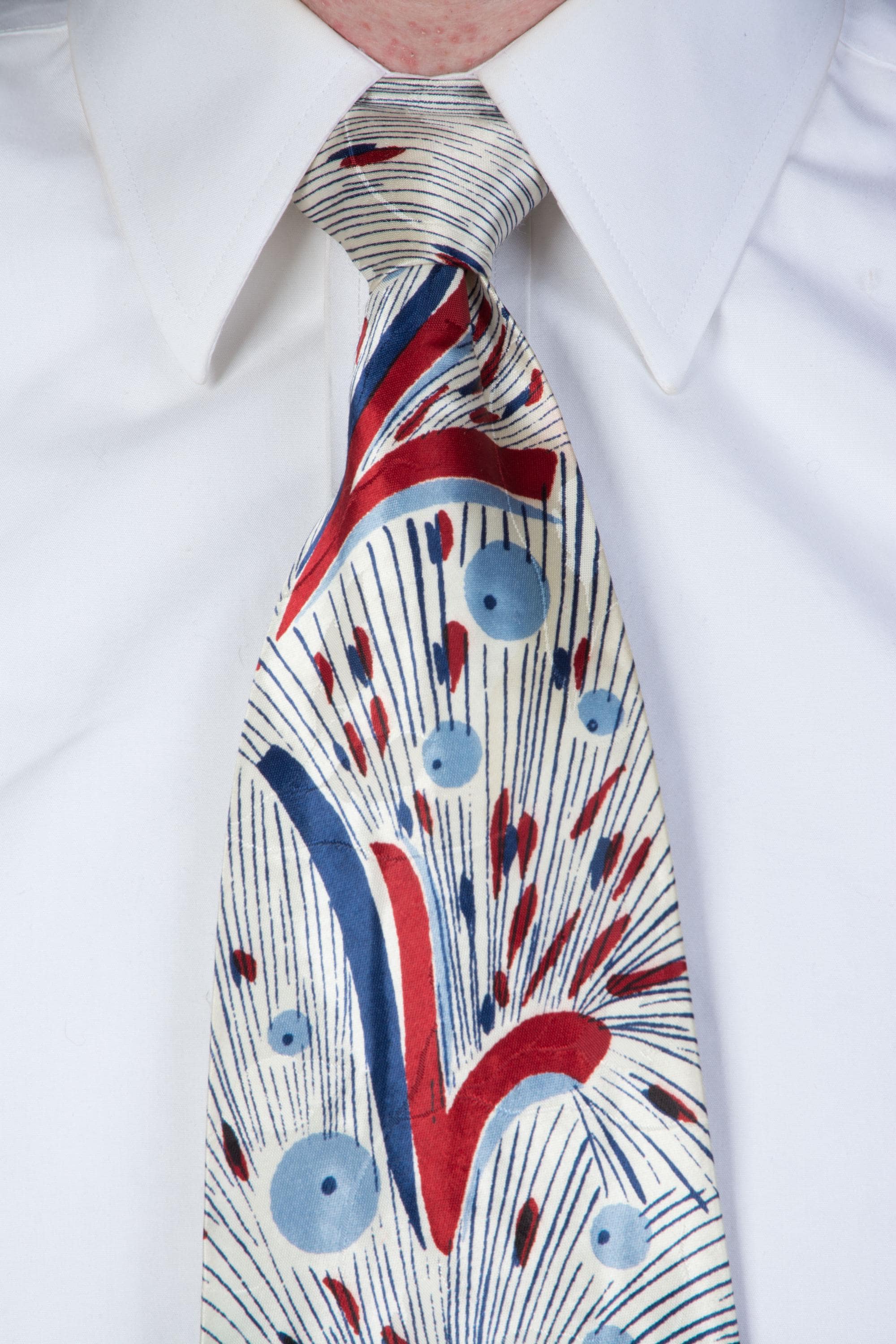 Here's a tie that says a LOT. This exceptionally bold necktie is made in a crisp white, navy and red and the print is just exuberant. It's loud! The lustrous brocade has leaf shapes, but it takes a back seat to the print, which really is the main event, it feels very New-Year-Champagne-Popping-Fireworks. Fully lined.