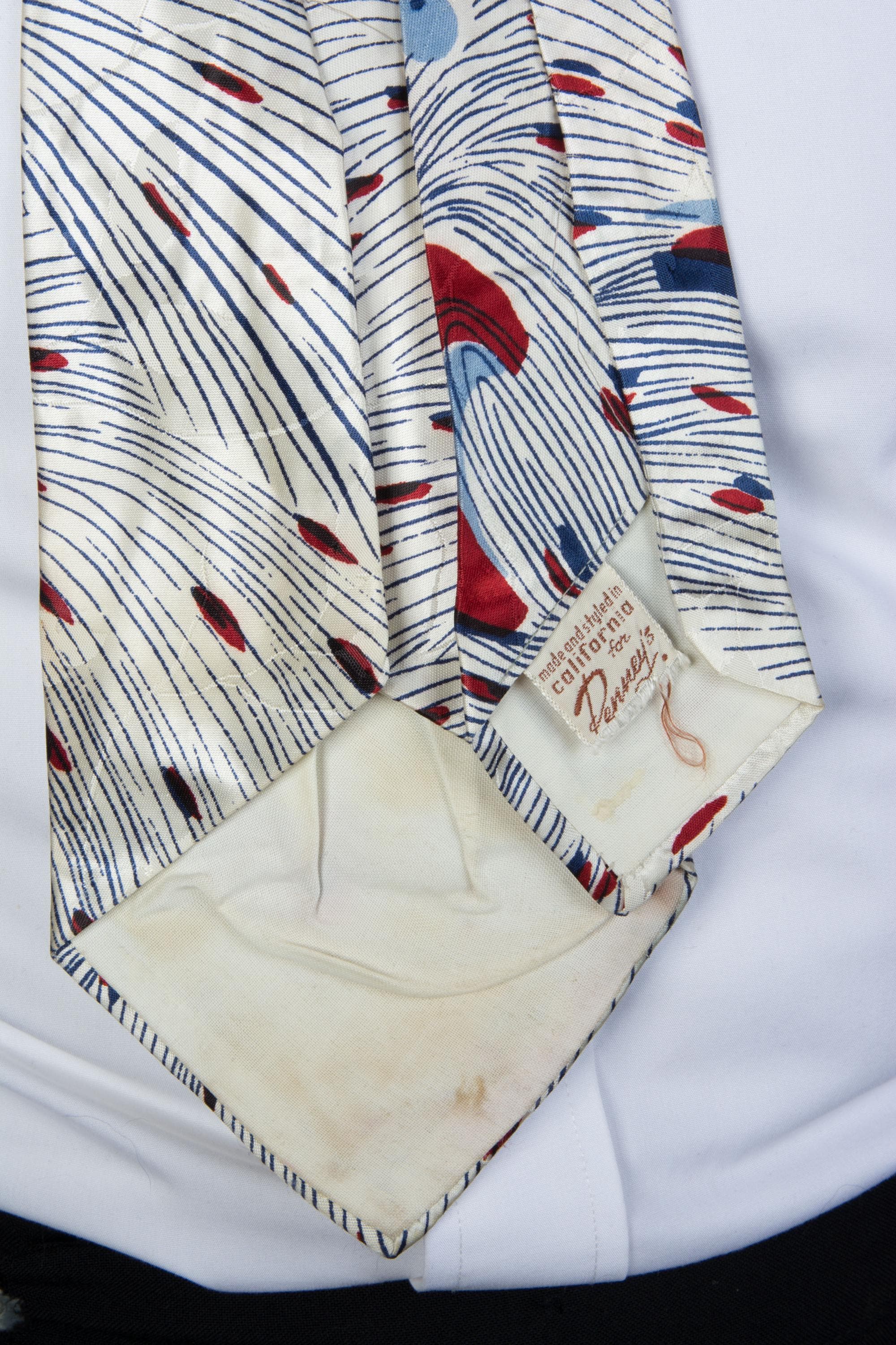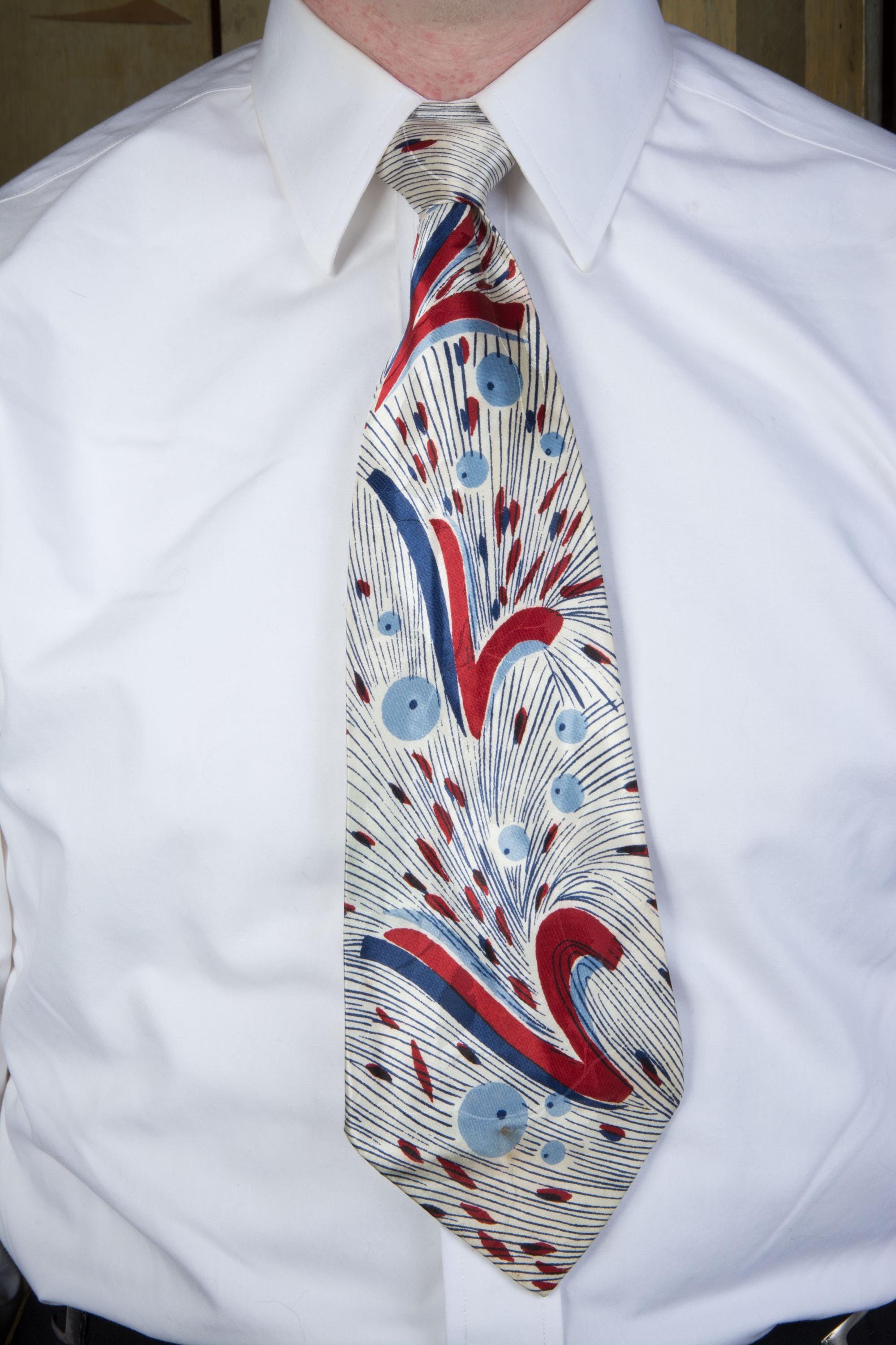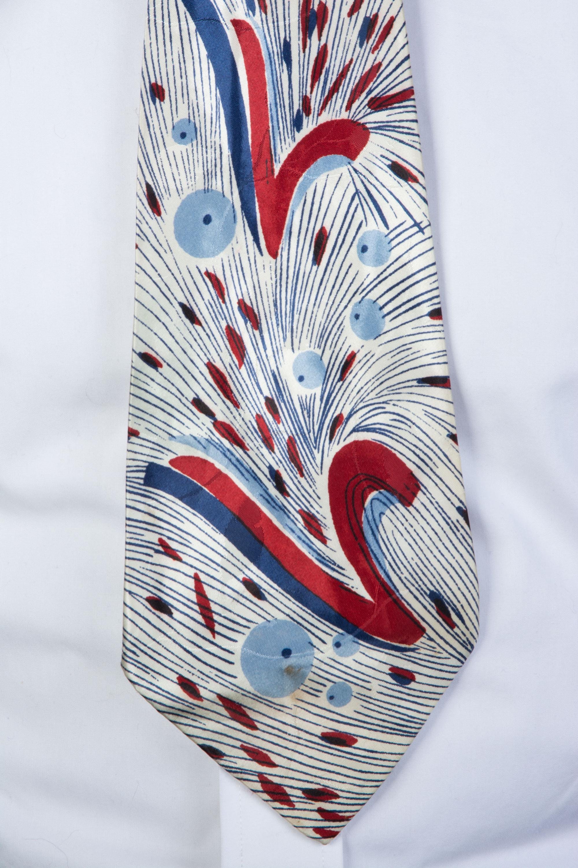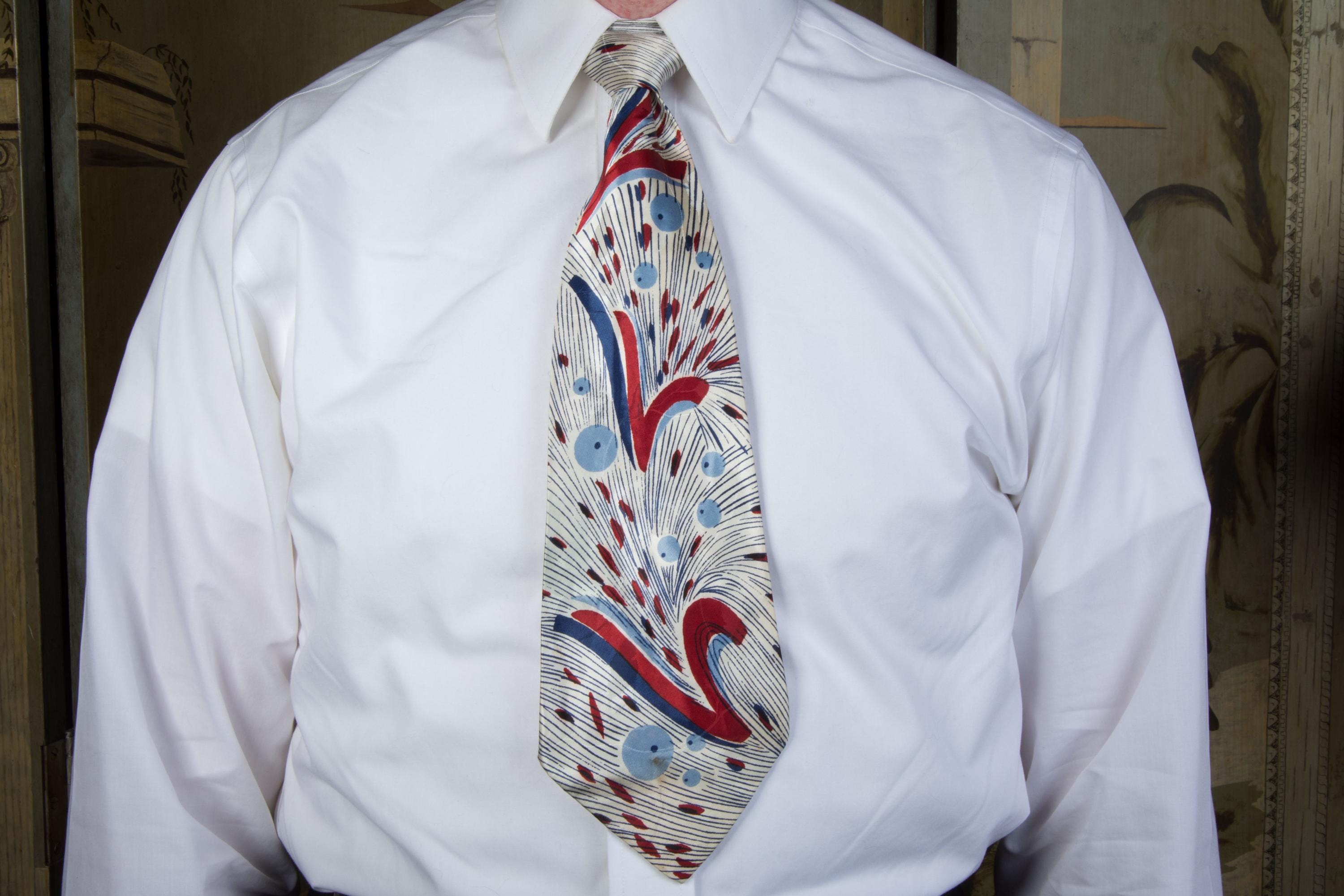 Here's a tie that says a LOT. This exceptionally bold necktie is made in a crisp white, navy and red and the print is just exuberant. It's loud! The lustrous brocade has leaf shapes, but it takes a back seat to the print, which really is the main event, it feels very New-Year-Champagne-Popping-Fireworks. Fully lined.
