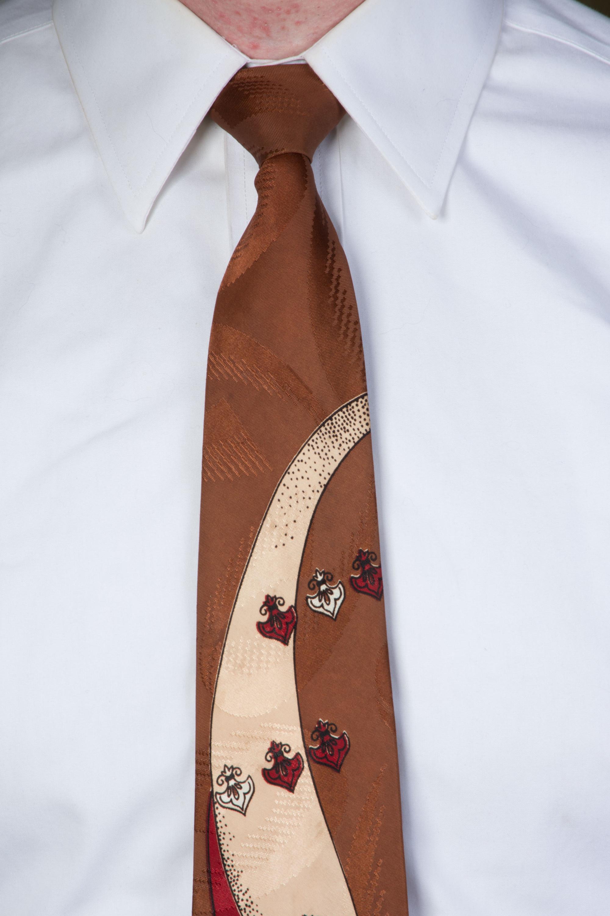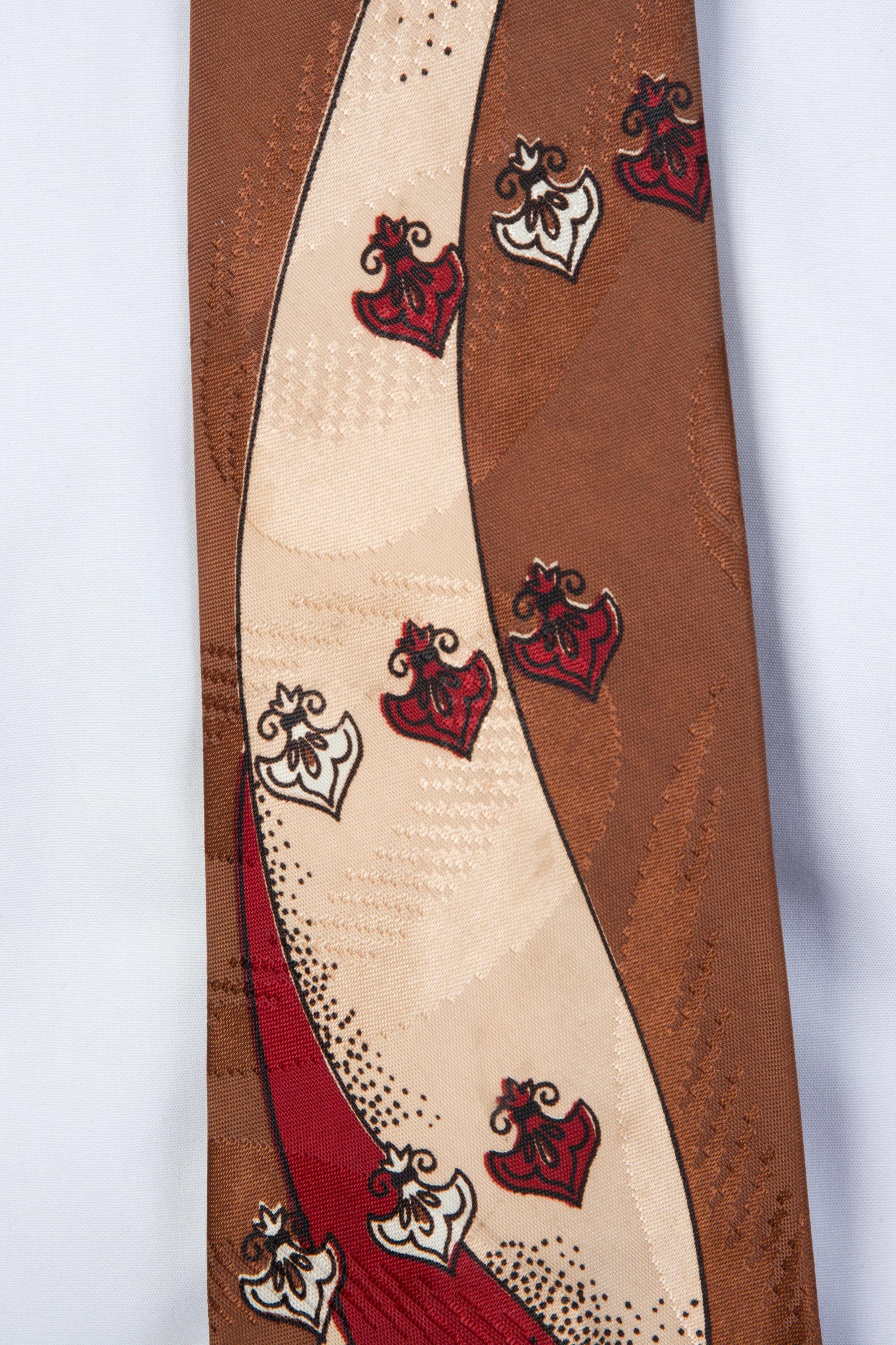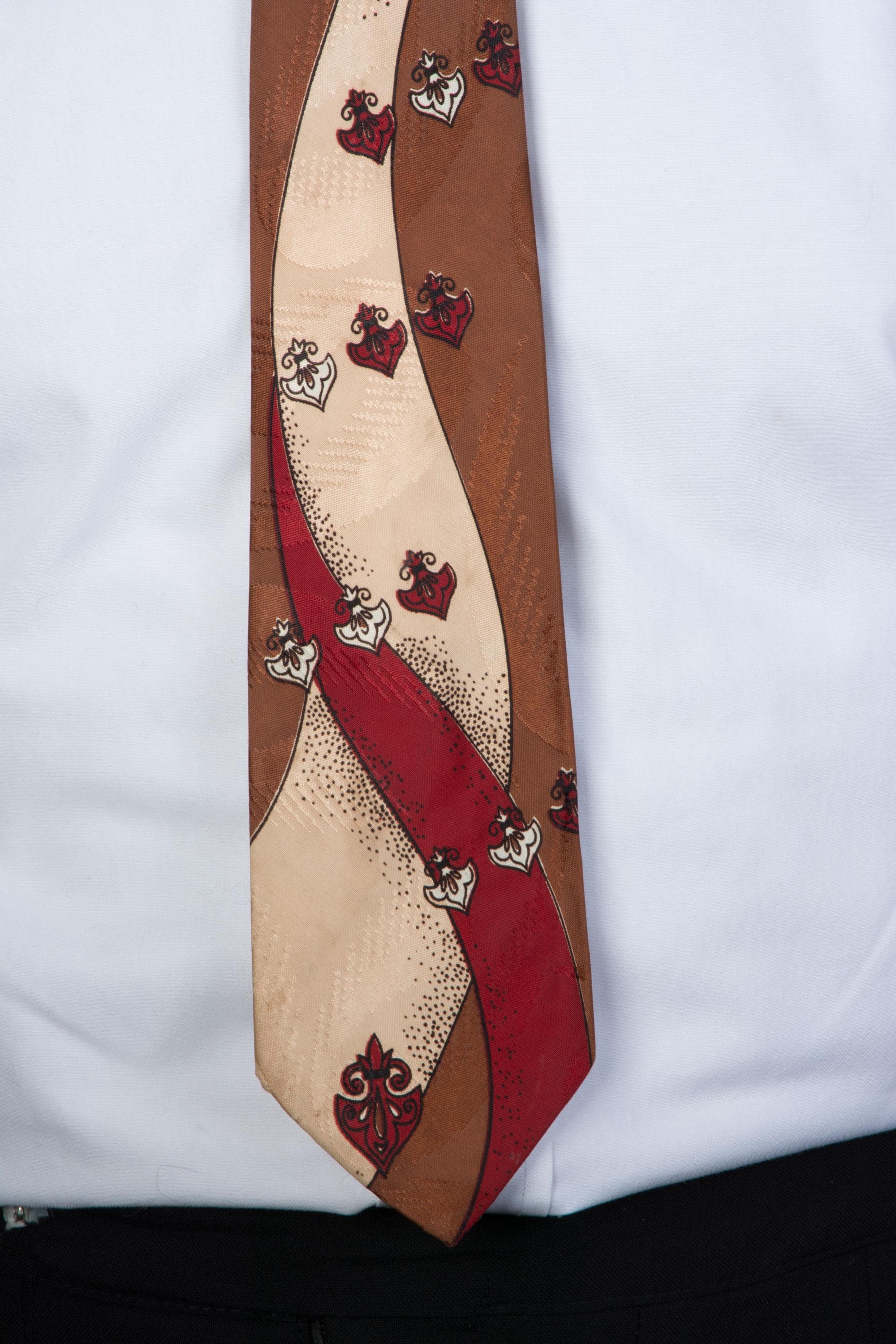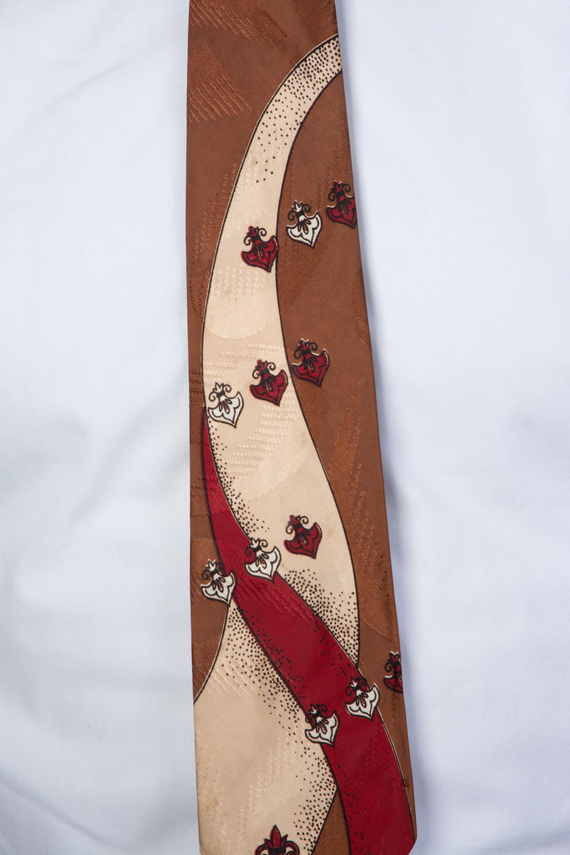 A very glossy 1950s tie, still with some vibes from the bold look era but longer and narrower. The brown brocade has shiny ellipses, while the print is swirling ribbons of peach and deep red, with shapes that are sort of modified fleur de lis. Fully lined.