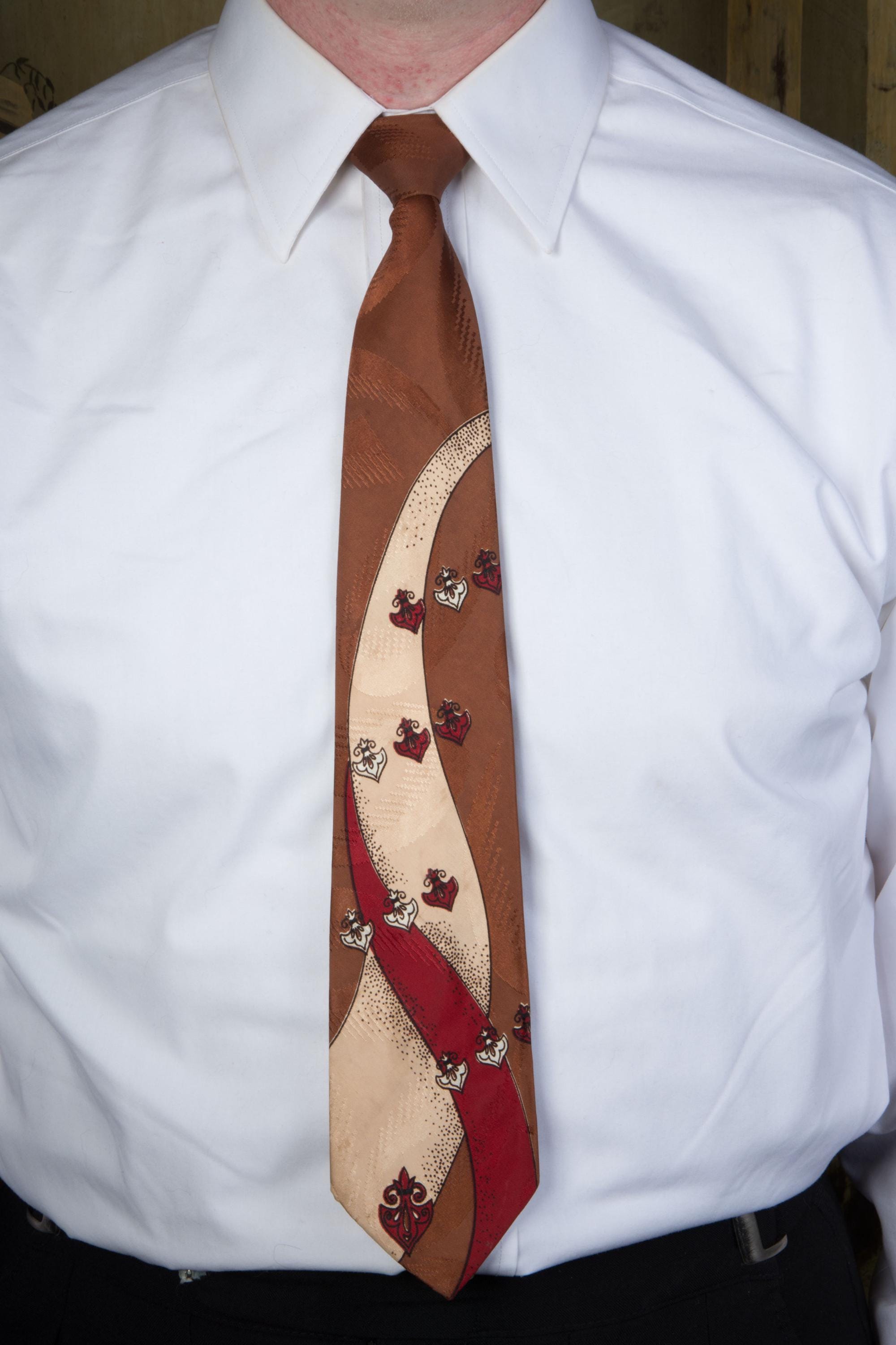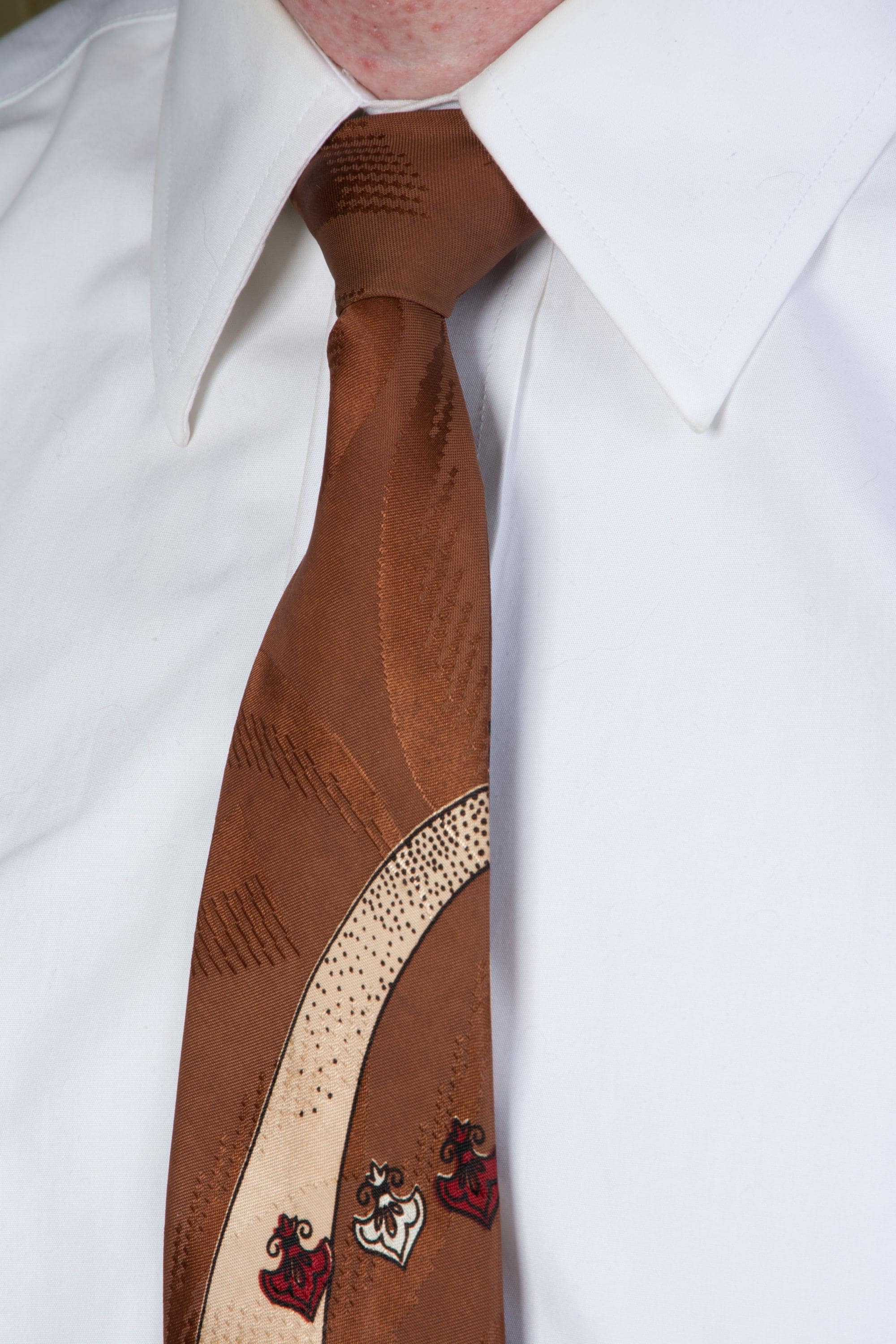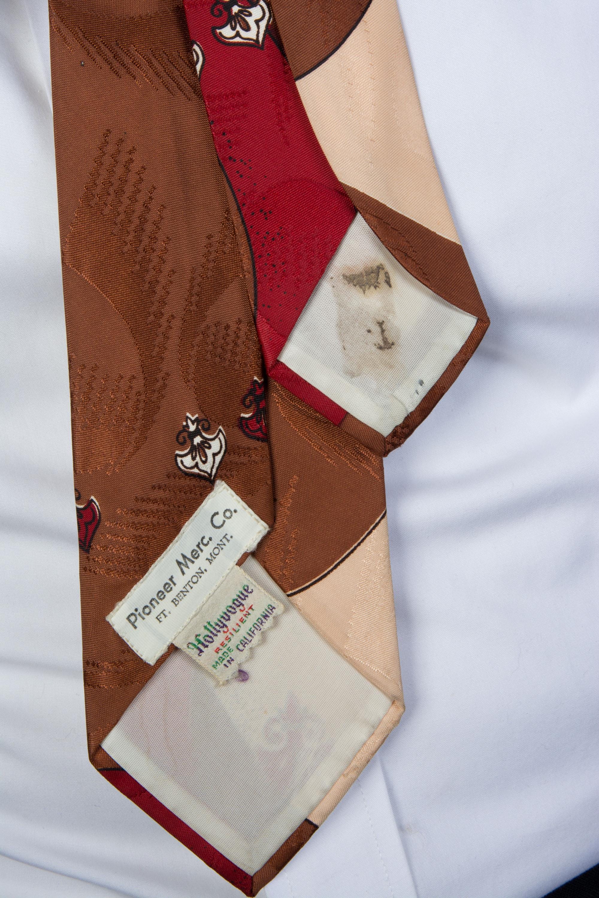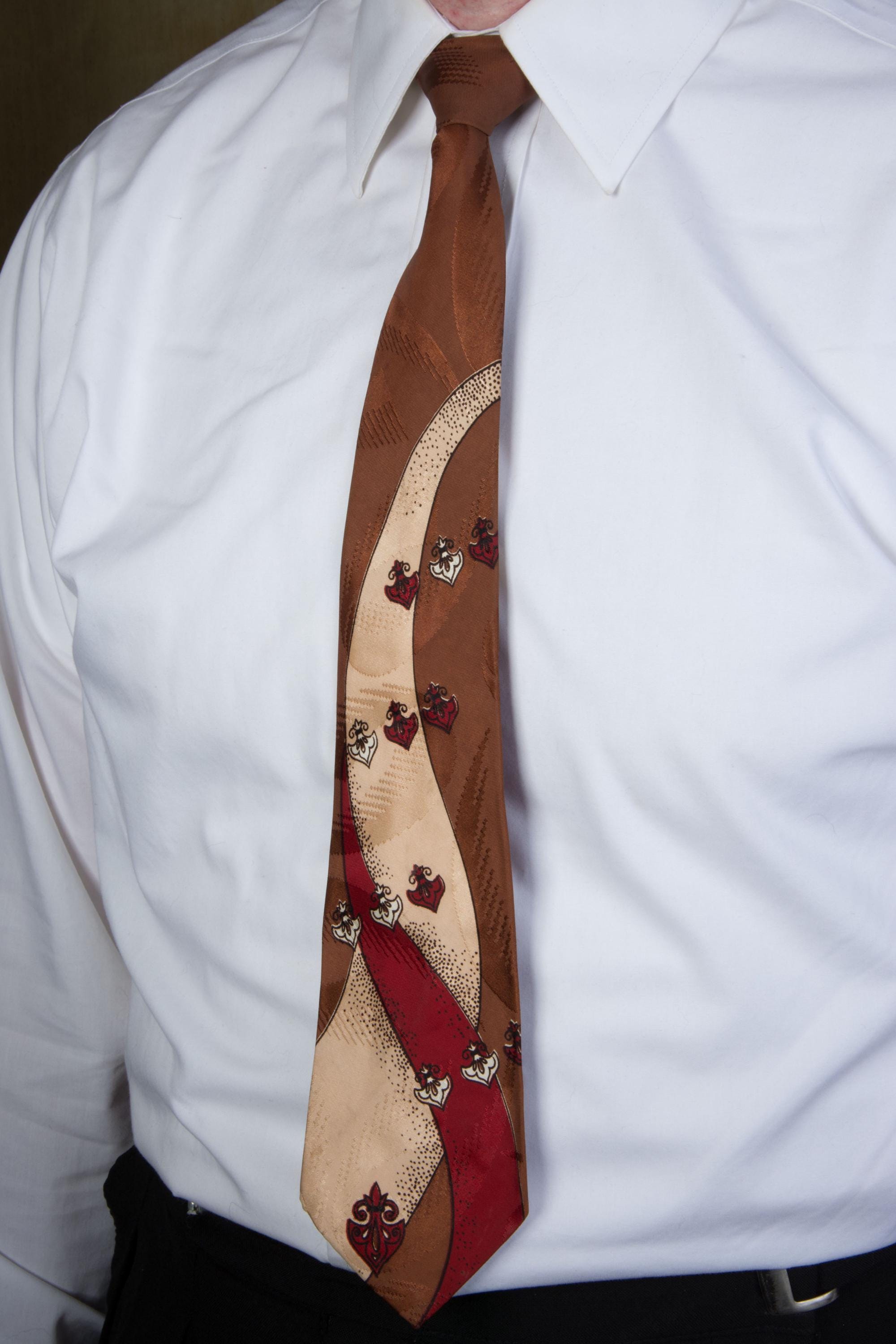 A very glossy 1950s tie, still with some vibes from the bold look era but longer and narrower. The brown brocade has shiny ellipses, while the print is swirling ribbons of peach and deep red, with shapes that are sort of modified fleur de lis. Fully lined.