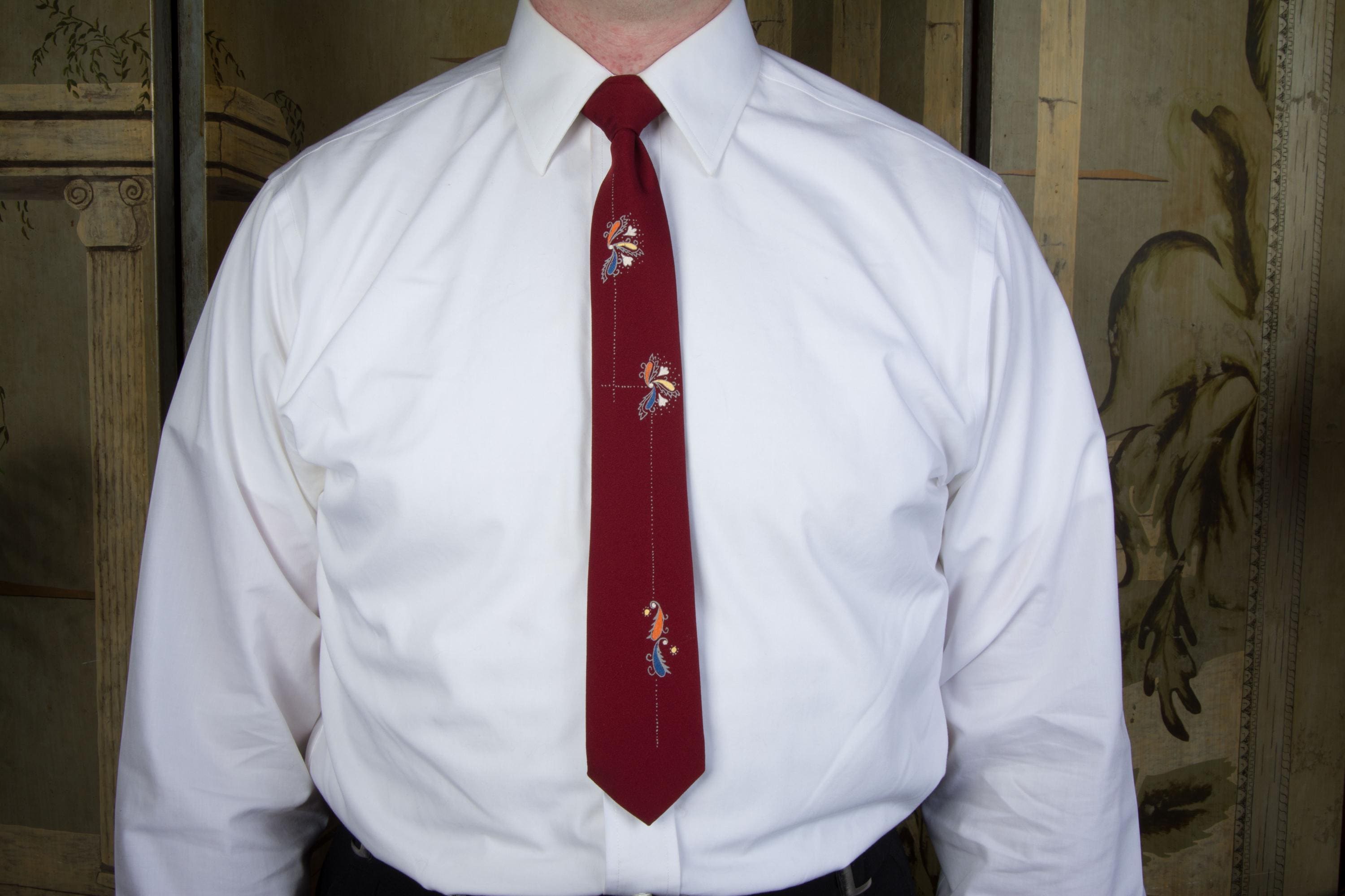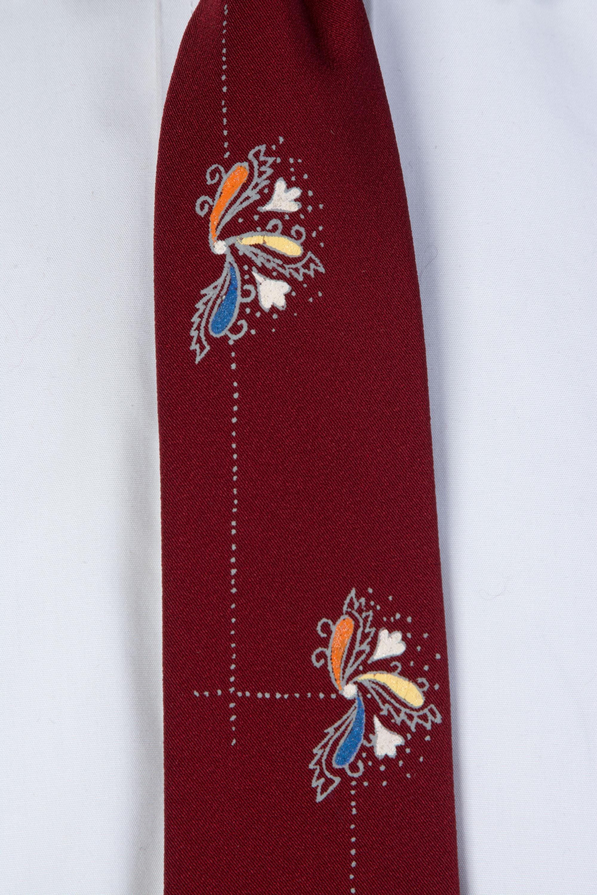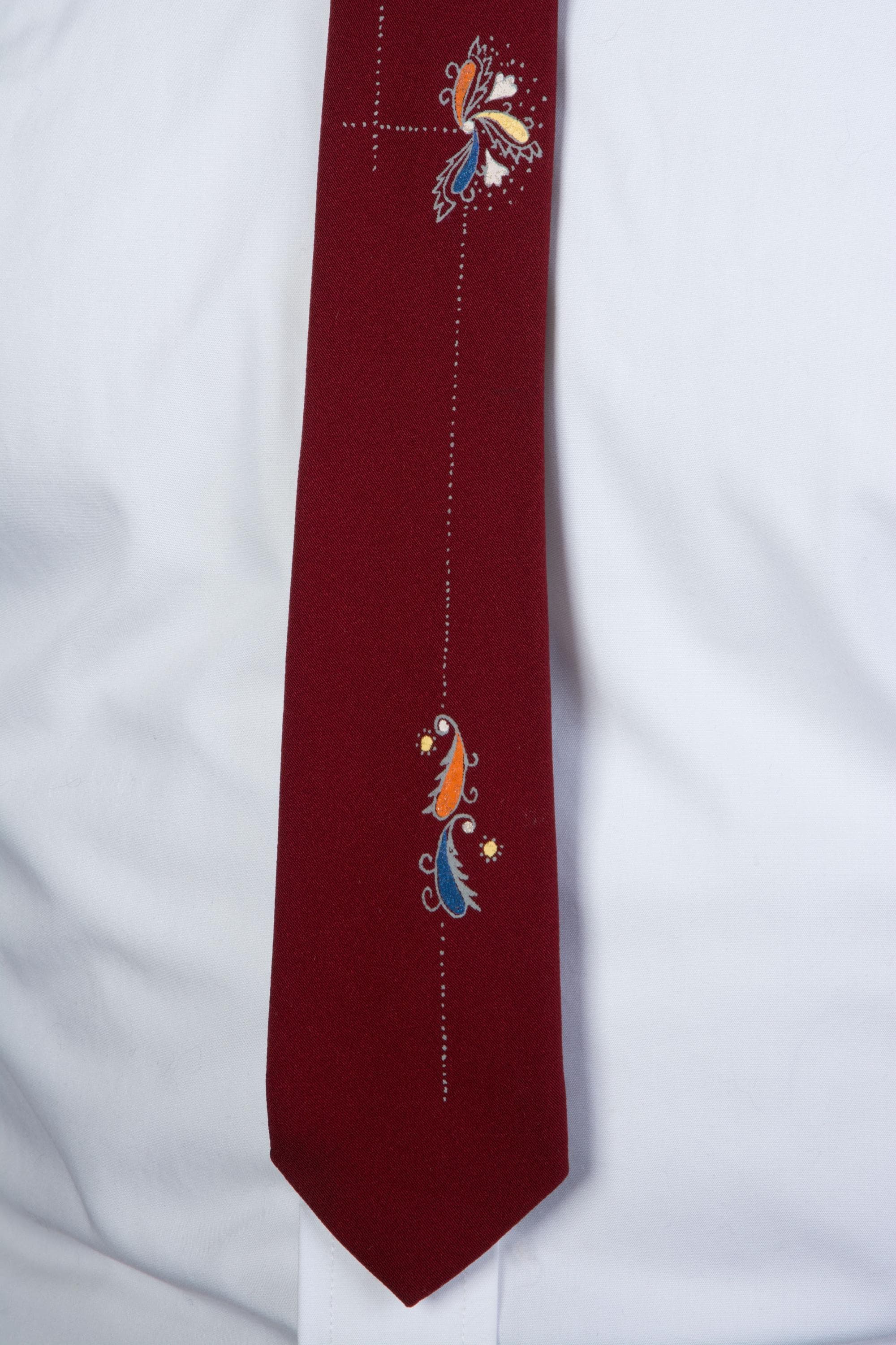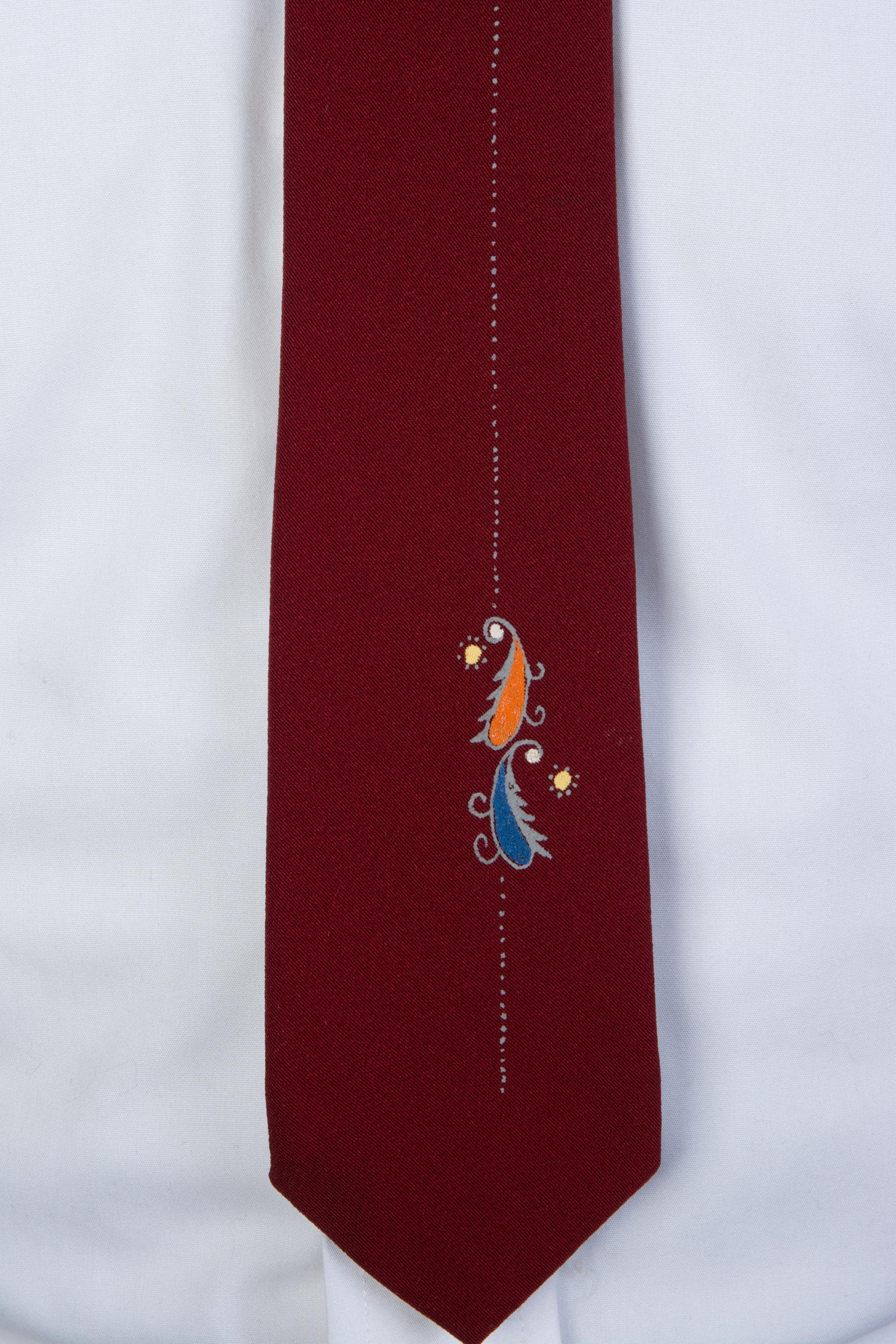 A striking skinner tie from the cusp of the late 1950s to early 1960s. It's skinny but not TOO skinny, and has a bright handpainted motif on rich burgundy faille. The colors are lustrous - reflective, even - orange, white, blue and yellow with subtle grey line work. This tie is fully lined.