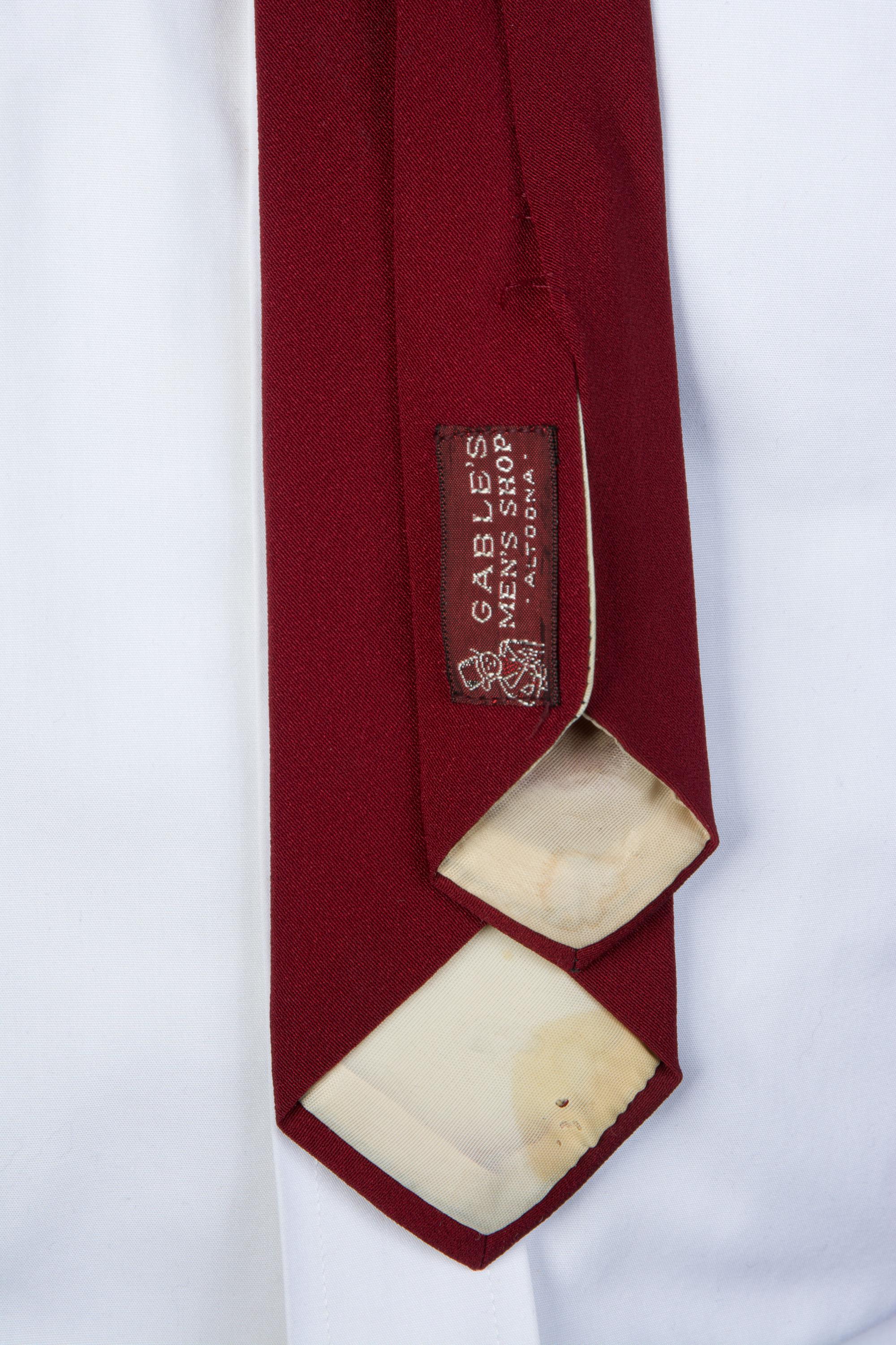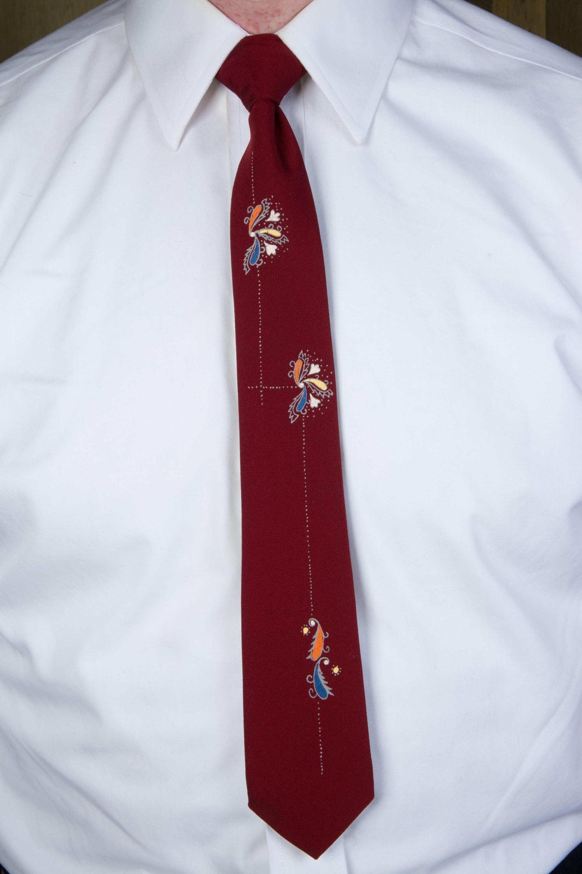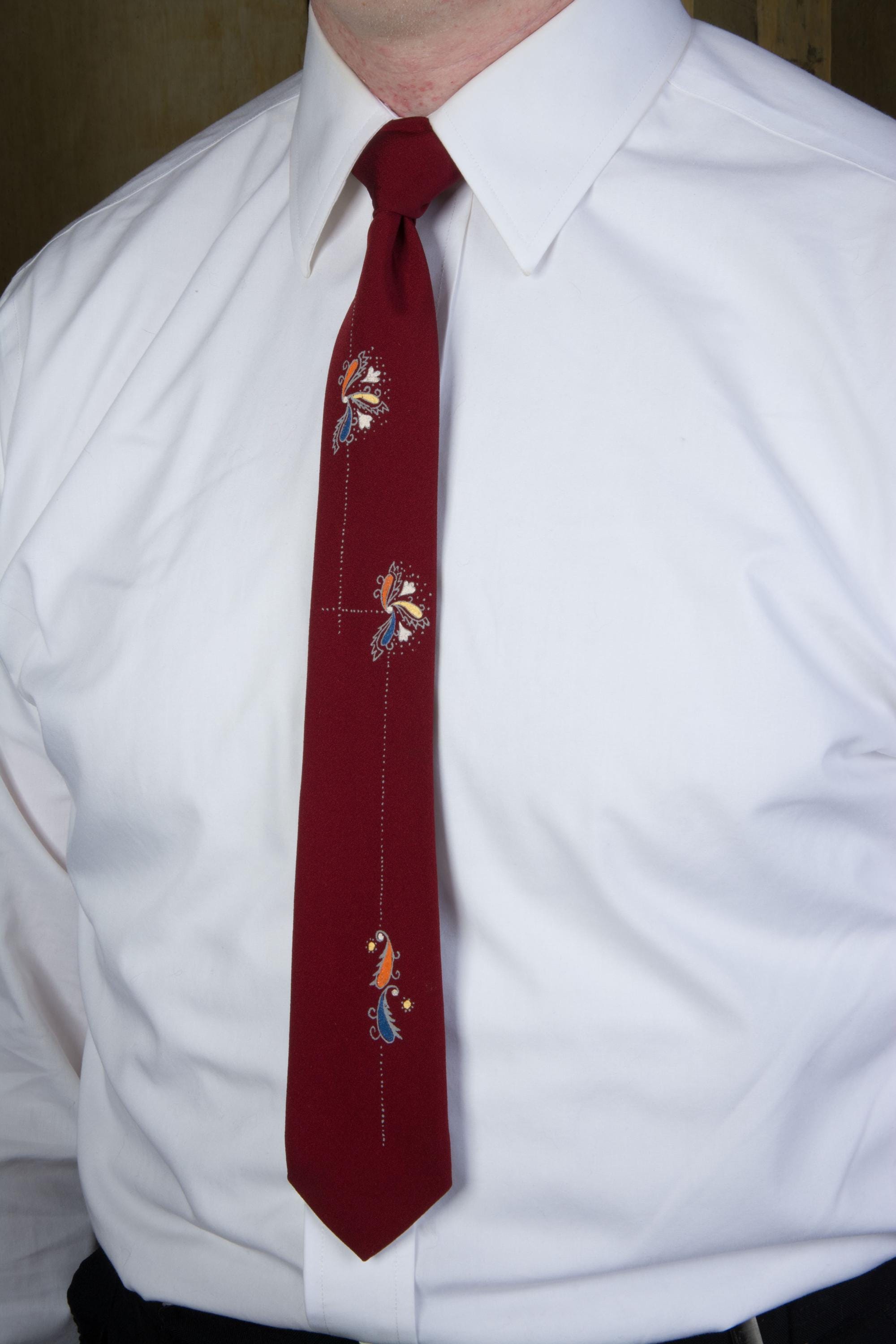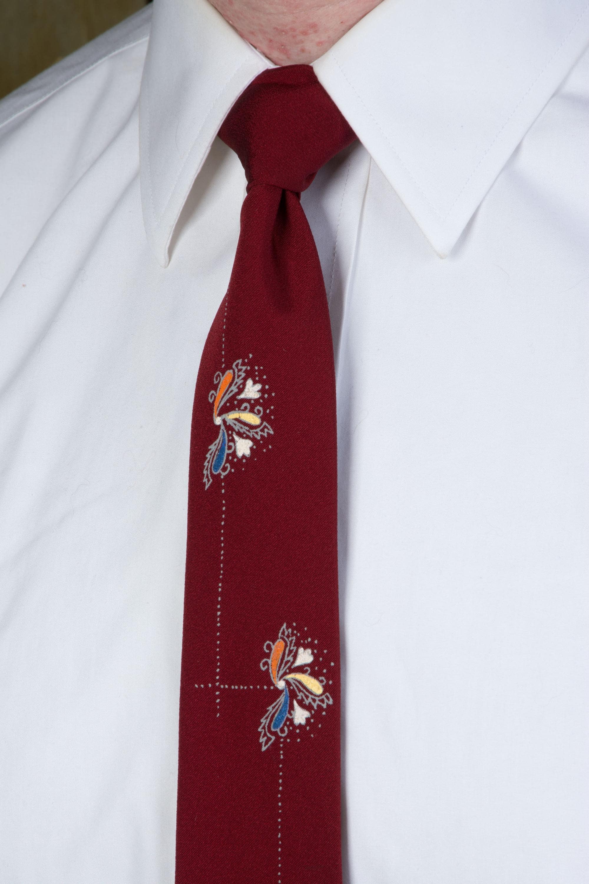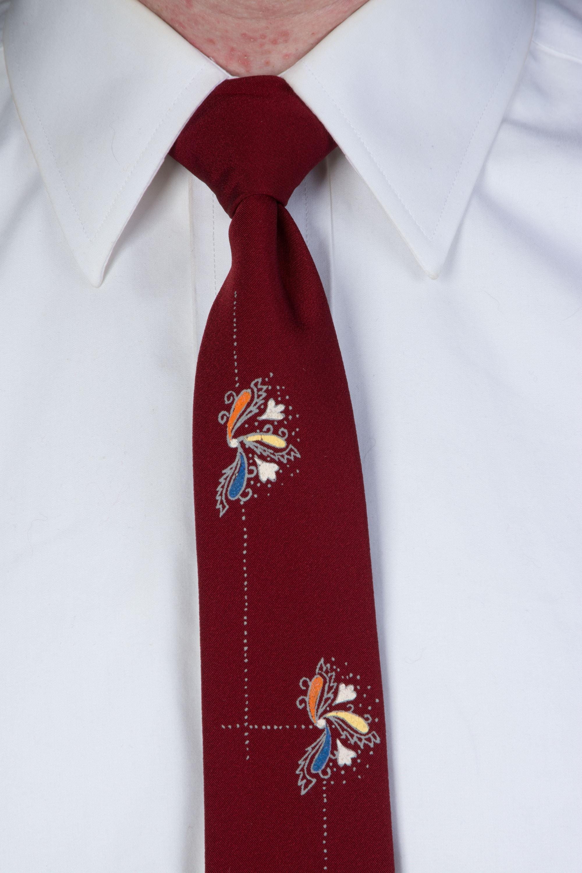 A striking skinner tie from the cusp of the late 1950s to early 1960s. It's skinny but not TOO skinny, and has a bright handpainted motif on rich burgundy faille. The colors are lustrous - reflective, even - orange, white, blue and yellow with subtle grey line work. This tie is fully lined.