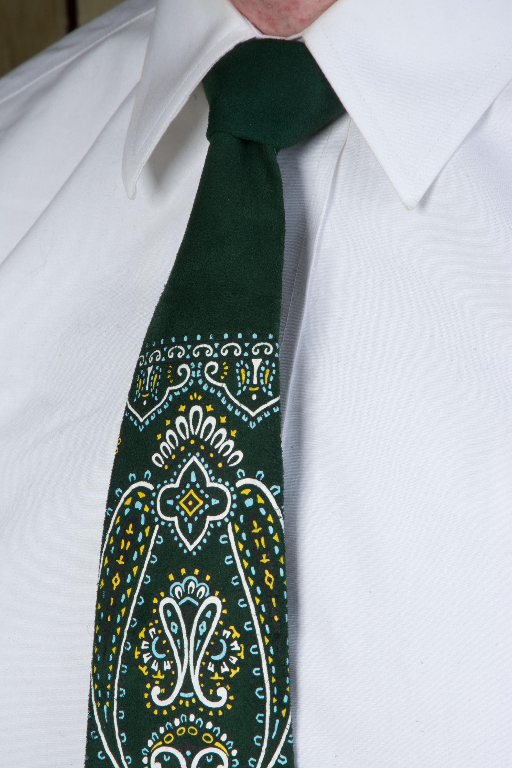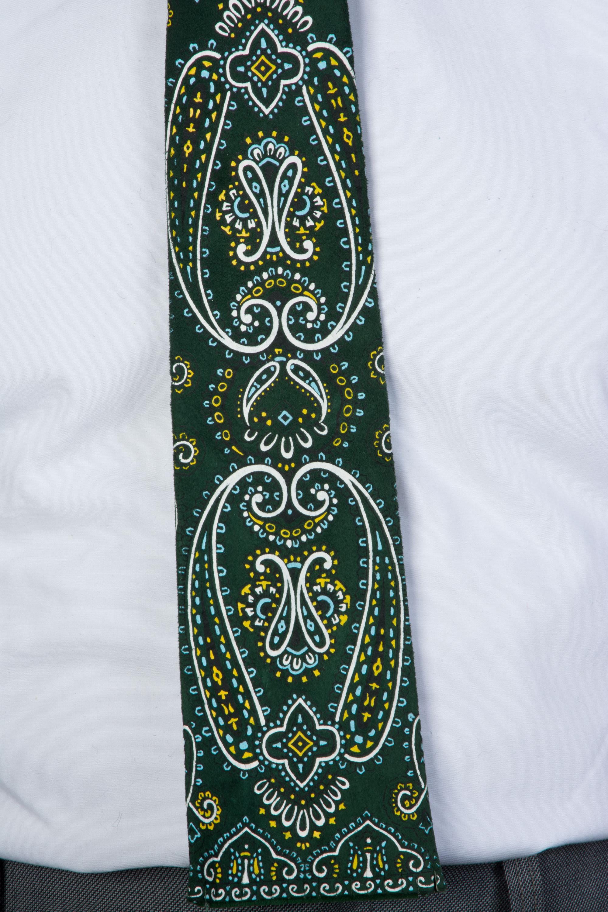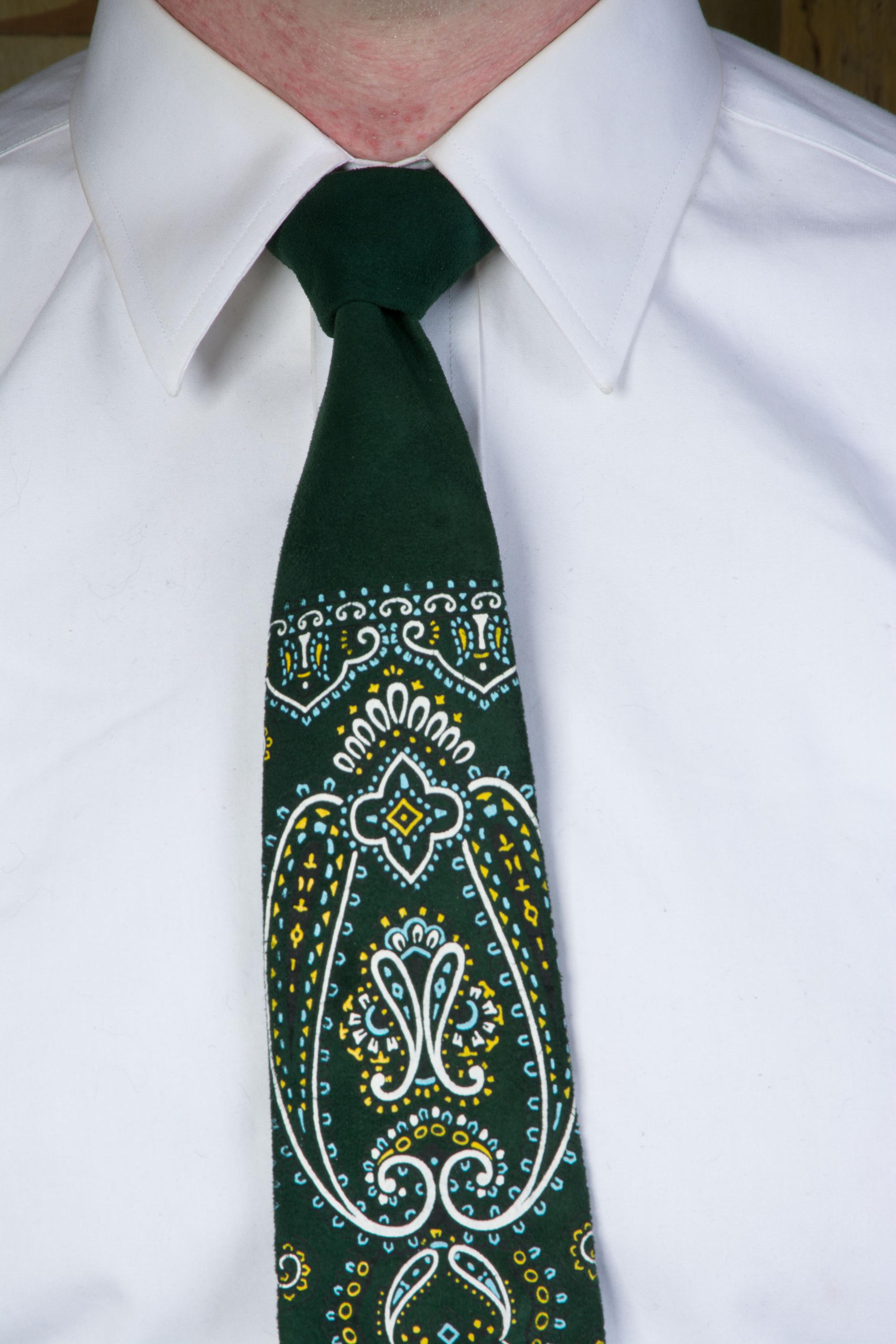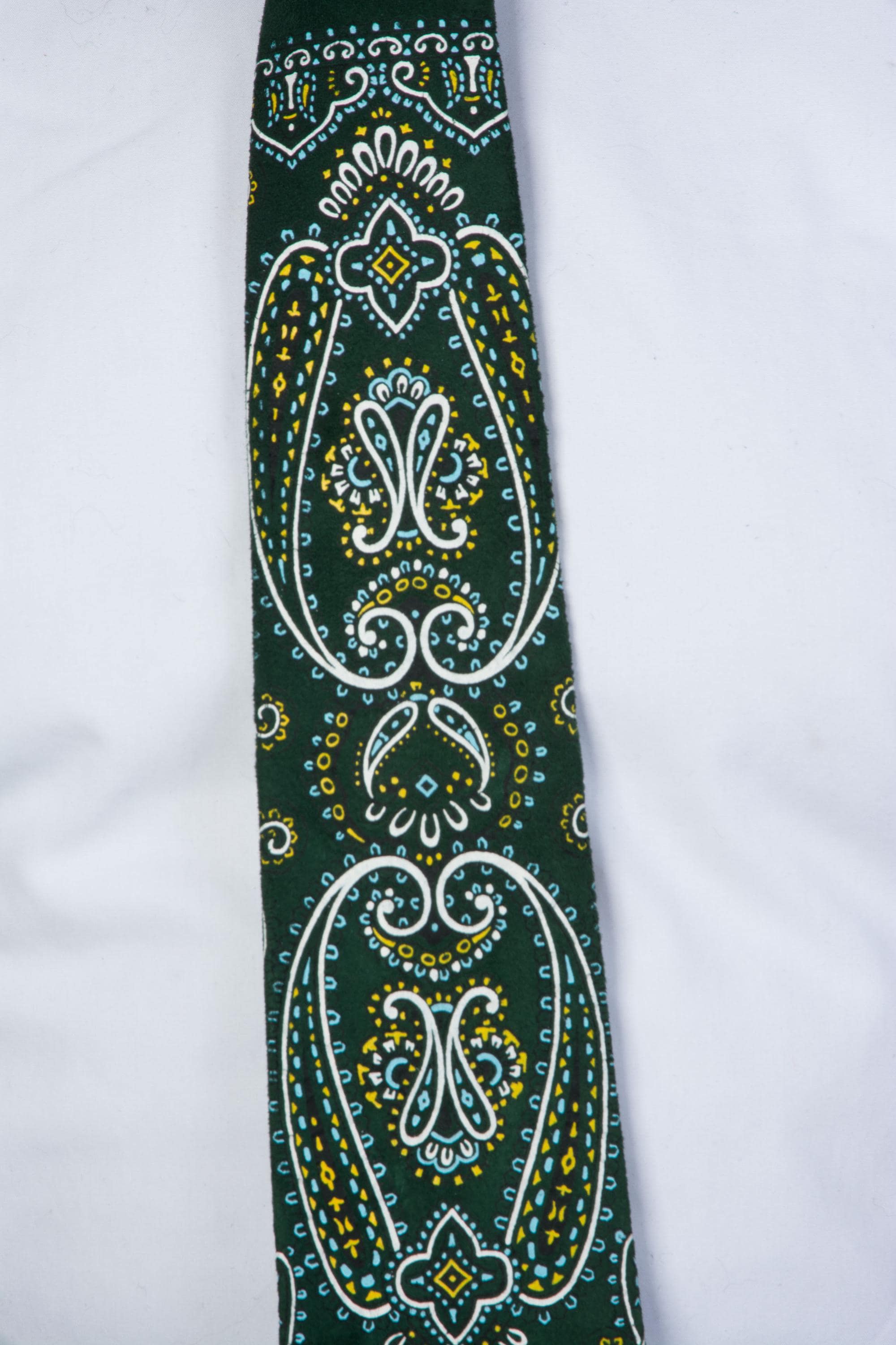 A very unique 1960s square bottom tie made of soft suede and lined with felt. This seems to be a later 1960s look, created in Spain, and it is still fresh, with original paper tags! The forest green suede is screen printed with a lush design in white, yellow and blue.