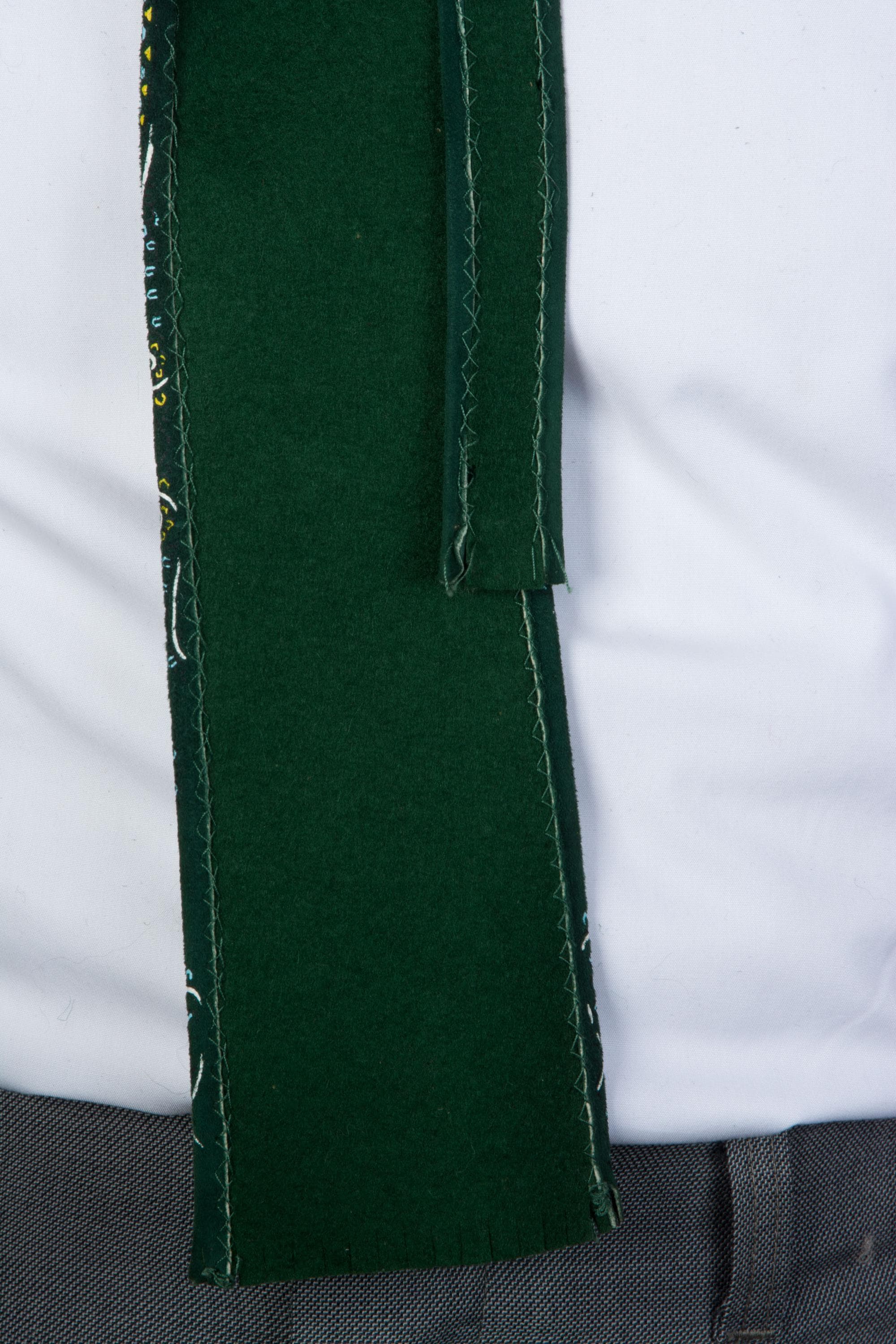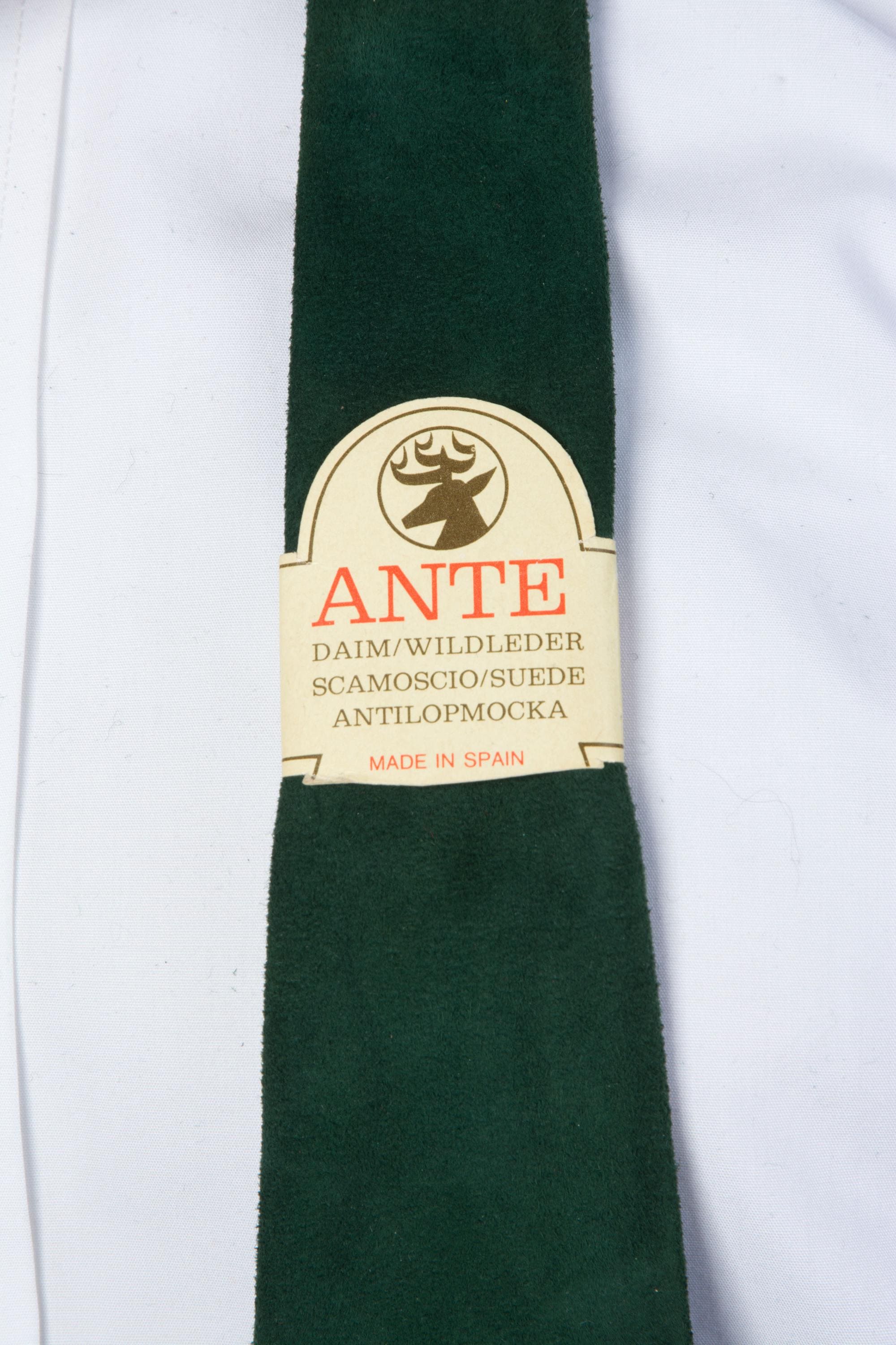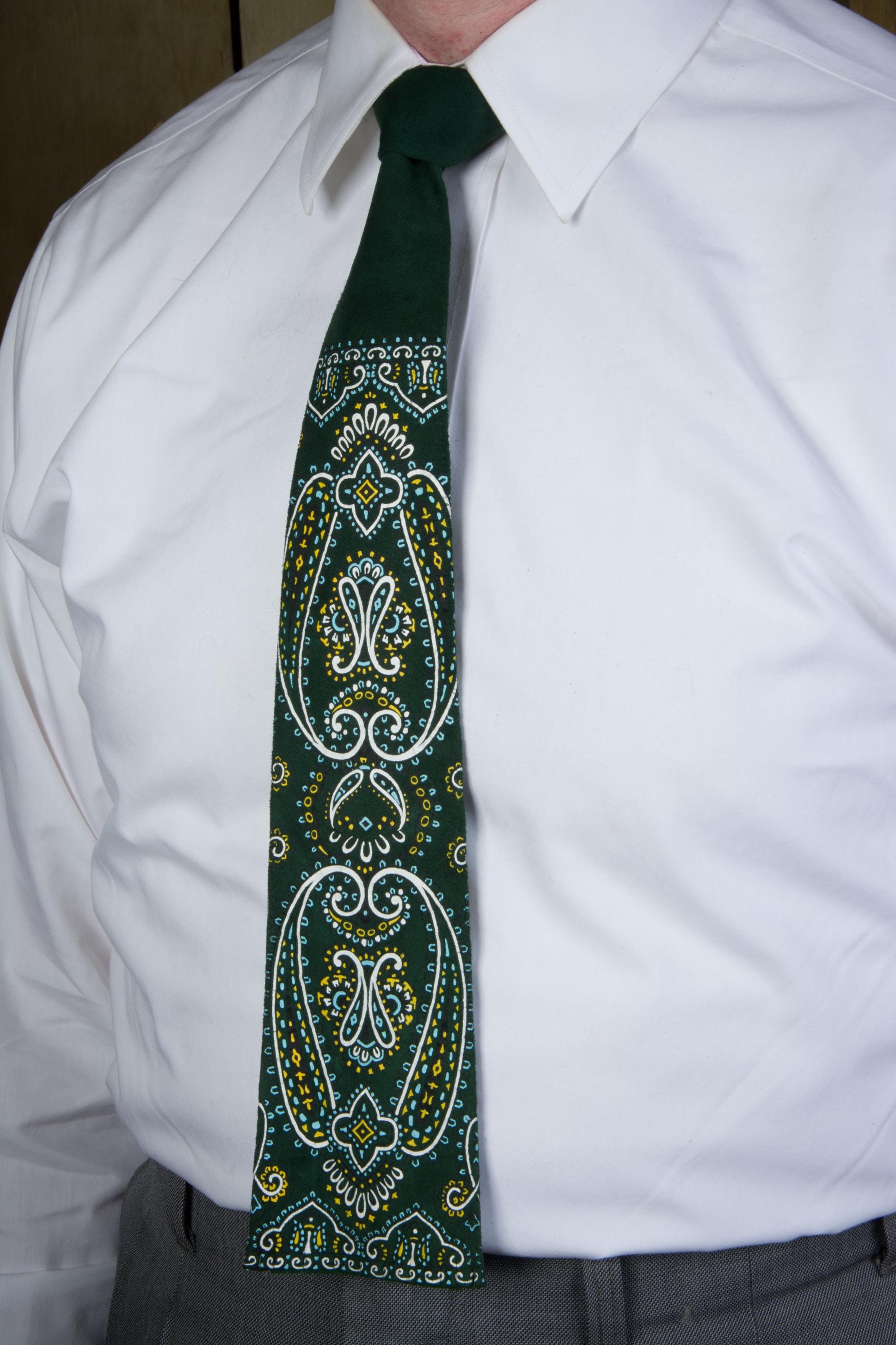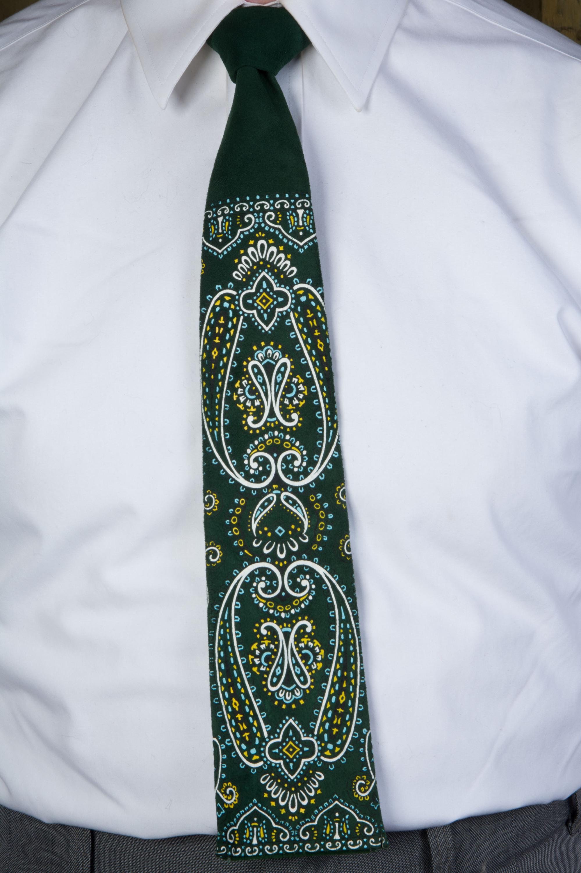 A very unique 1960s square bottom tie made of soft suede and lined with felt. This seems to be a later 1960s look, created in Spain, and it is still fresh, with original paper tags! The forest green suede is screen printed with a lush design in white, yellow and blue.