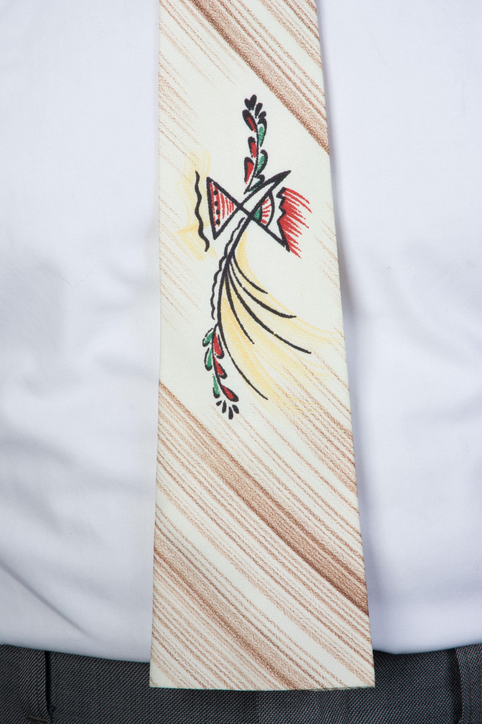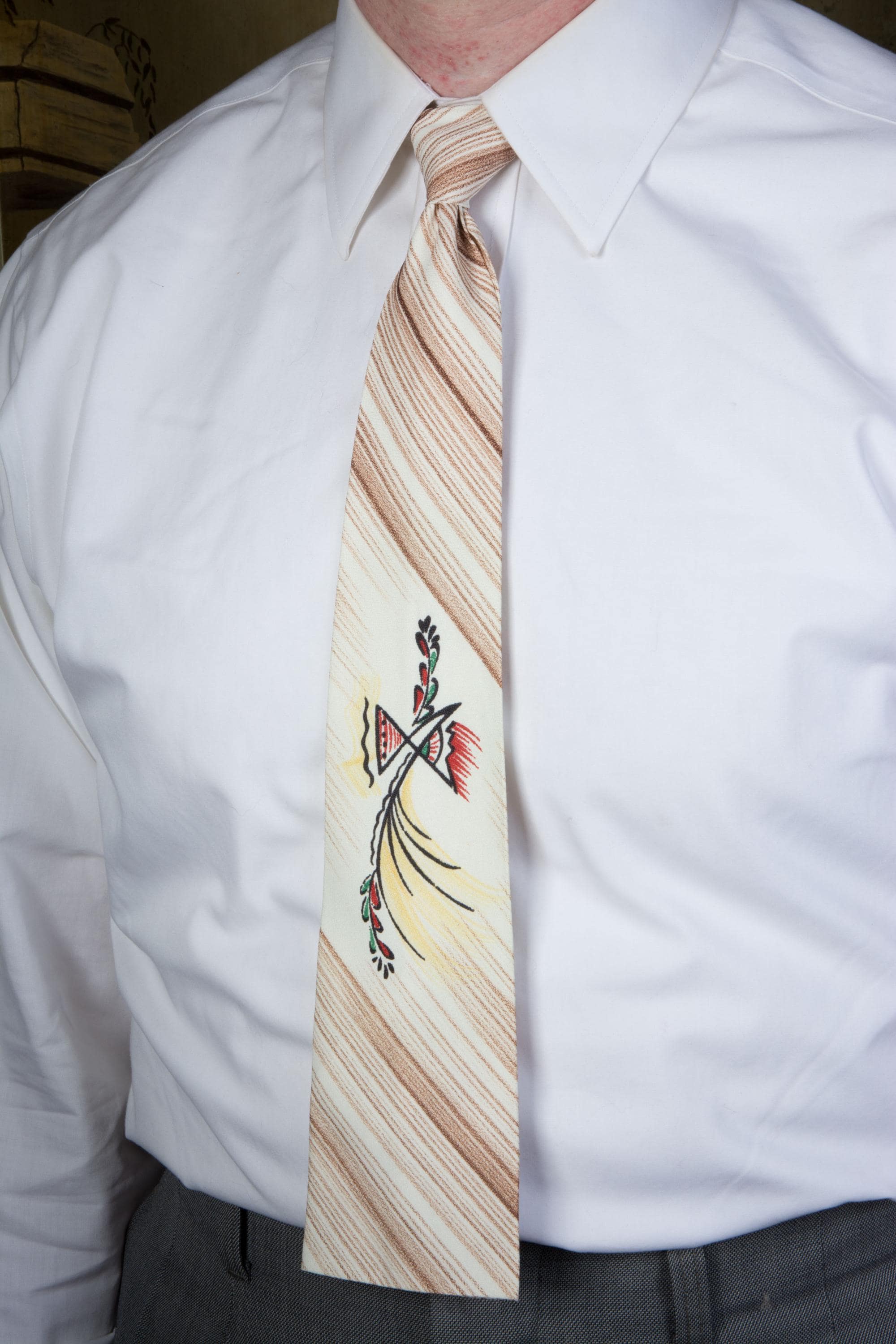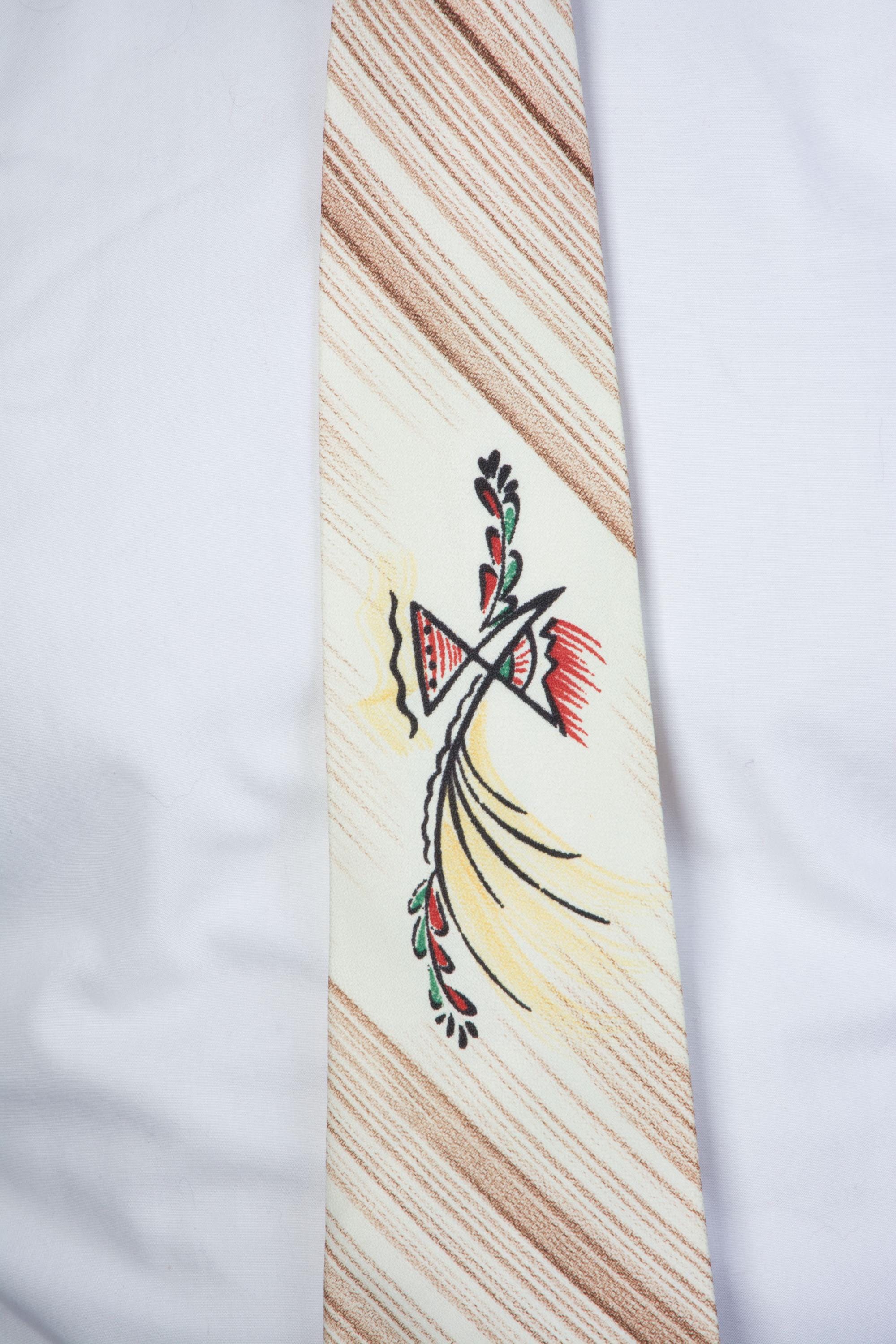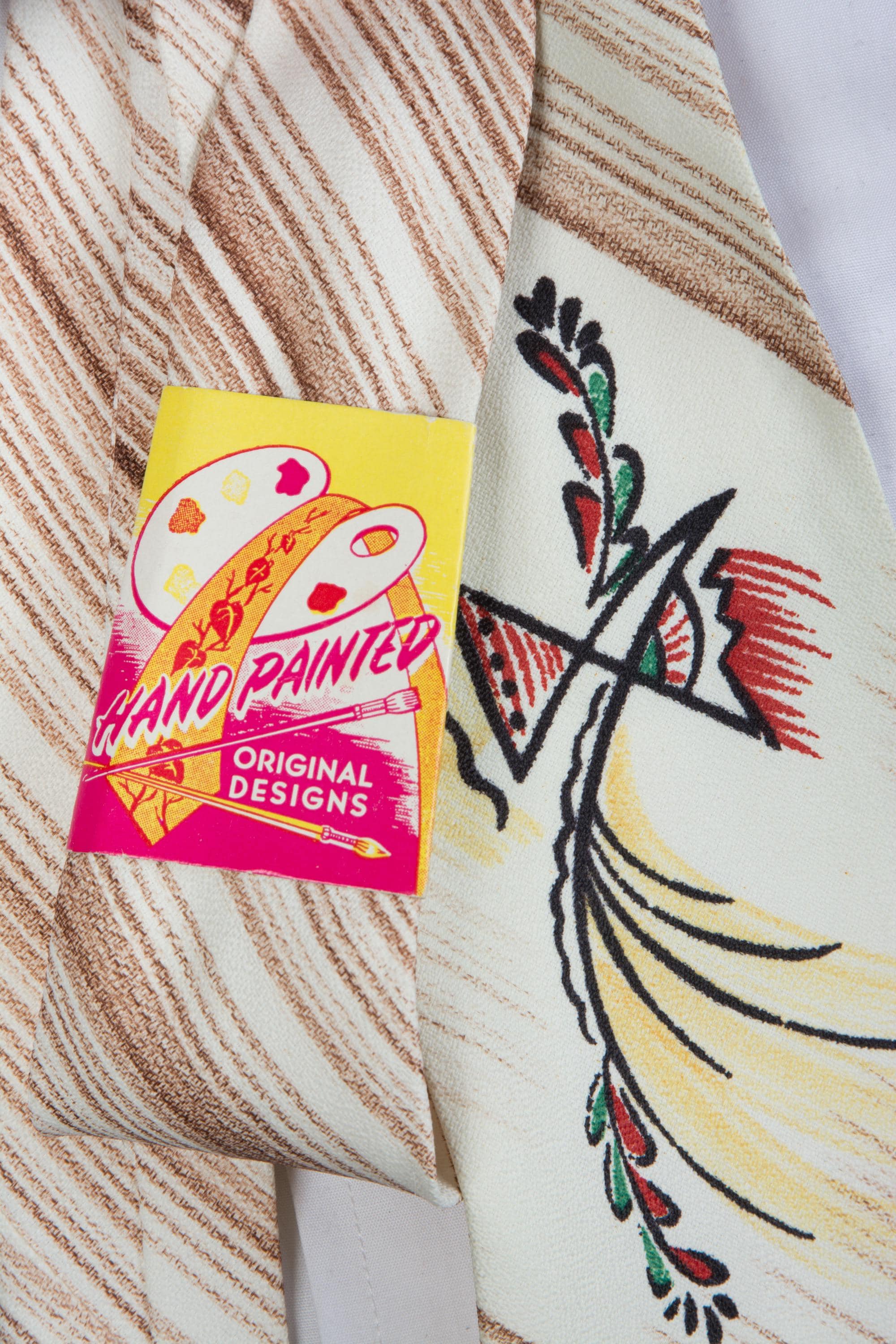 Crisp, fresh and perfect, this striking tie had never before been tied prior to modeling it - and it is just immaculate. Still bearing its brightly colored paper label, this is a handpainted piece.The material is a rayon and acetate crepe with airbrushed lined printe and then hand colored southwestrn motif. Self-lined via finished folds.