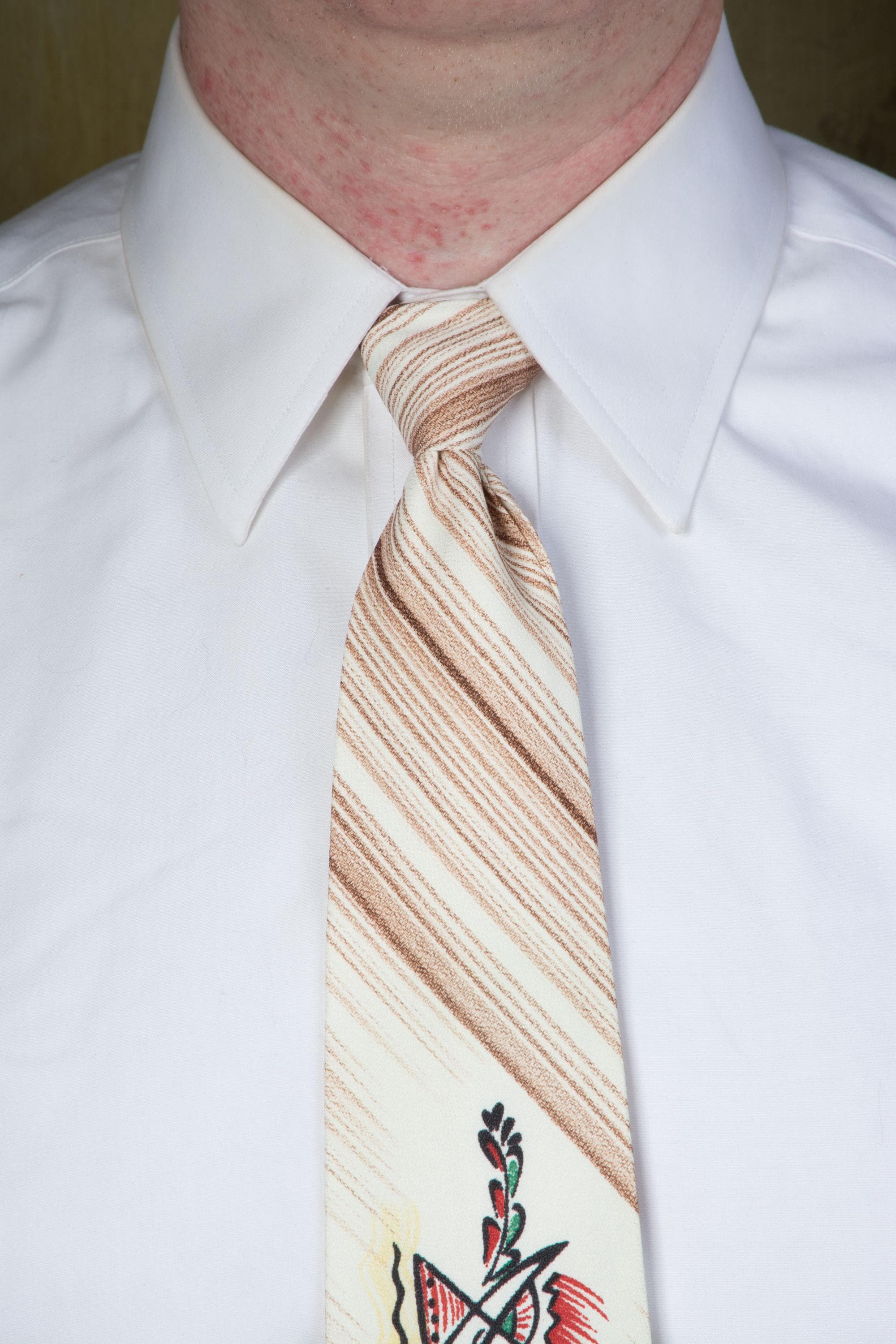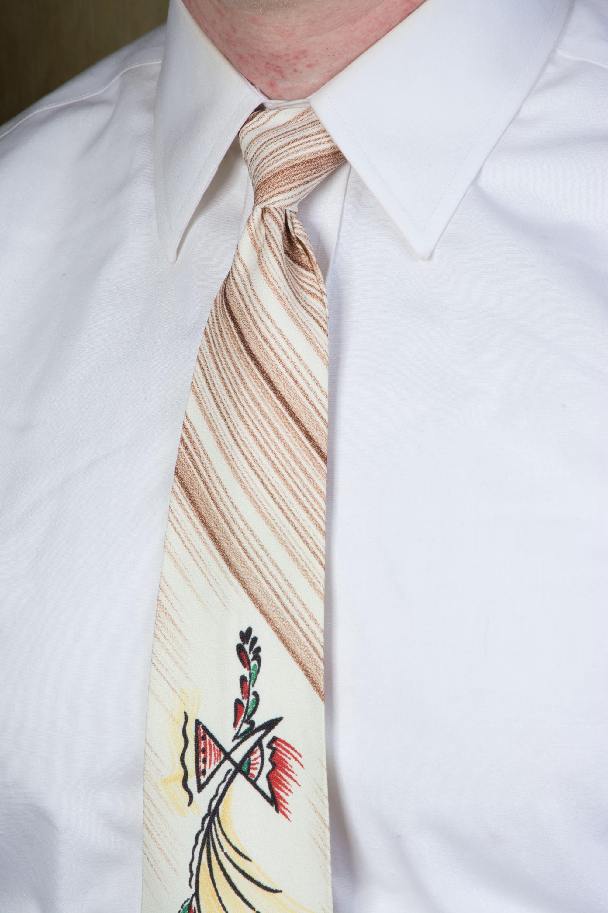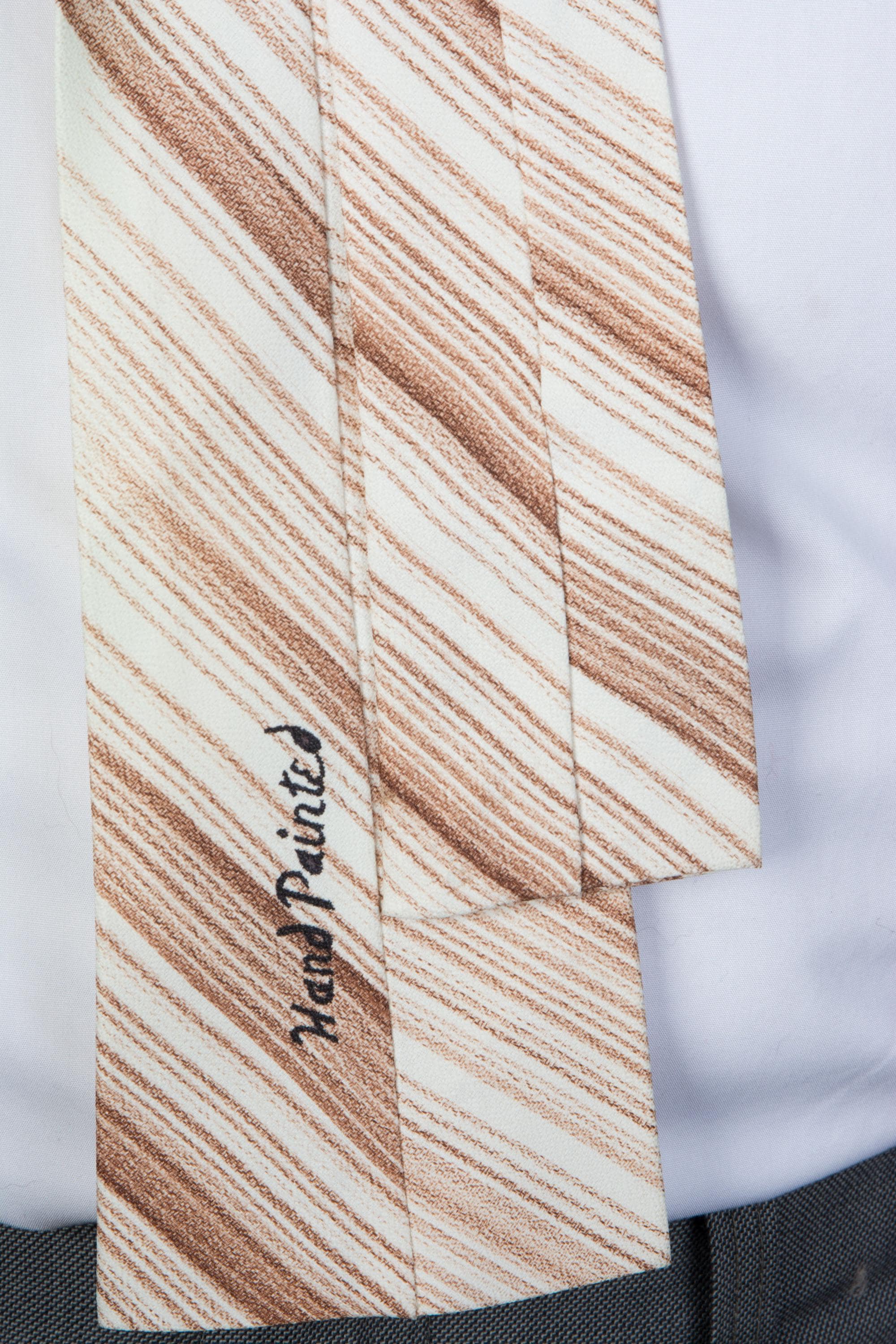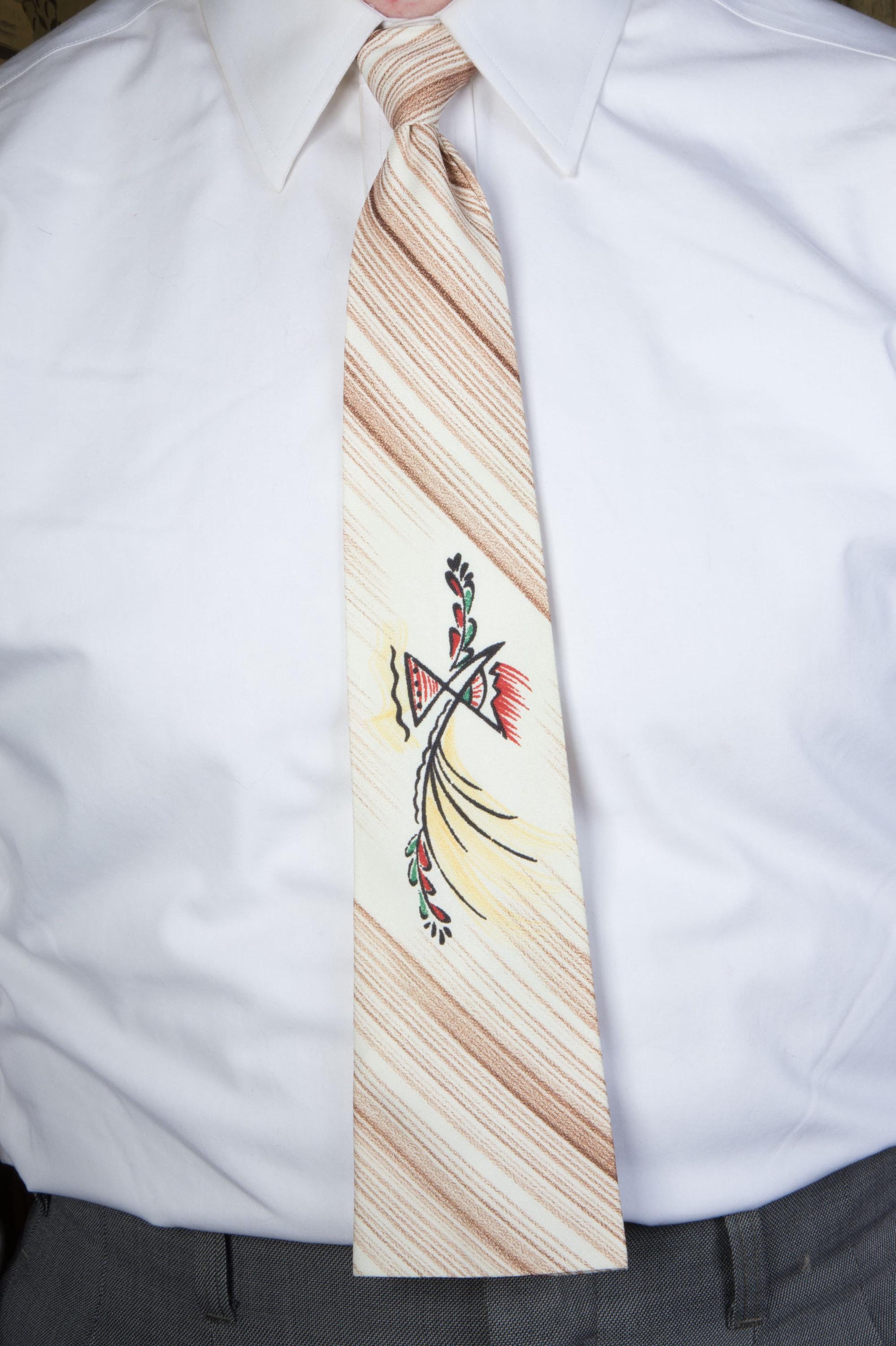 Crisp, fresh and perfect, this striking tie had never before been tied prior to modeling it - and it is just immaculate. Still bearing its brightly colored paper label, this is a handpainted piece.The material is a rayon and acetate crepe with airbrushed lined printe and then hand colored southwestrn motif. Self-lined via finished folds.