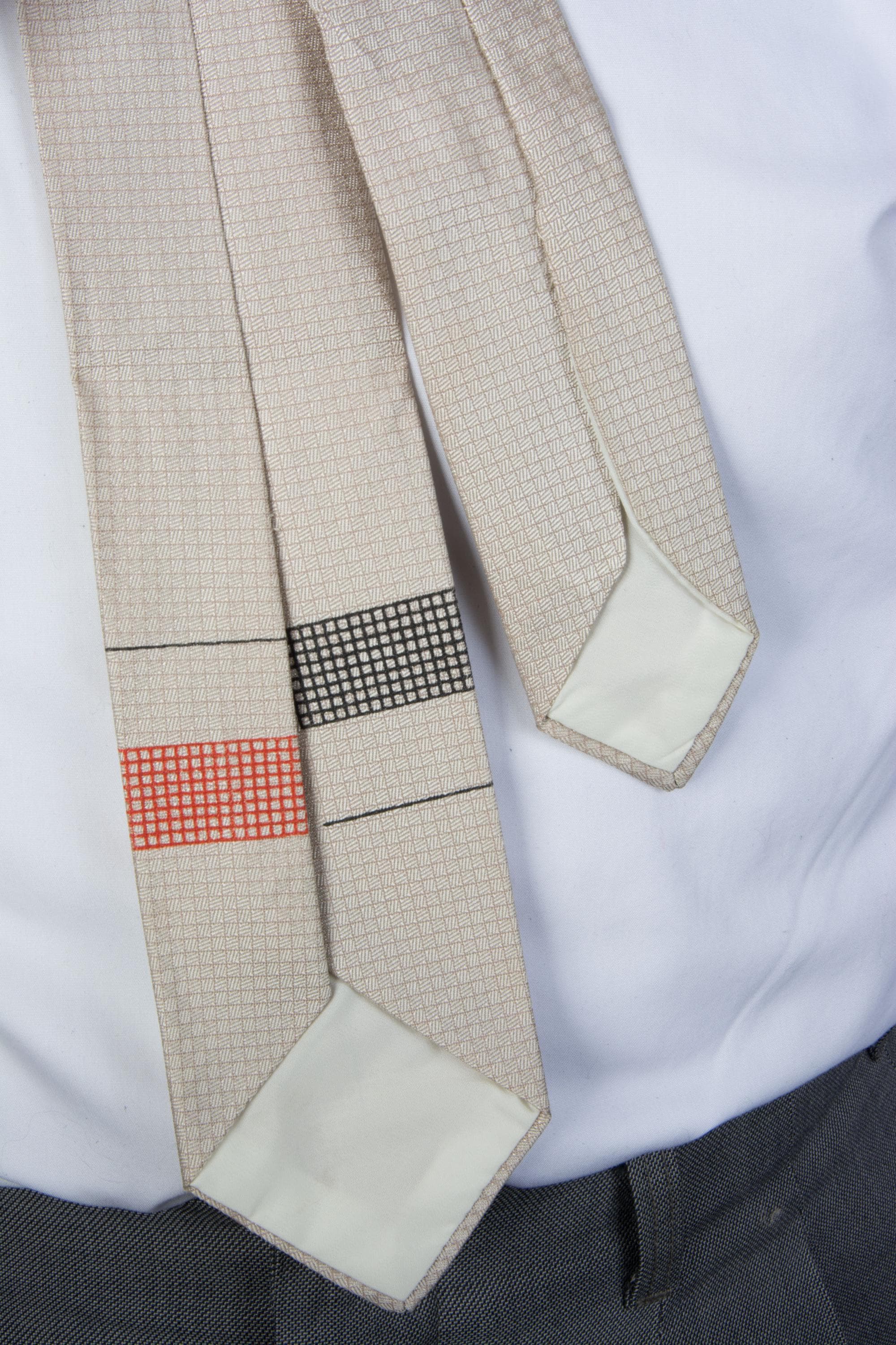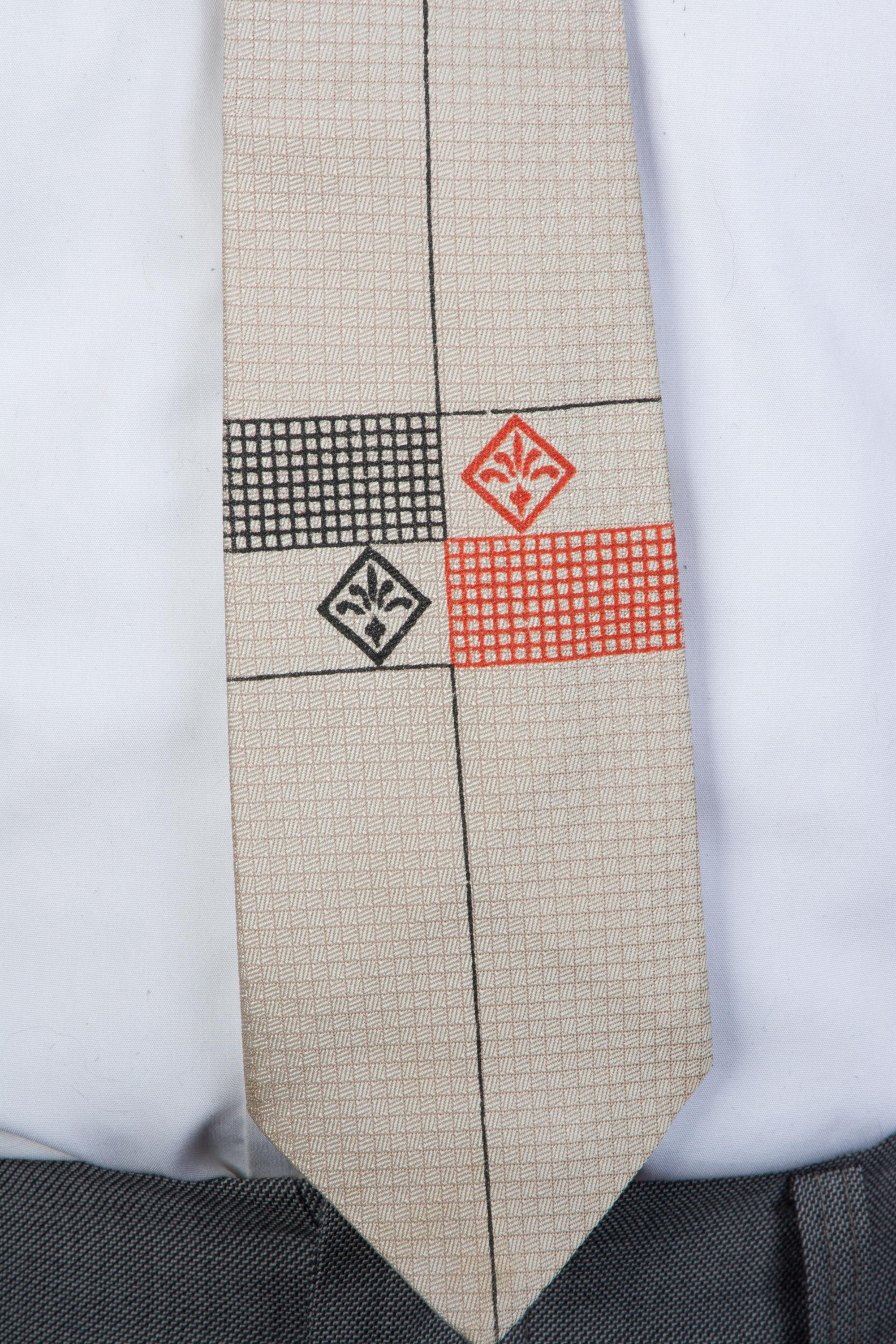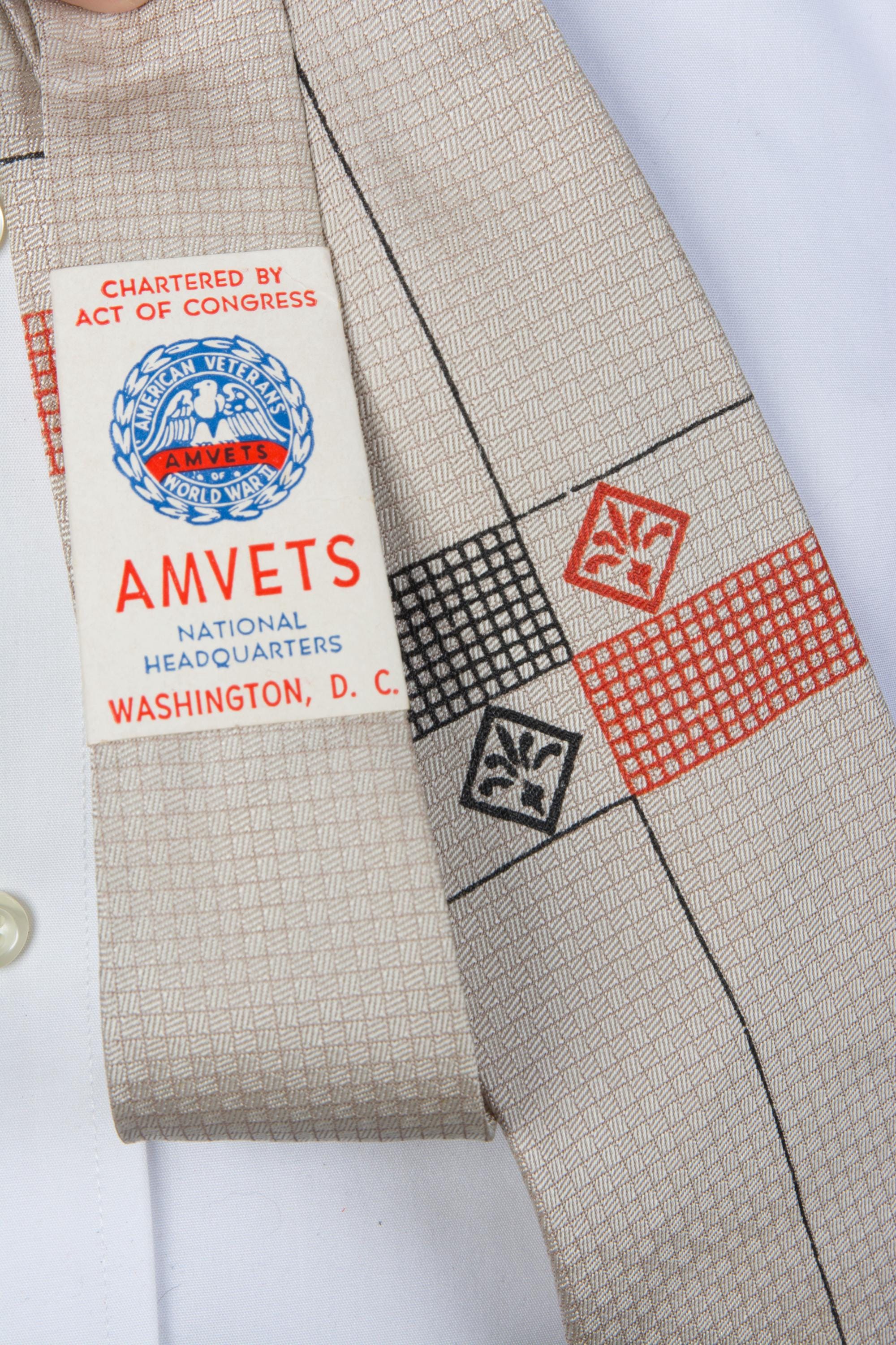 Perfect, fresh and bright, this beautiful early 1950s tie had never before been tied prior to modeling it - and it is just immaculate. Still bearing its paper label, this labeled as being from AMVET, a legitimate organization created by Congress - but the neckties are a scheme, where they send you unsolicited neckties. See the attached editorial letter. It's a great, tie, though - a warm silvery tone with lustrous brocade check, and printed in black and red. Fully lined.