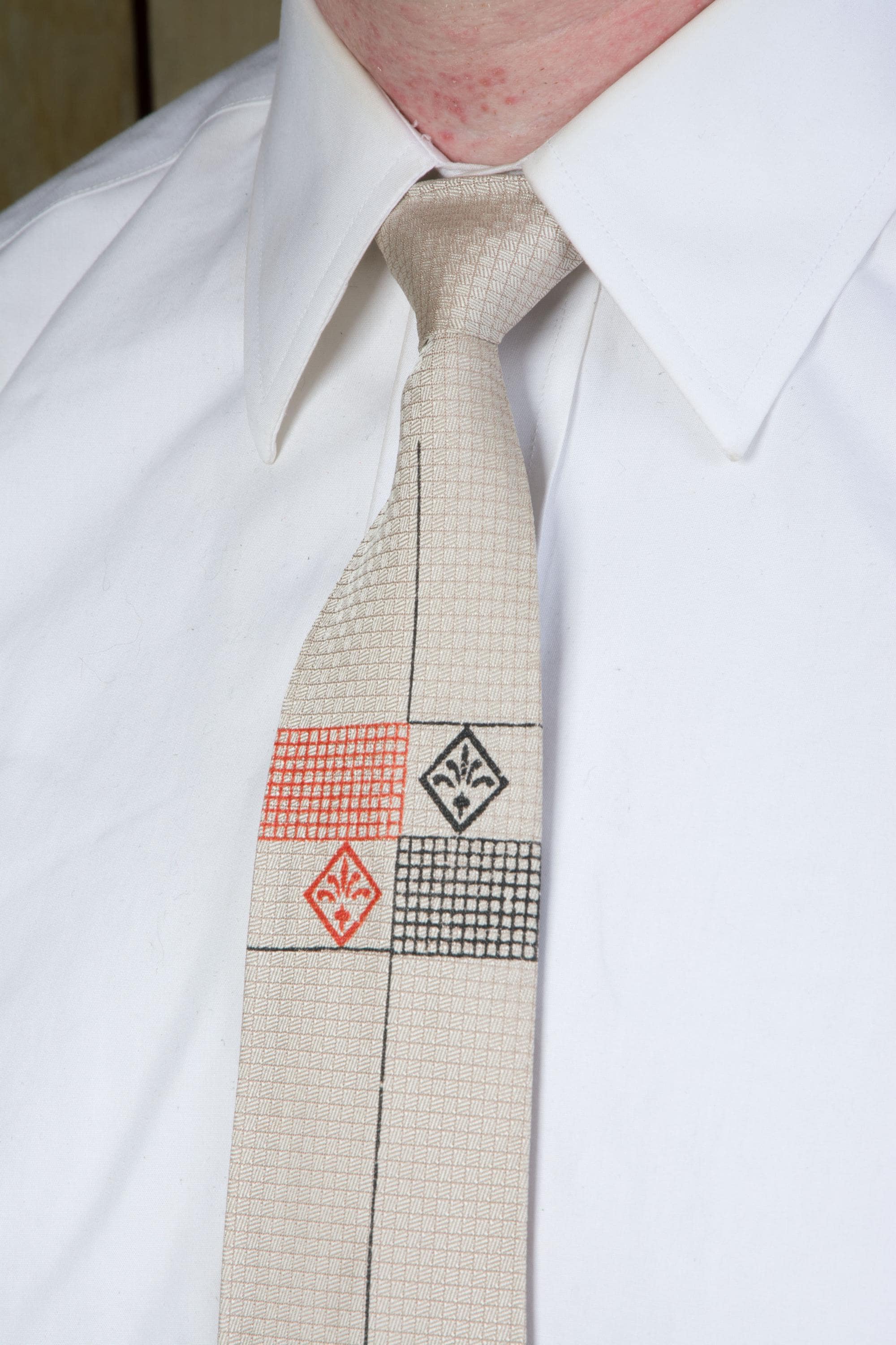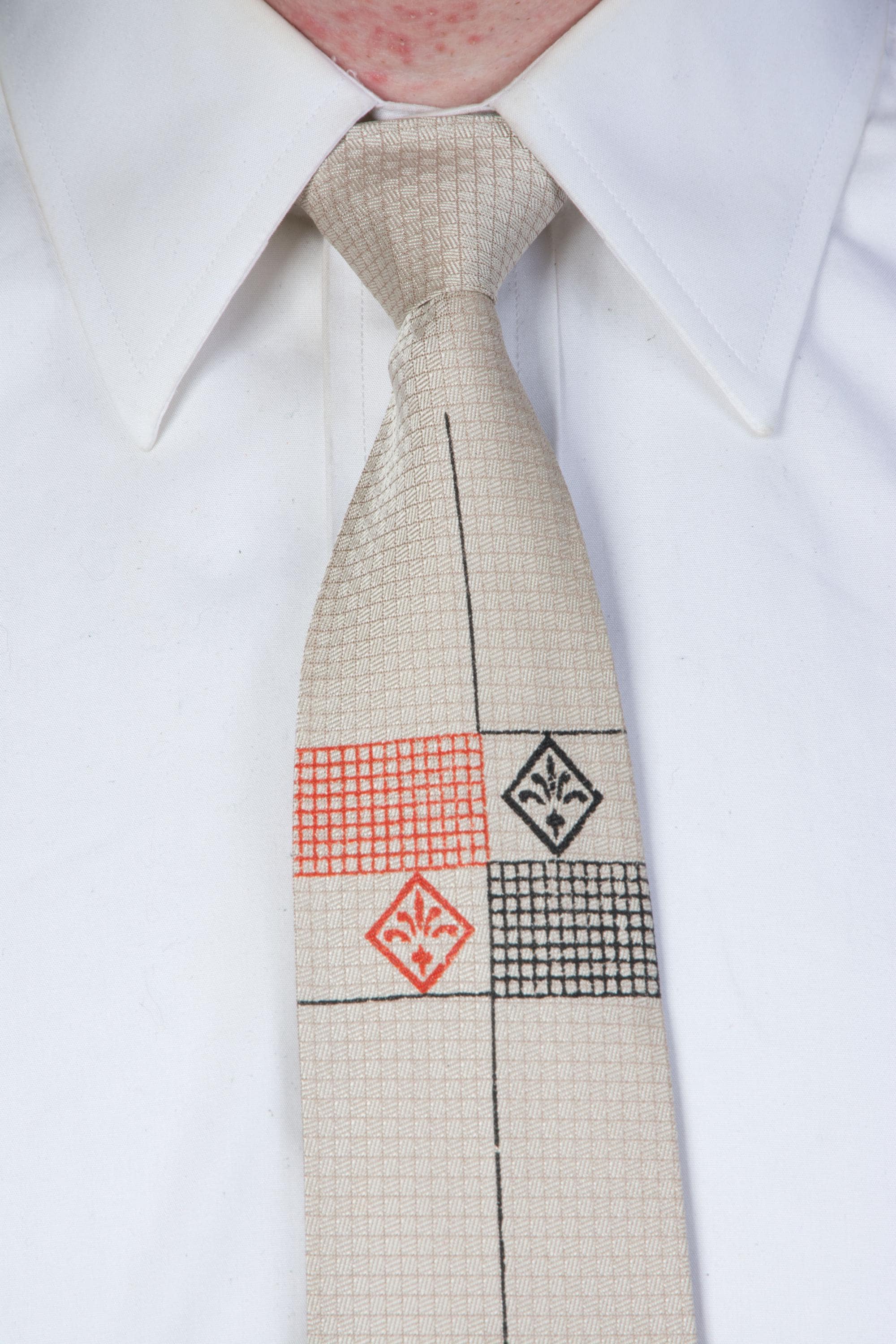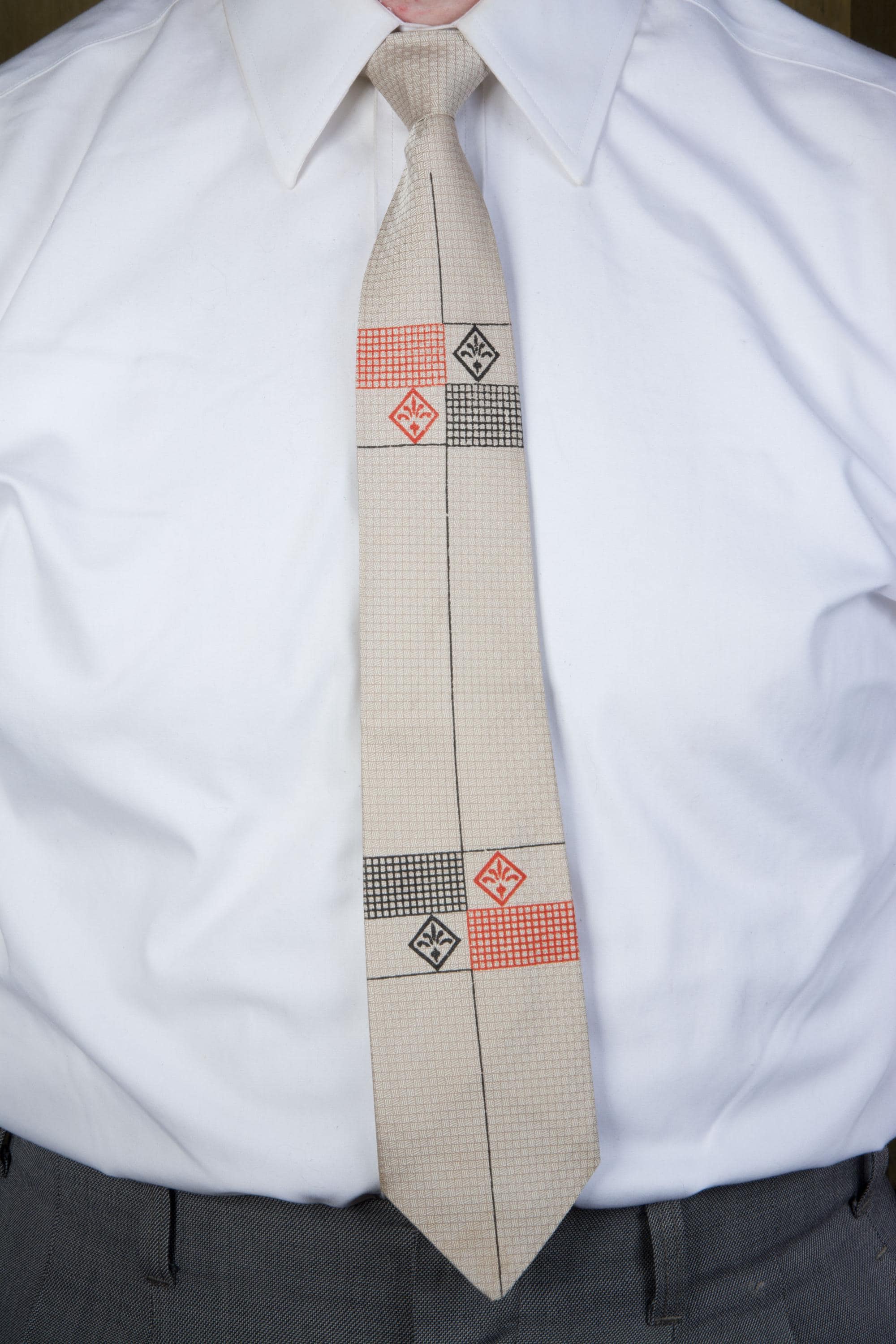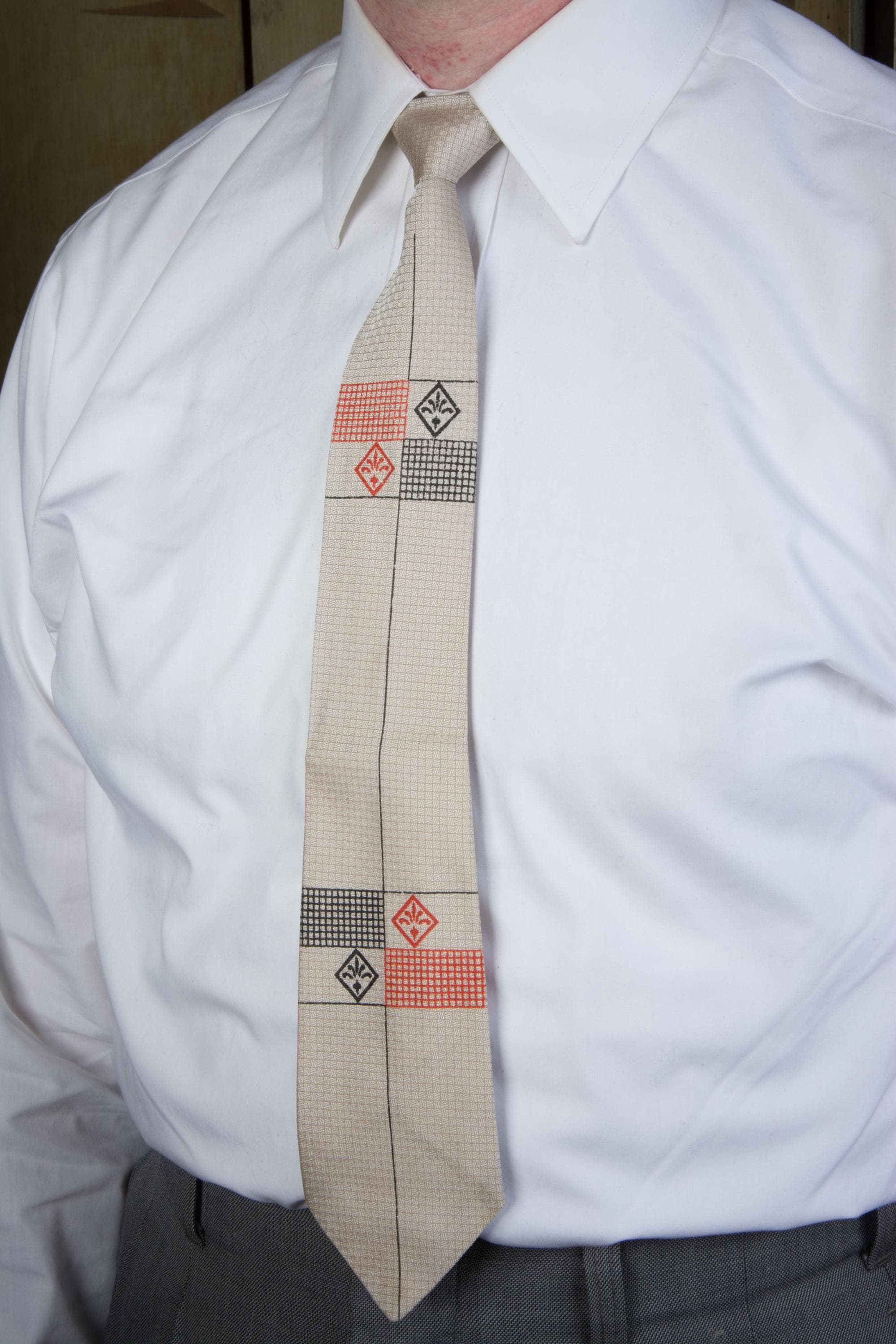Perfect, fresh and bright, this beautiful early 1950s tie had never before been tied prior to modeling it - and it is just immaculate. Still bearing its paper label, this labeled as being from AMVET, a legitimate organization created by Congress - but the neckties are a scheme, where they send you unsolicited neckties. See the attached editorial letter. It's a great, tie, though - a warm silvery tone with lustrous brocade check, and printed in black and red. Fully lined.
