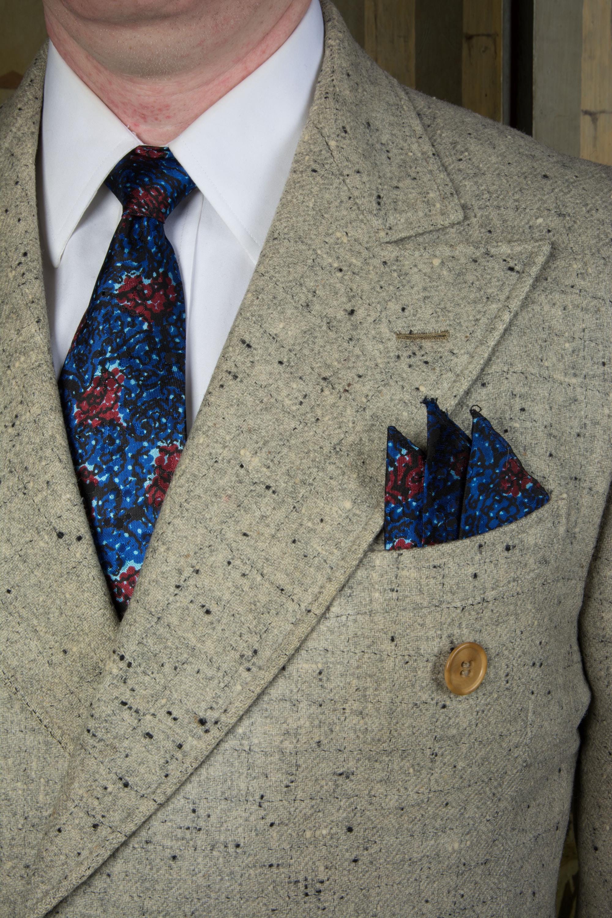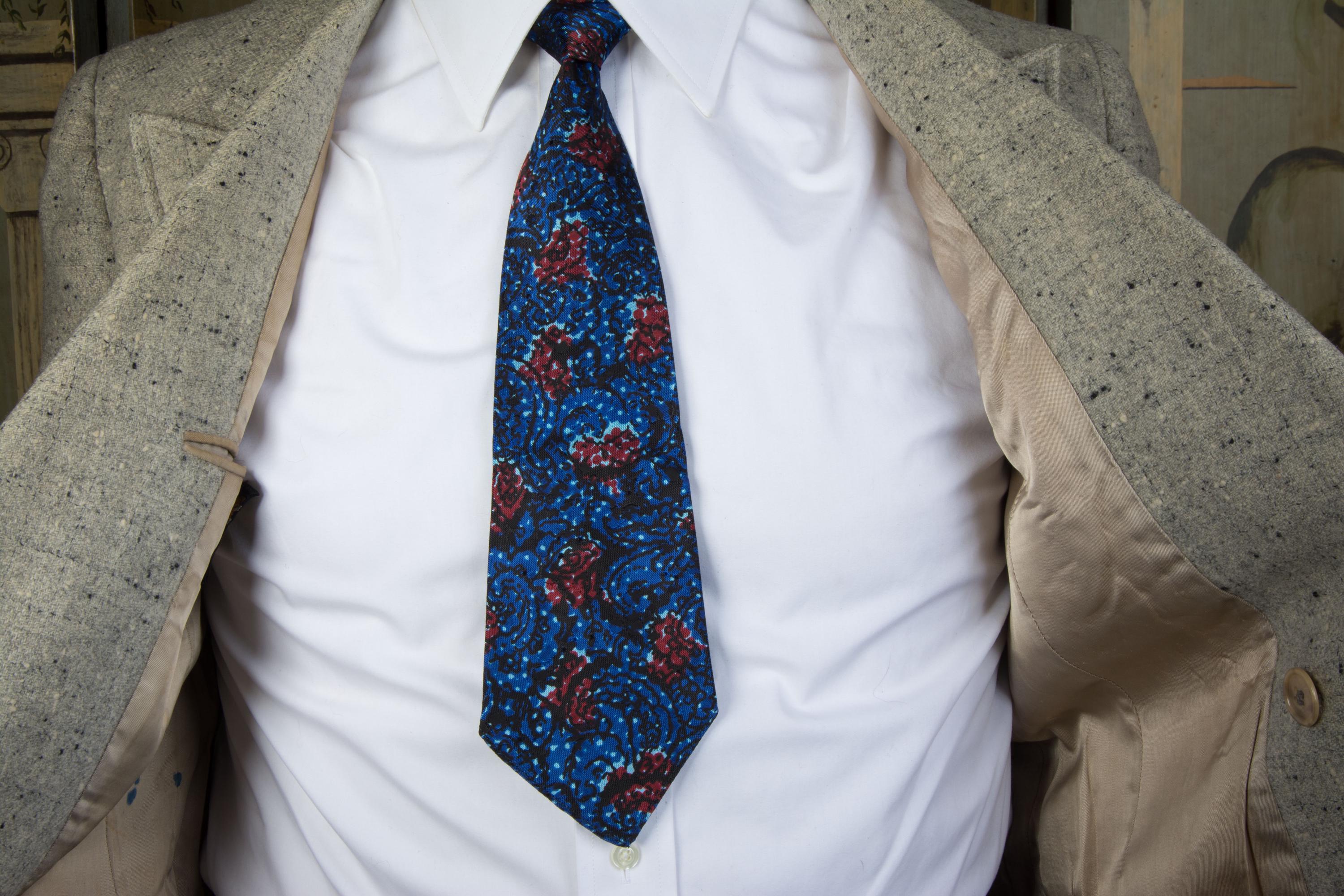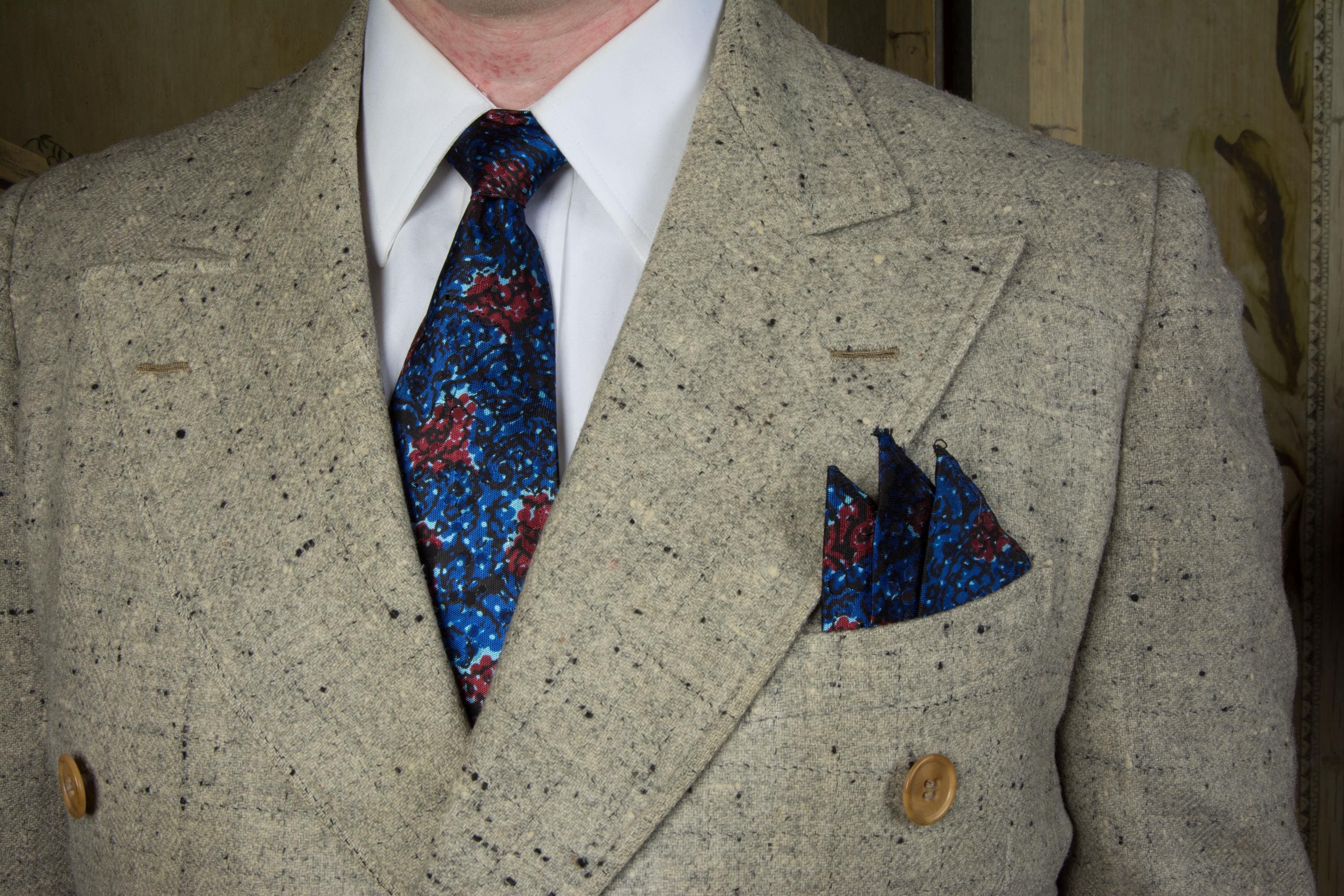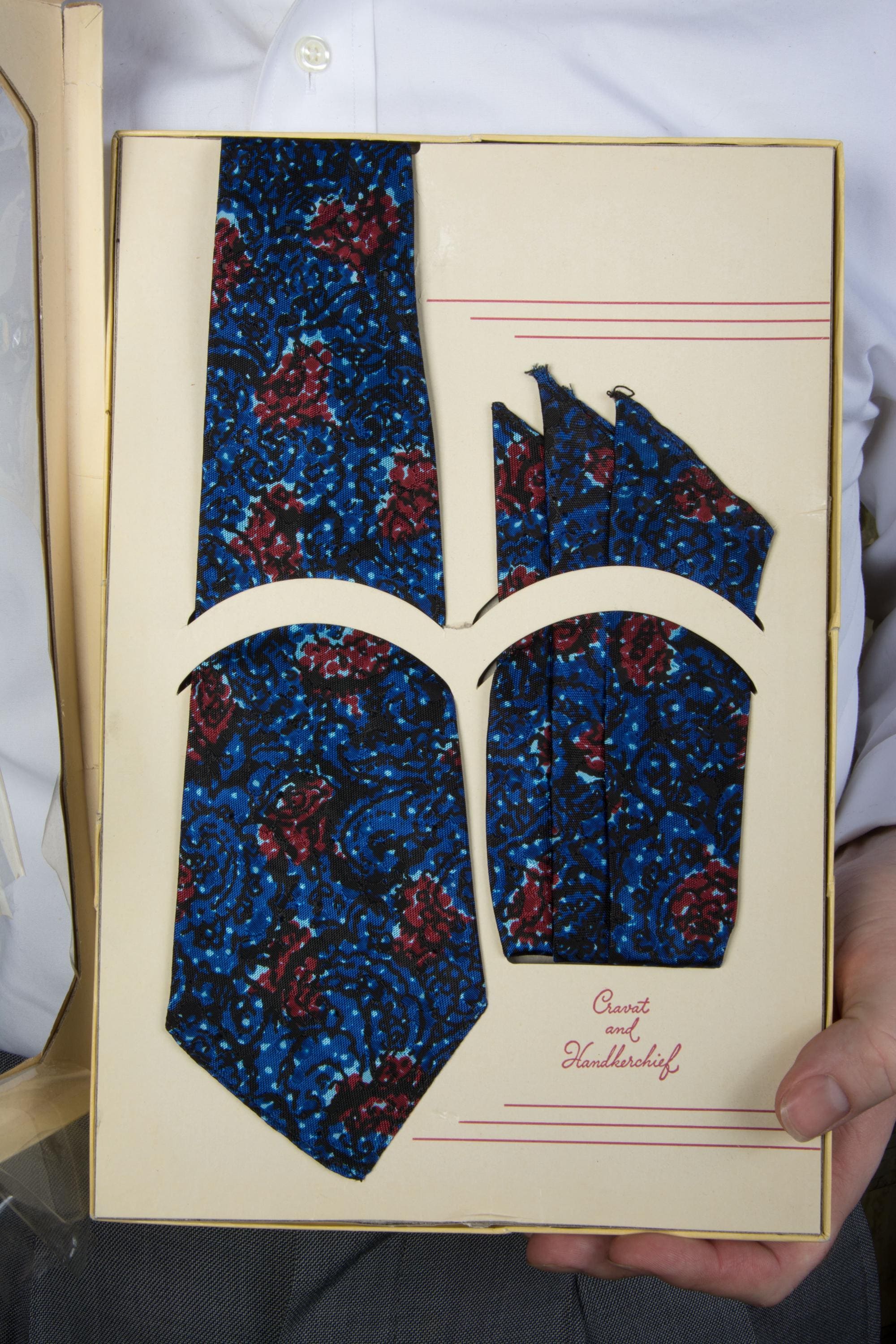 What a rare and lovely find! The original recipient didn't appreciate this gorgeous 1920s or 30s brocade tie - but you'll love it all the more for having it in its original box. The very best of gifts for a vintage tie collector (even if that collector is you.) This beauty is *immaculate* with paper tag and box, pocket square still perfectly pleated. The brocade is little swirls and dots that catch the light in this busy rose print, dense with blue, black and red. Absolutely striking.