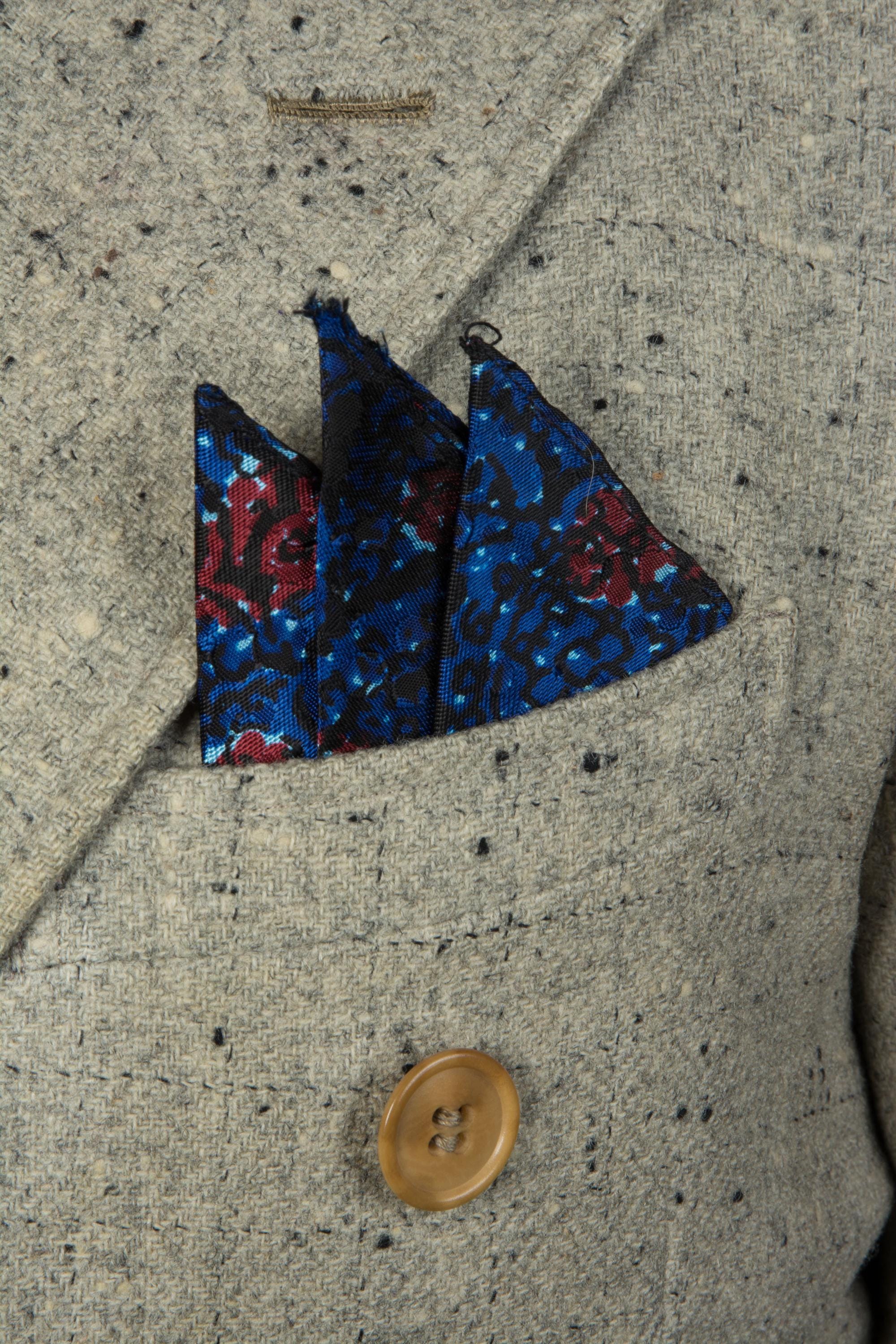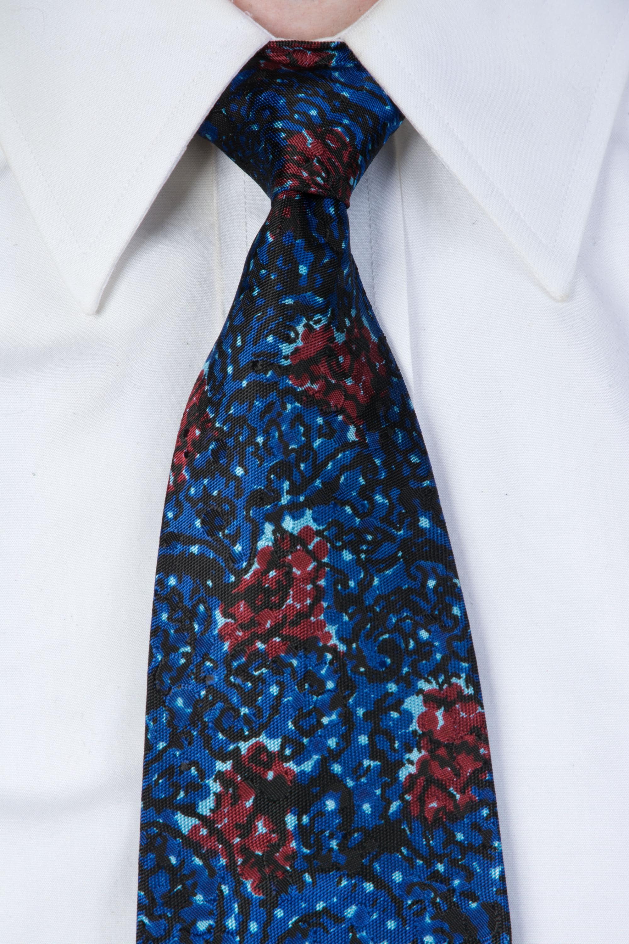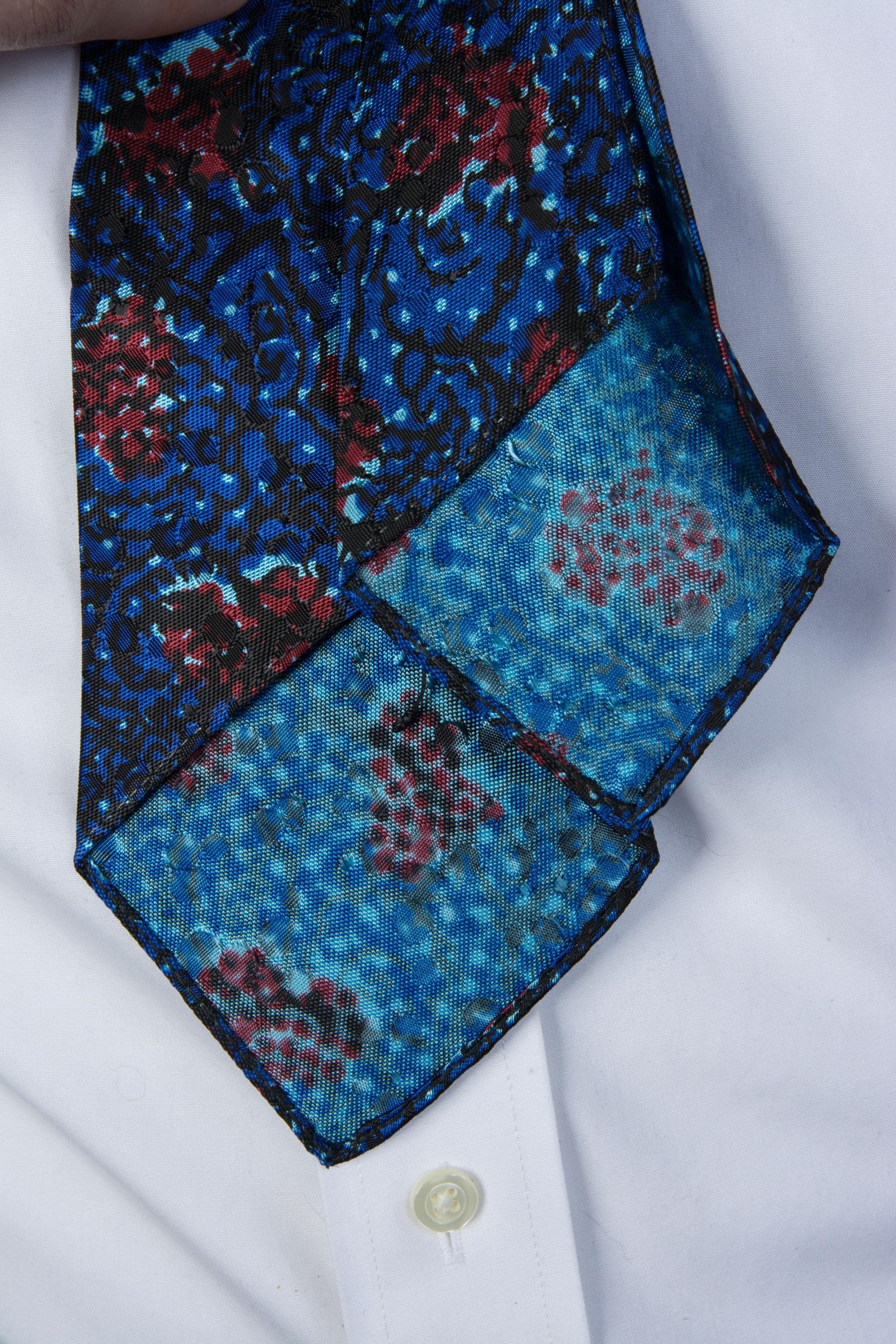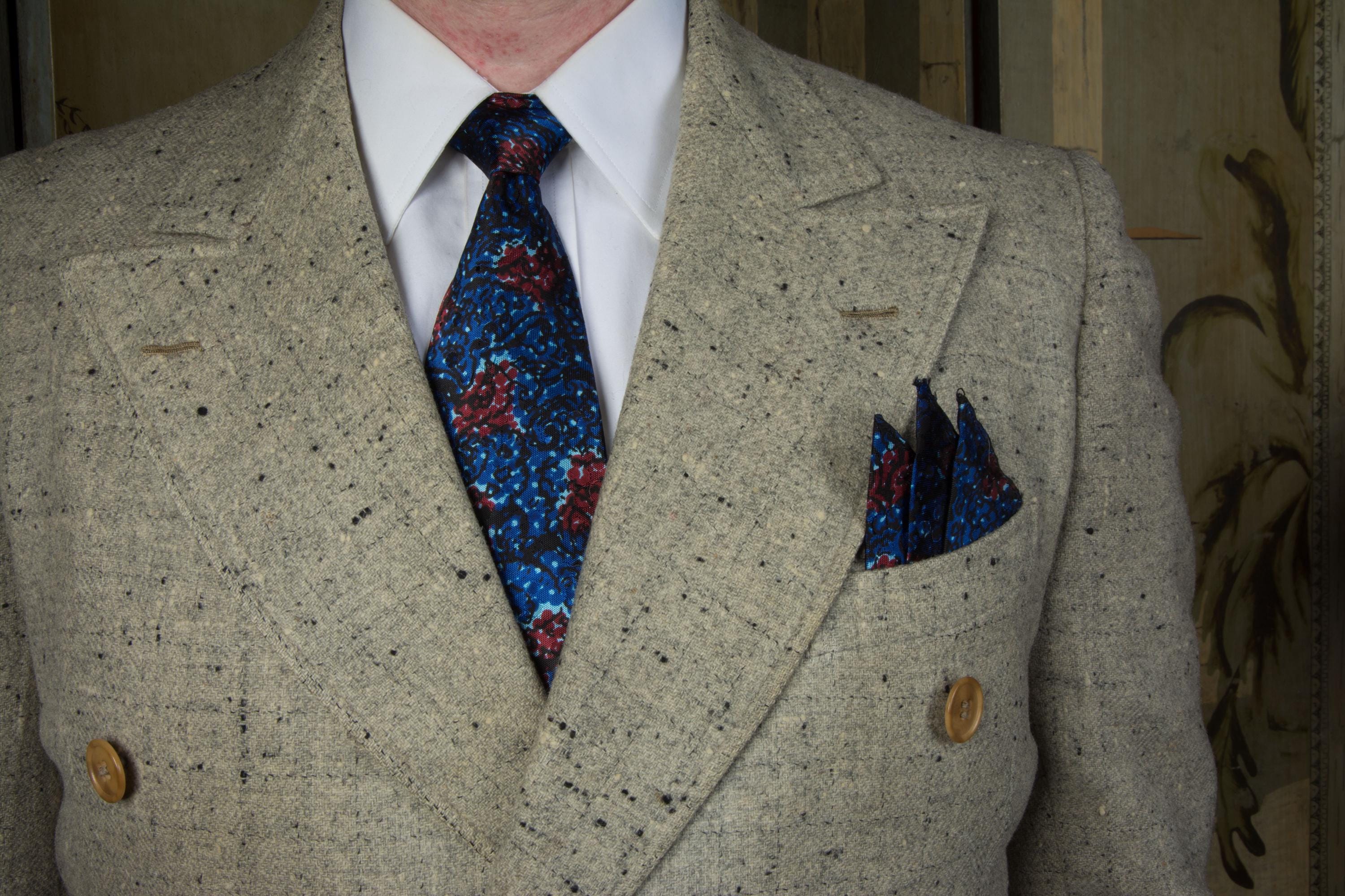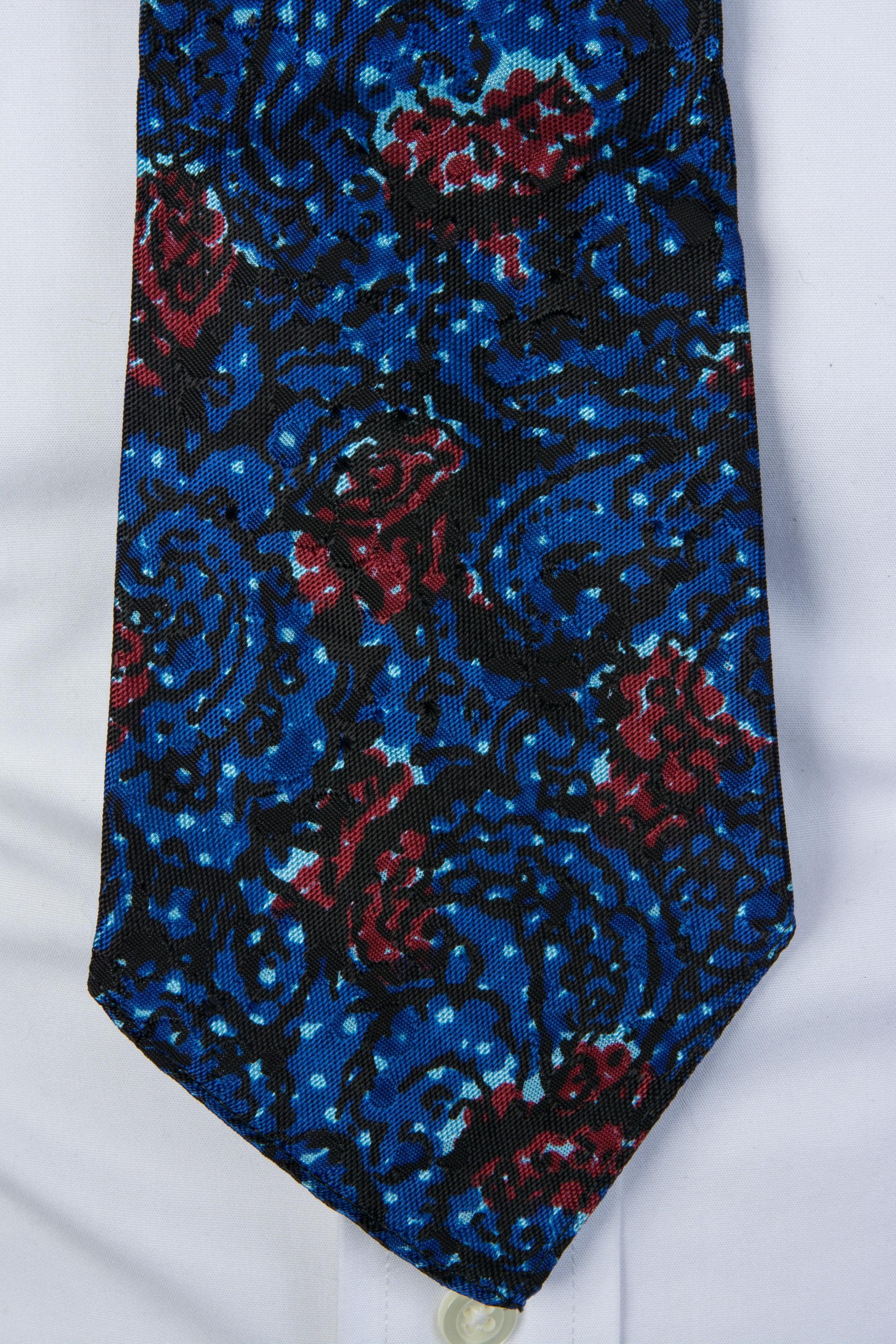 What a rare and lovely find! The original recipient didn't appreciate this gorgeous 1920s or 30s brocade tie - but you'll love it all the more for having it in its original box. The very best of gifts for a vintage tie collector (even if that collector is you.) This beauty is *immaculate* with paper tag and box, pocket square still perfectly pleated. The brocade is little swirls and dots that catch the light in this busy rose print, dense with blue, black and red. Absolutely striking.