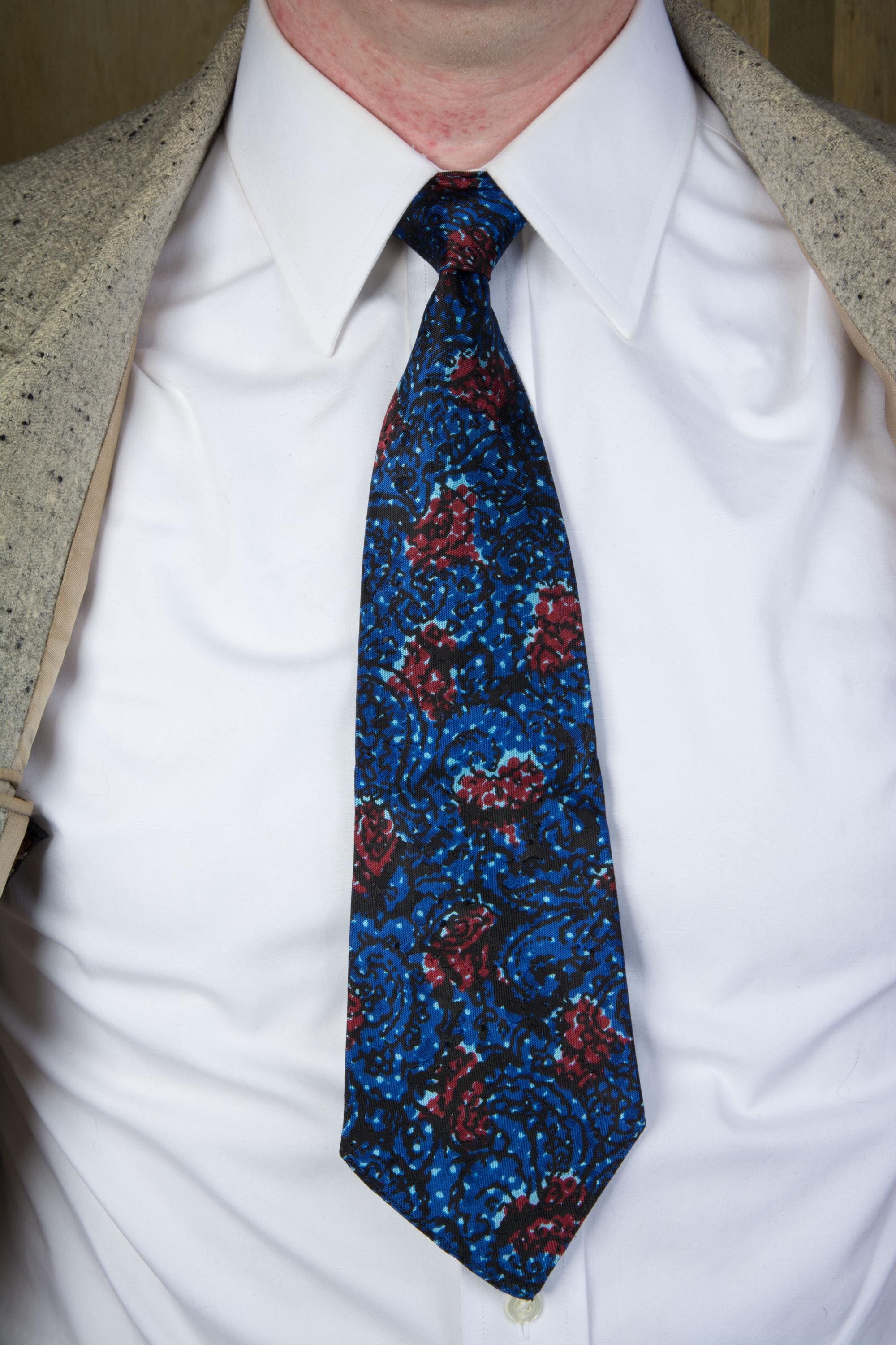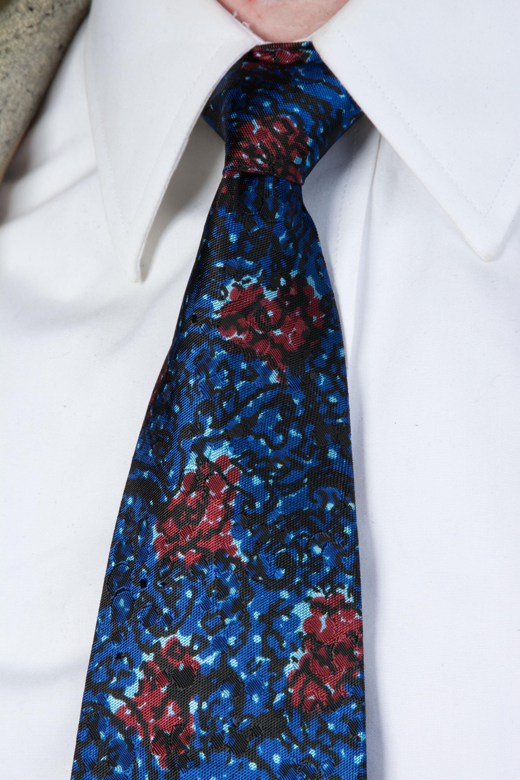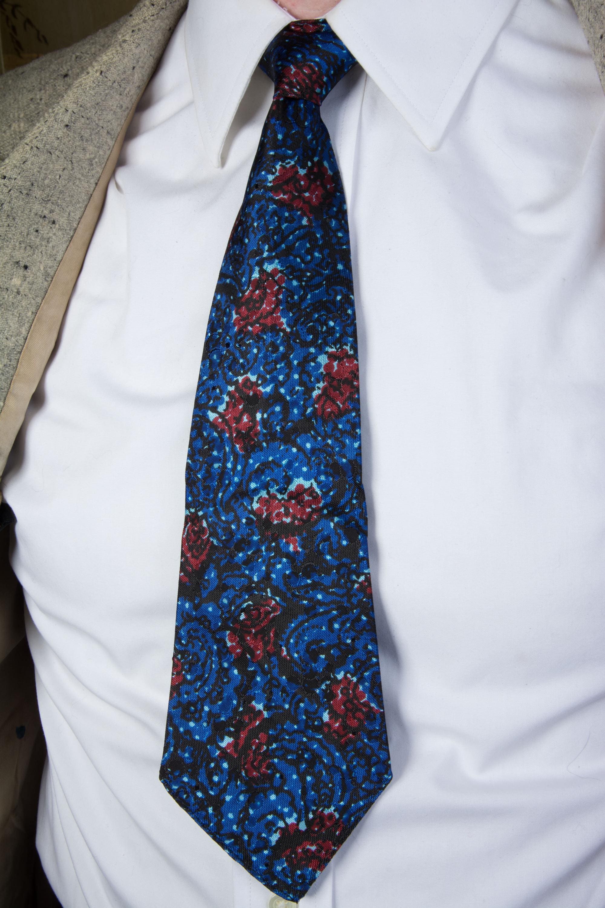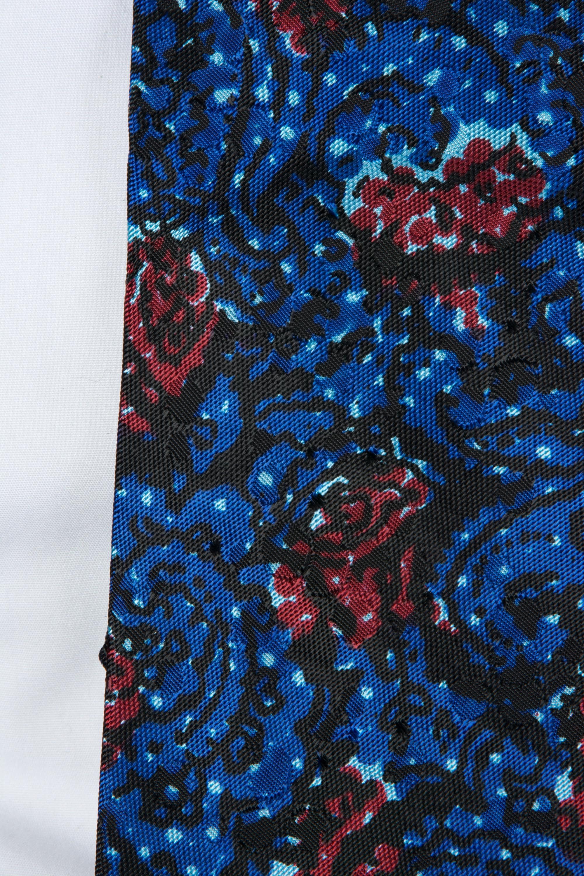 What a rare and lovely find! The original recipient didn't appreciate this gorgeous 1920s or 30s brocade tie - but you'll love it all the more for having it in its original box. The very best of gifts for a vintage tie collector (even if that collector is you.) This beauty is *immaculate* with paper tag and box, pocket square still perfectly pleated. The brocade is little swirls and dots that catch the light in this busy rose print, dense with blue, black and red. Absolutely striking.