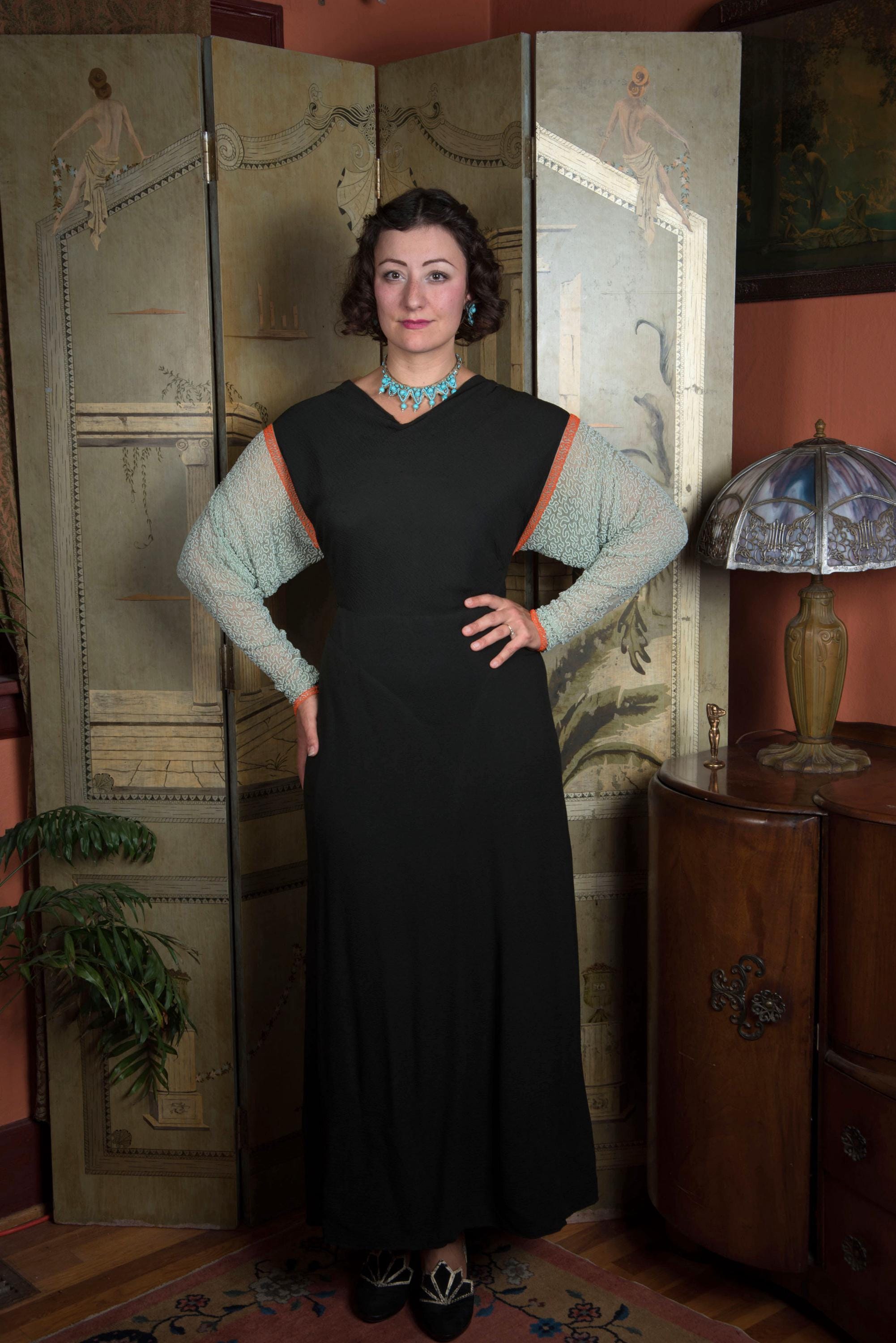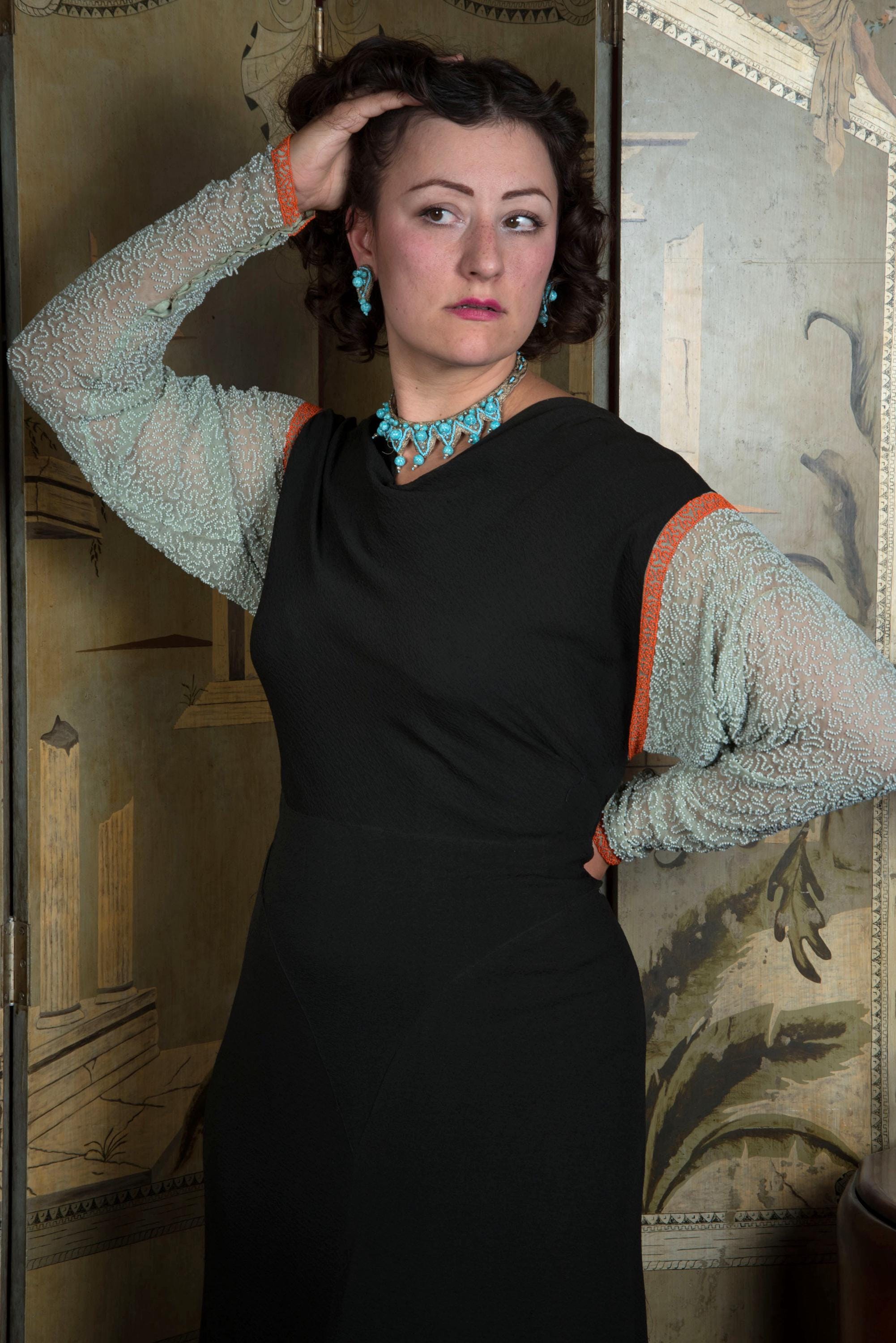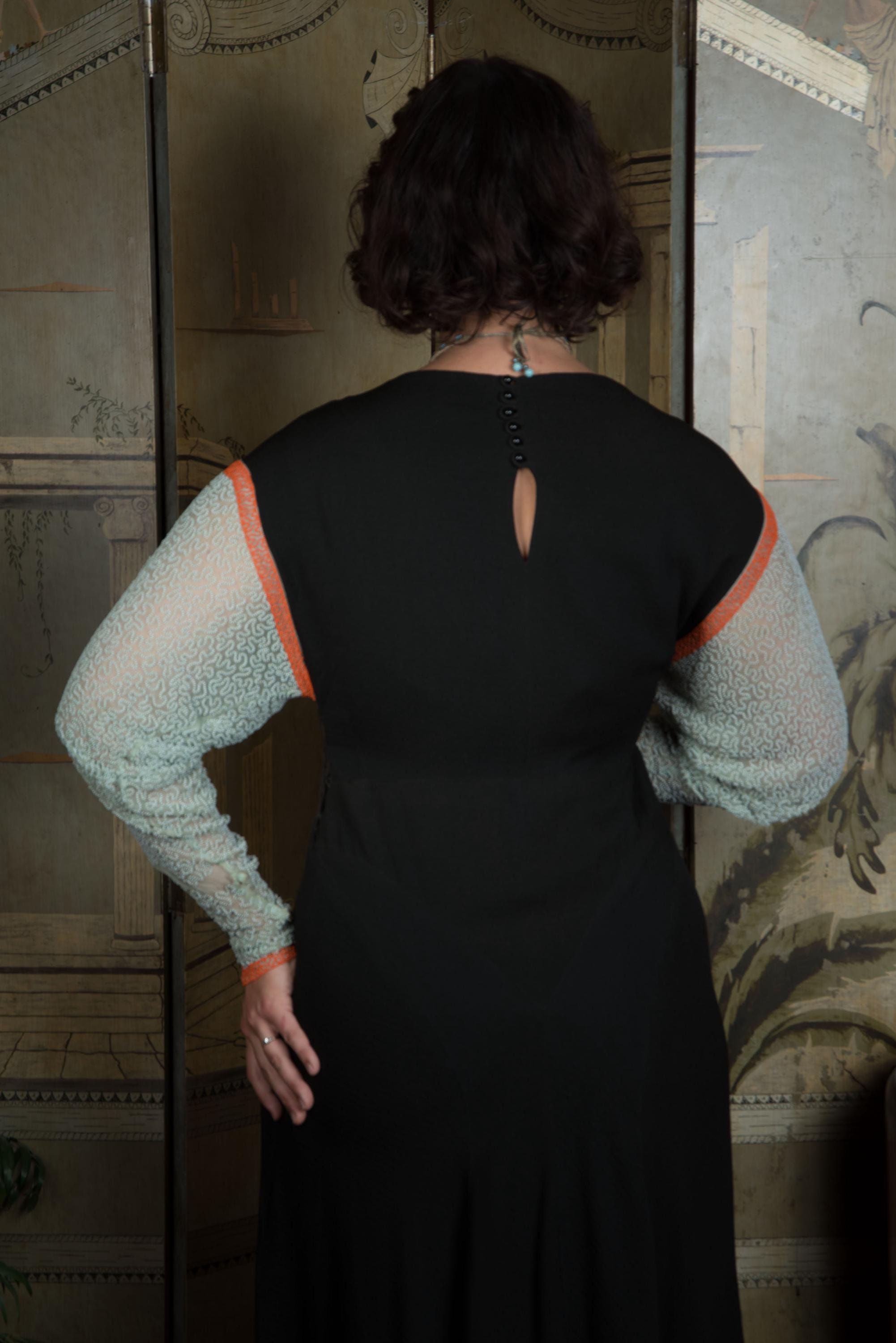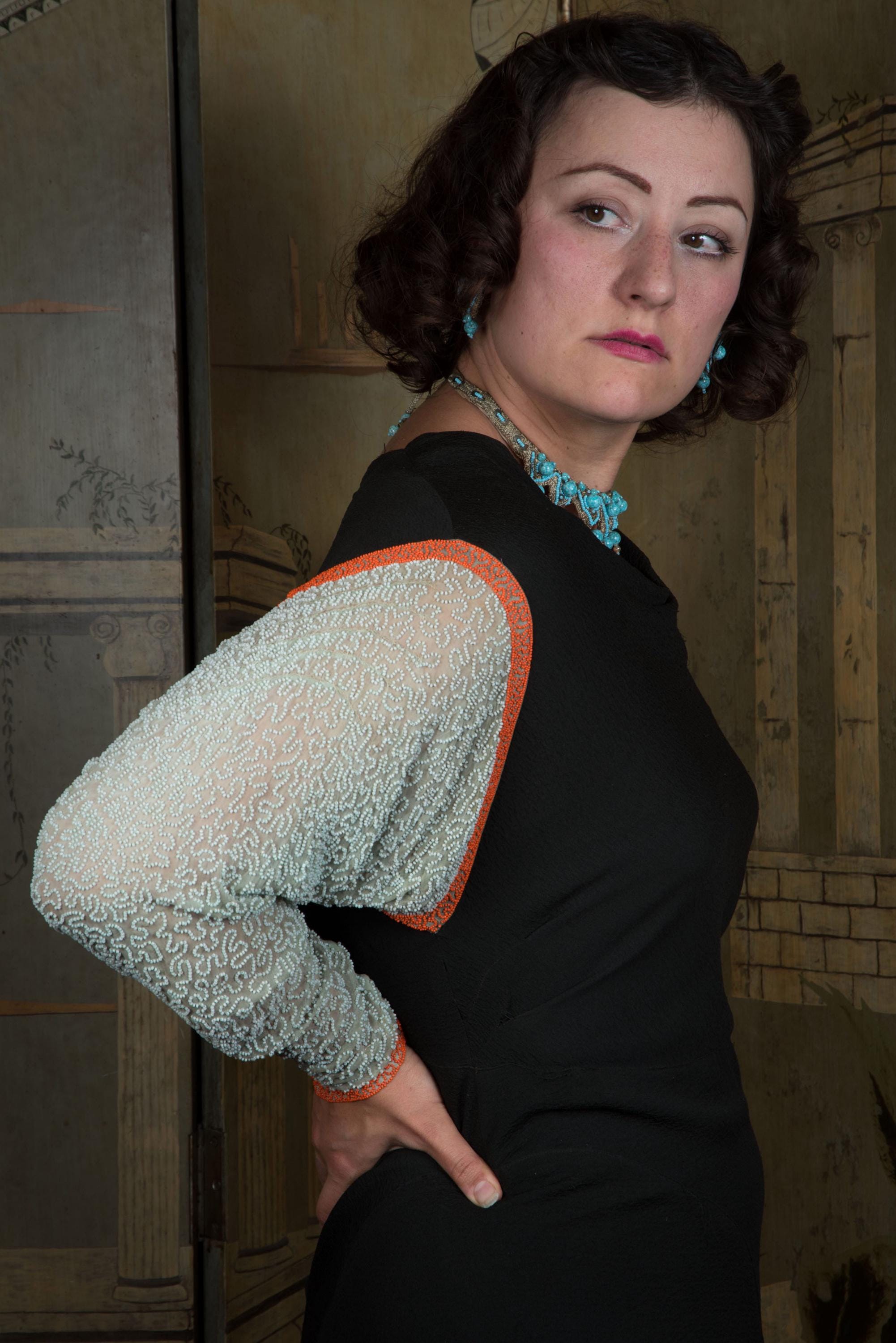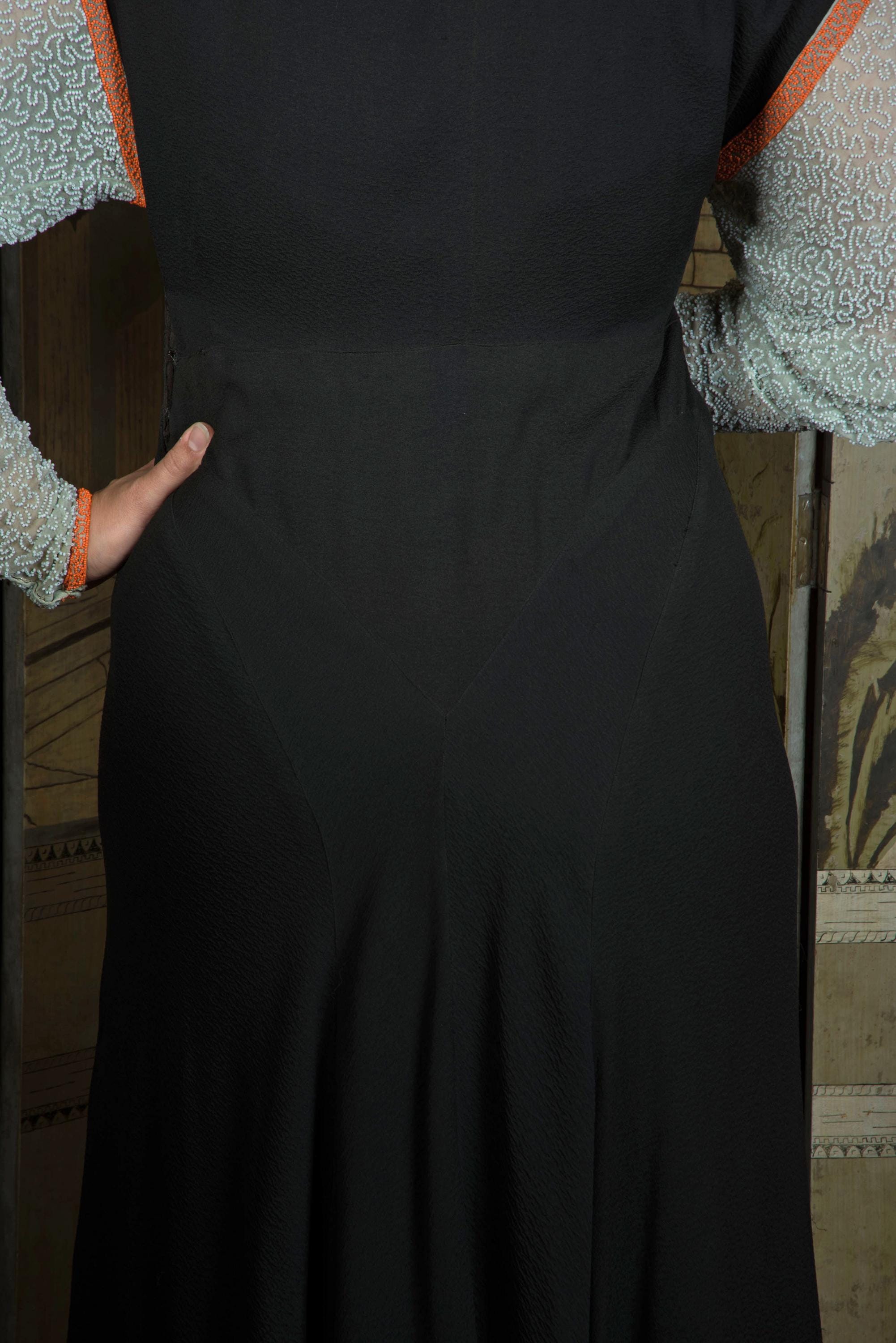 An absolutely stunning mid 1930s evening gown from the Fashion Originators Guild that employs one of my favorite palettes - orange with turquoise blue, and what an execution! The blue is pale, almost icy, making up chiffon dolman sleeves covered with thousands of tiny glass seed beads. The orange beadwork is the trim, circling the wrists and dramatically deep armholes - I love a 30s Dolman look! The rayon crepe features a subtle dobby treatment, creating a narrow wave texture that emphasizes the bias lines of the piece. The neckline is draped with a dress weight. The skirt is long, heavy, and has bias godets that become a short, sweepy train at the back (the model is 5'11", which made this feature hard to see.) This closes on the side with hooks and snaps, and buttons at the back of the neck. The fitted wrists close with seven snaps each.