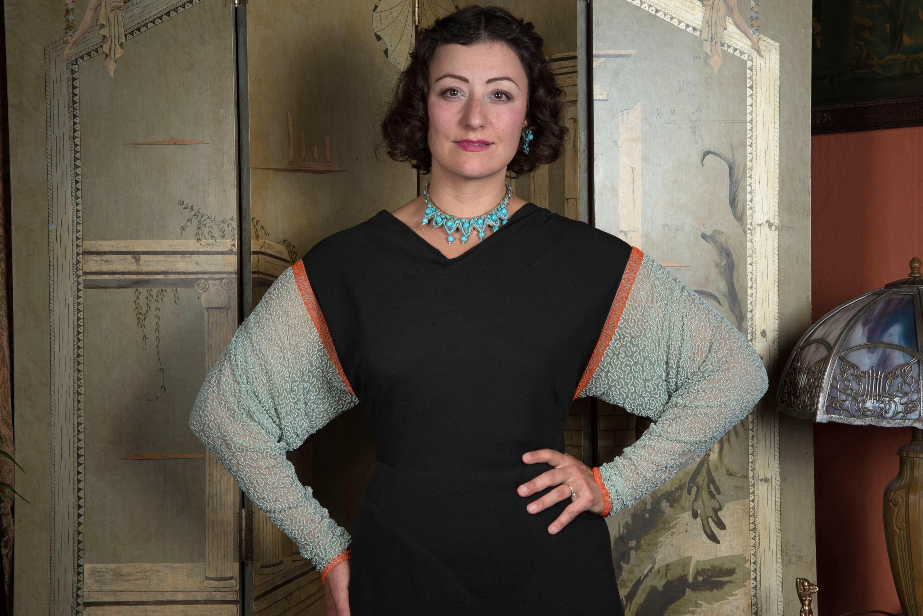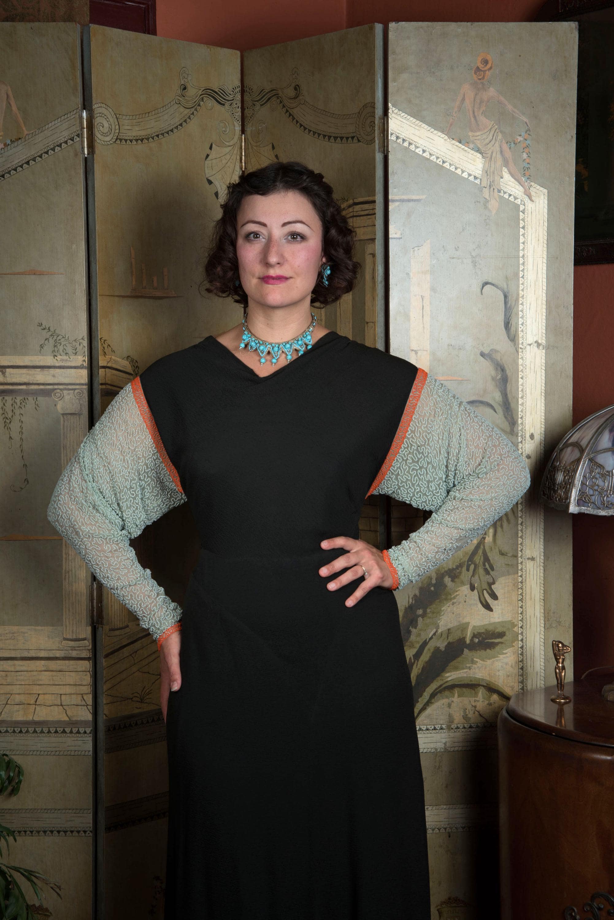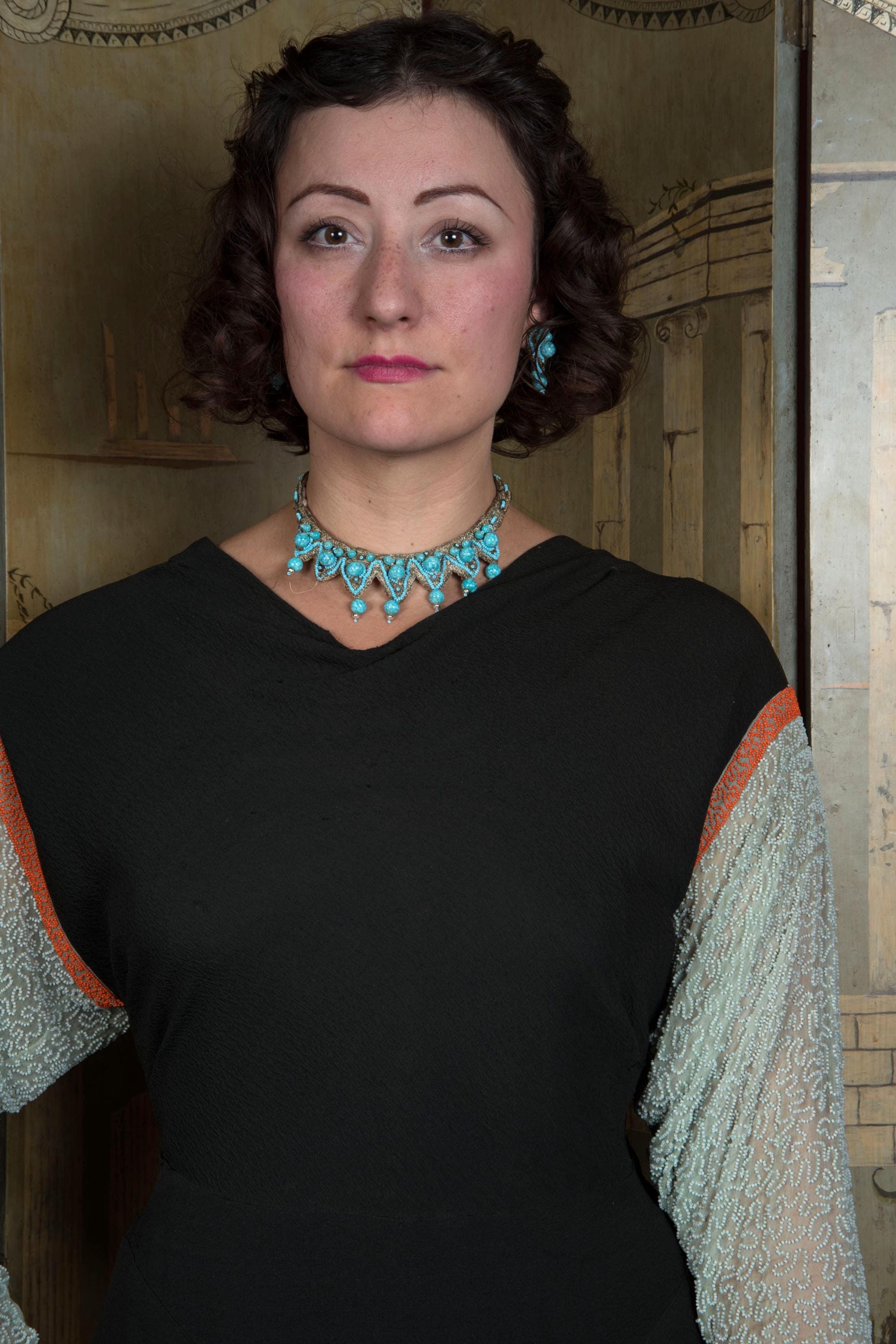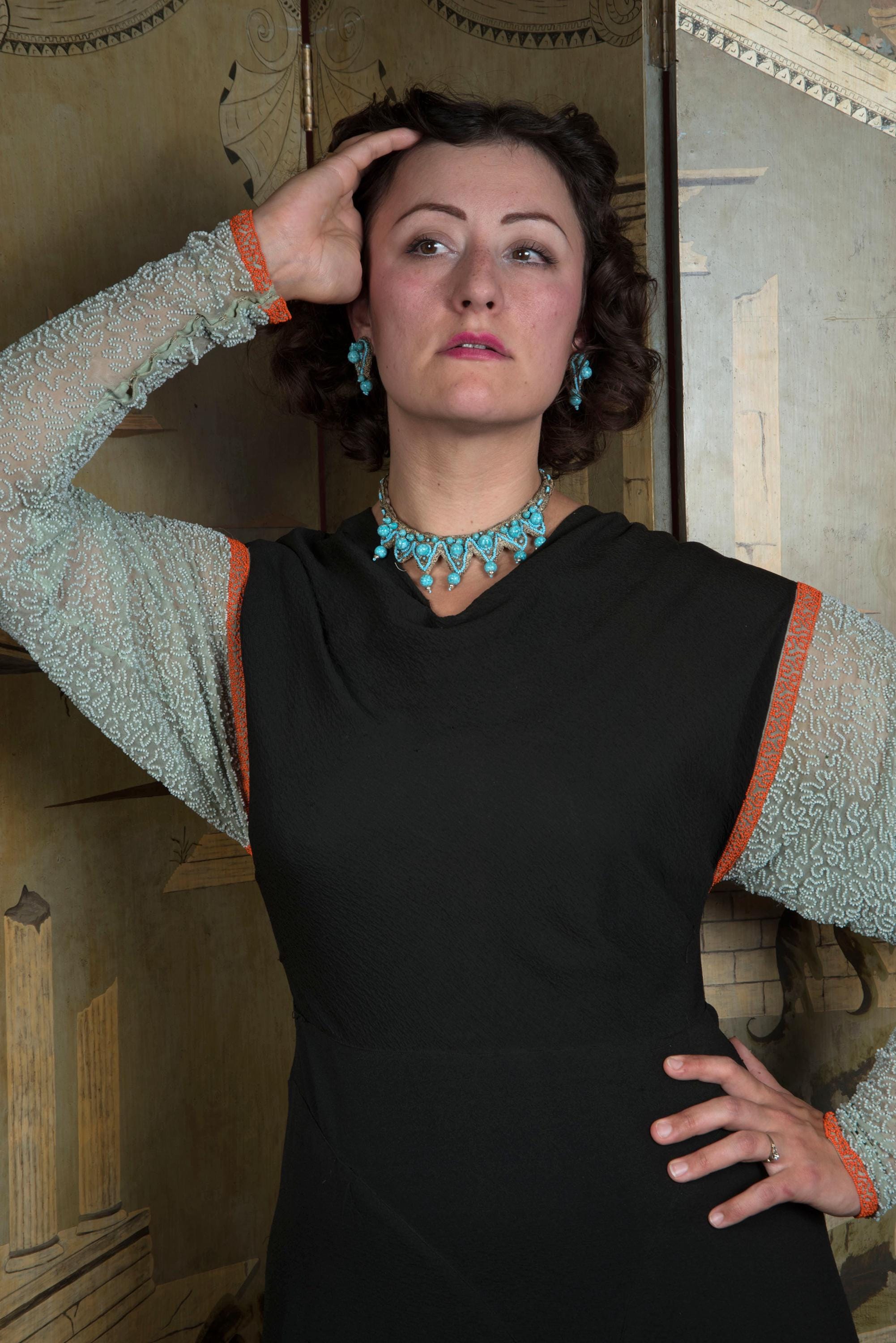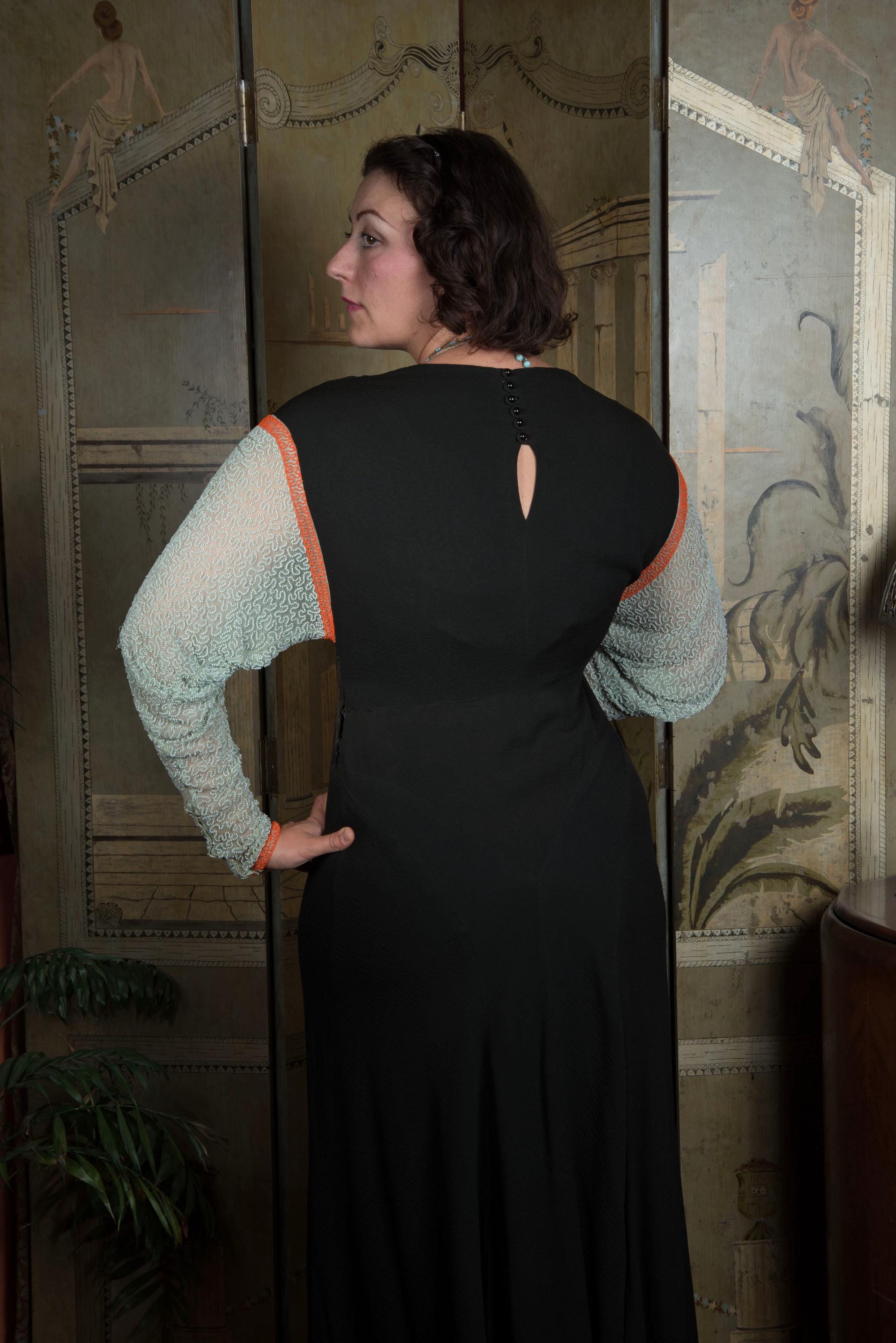 An absolutely stunning mid 1930s evening gown from the Fashion Originators Guild that employs one of my favorite palettes - orange with turquoise blue, and what an execution! The blue is pale, almost icy, making up chiffon dolman sleeves covered with thousands of tiny glass seed beads. The orange beadwork is the trim, circling the wrists and dramatically deep armholes - I love a 30s Dolman look! The rayon crepe features a subtle dobby treatment, creating a narrow wave texture that emphasizes the bias lines of the piece. The neckline is draped with a dress weight. The skirt is long, heavy, and has bias godets that become a short, sweepy train at the back (the model is 5'11", which made this feature hard to see.) This closes on the side with hooks and snaps, and buttons at the back of the neck. The fitted wrists close with seven snaps each.