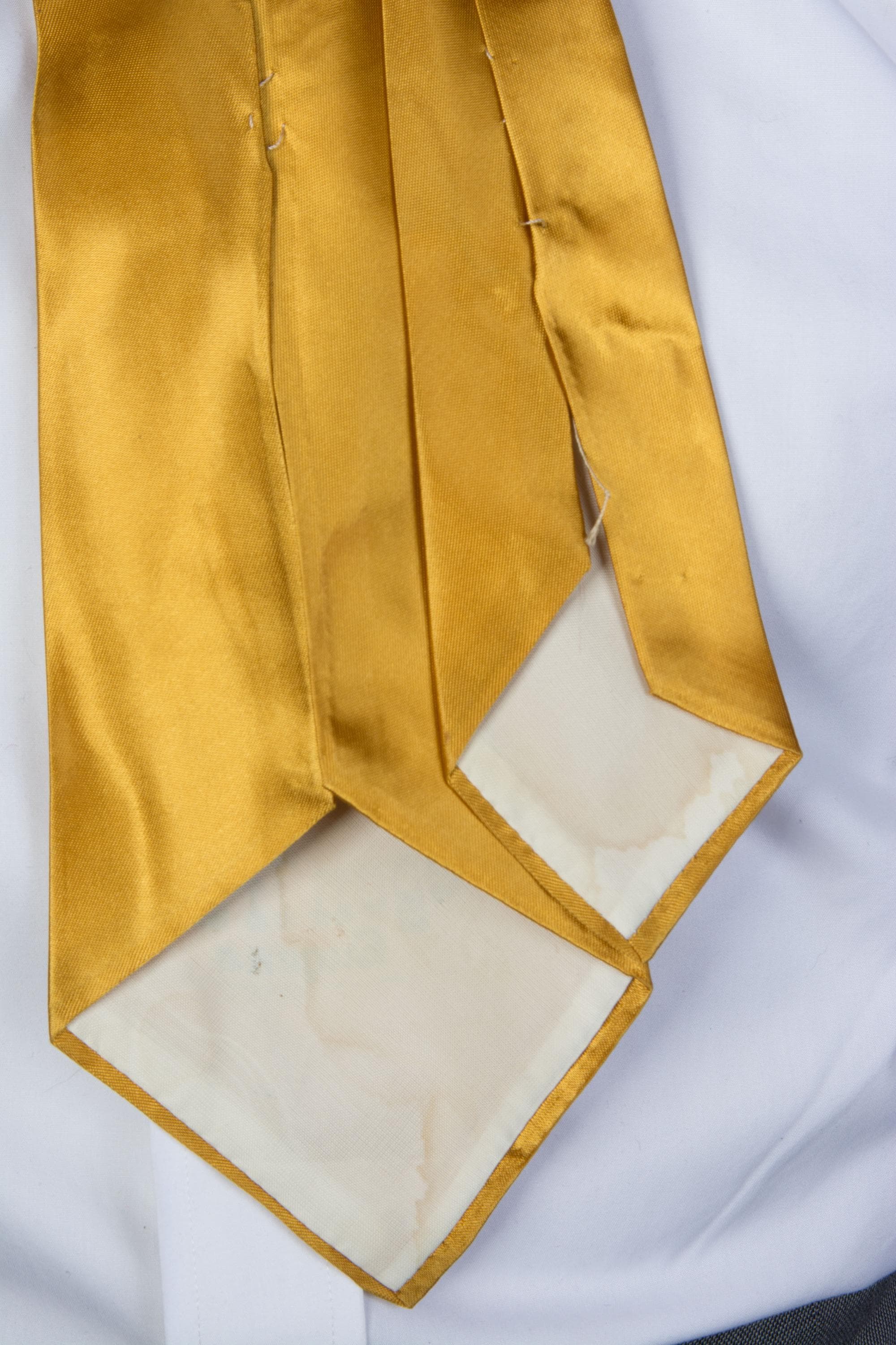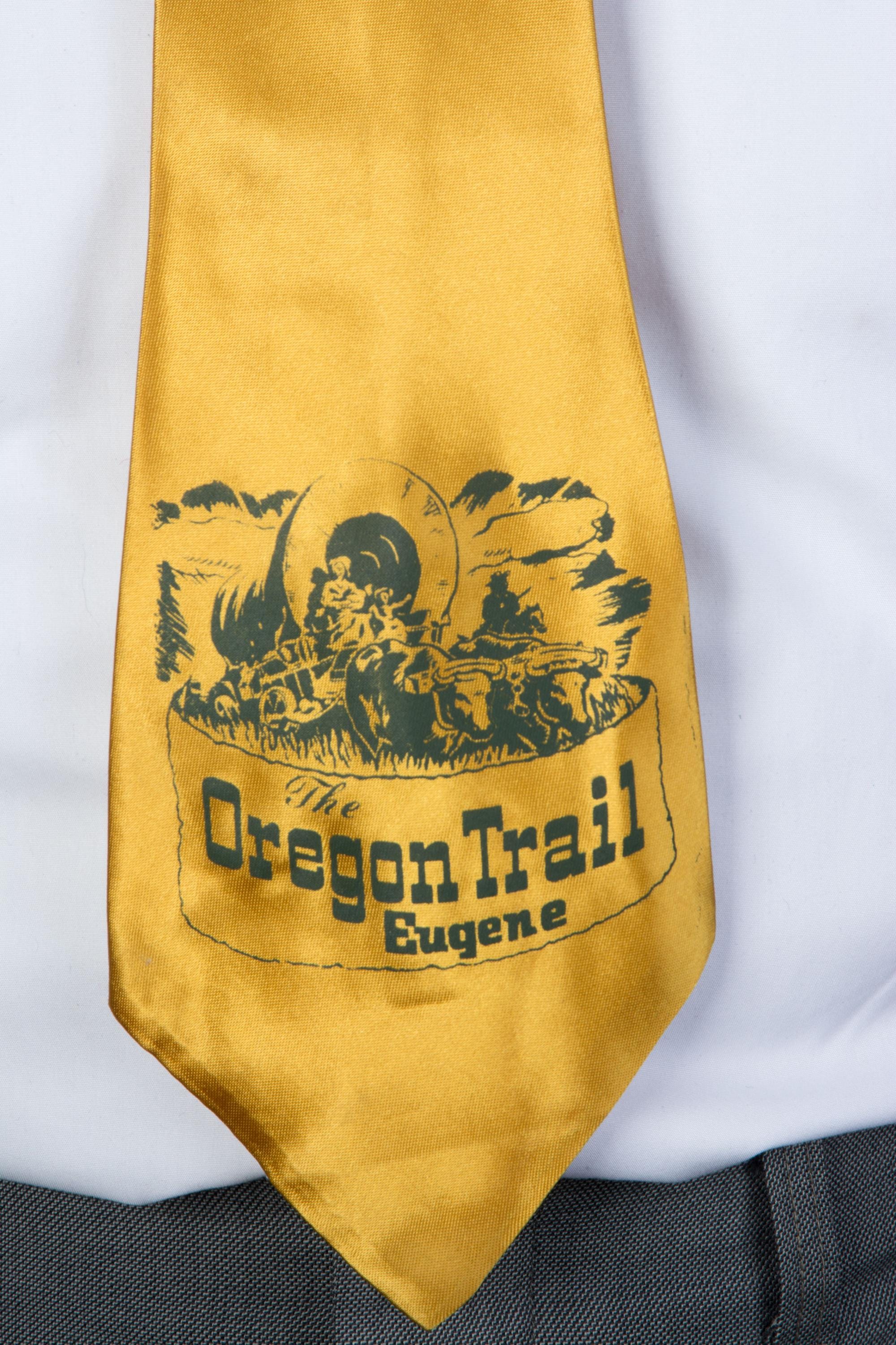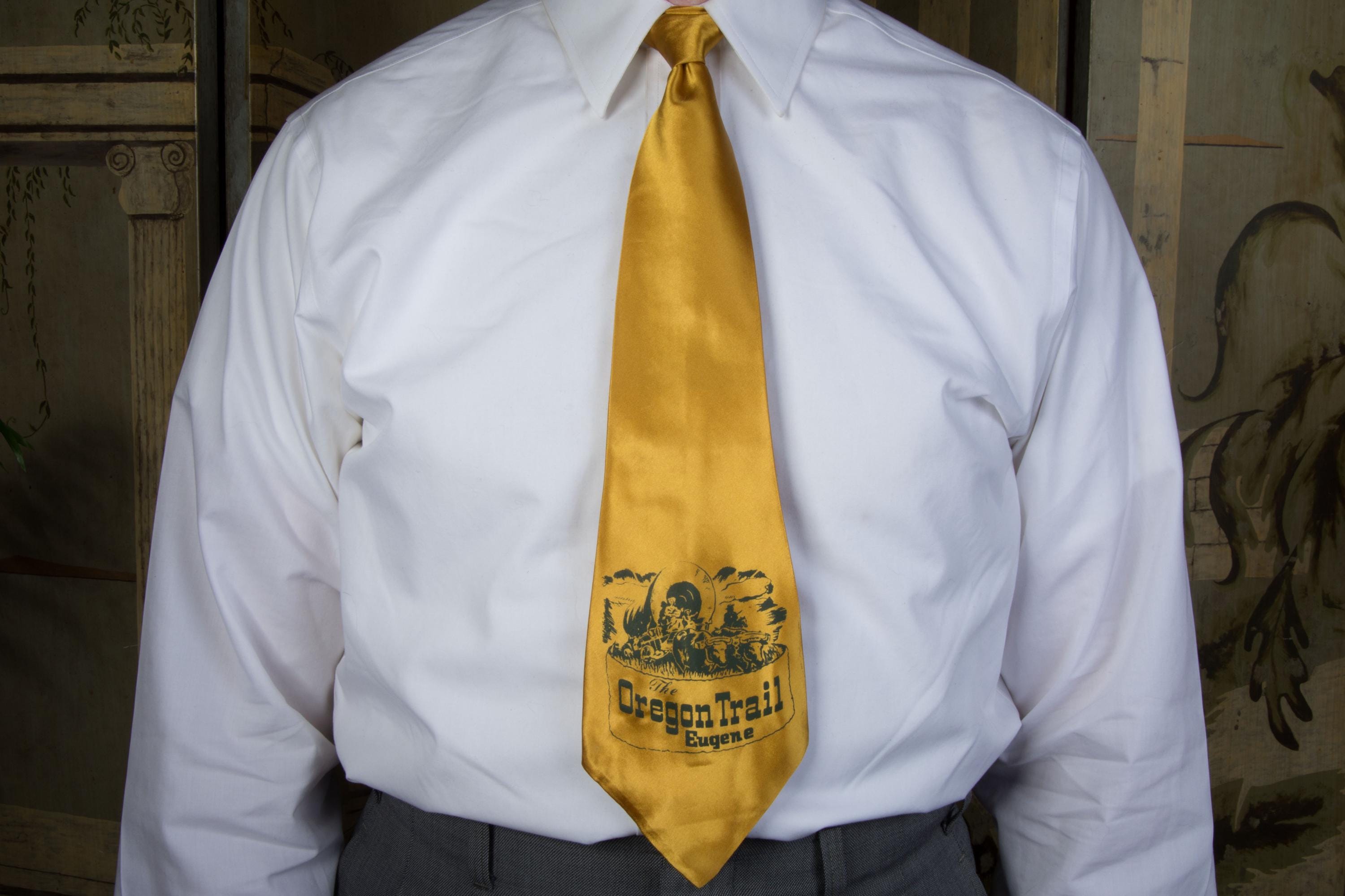 A fantastic accent for a western ensemble, this 1940s Oregon Trail necktie is made of a rayon blend satin in a gleaming golden mustard hue. It's screen printed with a classic covered wagon with oxen in deep green. (I won't lie, this gives me flashbacks of "You have died of dysentery.") Fully lined