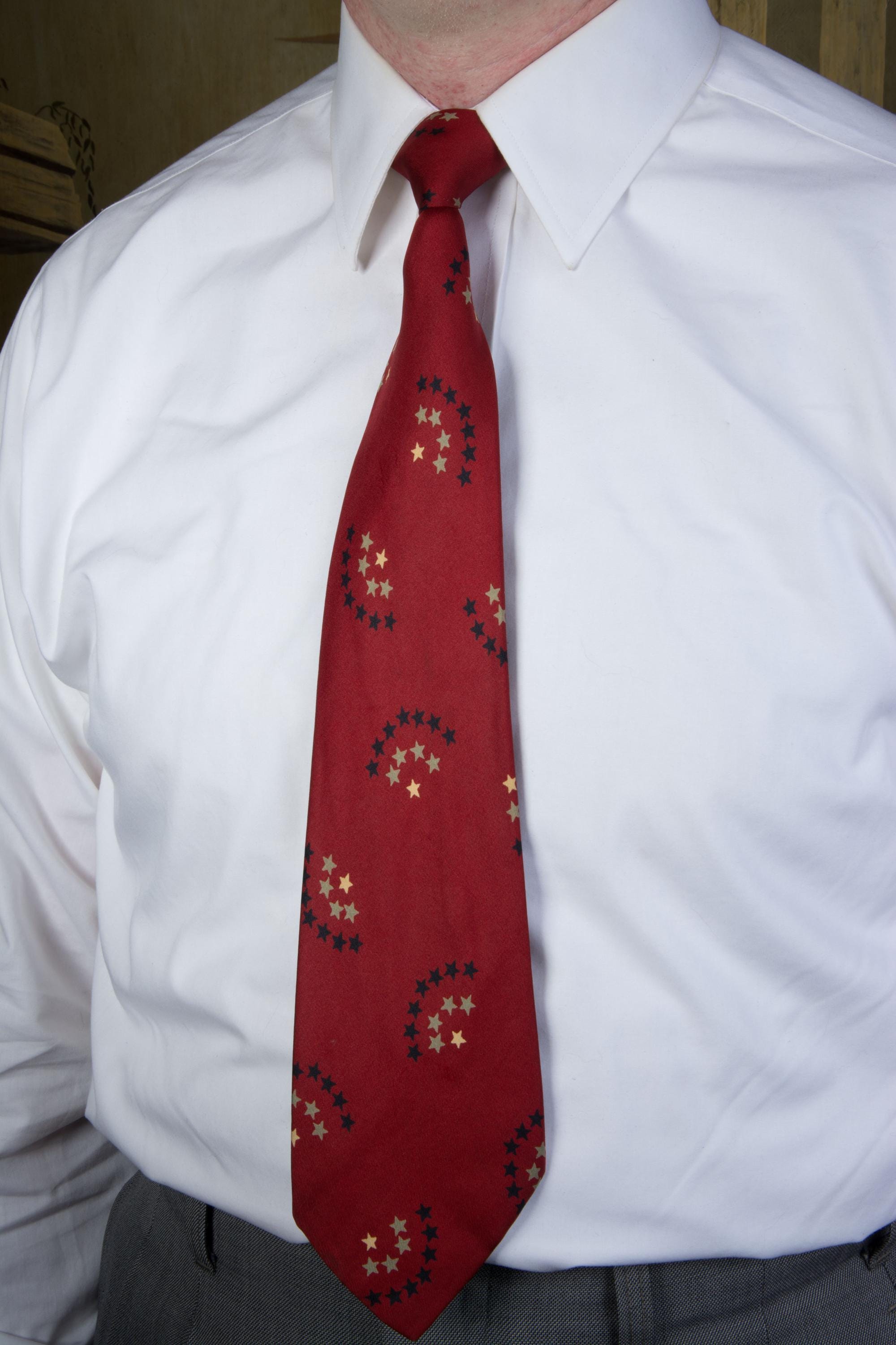The softest silk makes up smart necktie. The width is 50s, but I do think it's pressed narrower from a 40s width, due to the asymmetric blade end and wide overlap at back. It could be read as patriotic, but isn't overt - the red is dark, and the arcs of stars are done in ivory, grey and black.