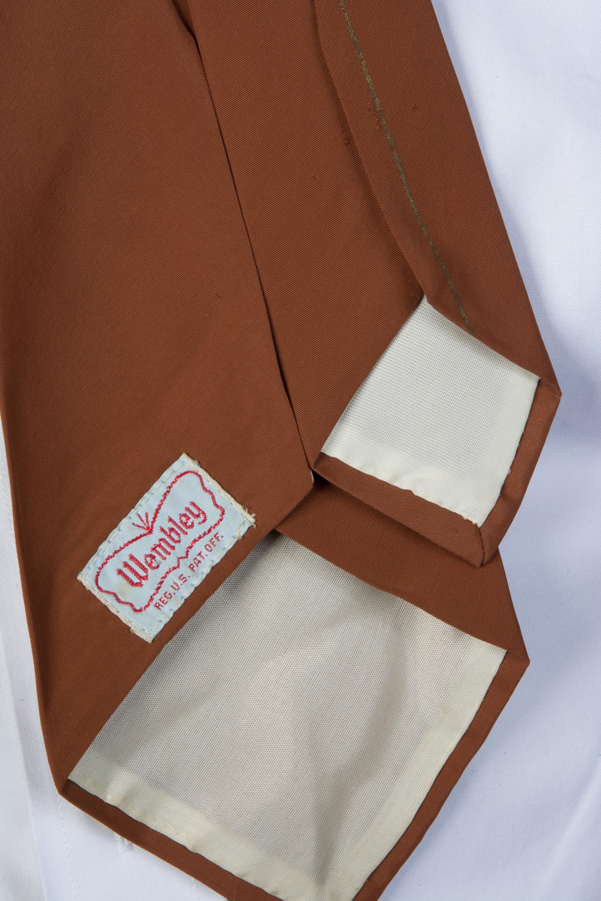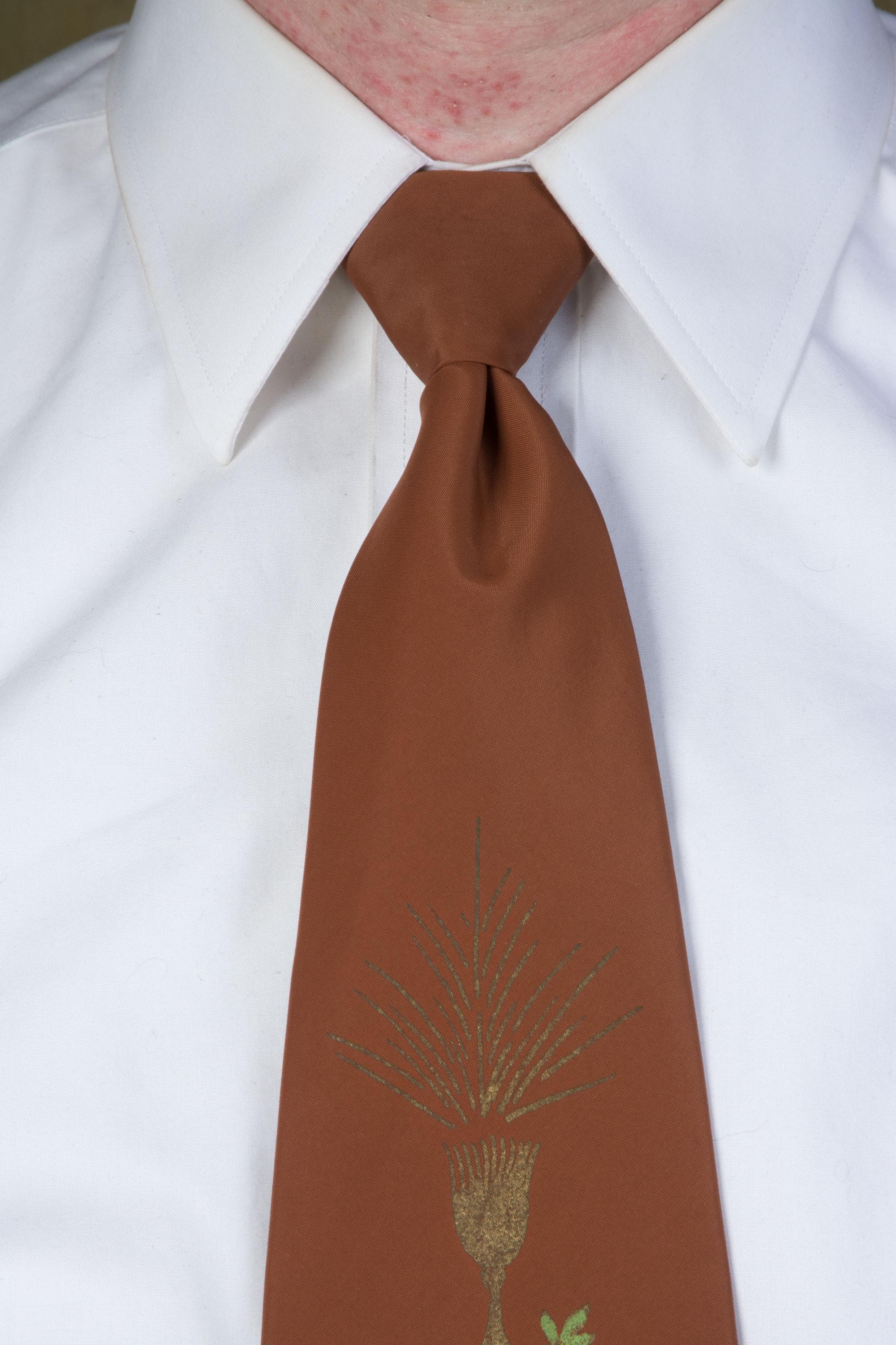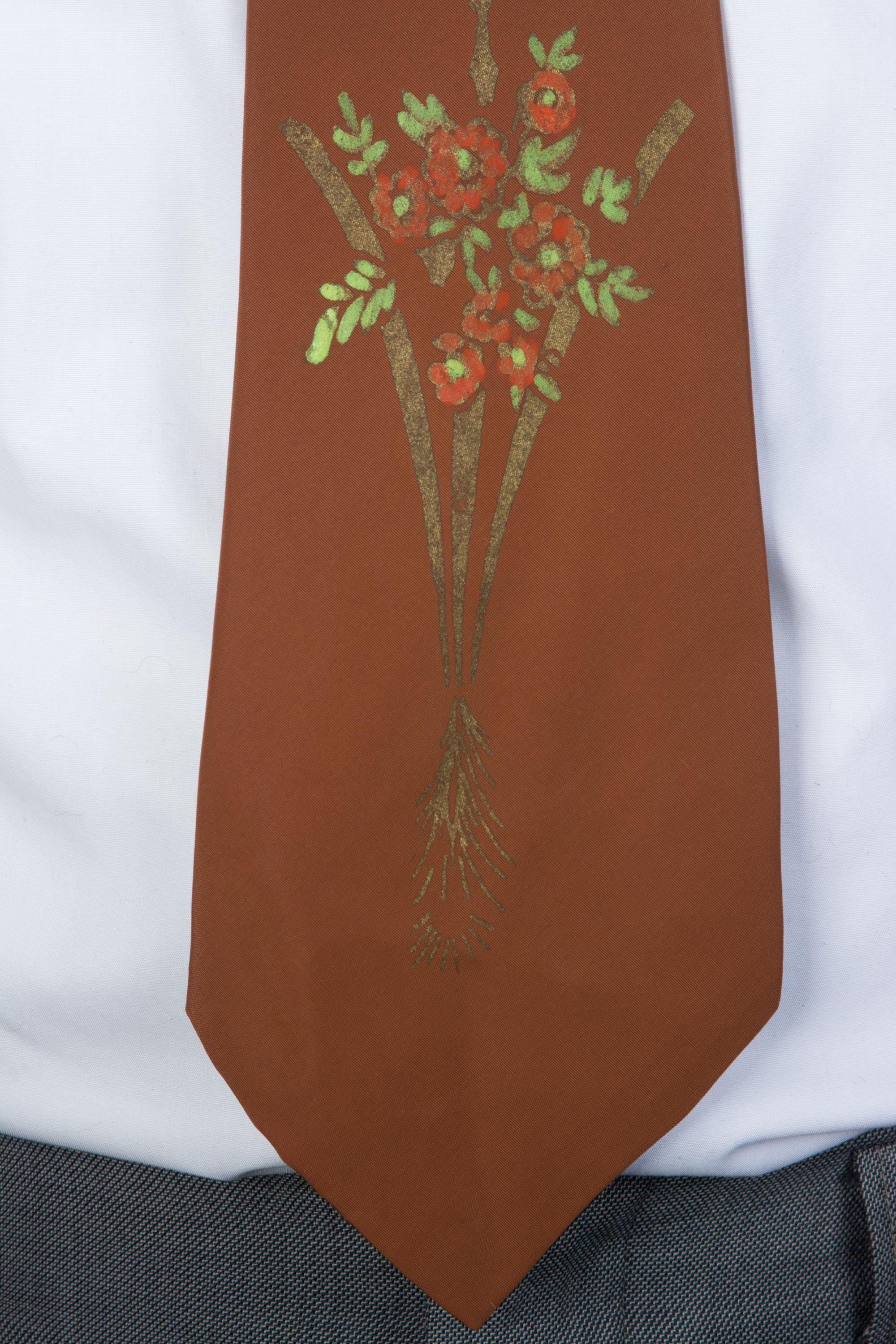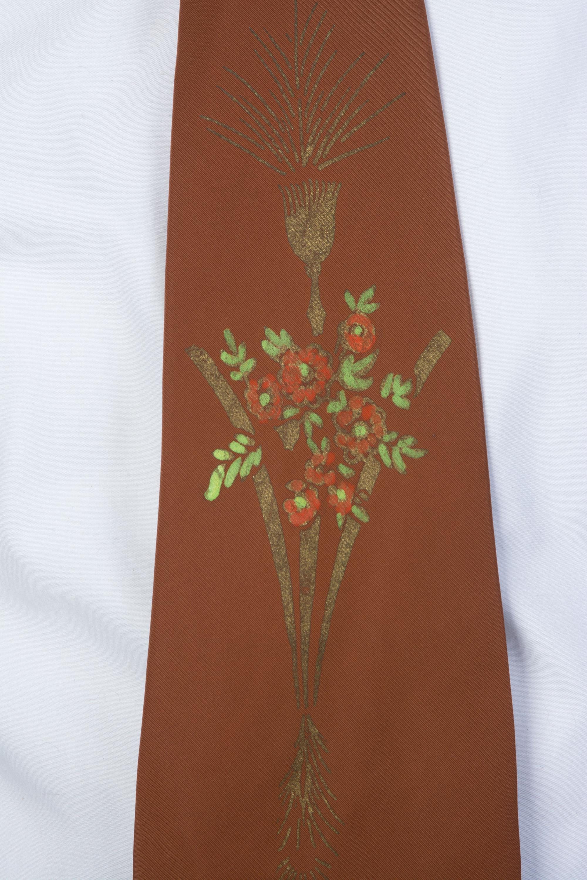 I really like the unique motif on this handpainted 1940s tie. It features a metallic screen print of a tussie mussie style floral arrangement, which has hand touched flowers in orange-red and bright green, and a giant scottish thistle above them. It's all on a rusty brown rayon-acetate blend, which is fully lned.