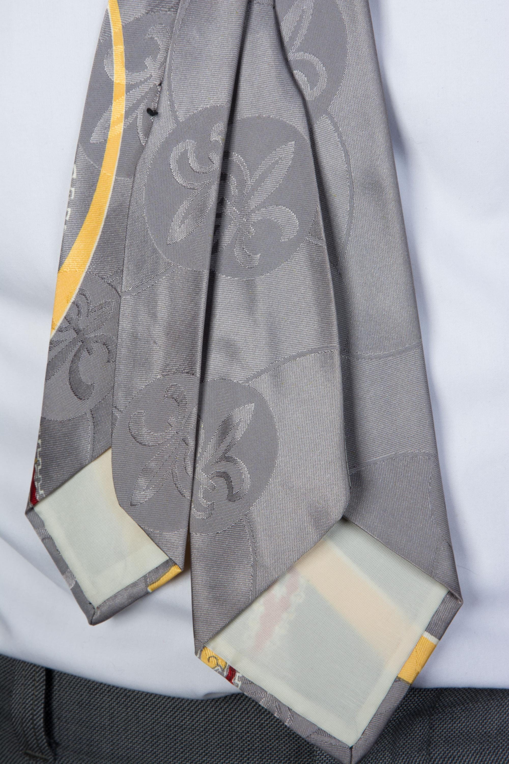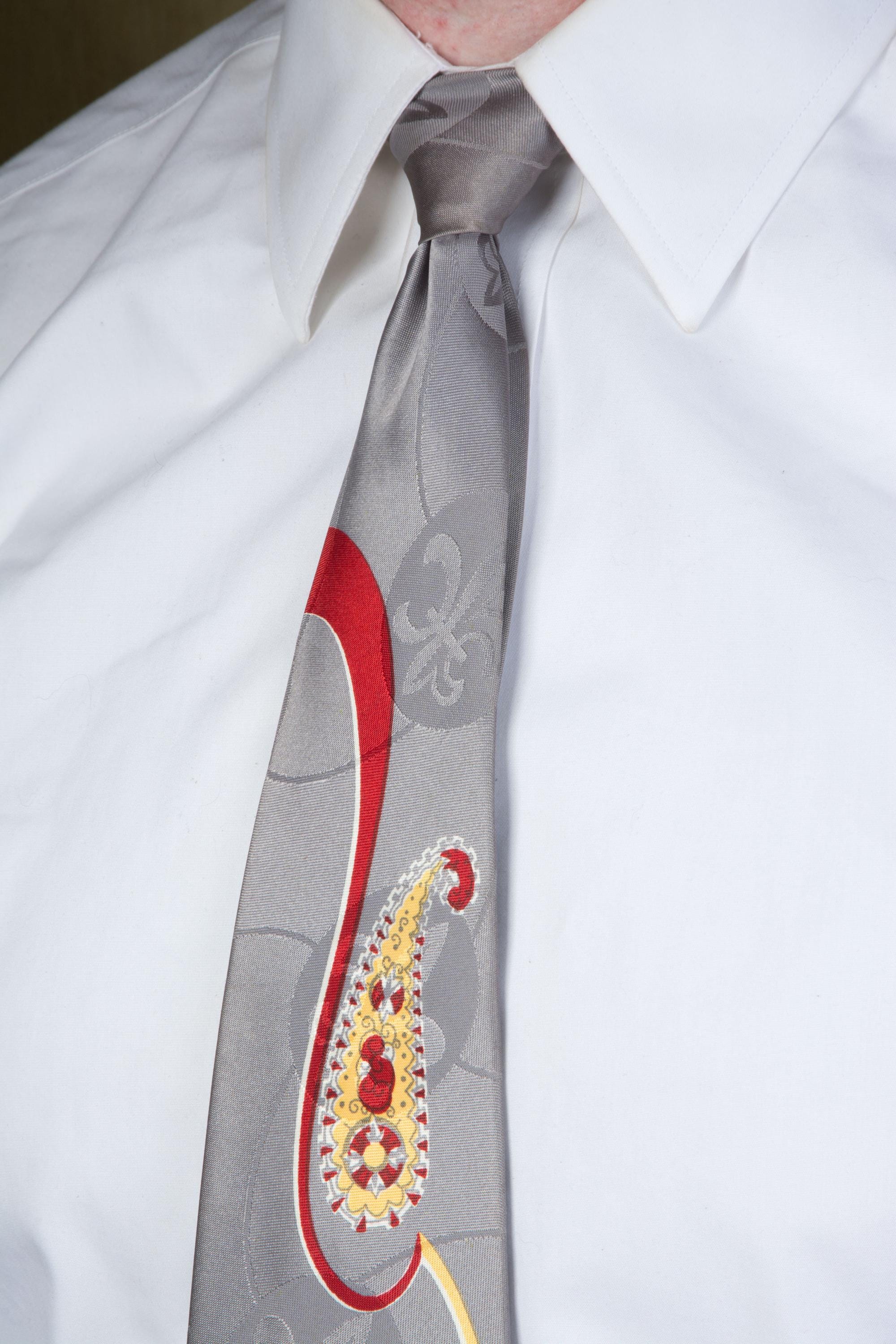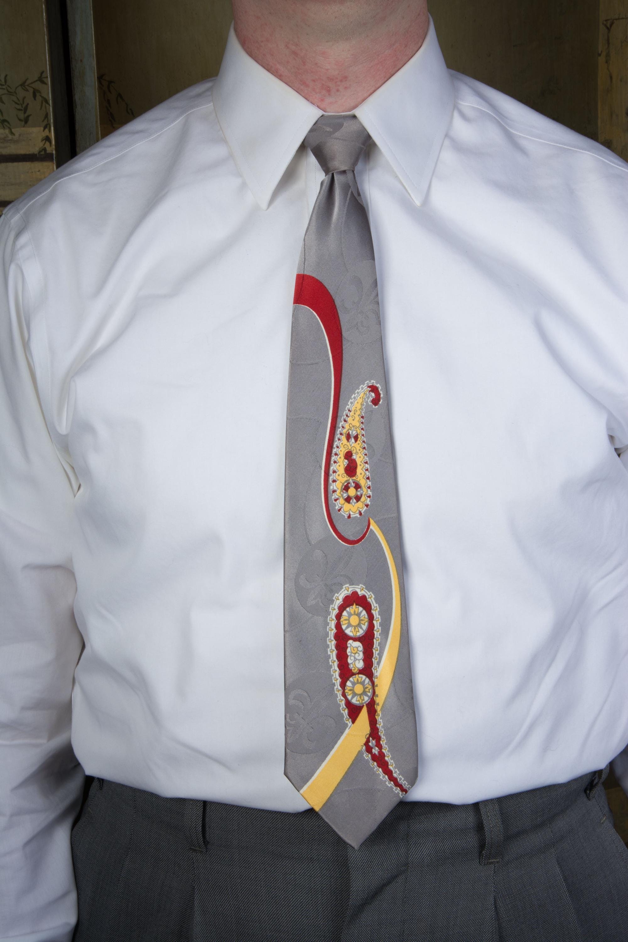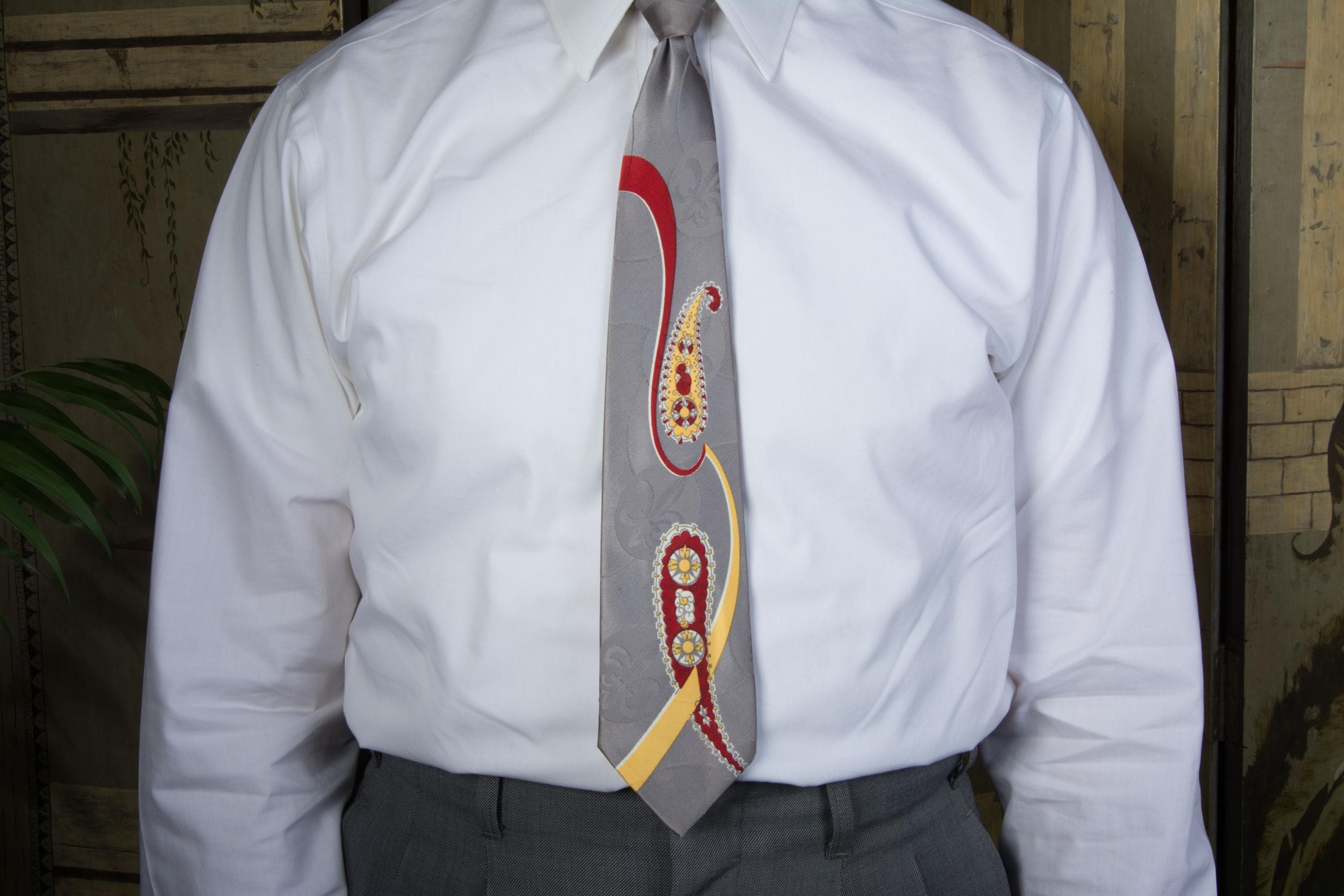 A very glossy 1950s tie, still with some vibes from the bold look era but longer and narrower. The silvery brocade features a fantastic pattern of fleur de lis, overprinted with bright, bold paisleys in yellow and rich red.