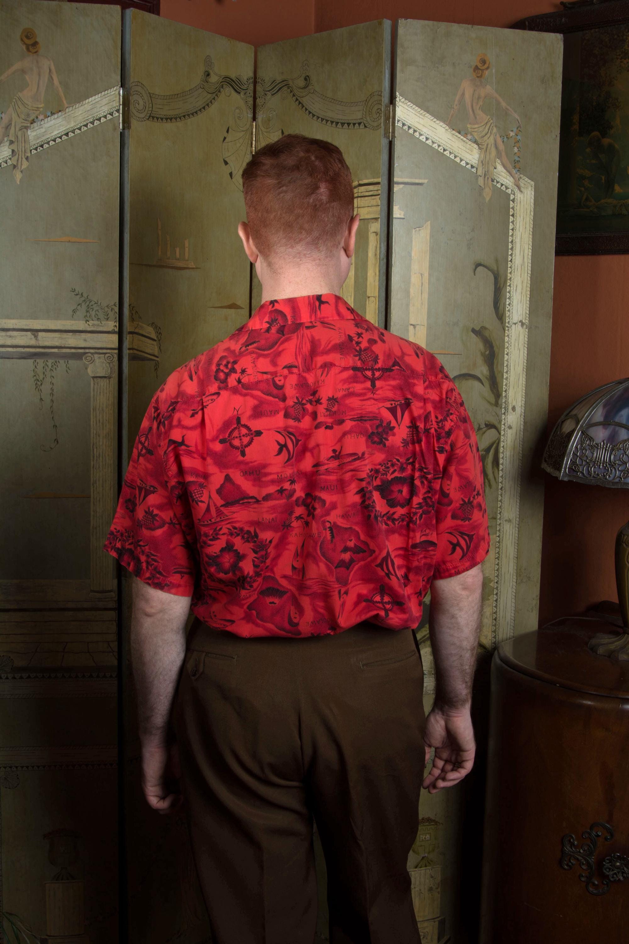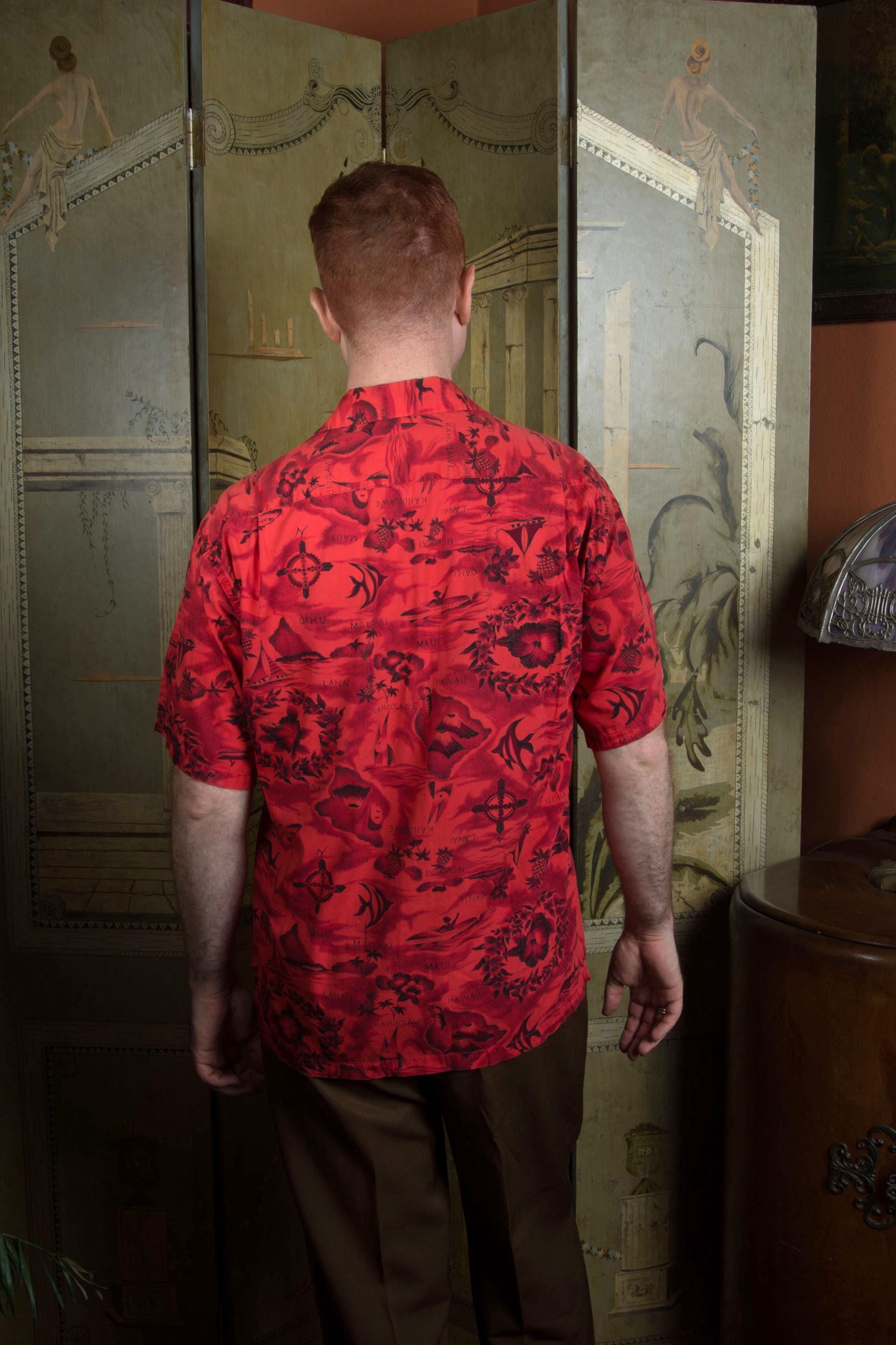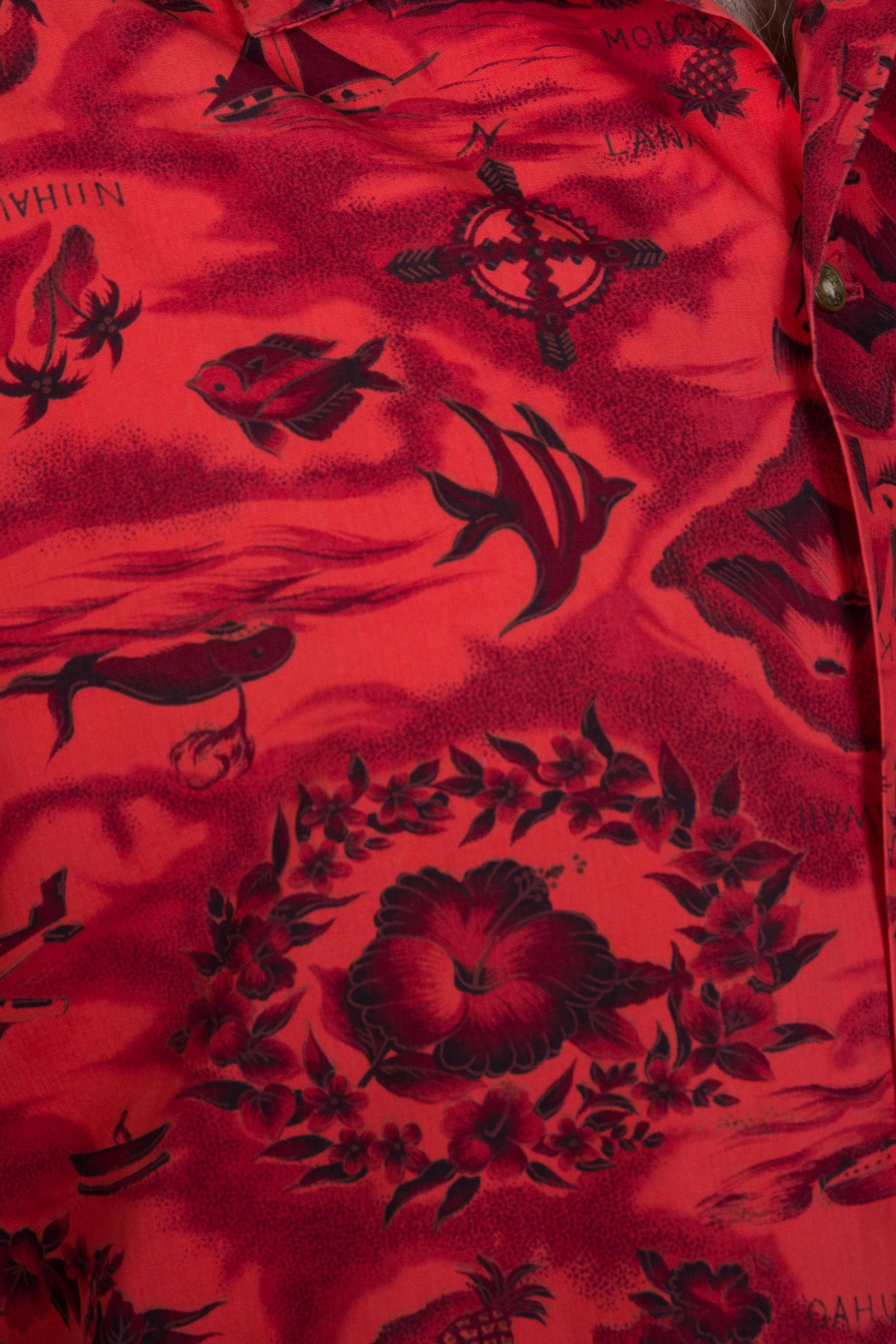 One of those classic early to mid 60s Aloha shirts in a monotonal red. This features a print with some of everything - islands and airplanes, pineapples, hibiscus, whales, fish, outriggers and sail boats. And volcanoes! This has a single chest pockets and closes with decorative brass buttons.