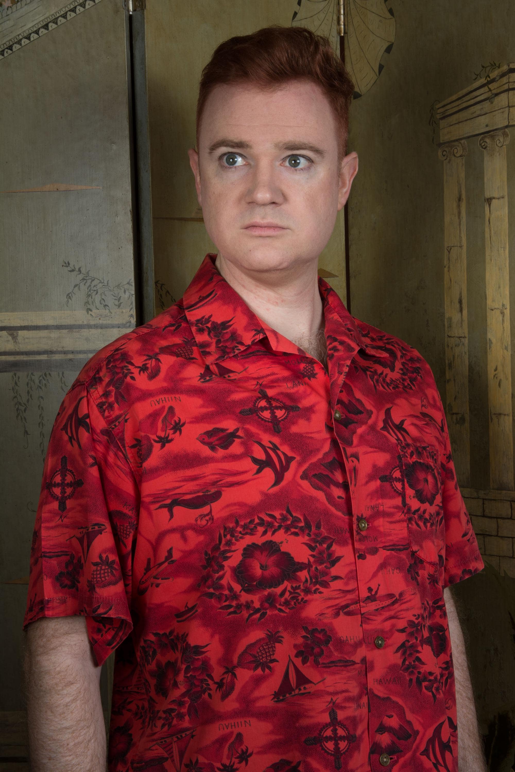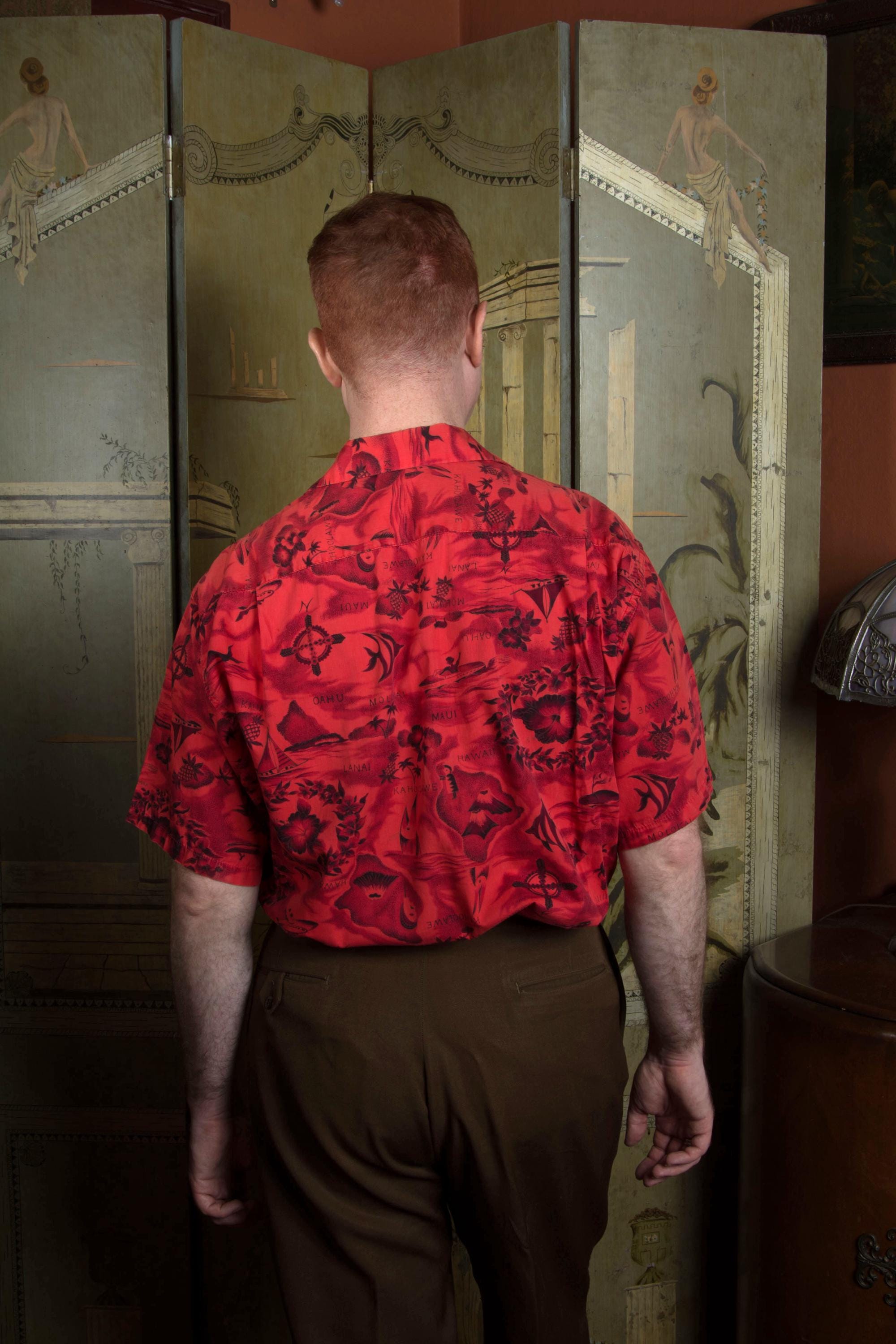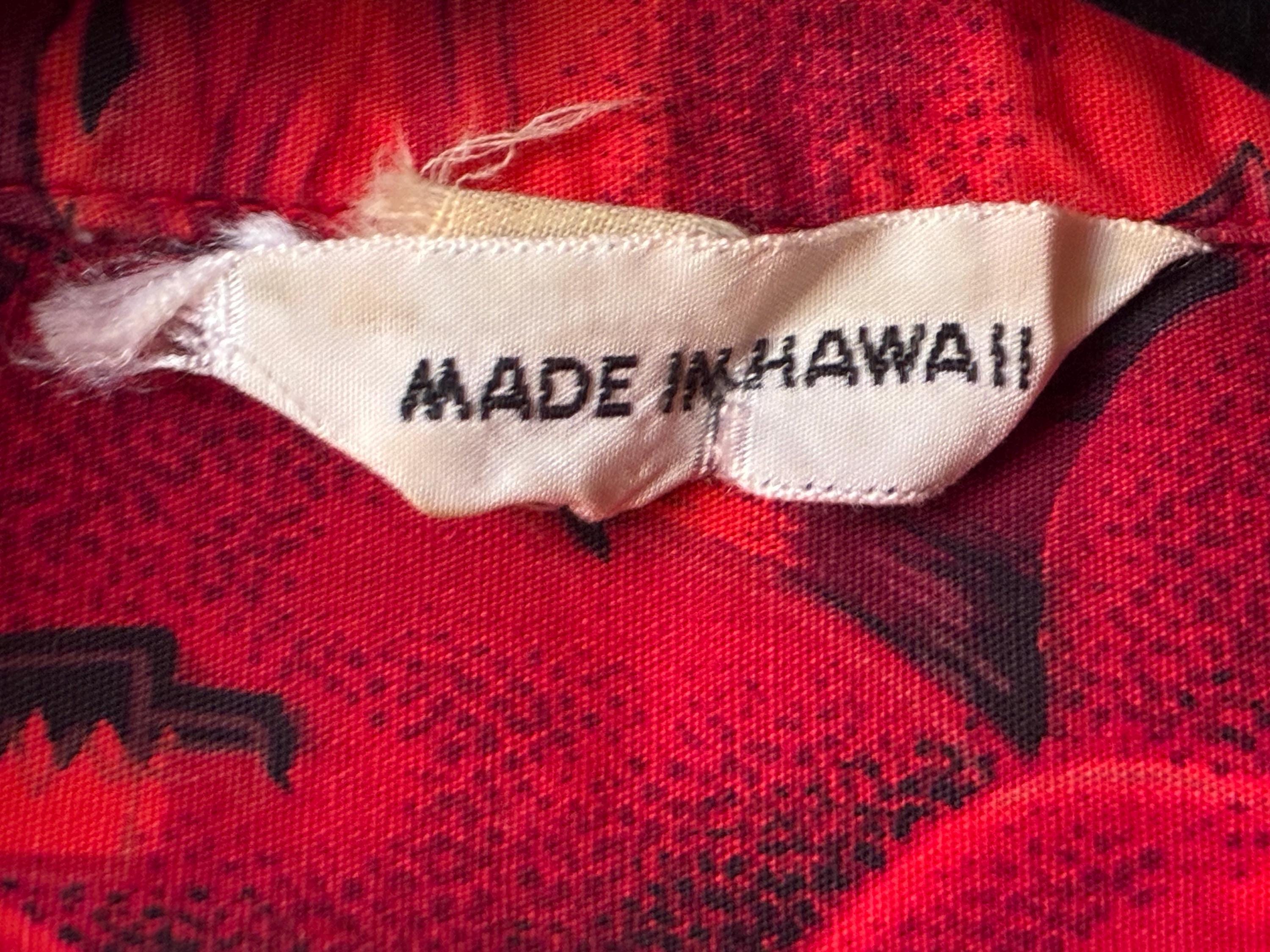One of those classic early to mid 60s Aloha shirts in a monotonal red. This features a print with some of everything - islands and airplanes, pineapples, hibiscus, whales, fish, outriggers and sail boats. And volcanoes! This has a single chest pockets and closes with decorative brass buttons.