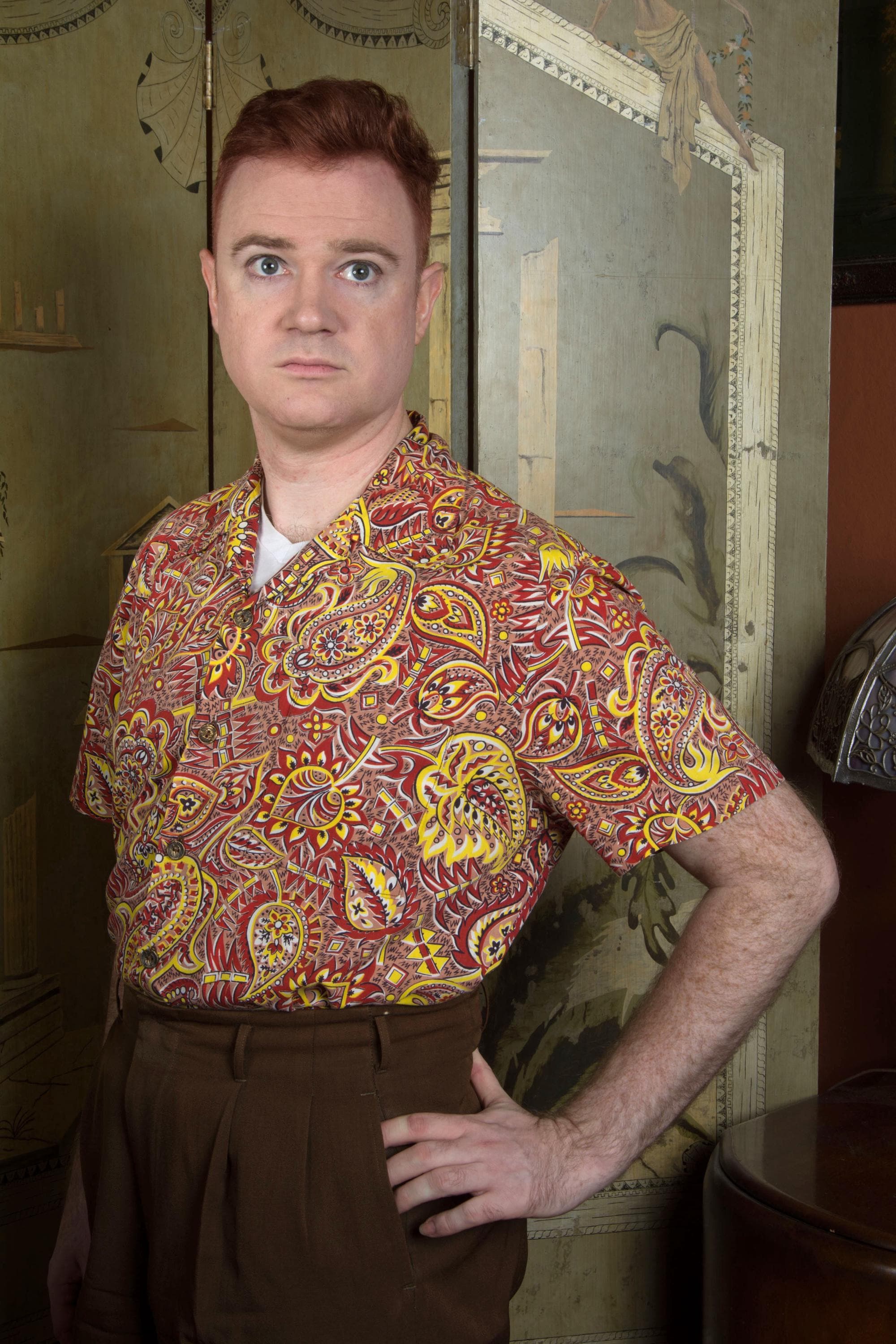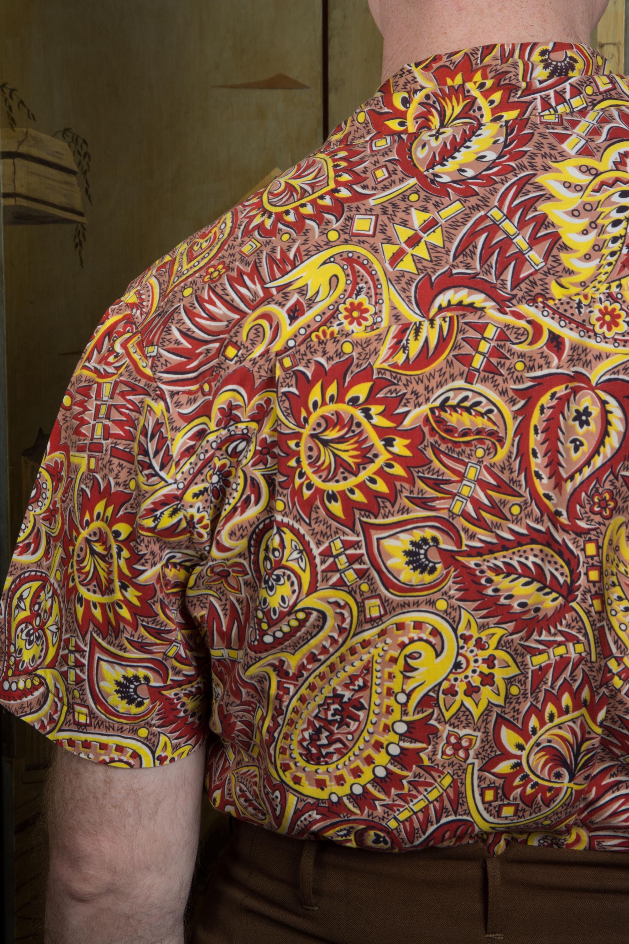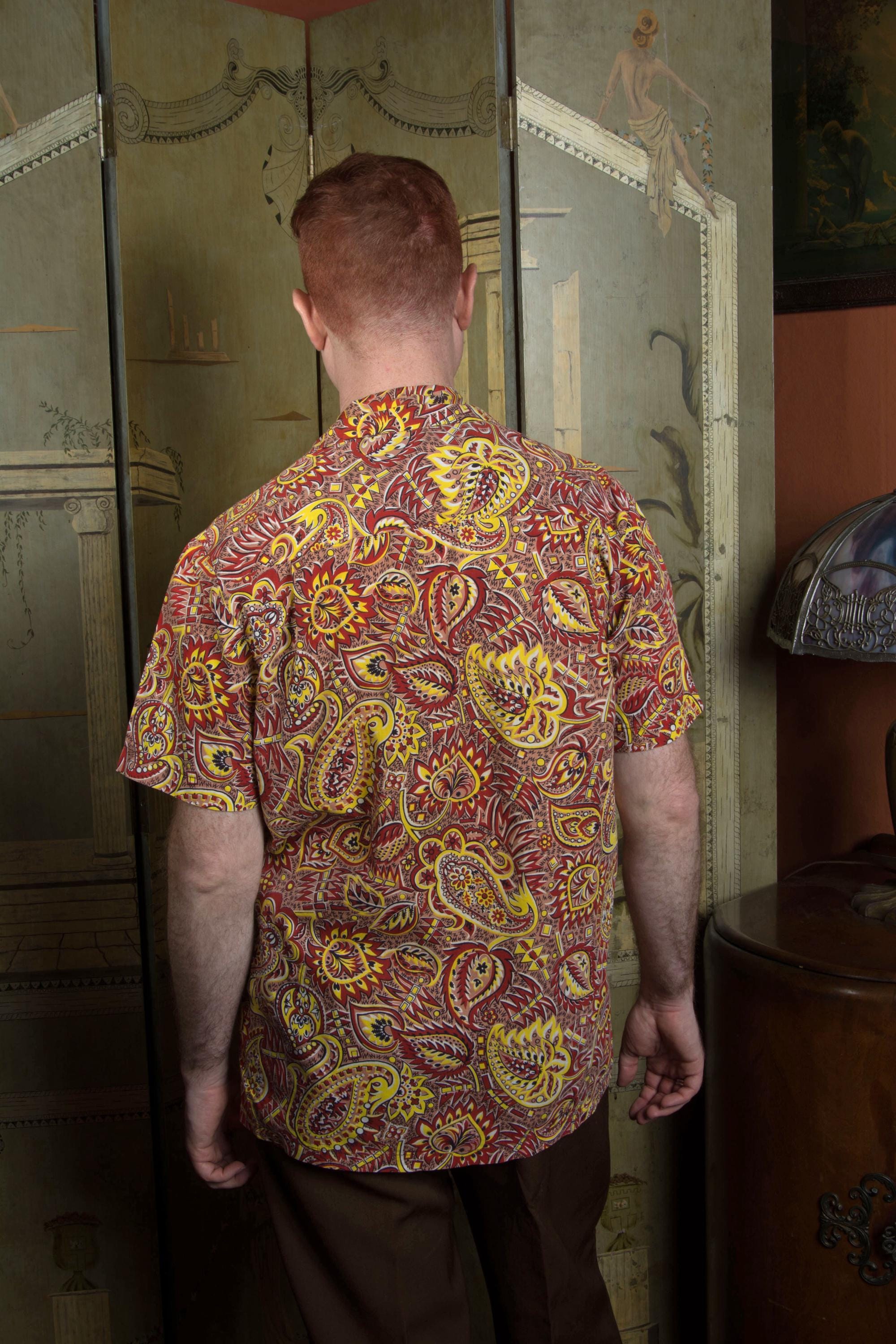 A killer 1950s vintage cotton shirt in a very mid century version of paisley. Possibly made by Kamehameha due to the presence of the Kamehameha style buttons, this features an exceptional bright paisley in tomato red and yellow on a tan ground. It's a little spiky, bold, the most rock and roll paisley I've ever seen. This is a classic aloha cut with wide collar, matched pockets and it closes up the front with brass novelty buttons.