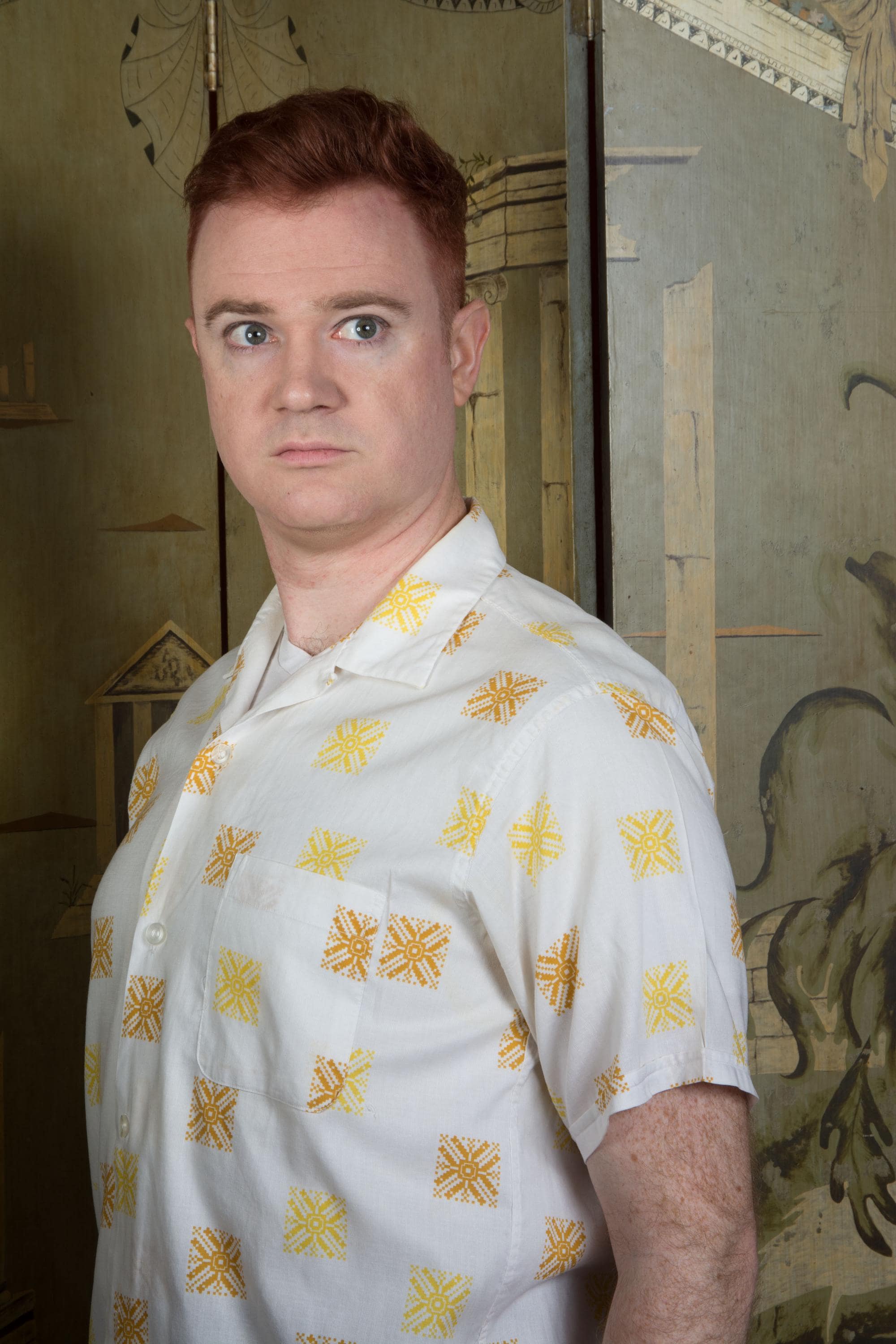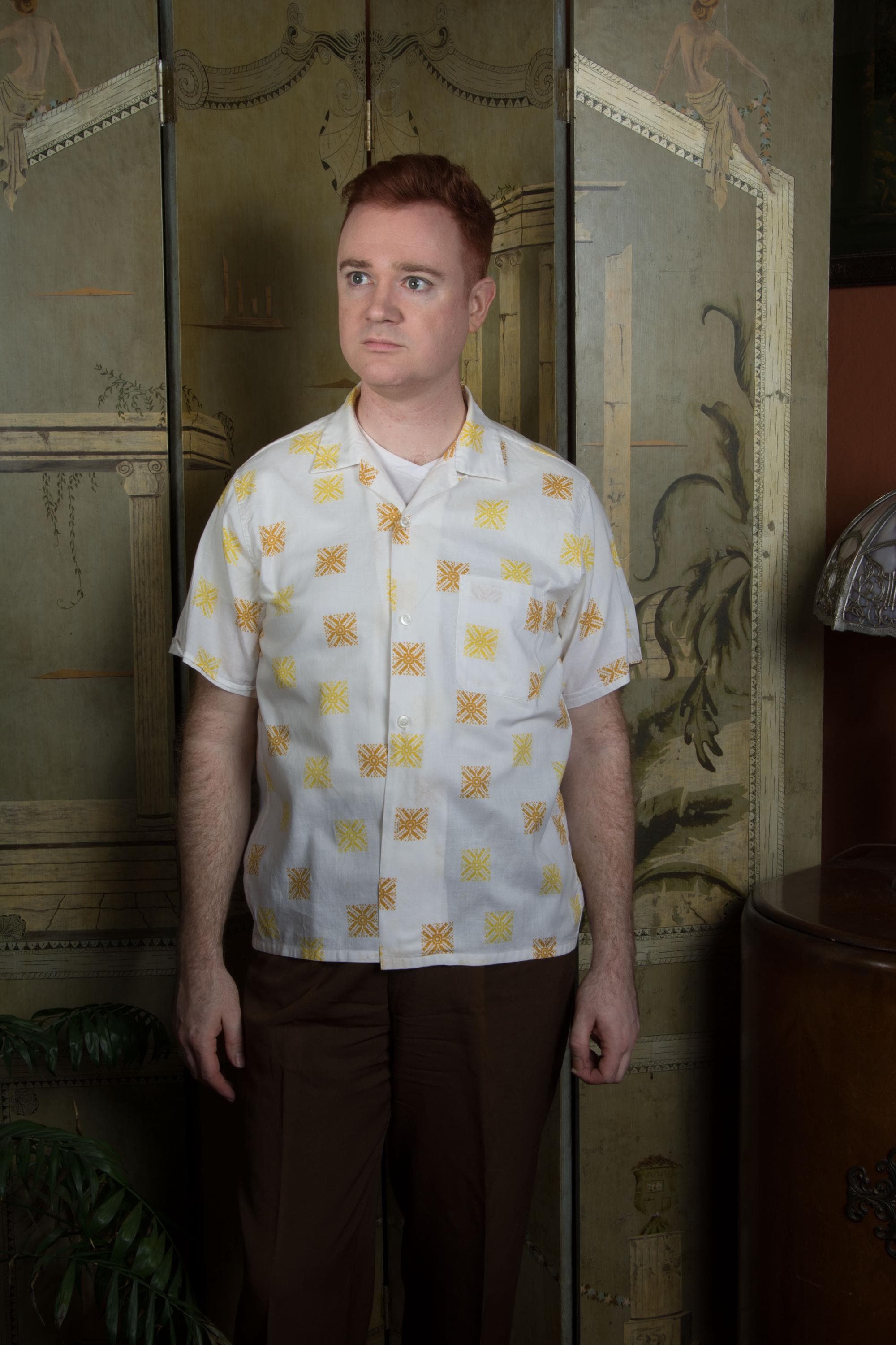 A very fun vintage late 1950s to early 60s summery short sleeve shirt. This is a slightly looser weave of cotton or cotton blend, and it features a fun print that mimics the look of embroidery - detailed squares of yellow and caramel. This has a single chest pocket and classic loop collar. It's a little sheer, so you can wear with an undershirt or let it hint at your tattoos.