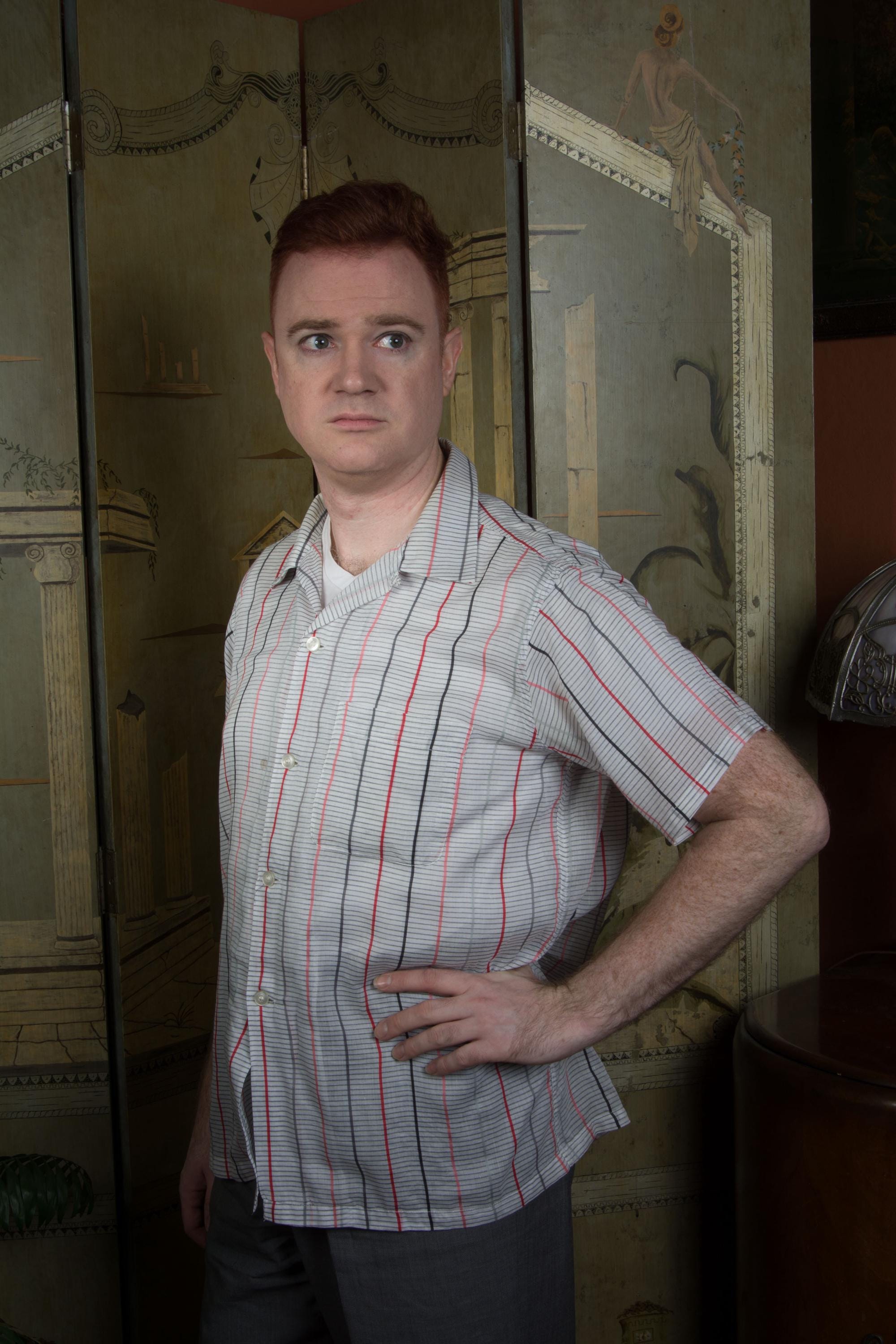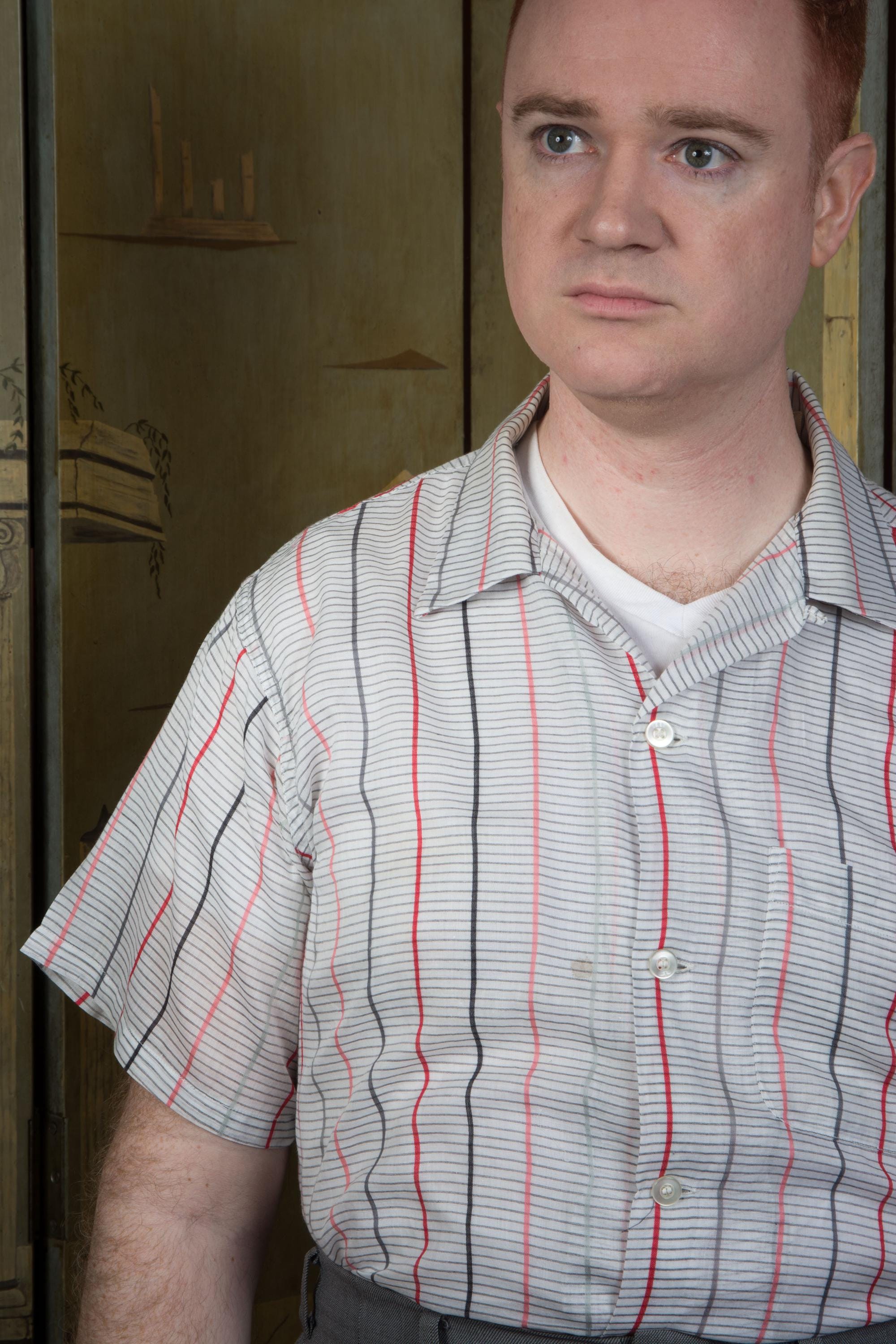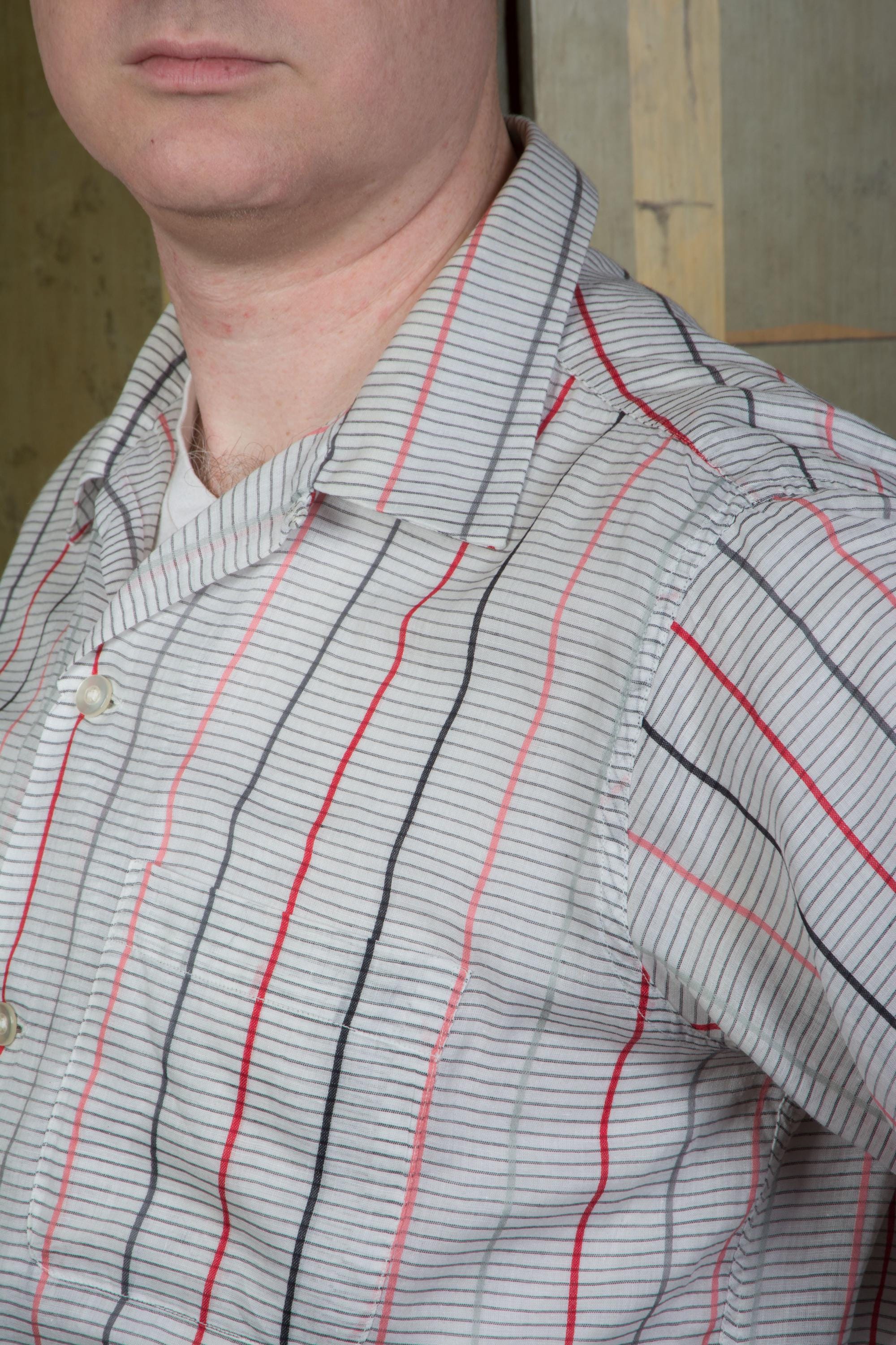 A light as can be sport shirt made by Arrow in the mid-1950s. This is a very lightweight, semi-sheer cotton in white with horizontal grey stripes in narrow rows, while bolder vertical columns are created with stripes of grey, coral, black and red. This has a single well-matched pocket and classic loop collar