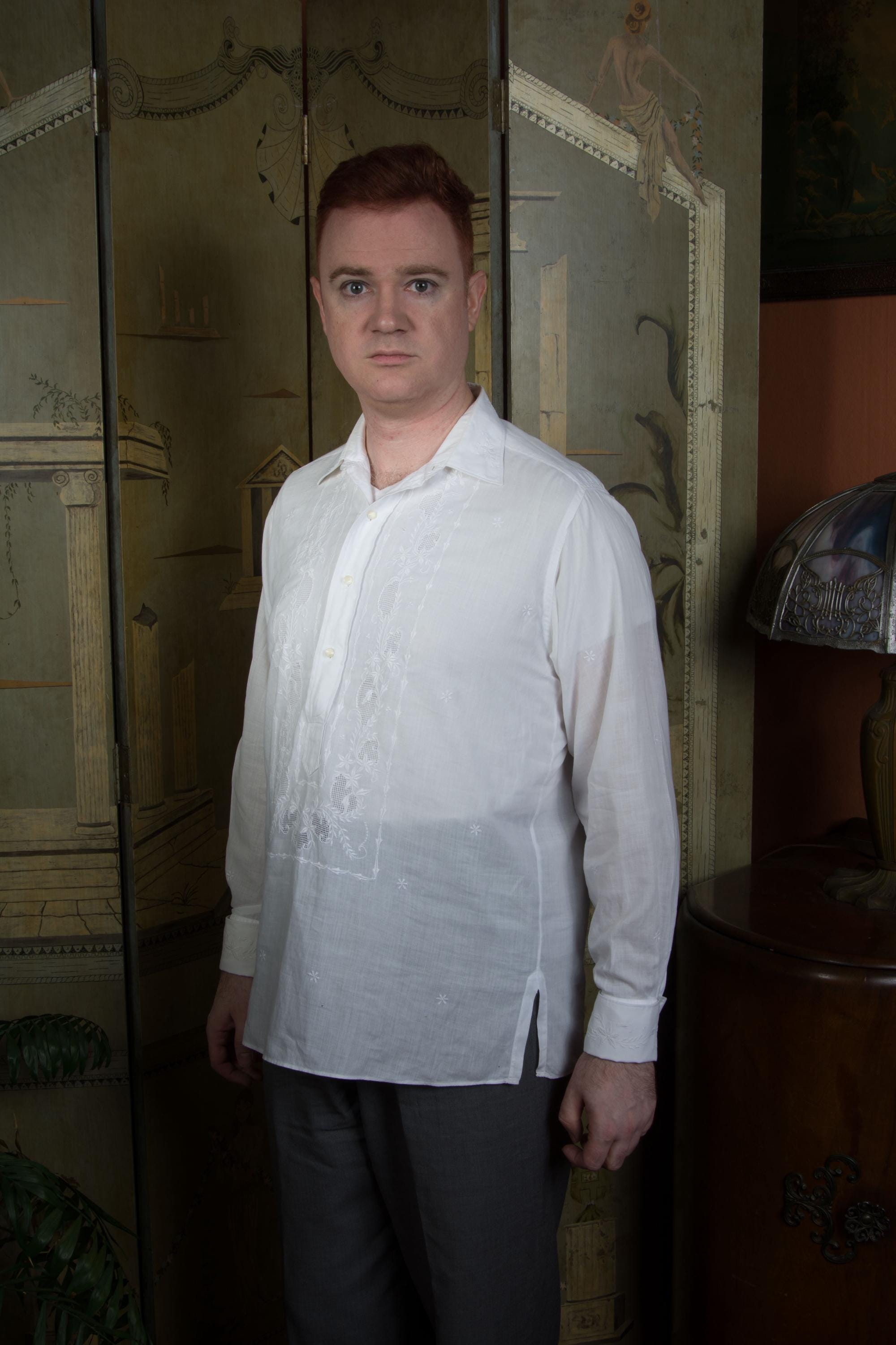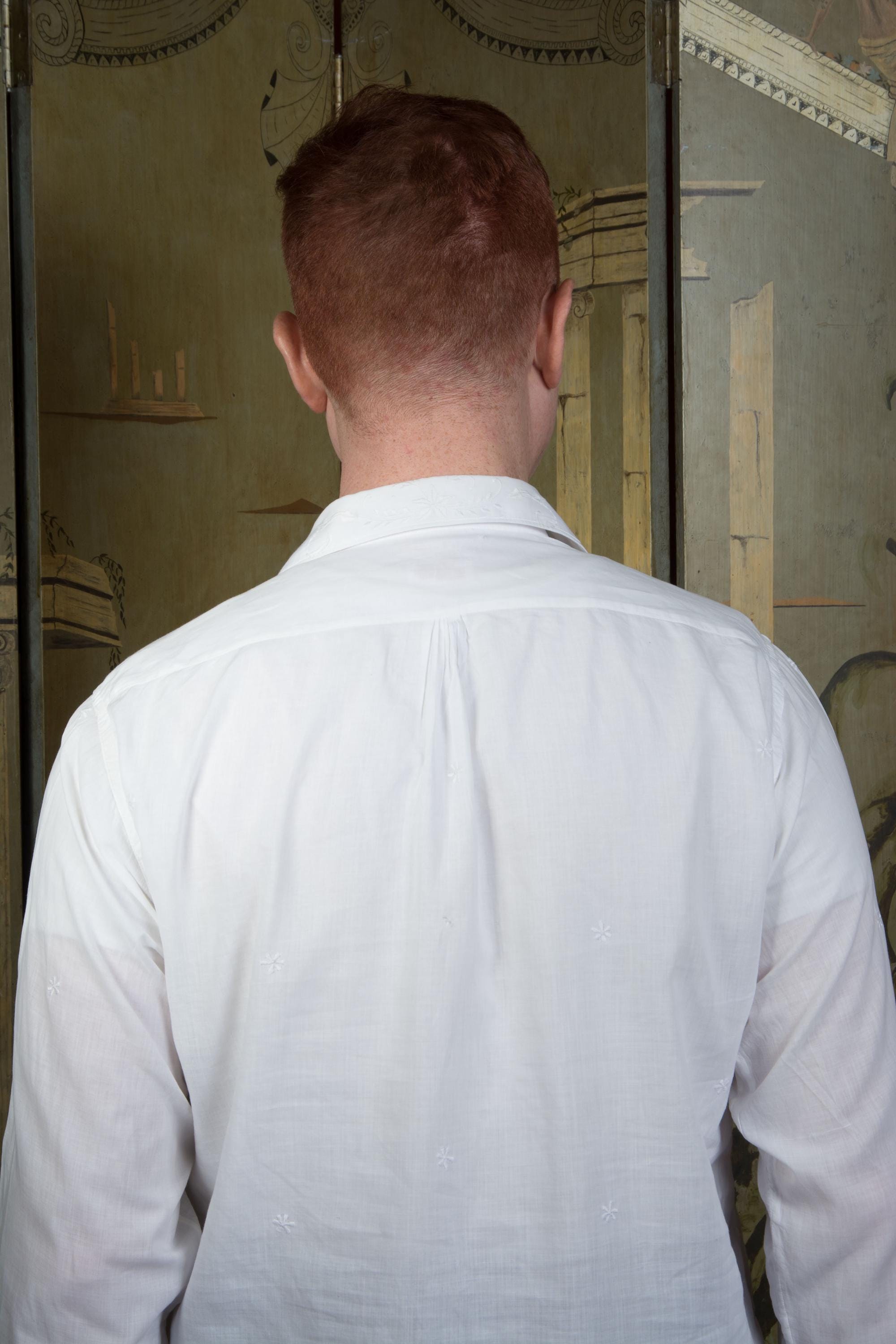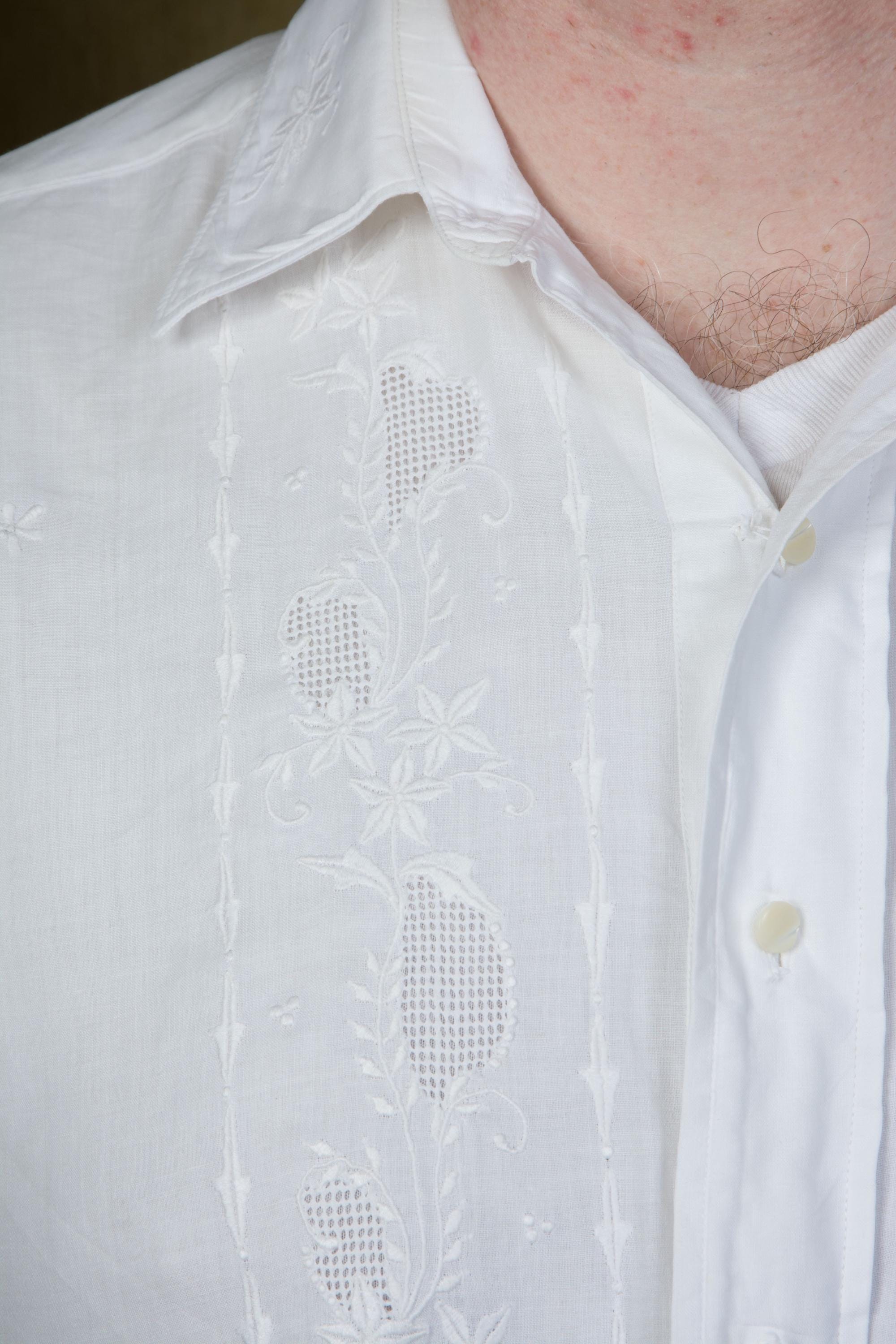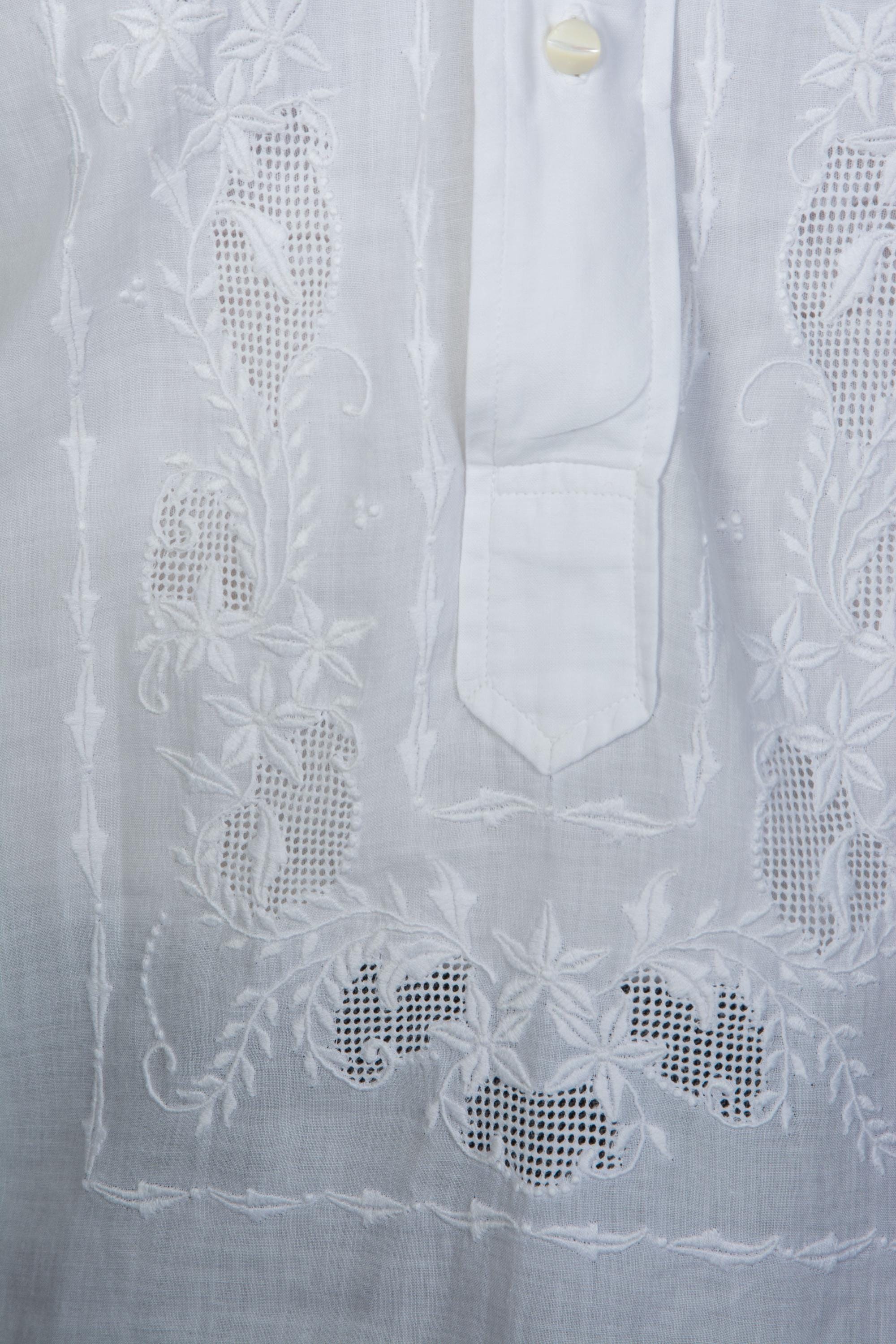 A gorgeous vintage formal shirt made in Manila, the Philippines. It's a Filipino Barong or Tagalog shirt, and it's made of incredibly nice, soft cotton and finished with exceptional embroidery and drawn work that I associate more with Edwardian women's garments than later mens wear - it's quite striking. Made in the 1950s or 1960s, it features a small, crisp collar and classic french cuffs. Can be worn very formally or as dressy afternoonwear.