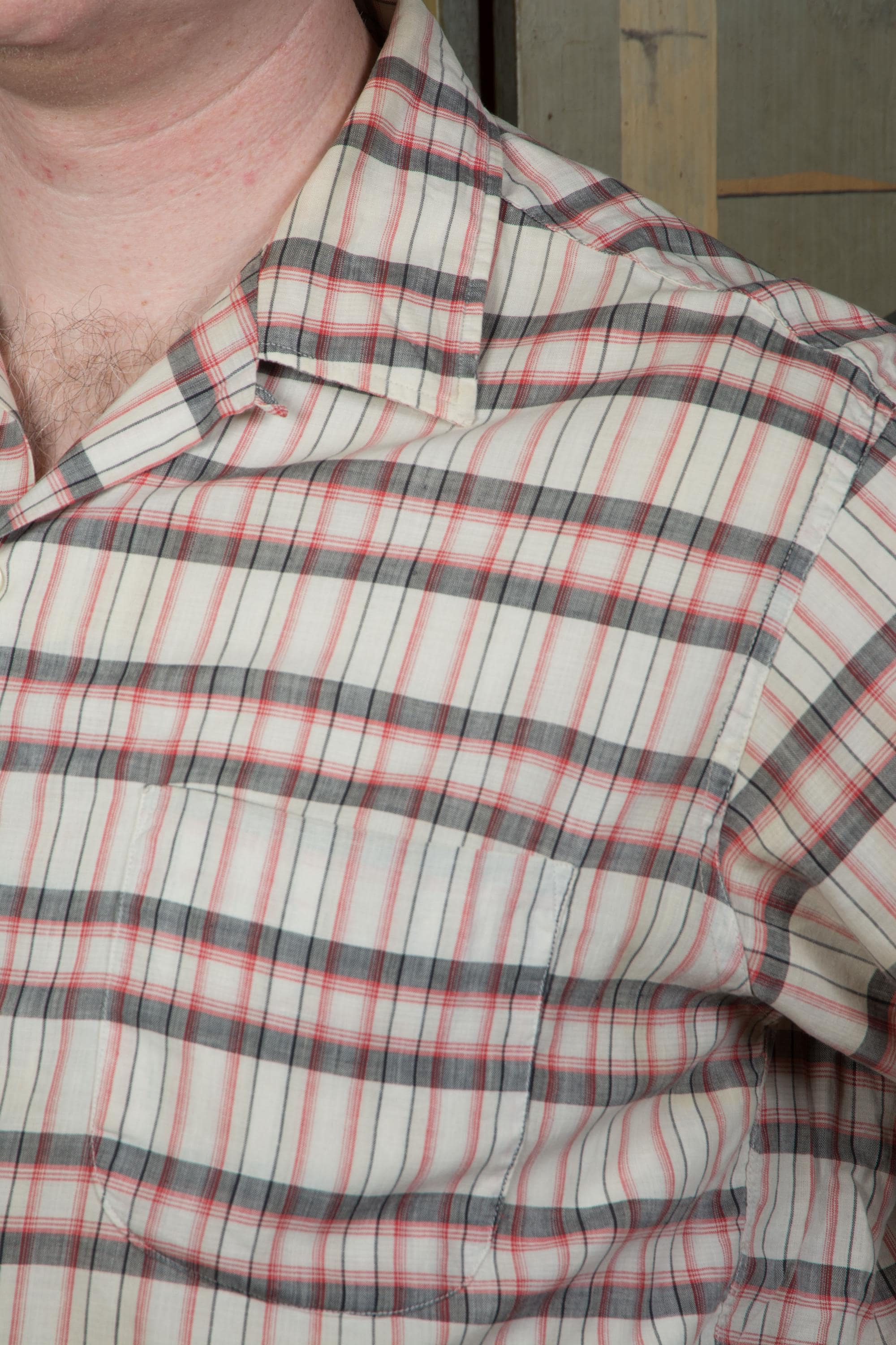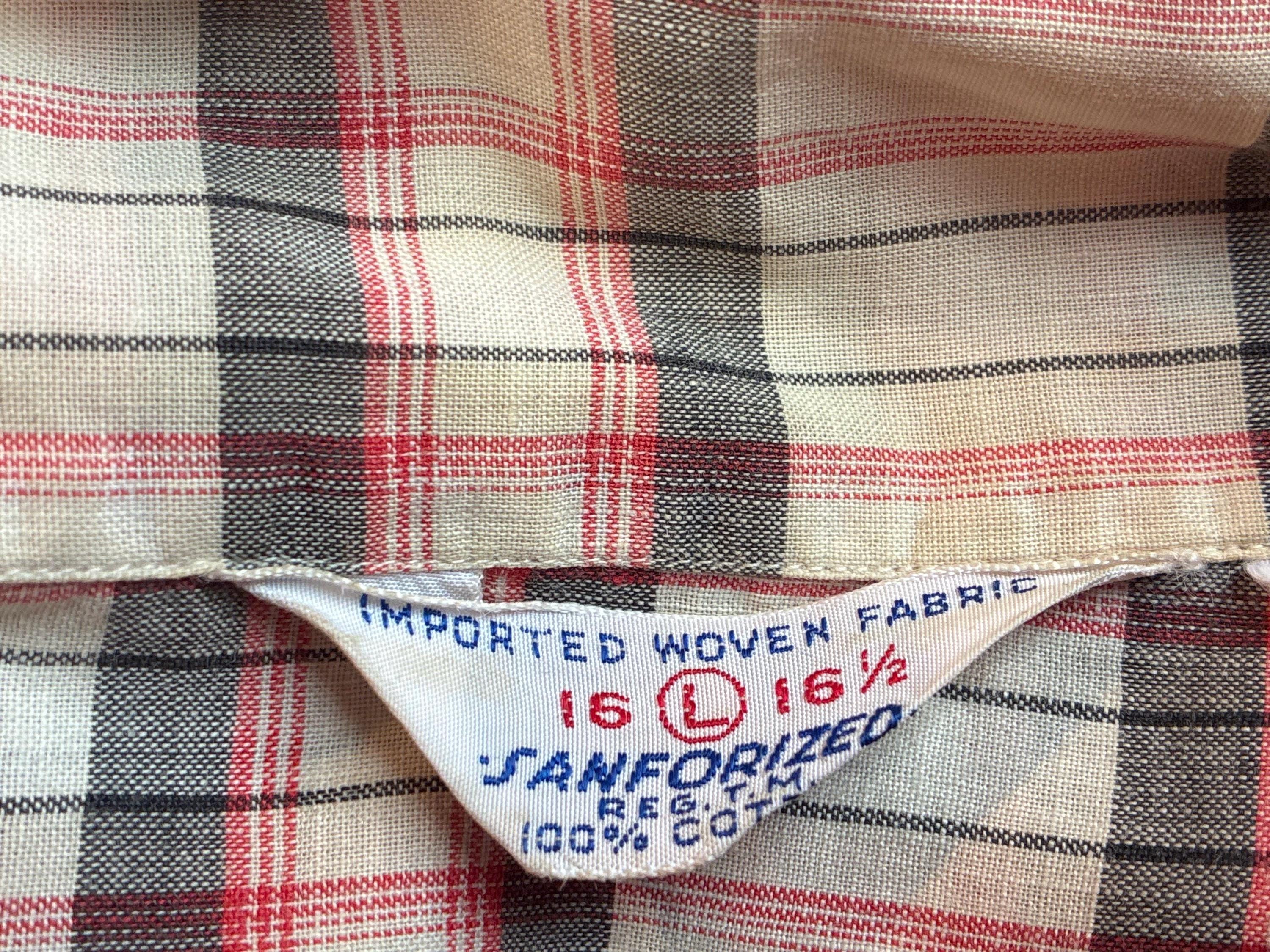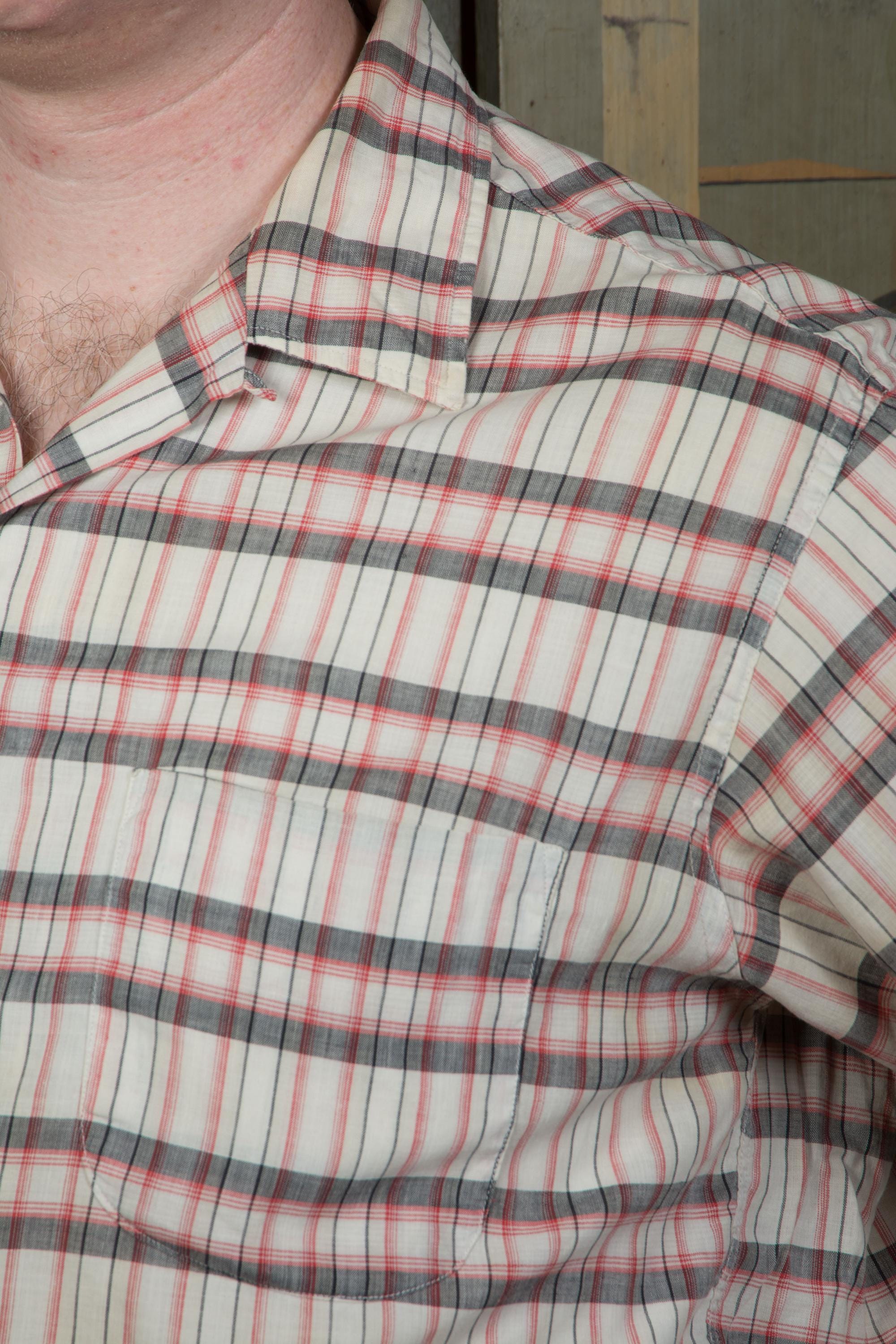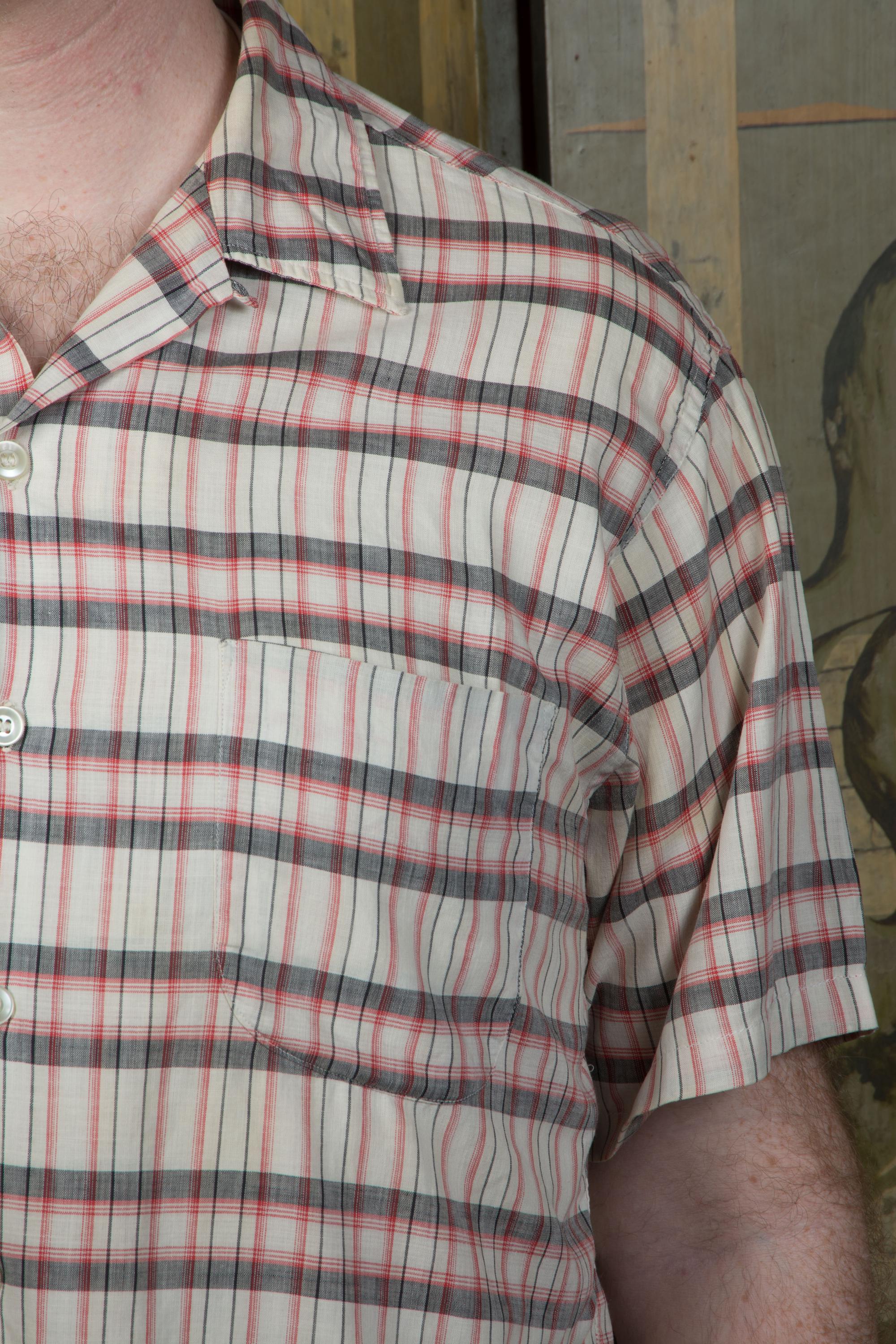 A well-loved soft sanfornized cotton summer sport shirt in a good plaid of ivory, grey and soft red. This short sleeve shirt is the kind of soft you can only get from many washes of quality cotton. This has a single matched patch pocket and classic loop collar.