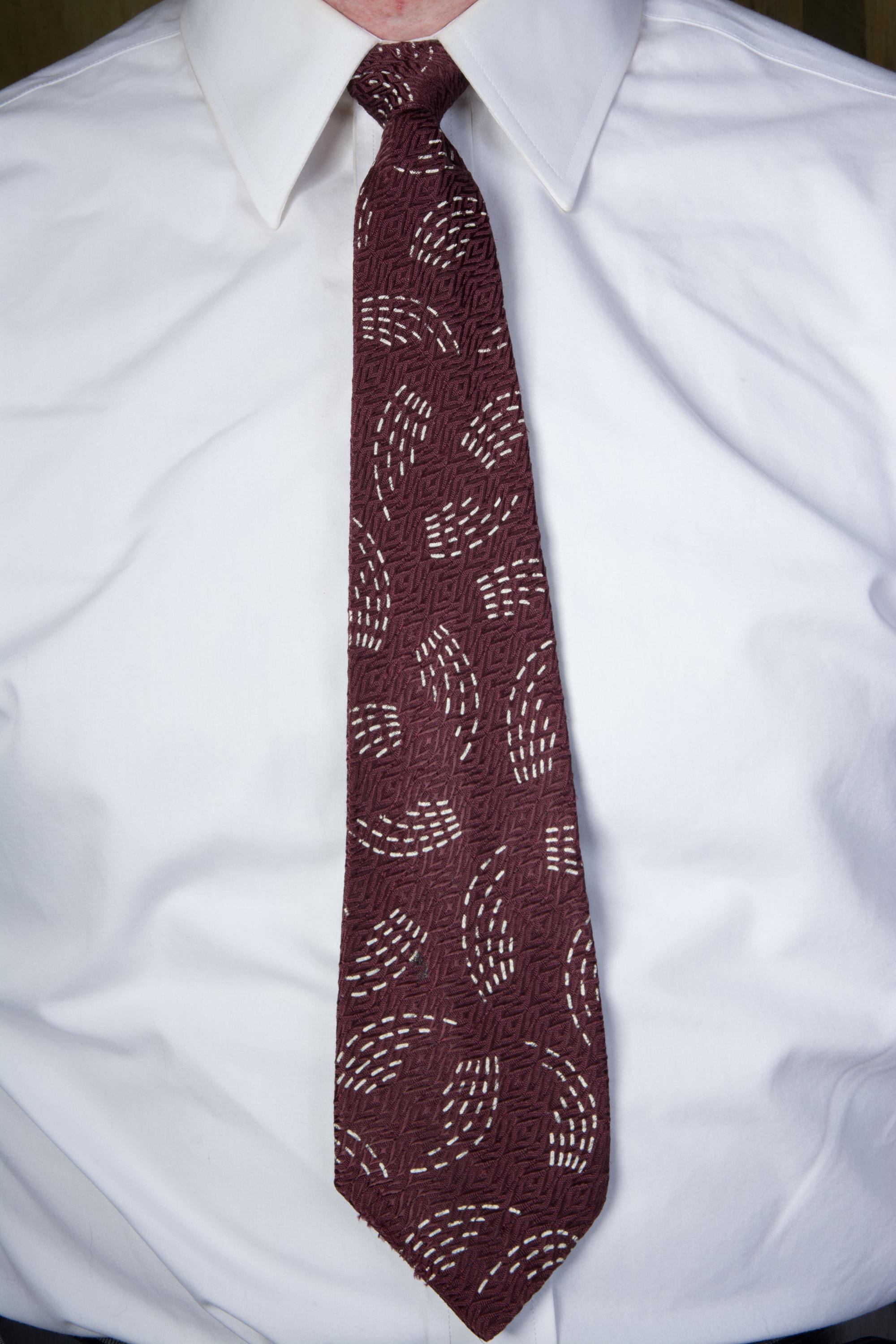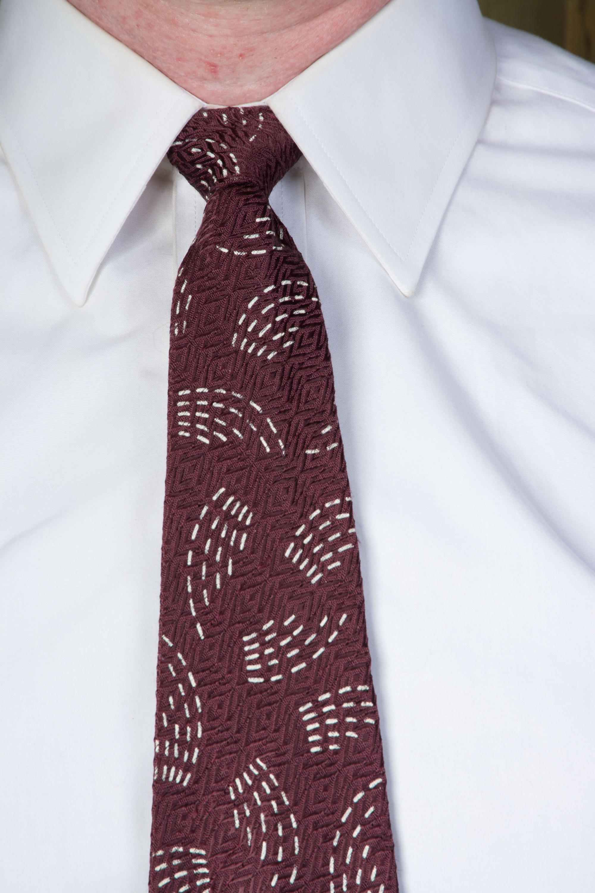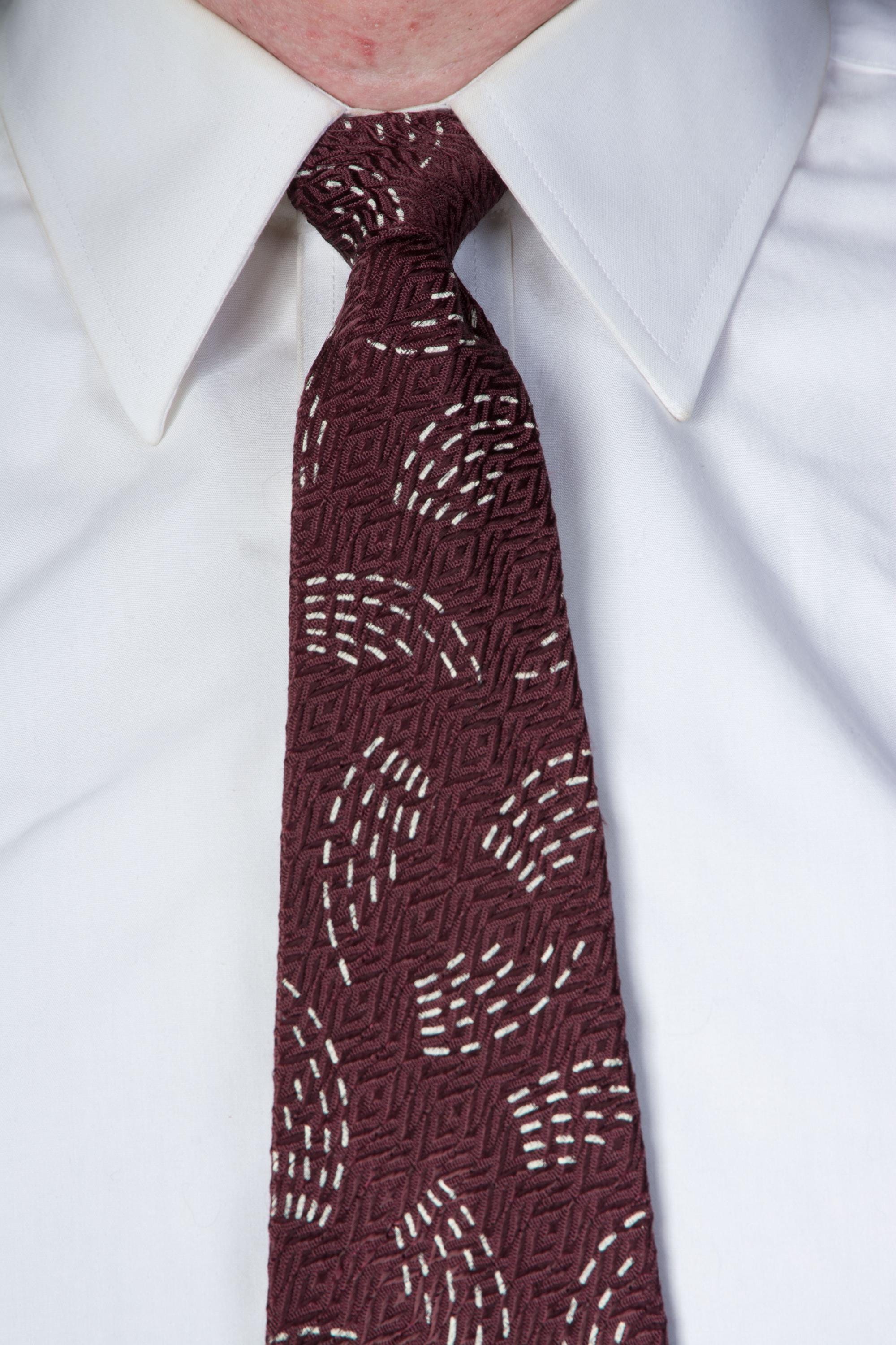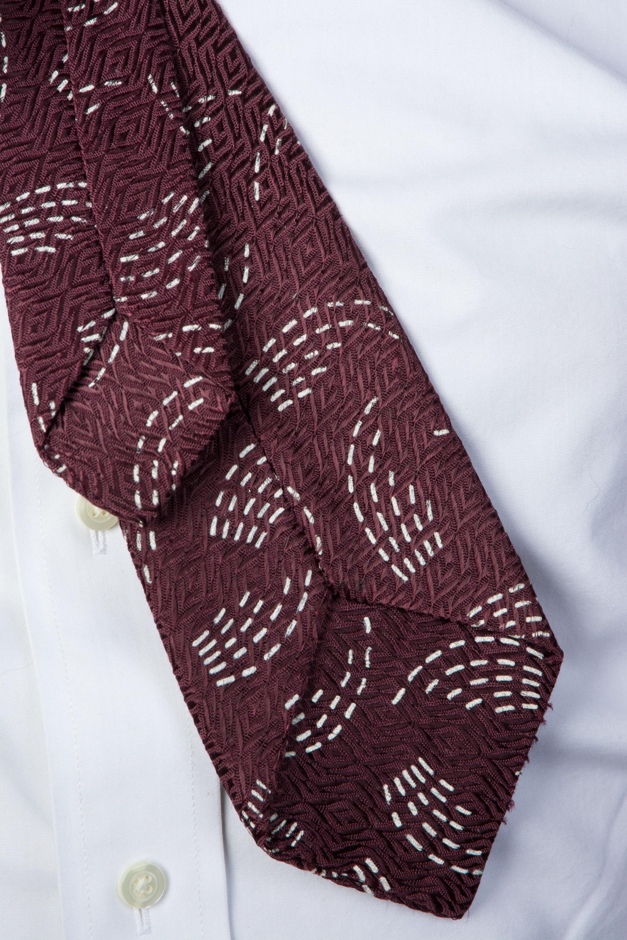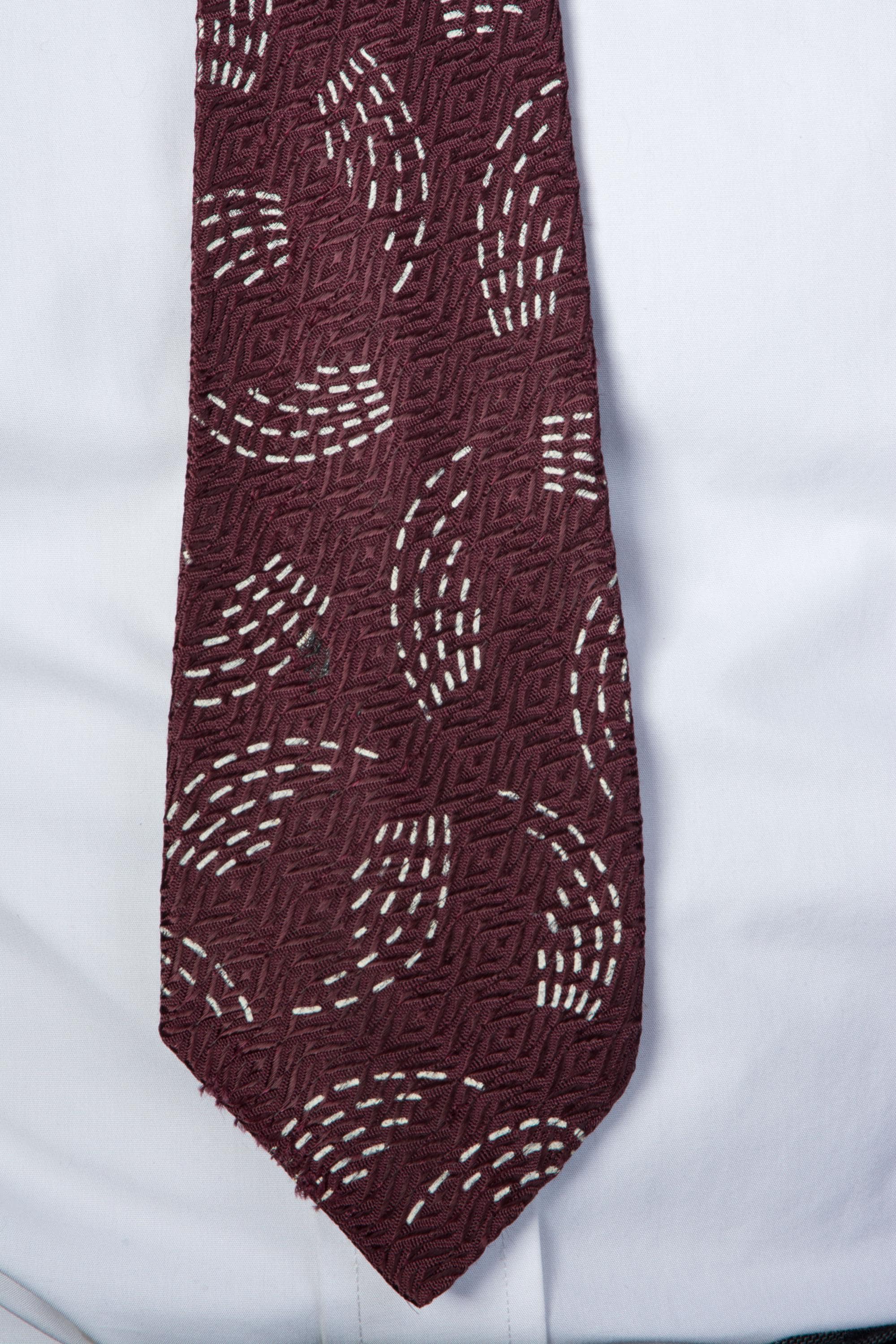 An excellent 1920s brocade tie, lustrous and textural. The richness and detail of the jacquard weave is exceptional in a deep brown leaning burgundy. It is overlaid with a screen print in ivory sprays, swooping throughout. This is unlined and makes a really fine knot.