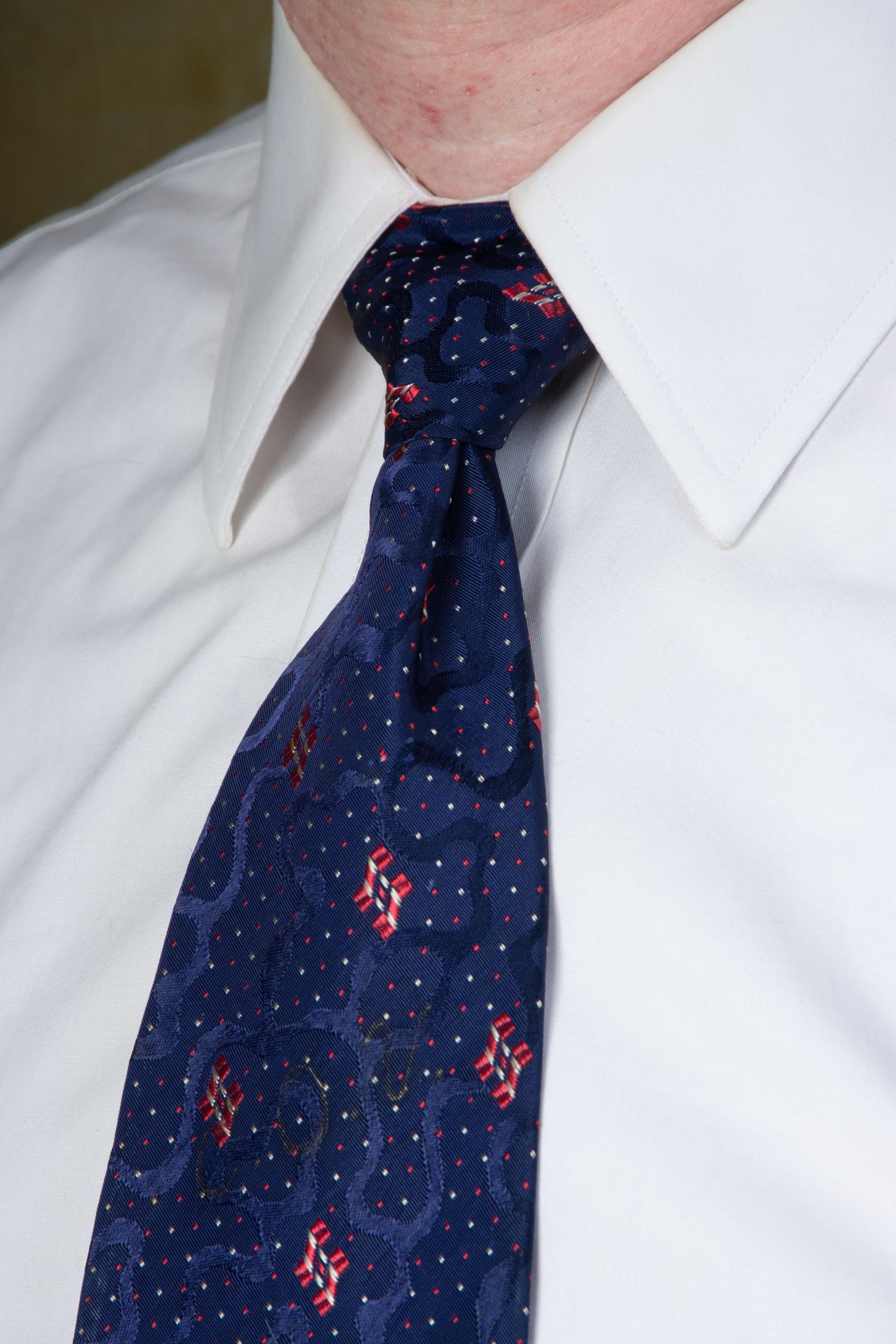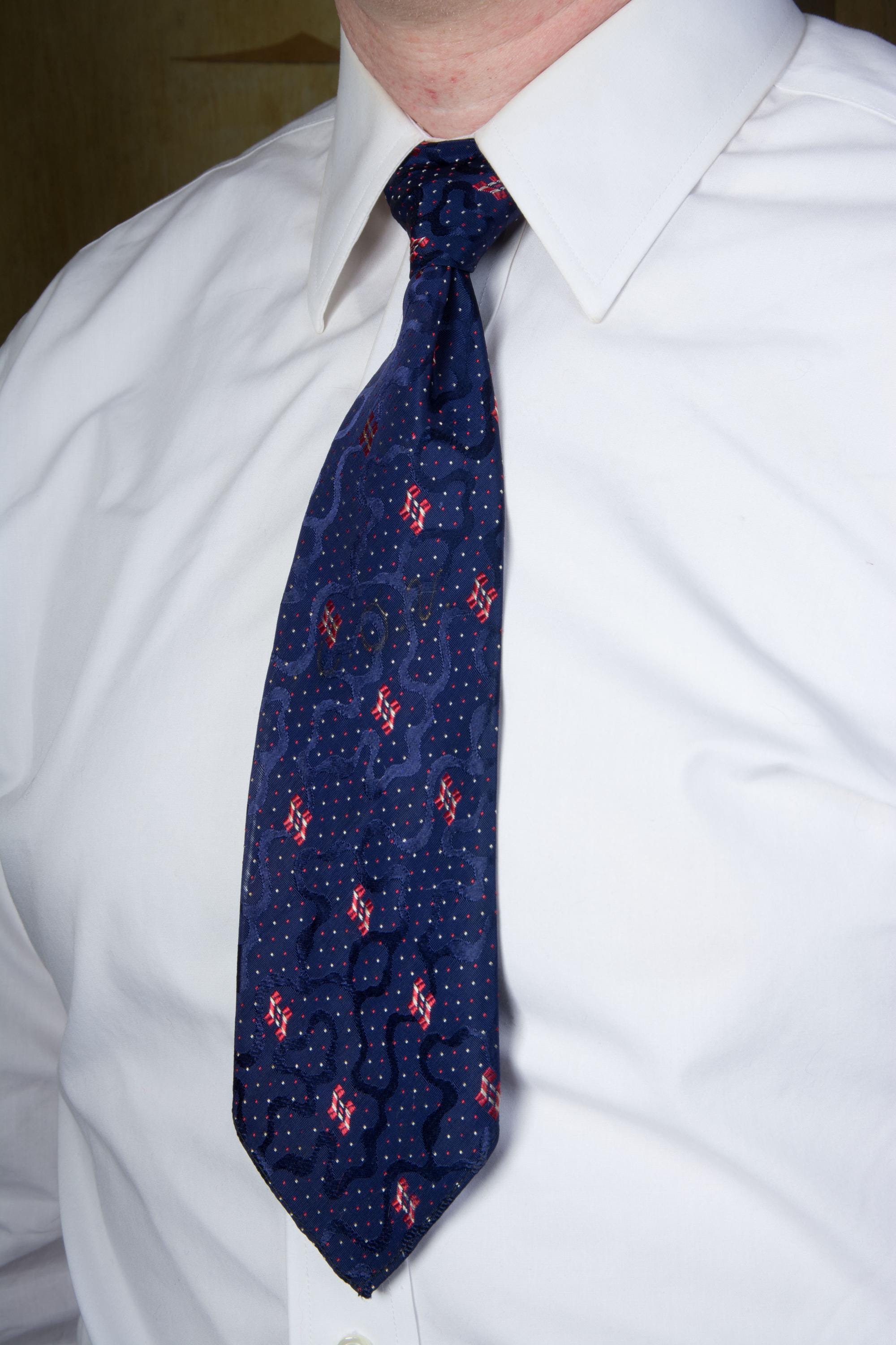 This tie has been dry cleaned and is ready to wear. It would be excellent, but someone in the past painted their initials on it (C.O.V.) in fading gold paint. The dry cleaner removed almost all of it, but enough shadow remains to make it out. Perfect for pairing with sweater vests and high gorge suits. I find no other issues to note.