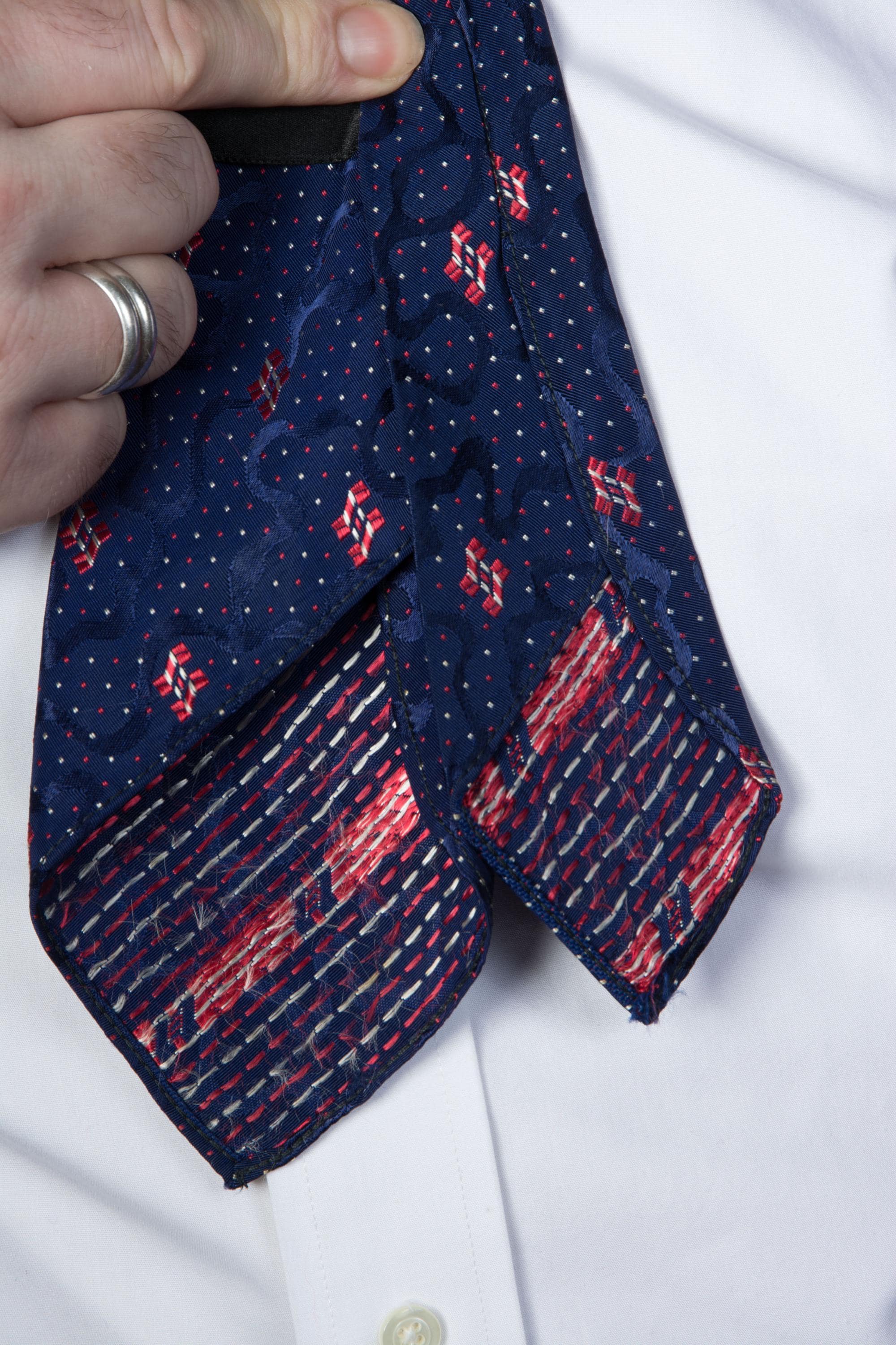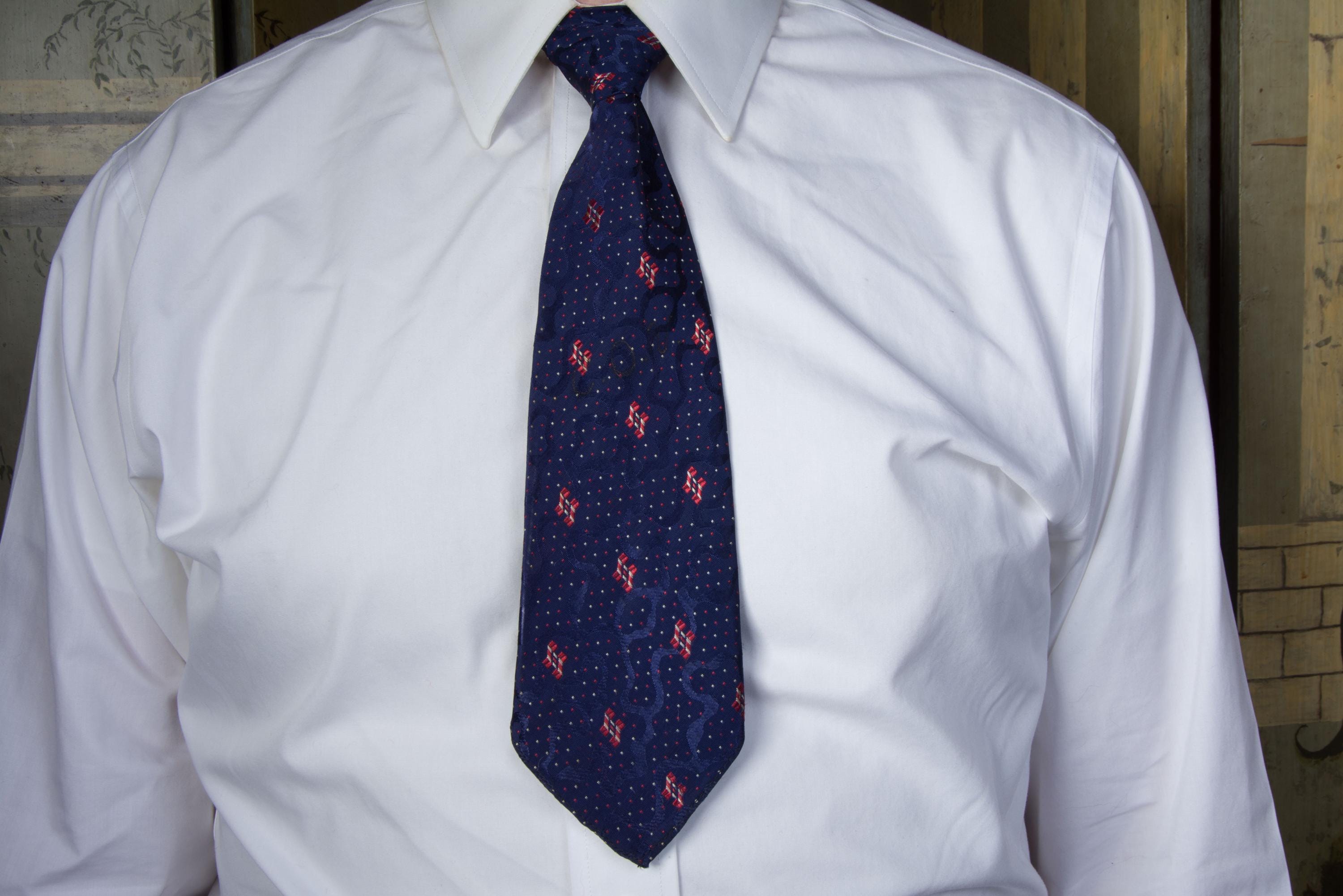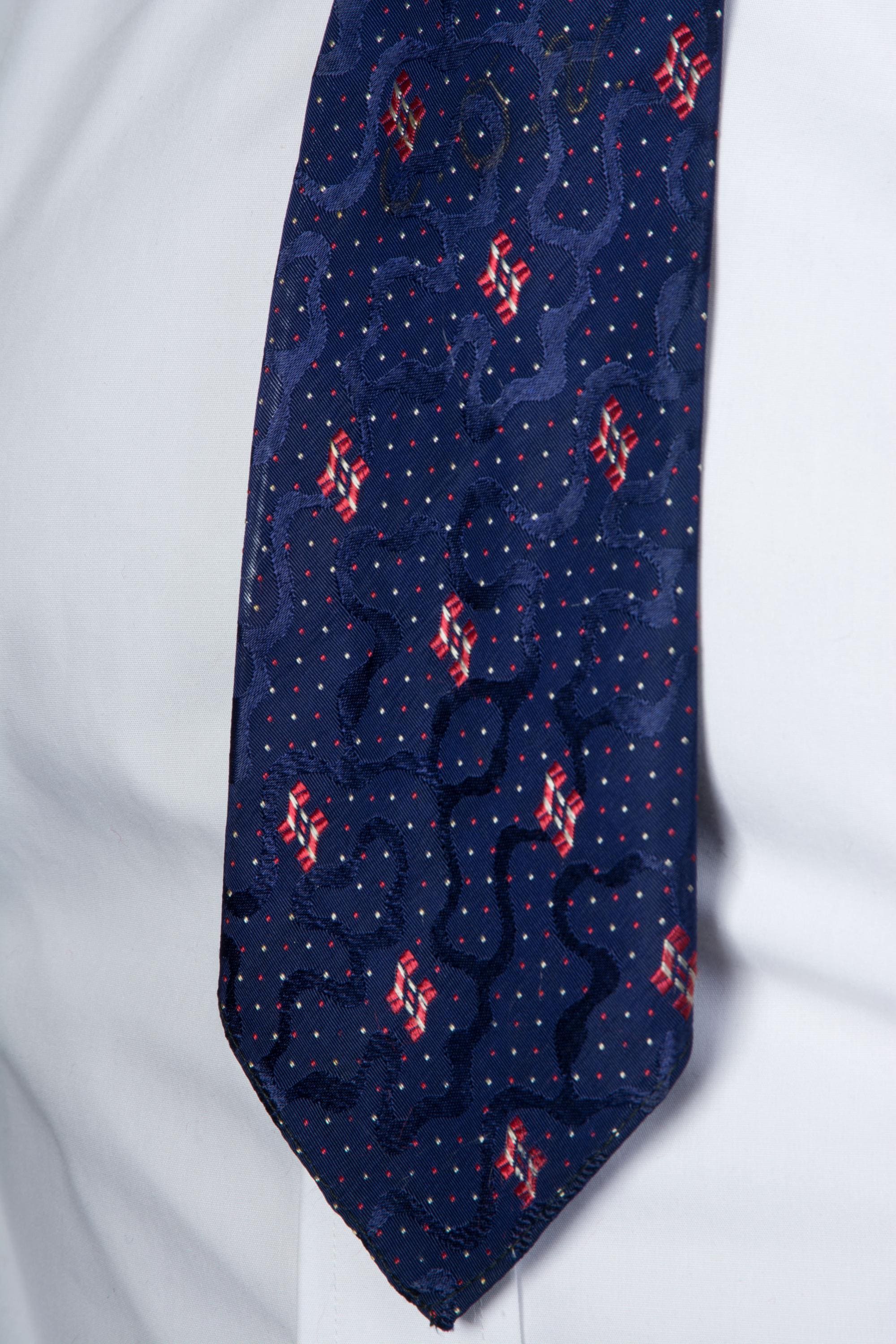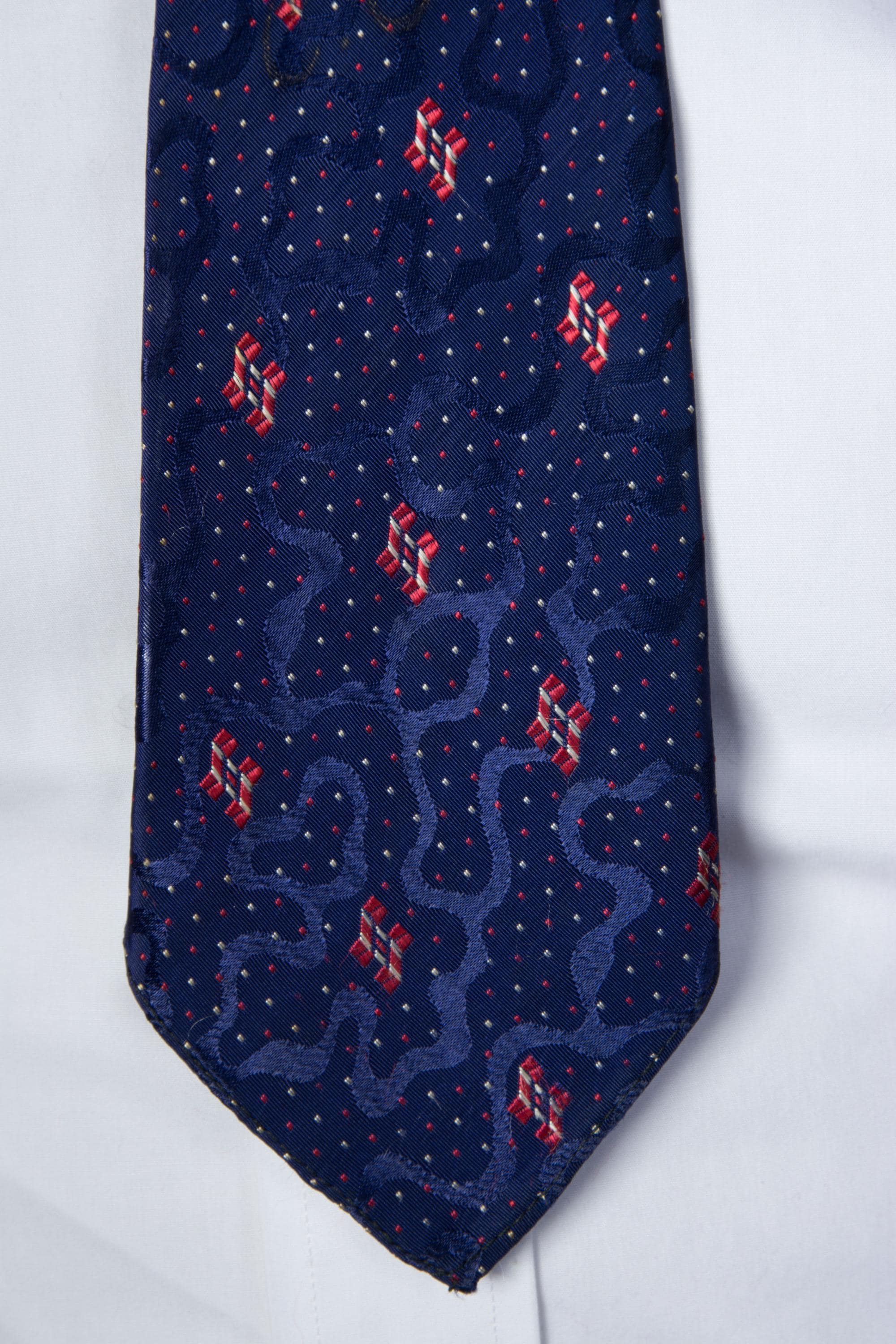 An excellent 1920s brocade tie, lustrous and textural. This features three different distinctive elementsin in the weave - lustrous blue jacquard swirls, that are shaped like waterways. Red and white accents that read like flags, and tiny red and white scattered dots - I love seeing this exposed on the reverse. Bias cut, this is unlined and makes a really fine knot.