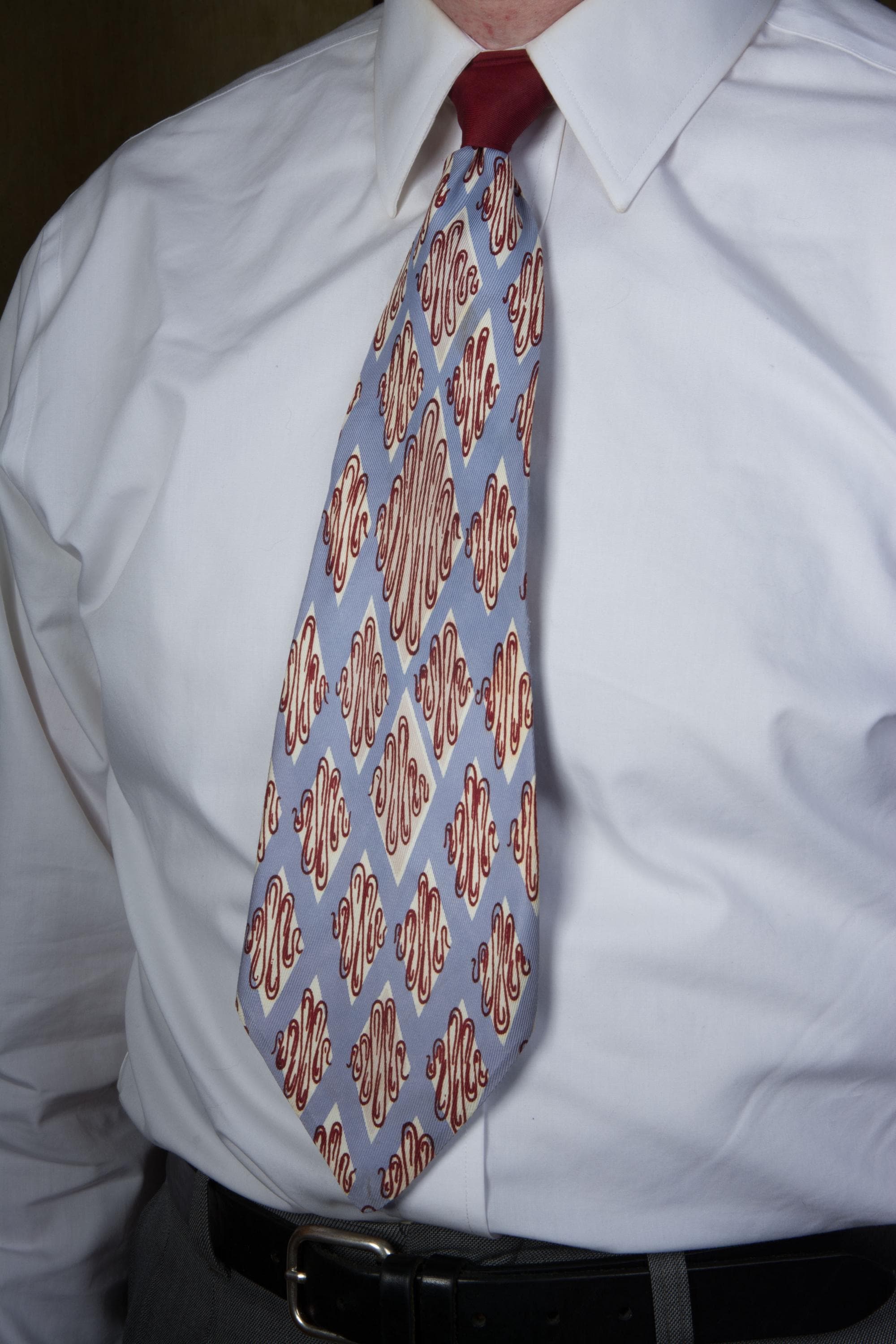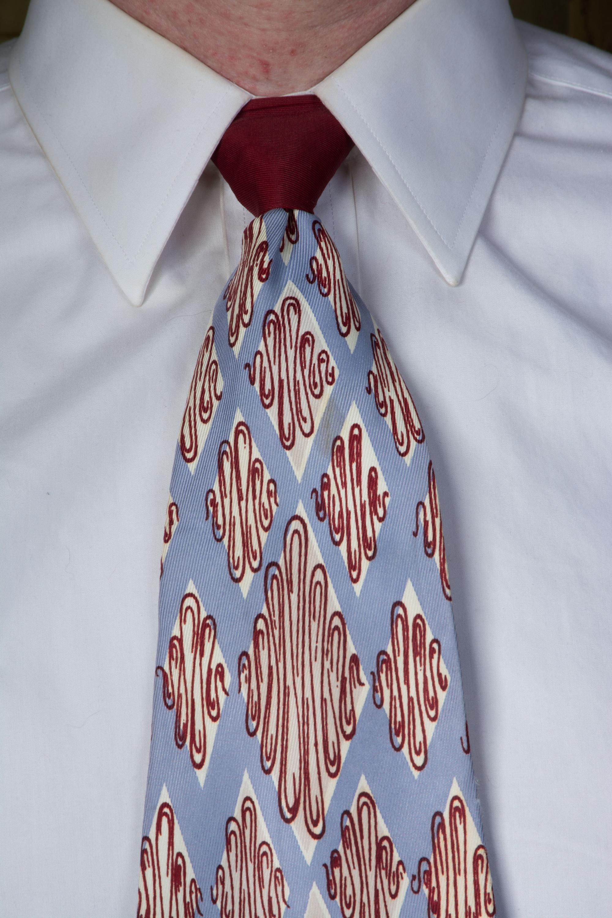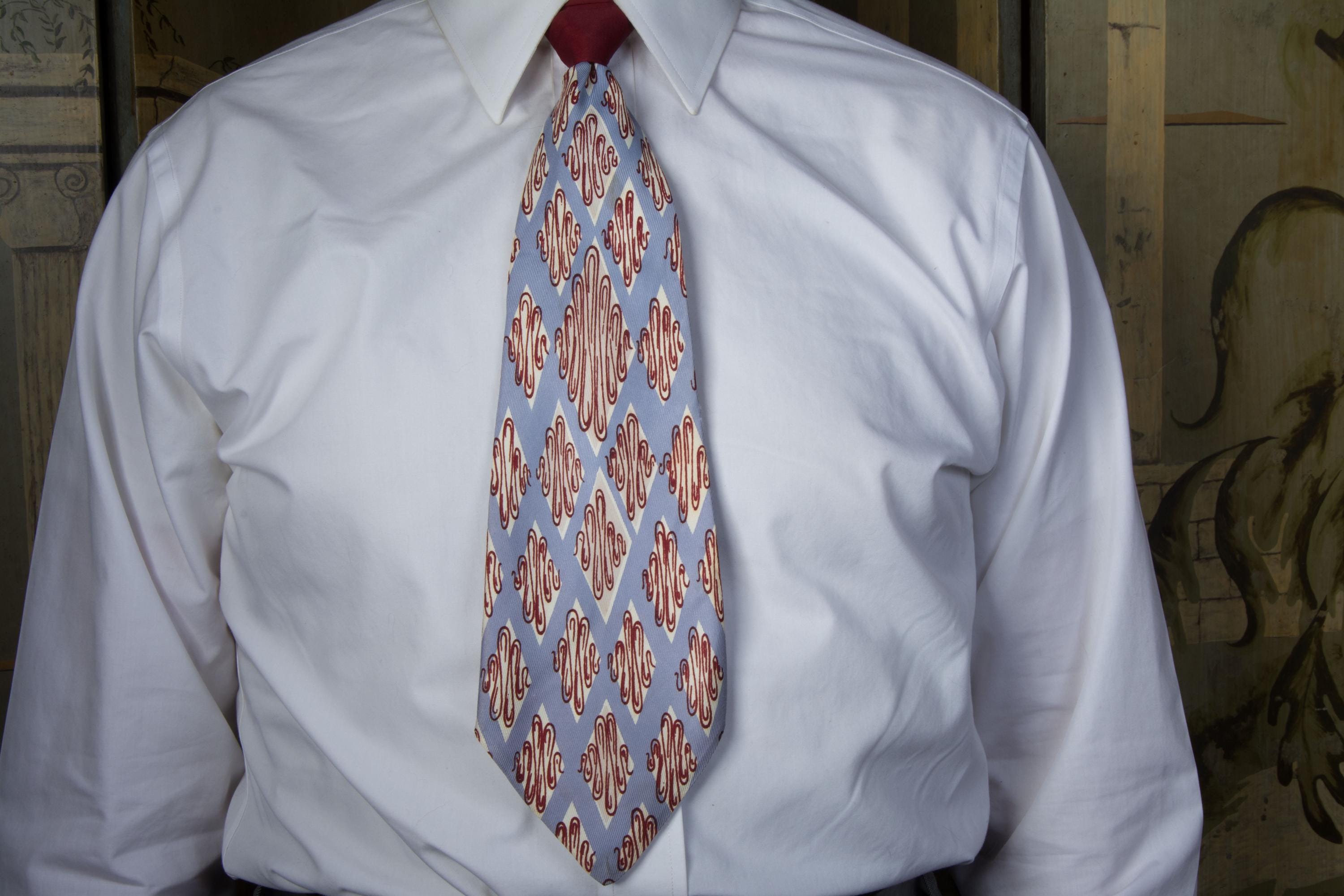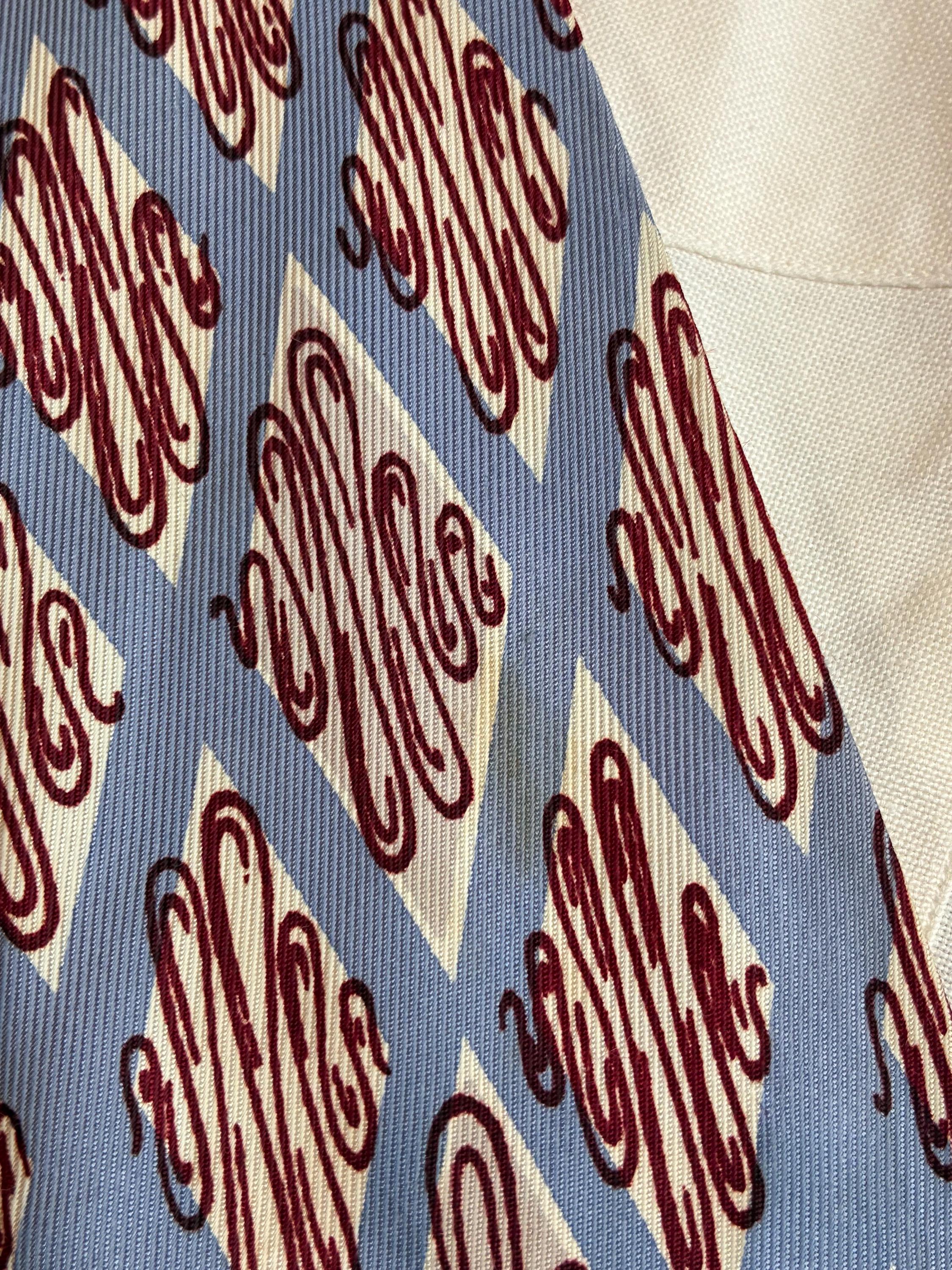 A really fun 1940s tie with a busy repeat! This features one of my favorite details, the contrast knot. The knot and tail are a bricky burgundy red, while the blade is medium blue with white diamonds filled with burgundy squiggles. This is fully lined.
