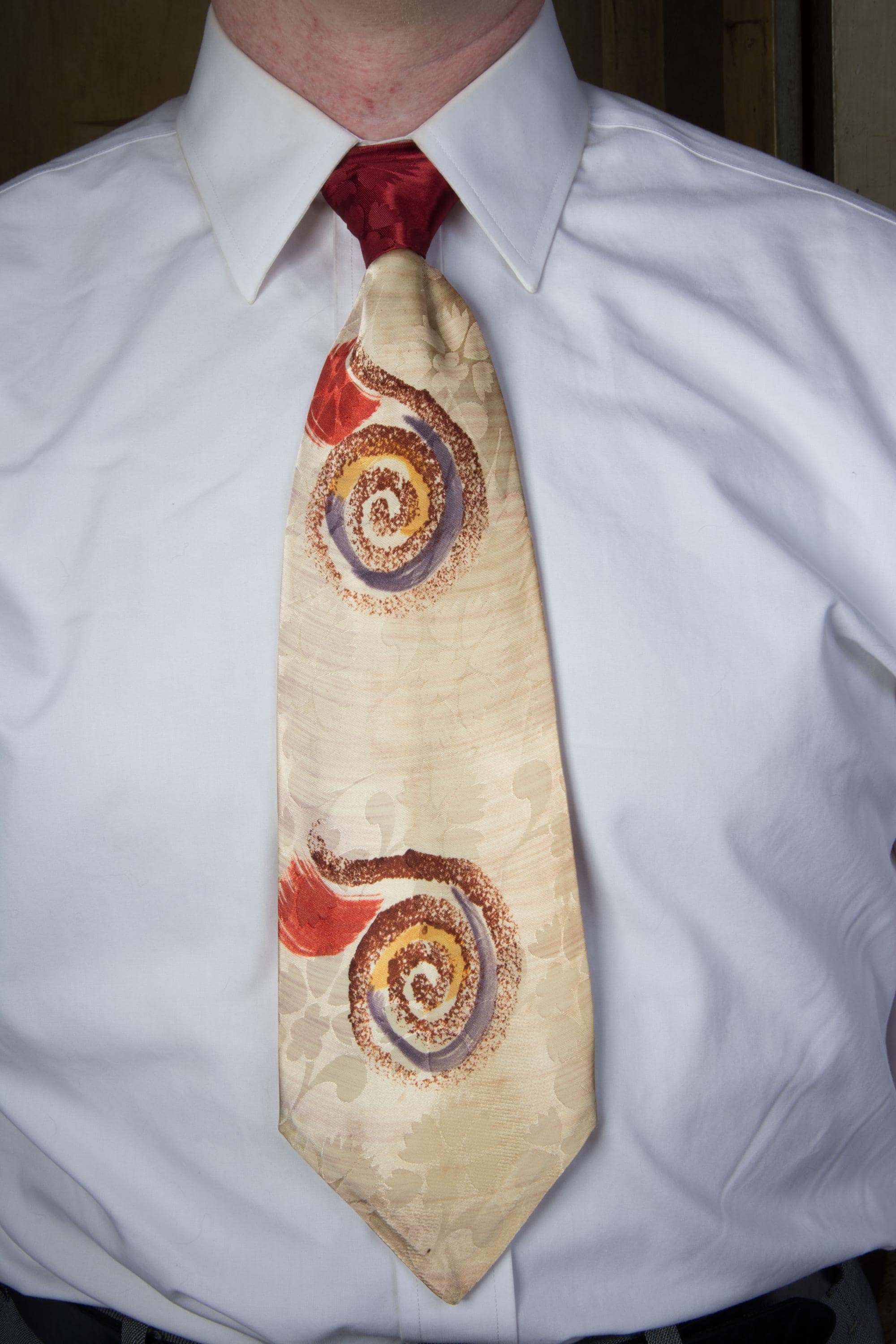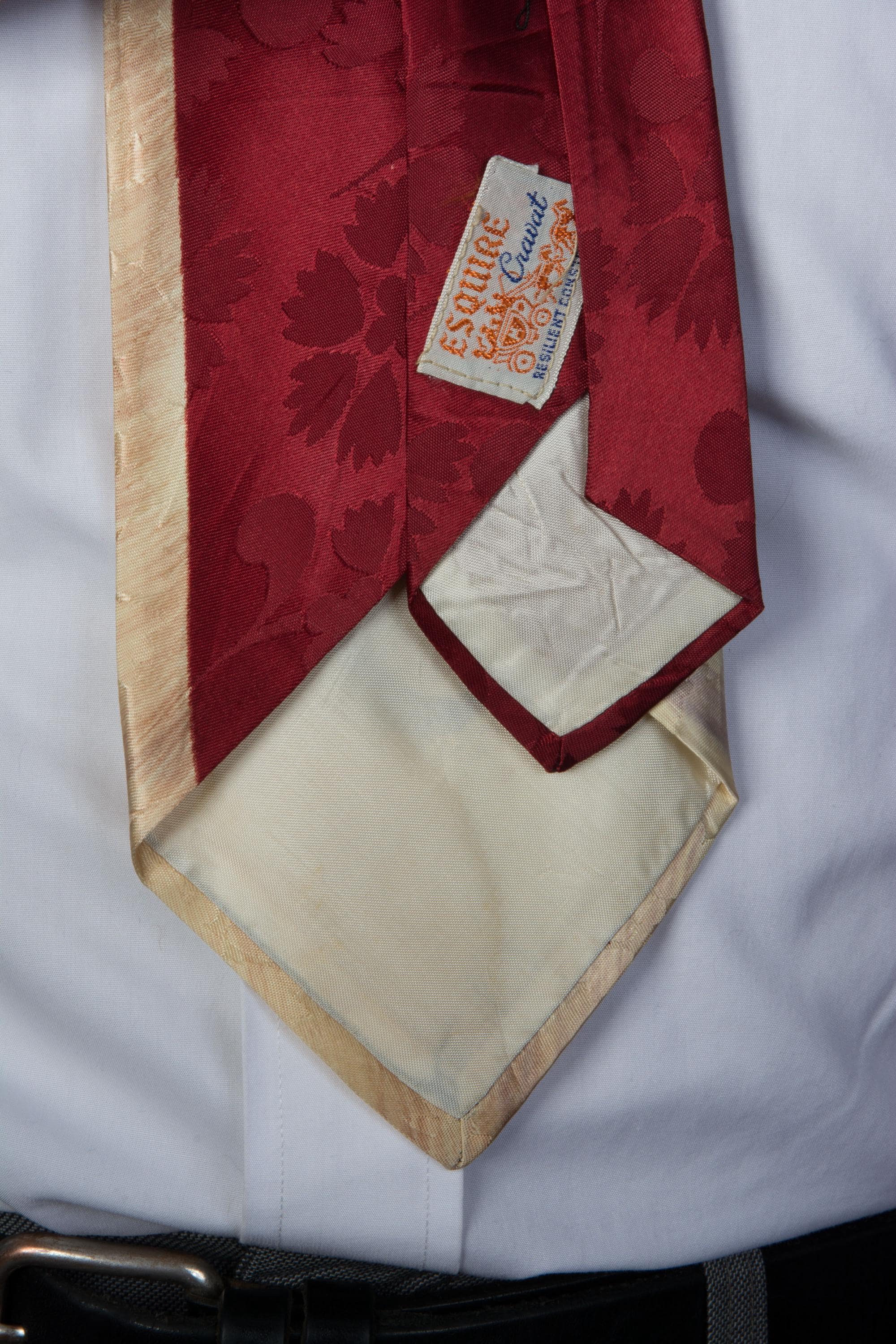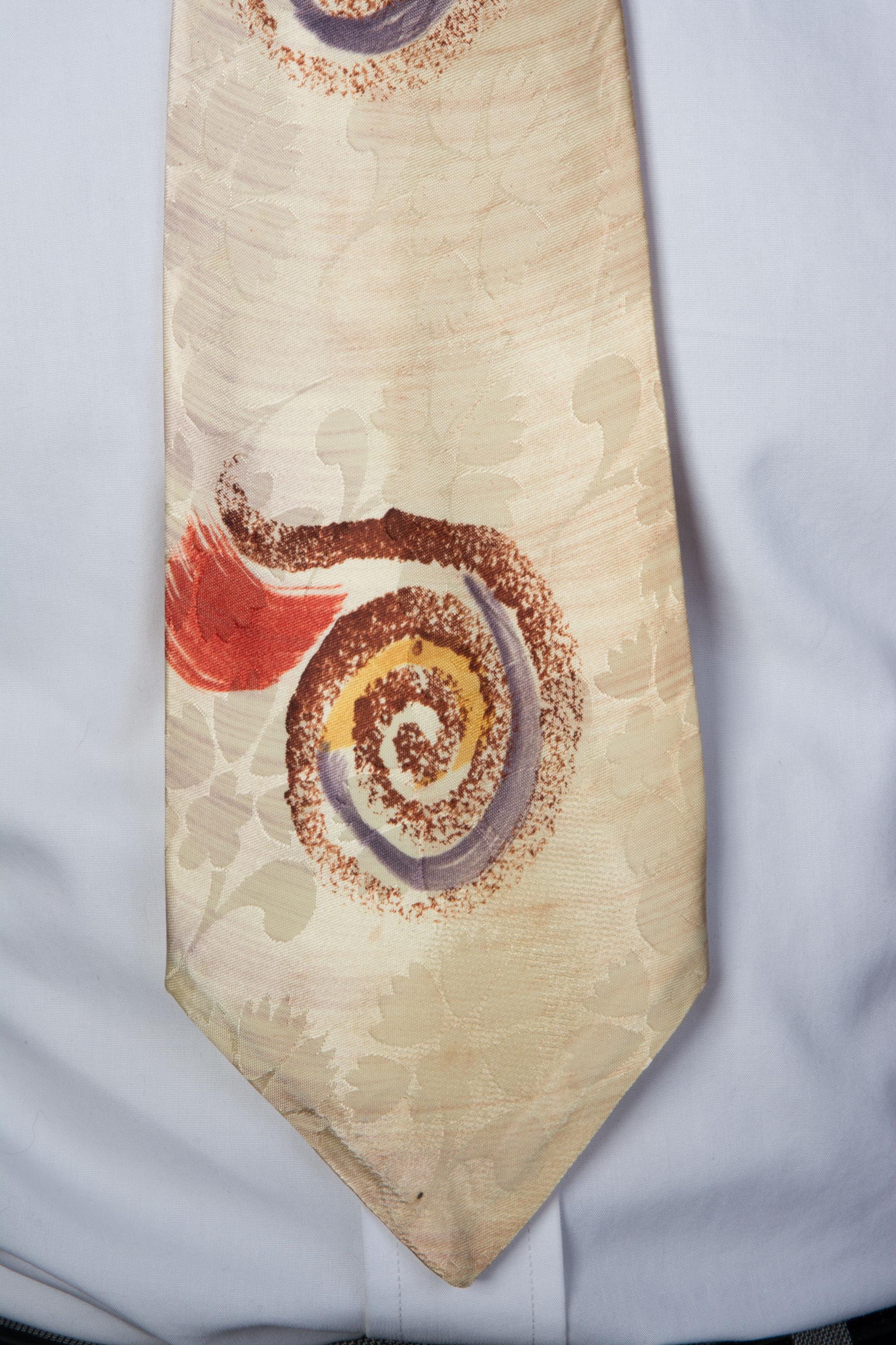 A unique and glossy vintage 1940s tie, this features on of my favorite details - the contrast knot. THe black is a soft beige with two printed brown nautilus spirals printed on a floral brocade. Bold paint fills the swirls, and much faint paint gives some body to the background, including a speckled spray below the knot. This is fully lined.
