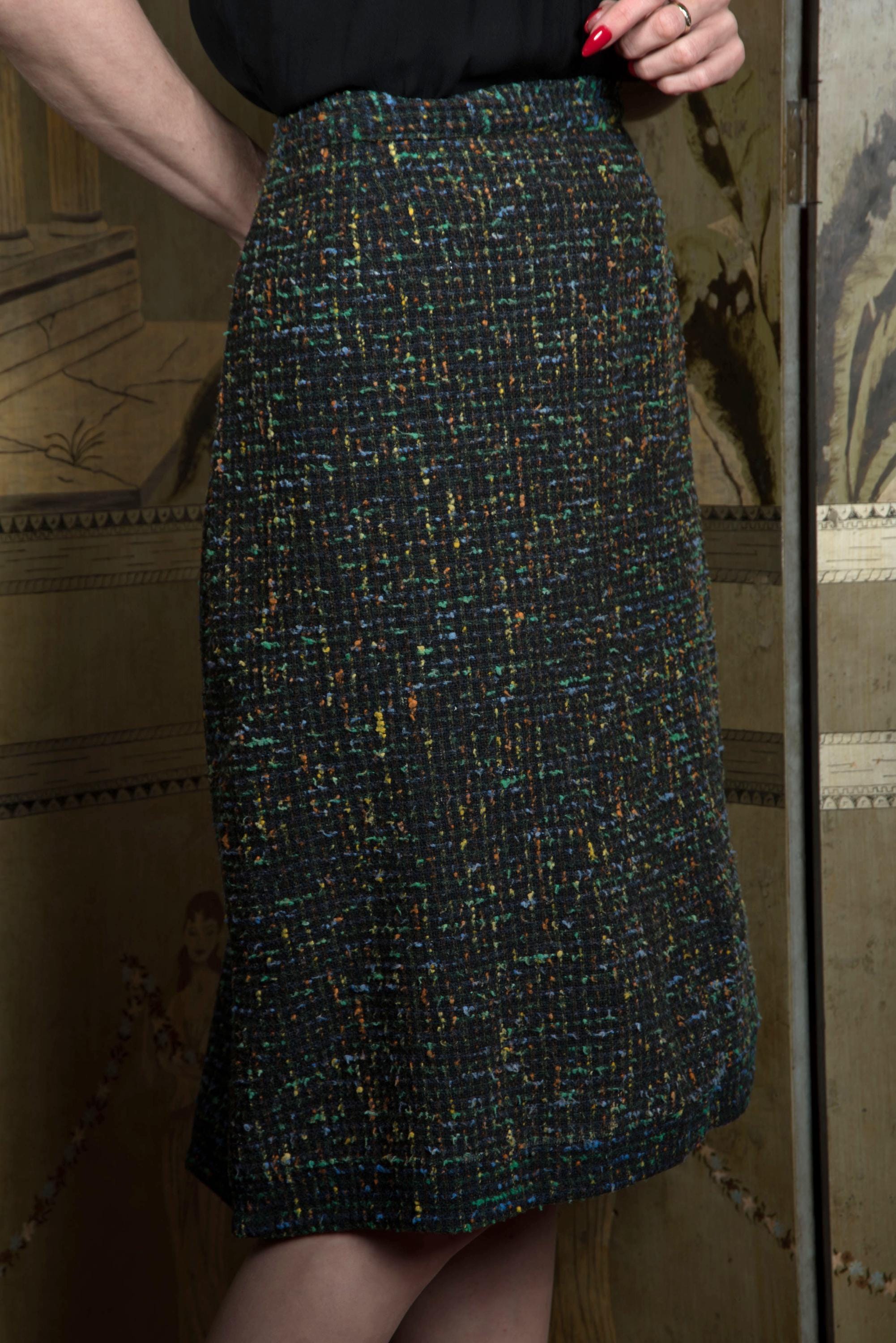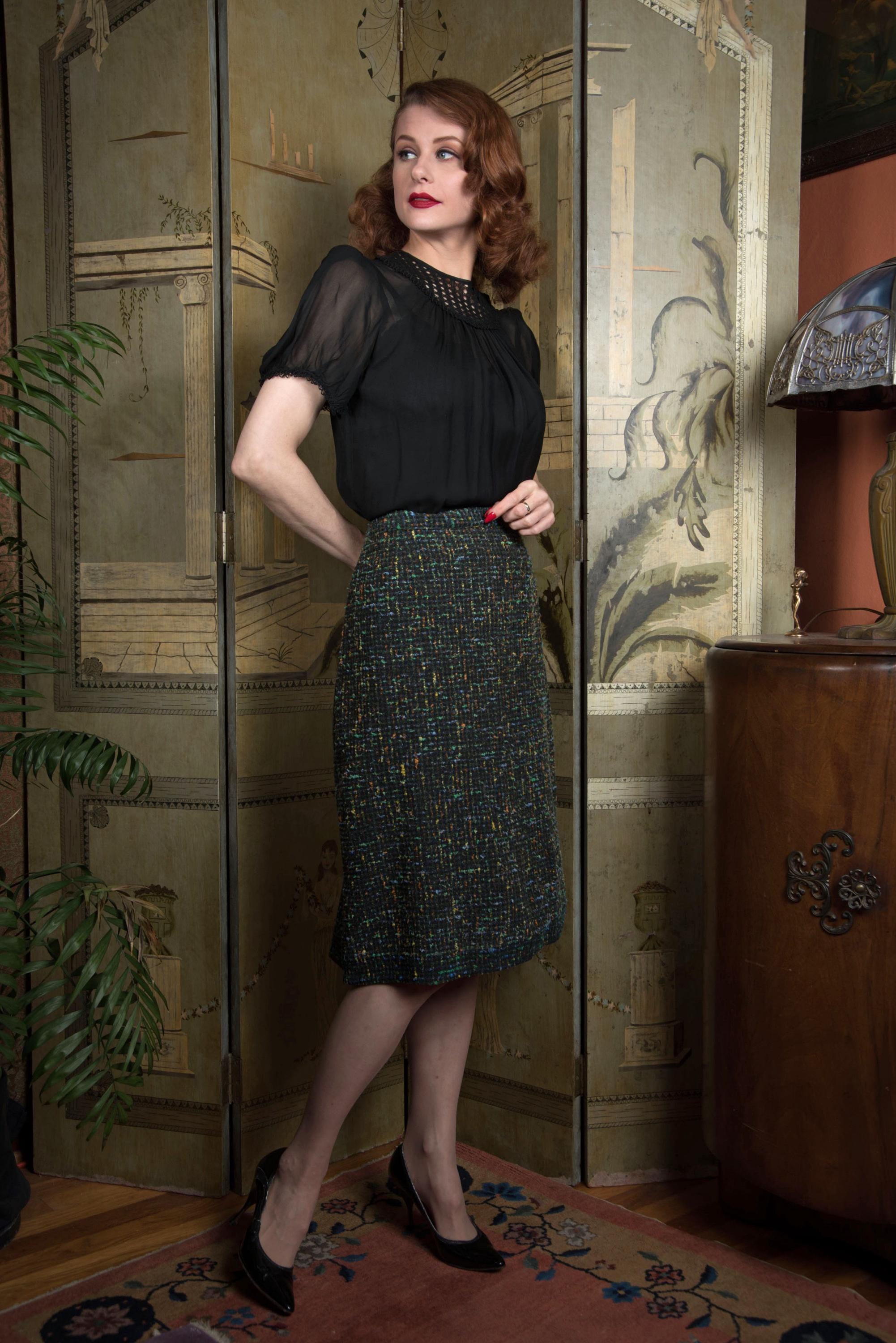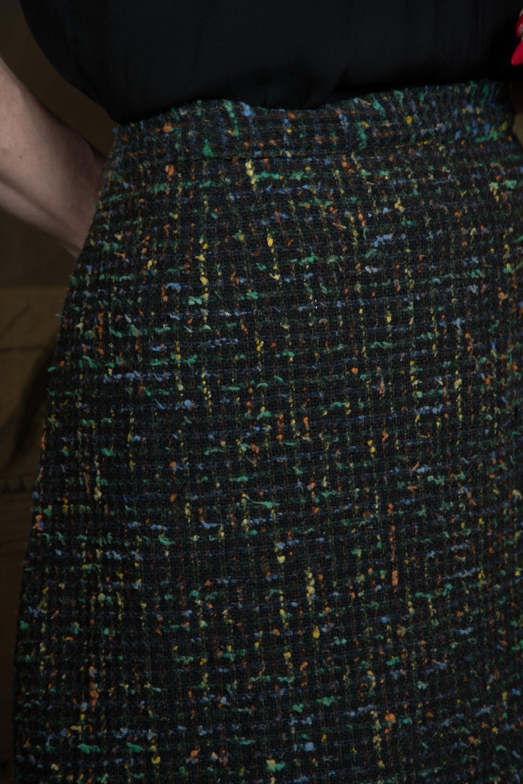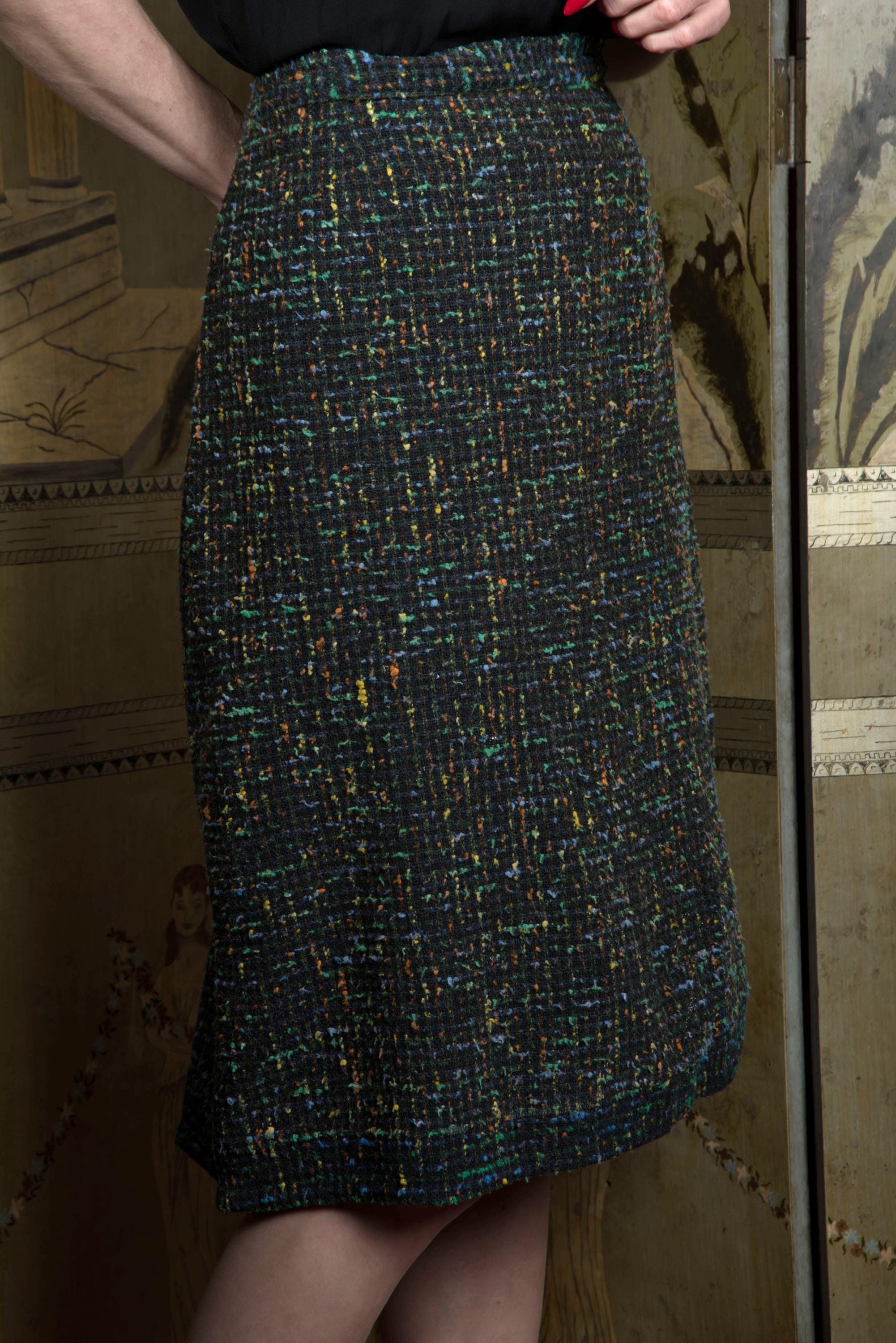A classic late 1950s or early 60s straight skirt. Right off the bat, one of the first things you'll notice in the photos is this faded over time and them someone let the hem out! Don't worry, you can just take it up again and no one will know. The ground is now heathered charcoat, with slubs of tangerine and jade green, cornflower blue and yellow. The cut is straight, but the kick pleat at back has FOUR pleats instead of the standard two, so you can walk at a good clip. Closes on the side with a sturdy metal zipper and a button on the waist. Perfect for your favorite little sweater.