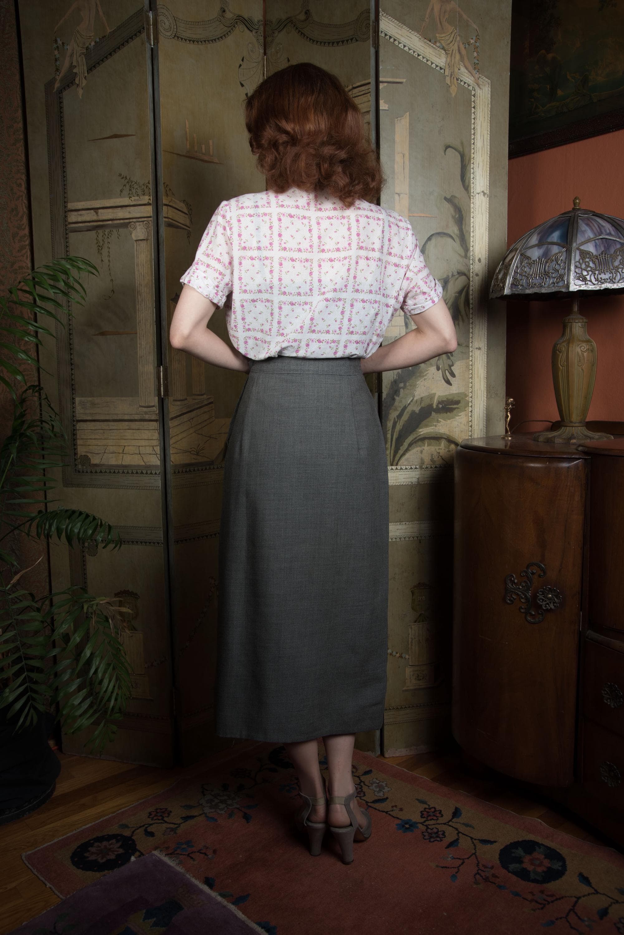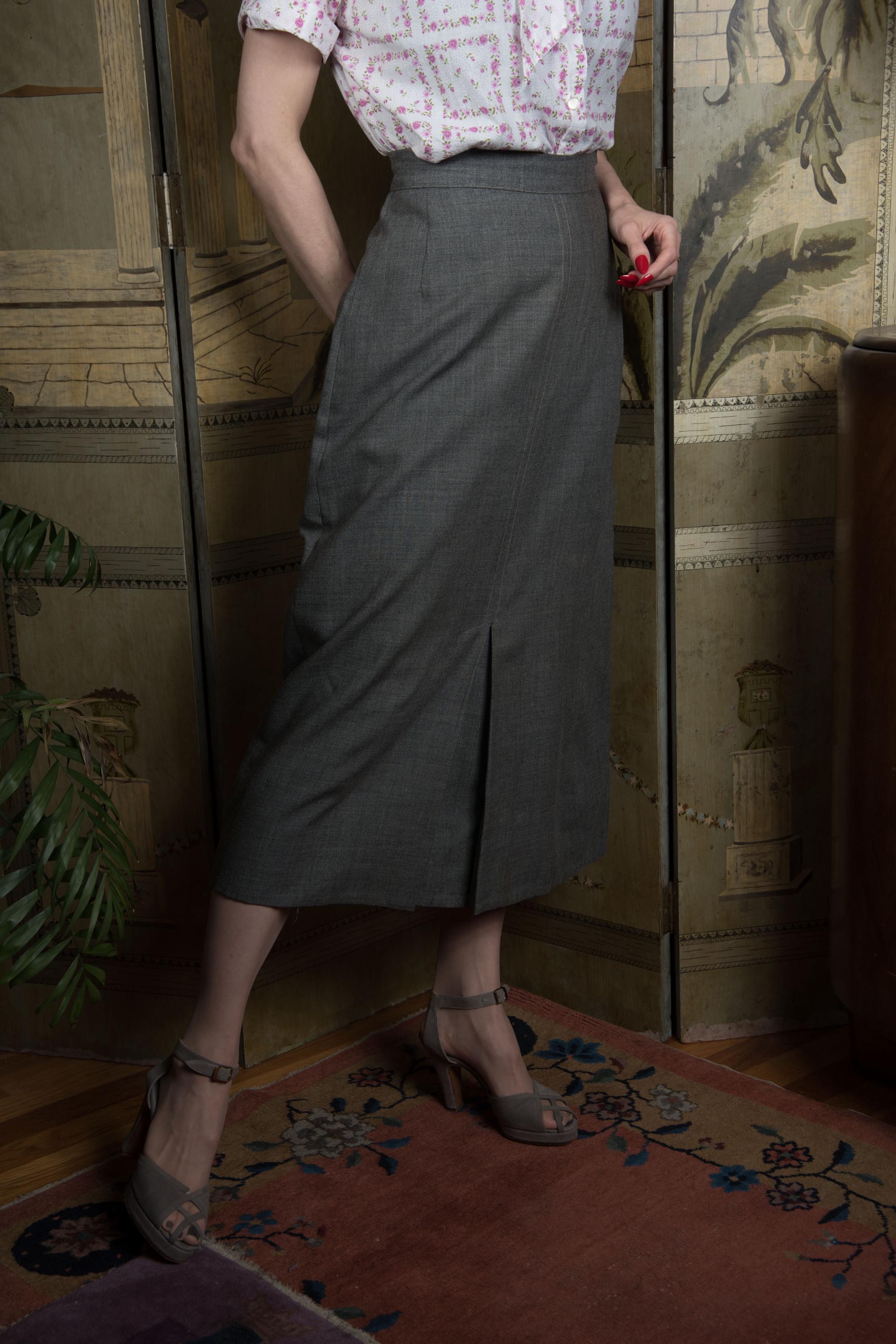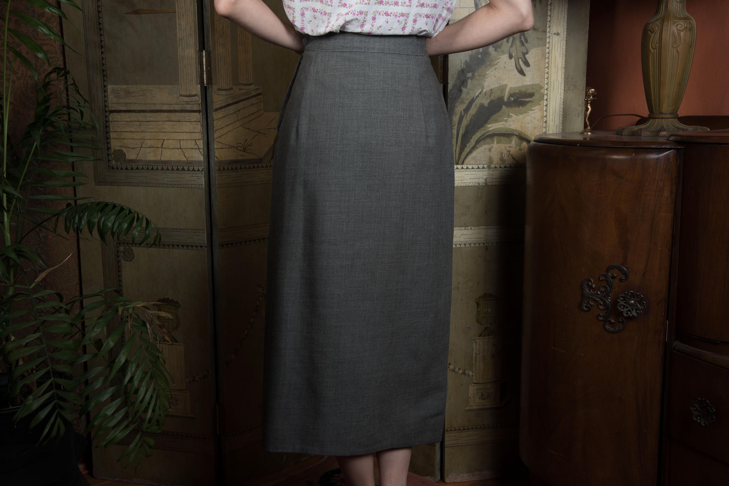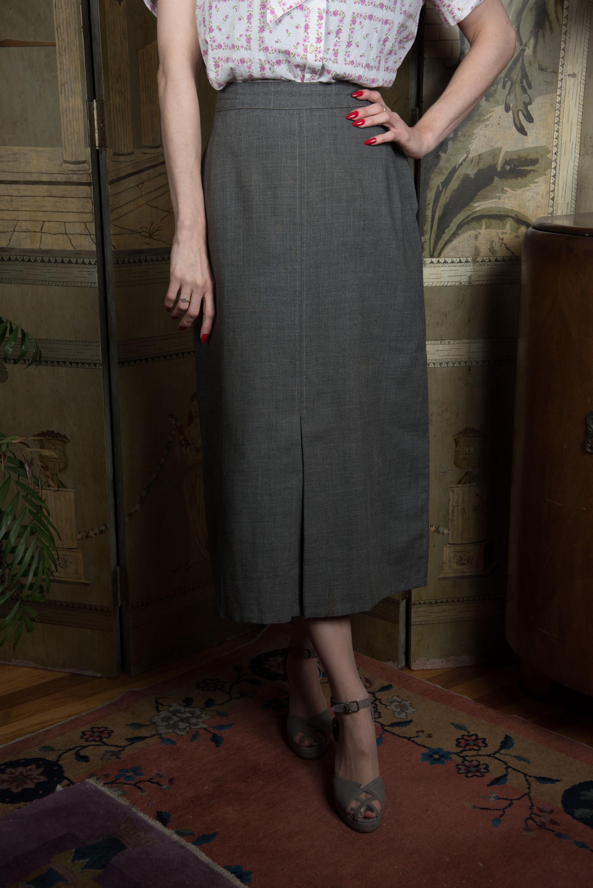 Here's something great about this skirt - it's NOT a skirt parted from a suit, but rather sold separately by high end Vancouver based shop James Chambers in the mid 1950s. A very fine, crisp worsted wool in heathered pewter grey, it's an exceptionally crisp fine "worsted wool flannel' that apparently was a shop signature. This features what they describe as a "knife pleat" at center front - long enough to allow movement, long and sharp as a stiletto when closed. Very much that early 50s New Look years vibe, excellent with blouses and tailored jackets. This closes on the side with a sturdy Flash brand metal zipper.