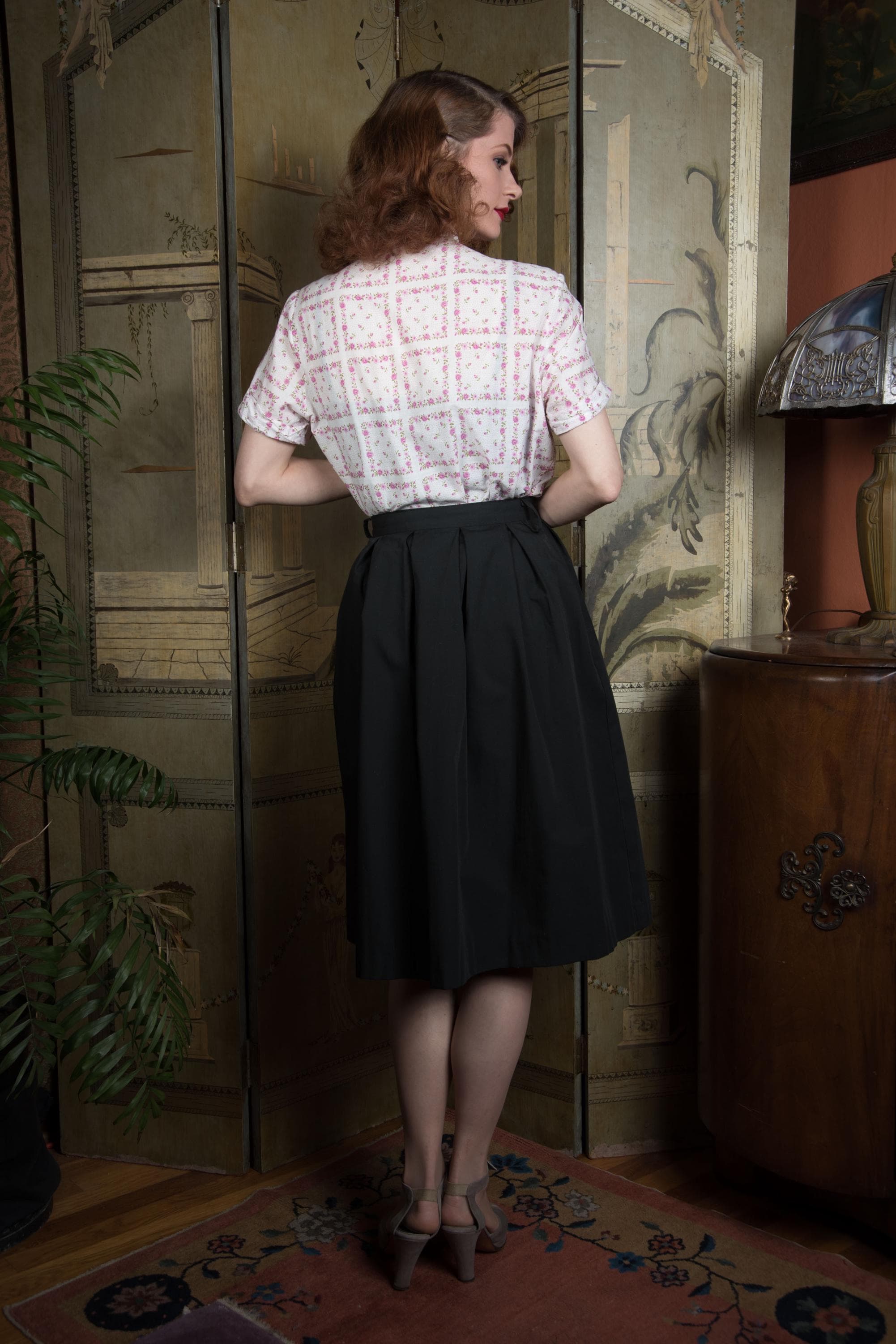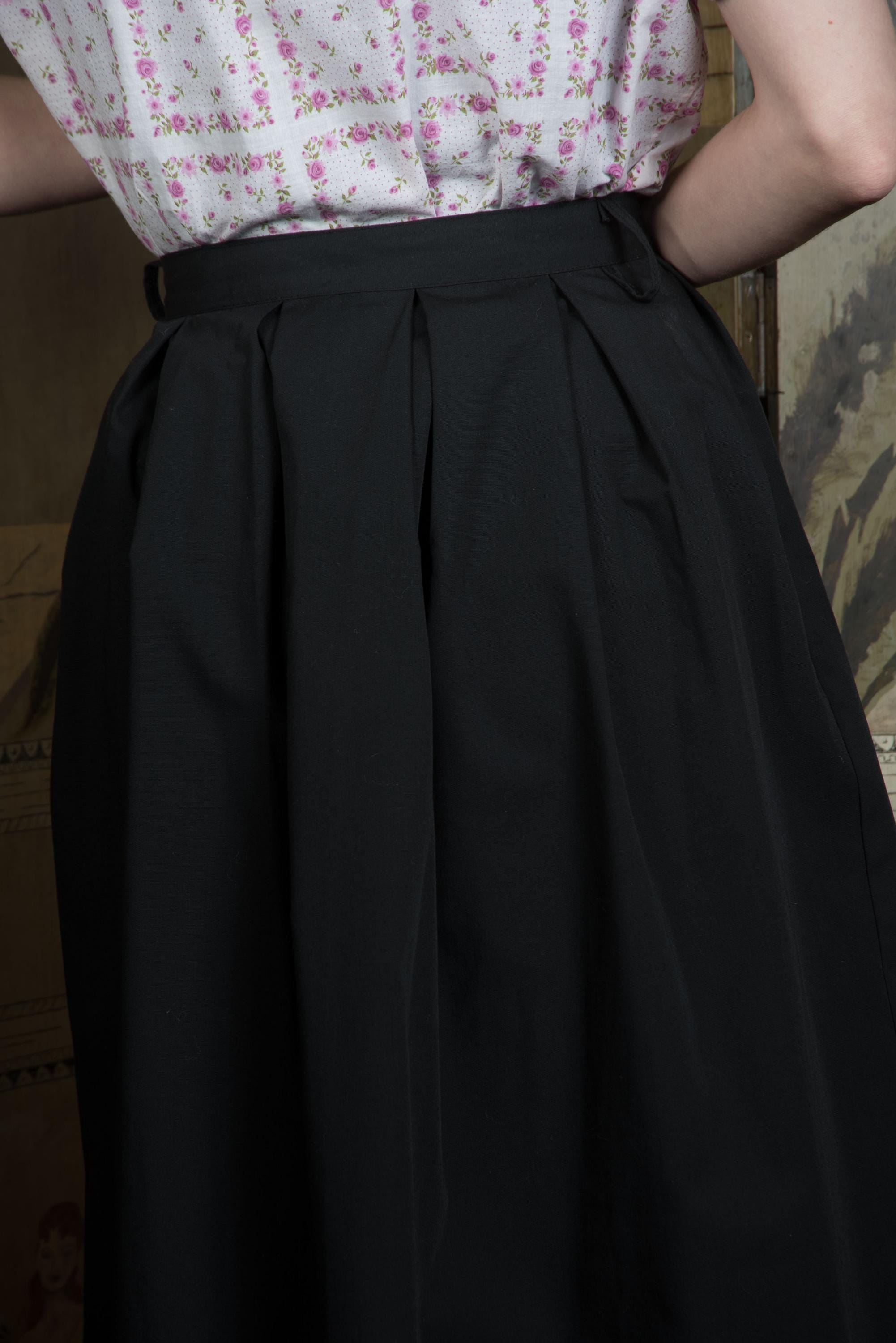 A classic 1950s goes-with-everything basic black sportswear skirt! This cuties is crisp as can be in hardy cotton or cotton blend, with box pleats for a touch of fullness and the cutest tab accents with white buttons. Sweaters, blouses, or a summery halter all work with this versatile little babe. Closes on the side with a sturdy metal zipper, and a button on the waist.