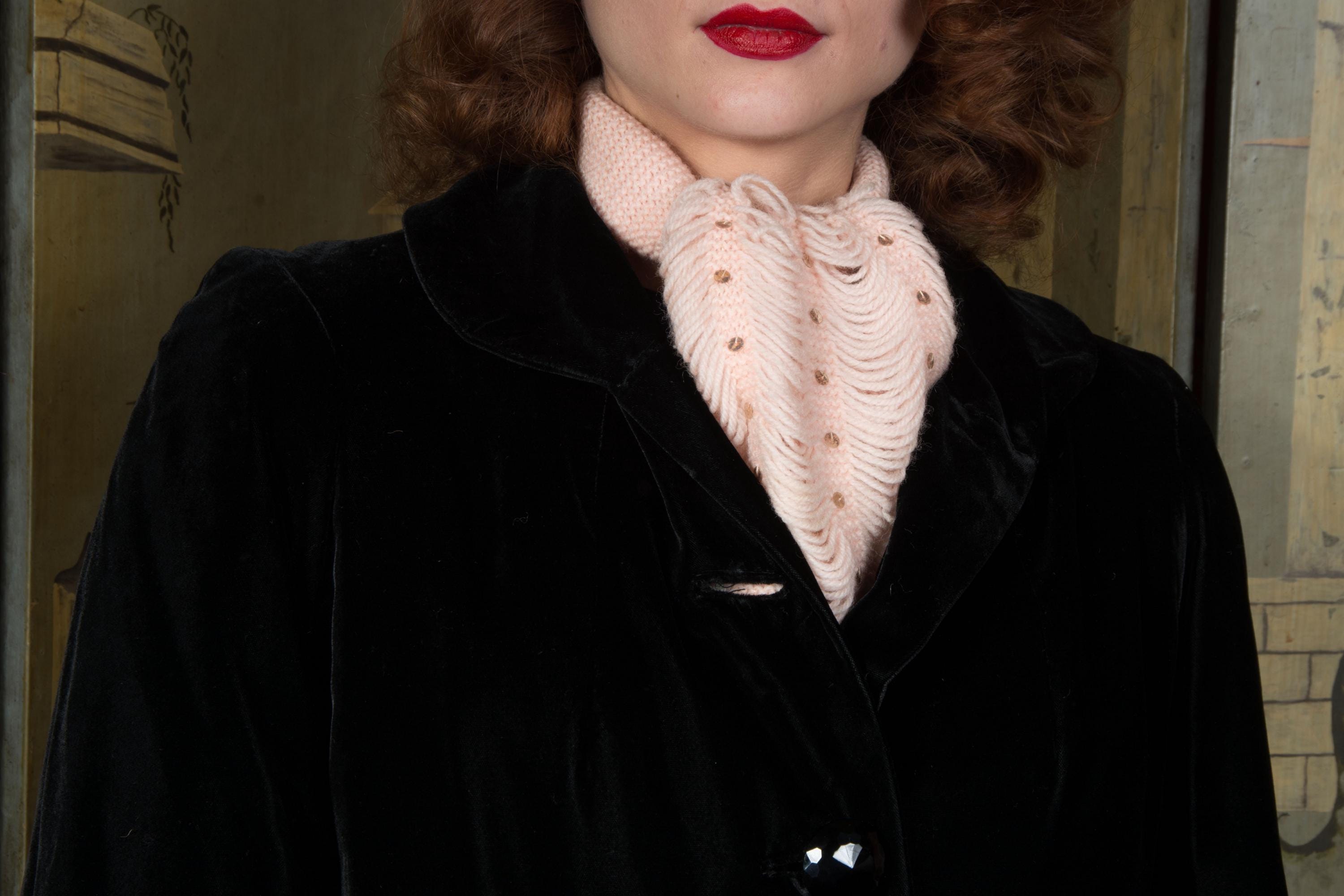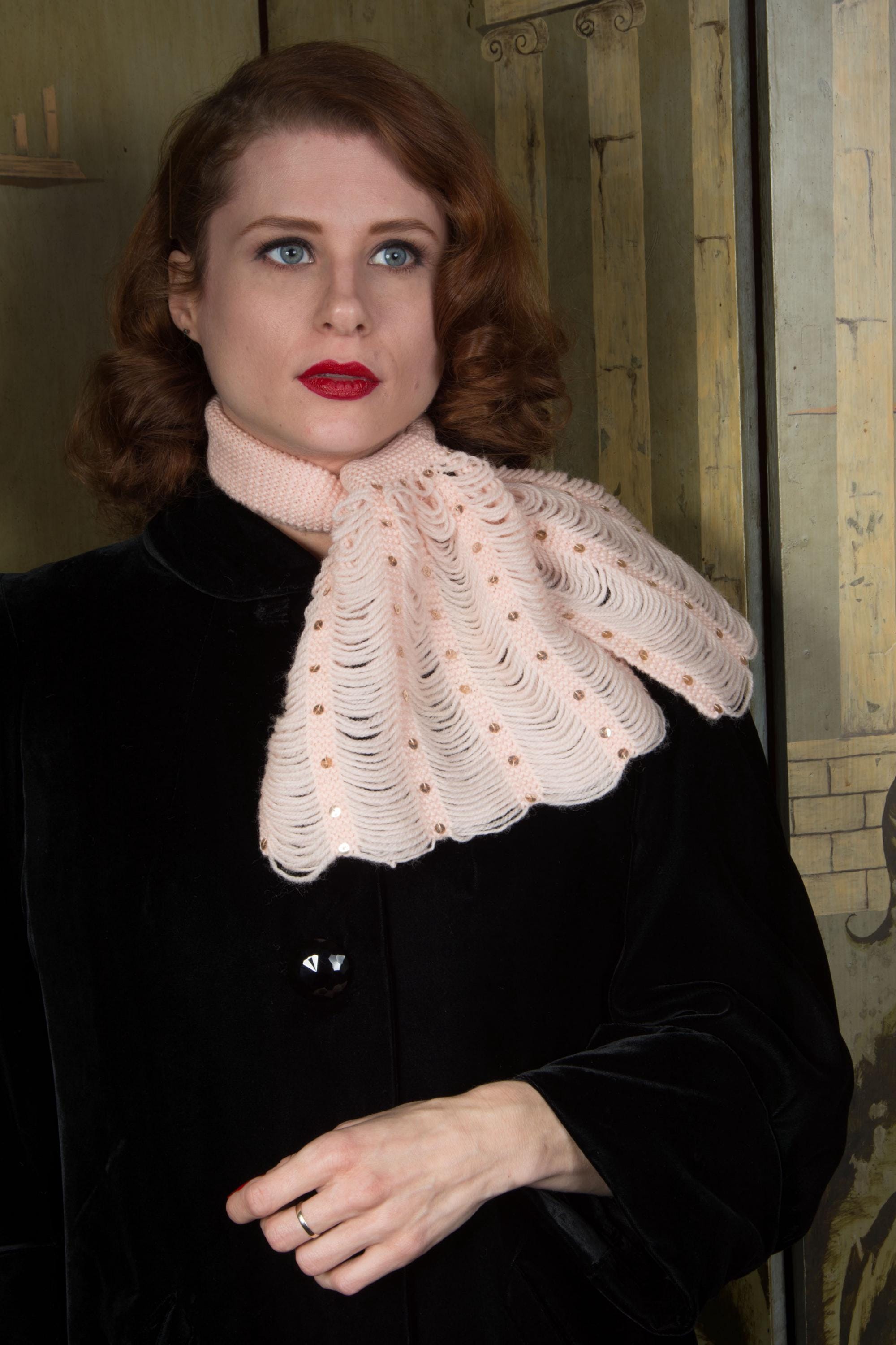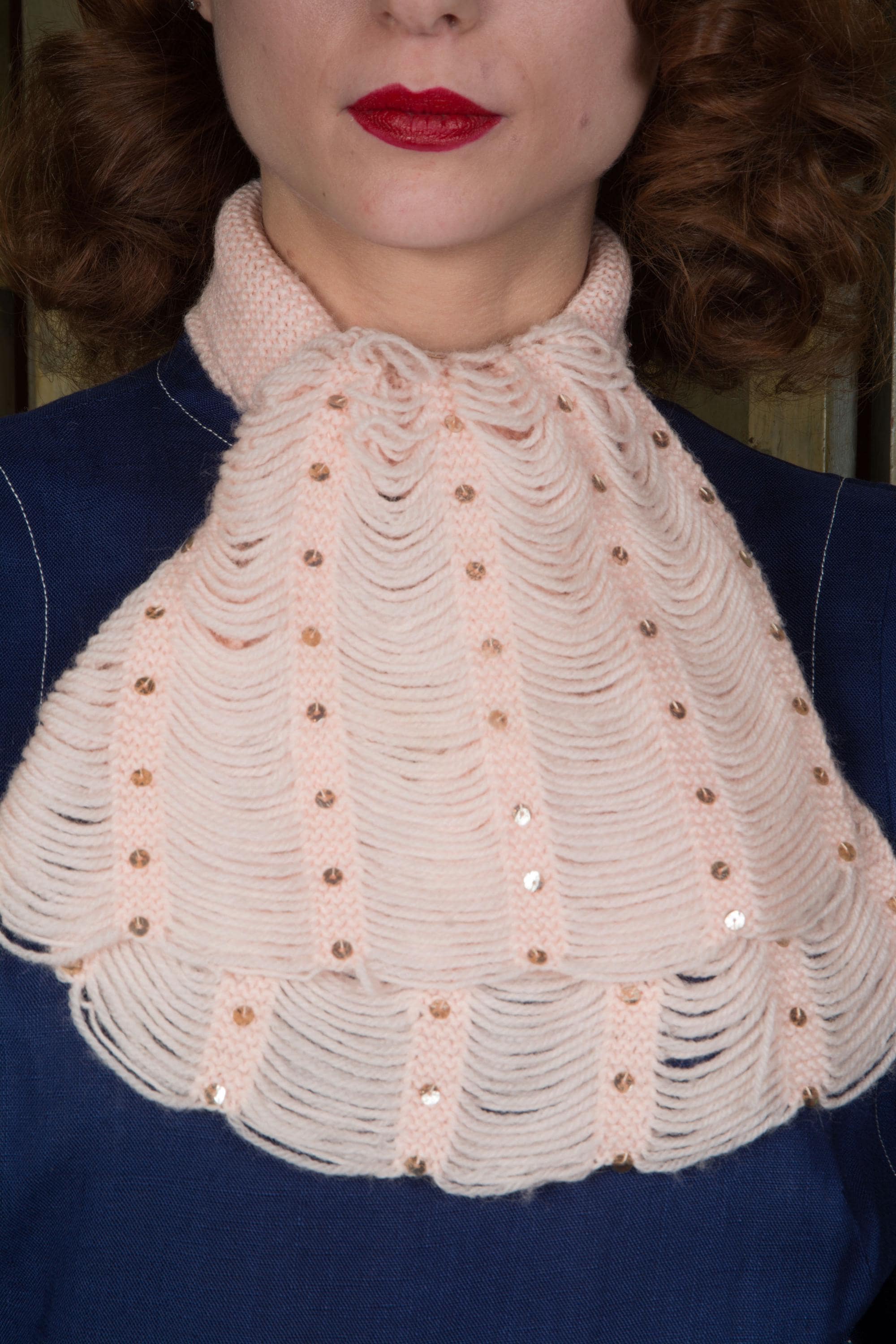 A very charming homemade 1950s jabot inspired scarf in pale pink wool yarn. The neck is made up of a 3.25" wide garter stitch knit. Each end features five scalloped columns of yarn connected by garter stitch knit bands, which are sewn with gold sequins. A really sweet little cold weather accessory.