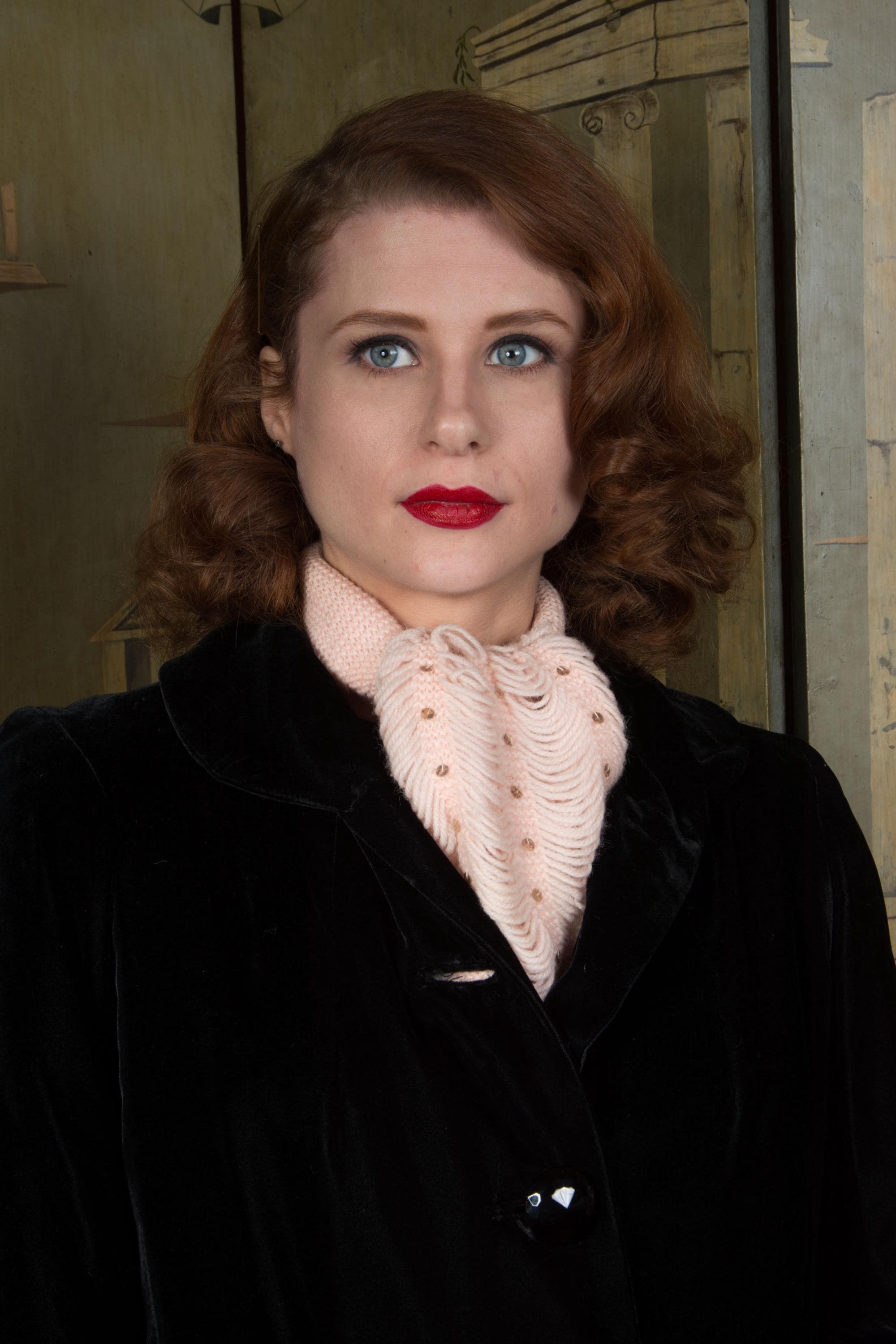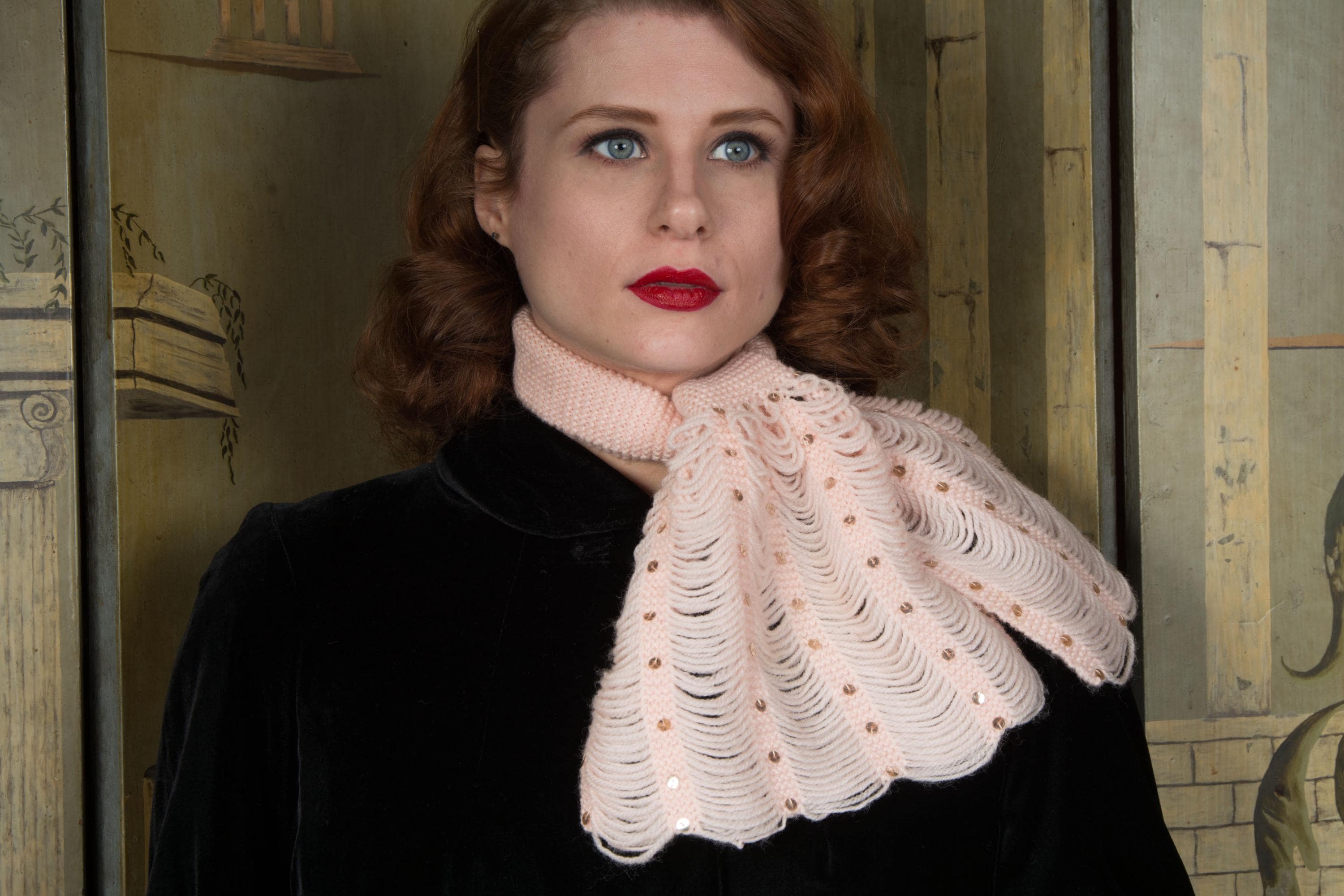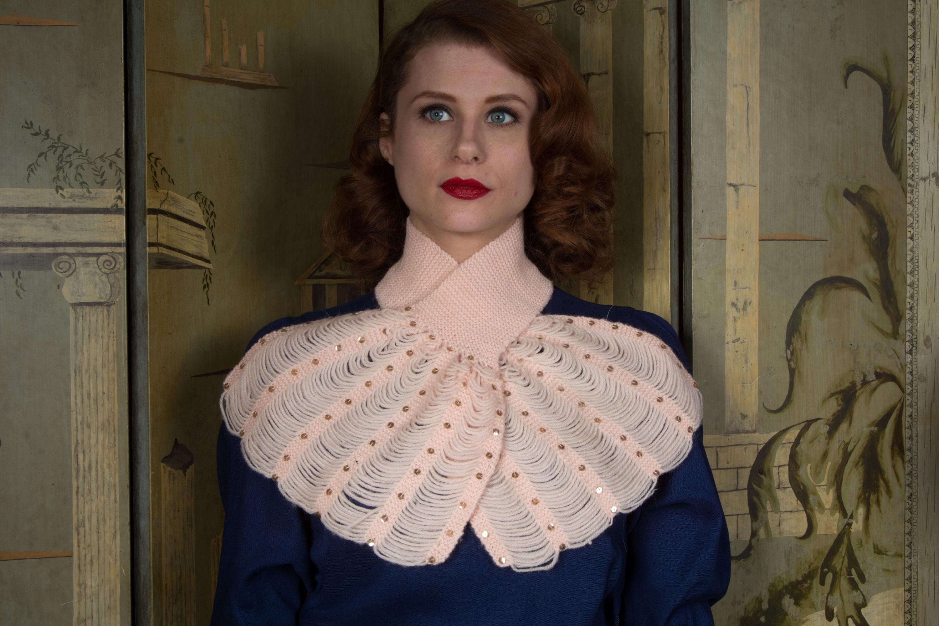 A very charming homemade 1950s jabot inspired scarf in pale pink wool yarn. The neck is made up of a 3.25" wide garter stitch knit. Each end features five scalloped columns of yarn connected by garter stitch knit bands, which are sewn with gold sequins. A really sweet little cold weather accessory.
