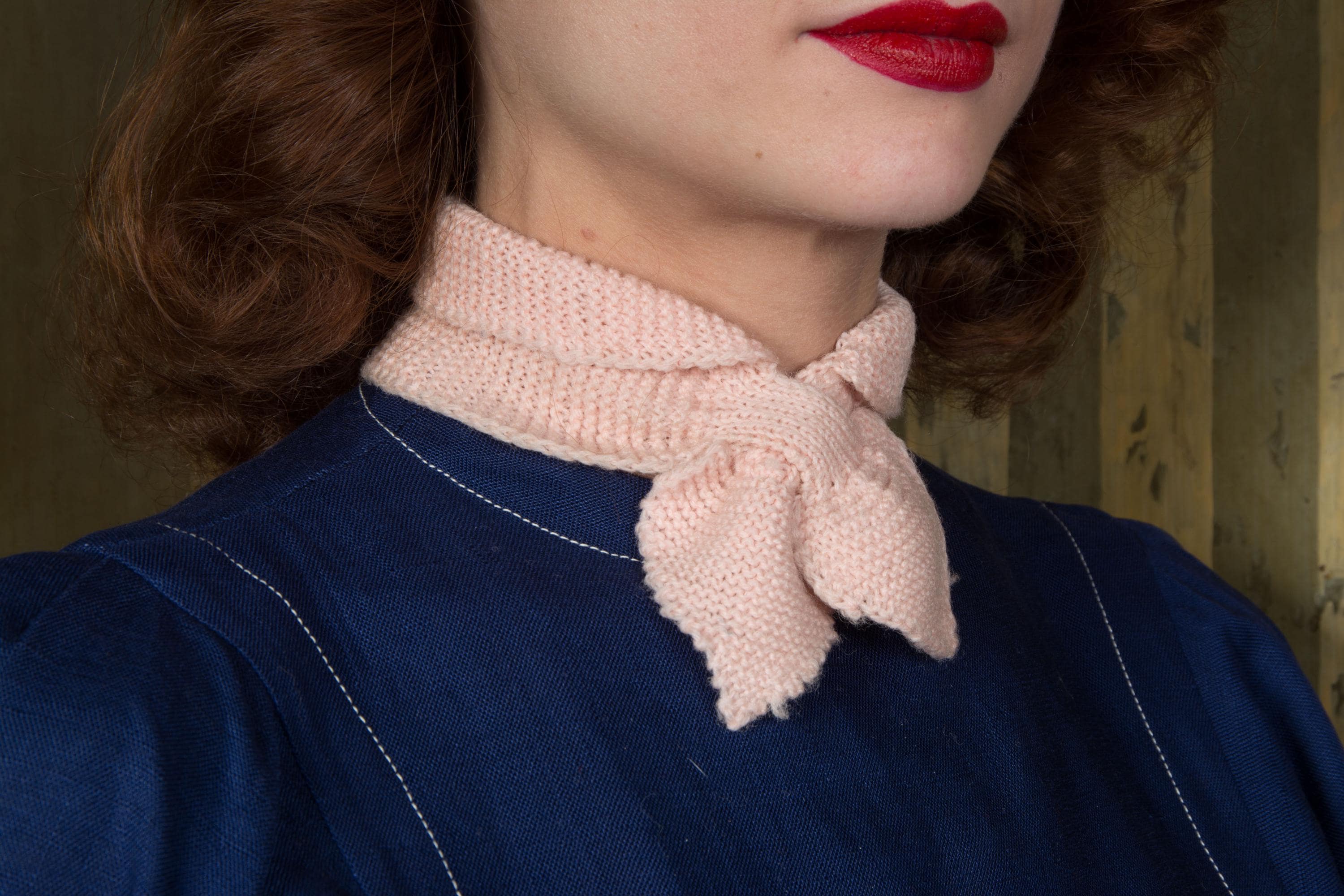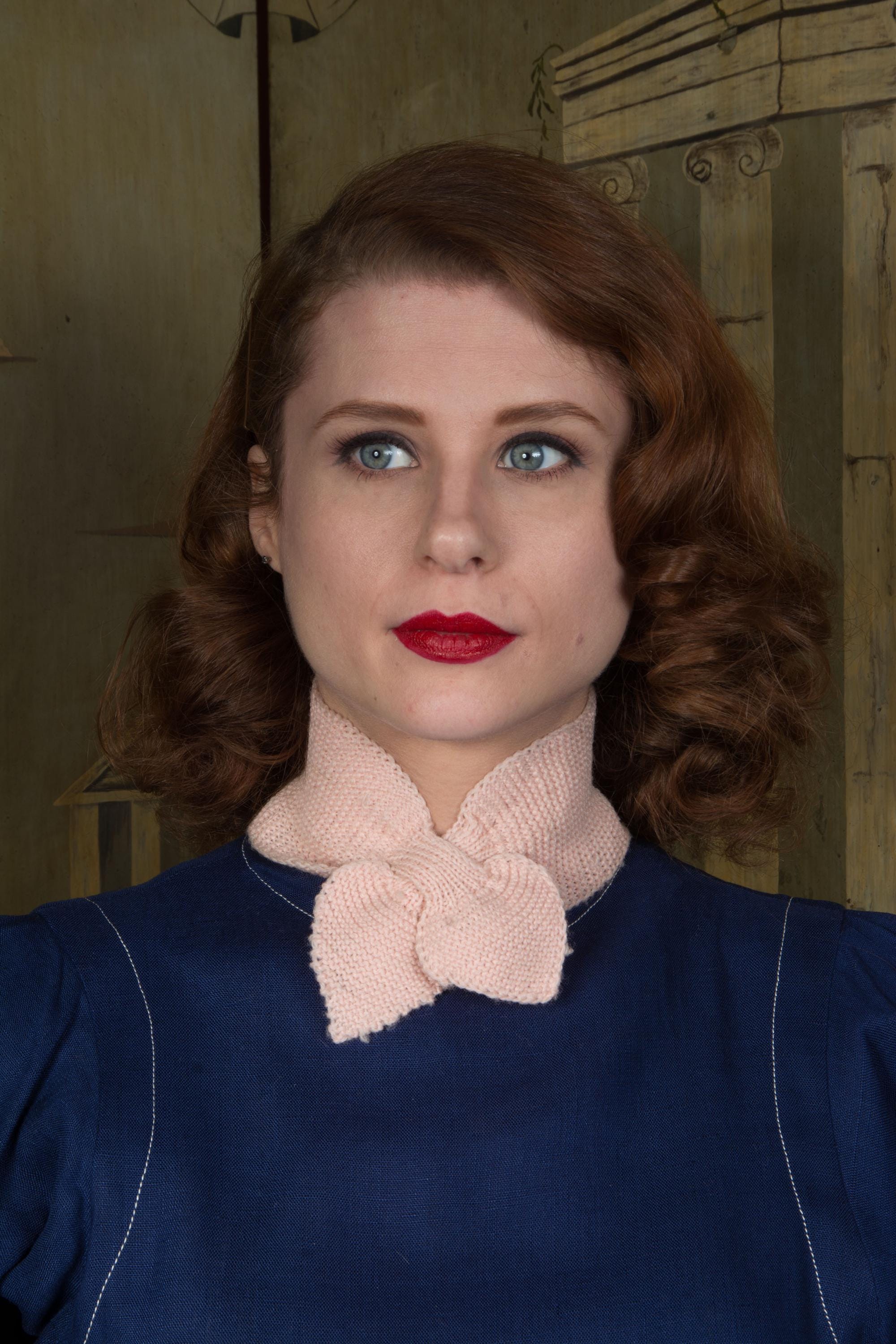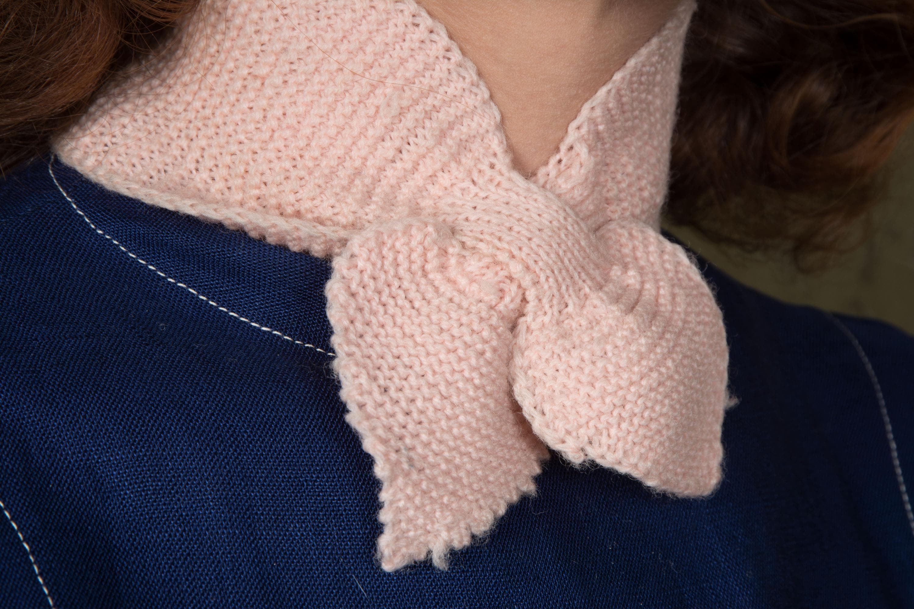 An original homemade 1950s keyhole scarf, made in pale pink wool yarn from a classic garter stitch. This style is style is still popular in patterns today, but typically marketed as baby headbands. This is not a headband, but rather a classic mid 50s accessory, a very Midge Maisel wintery touch to a favorite blouse or dress. I will be honest, I probably would have a had time dating this if it wasn't found in context with other vintage pieces, including another scarf of the same material sewn with vintage sequins (available in my shop.)