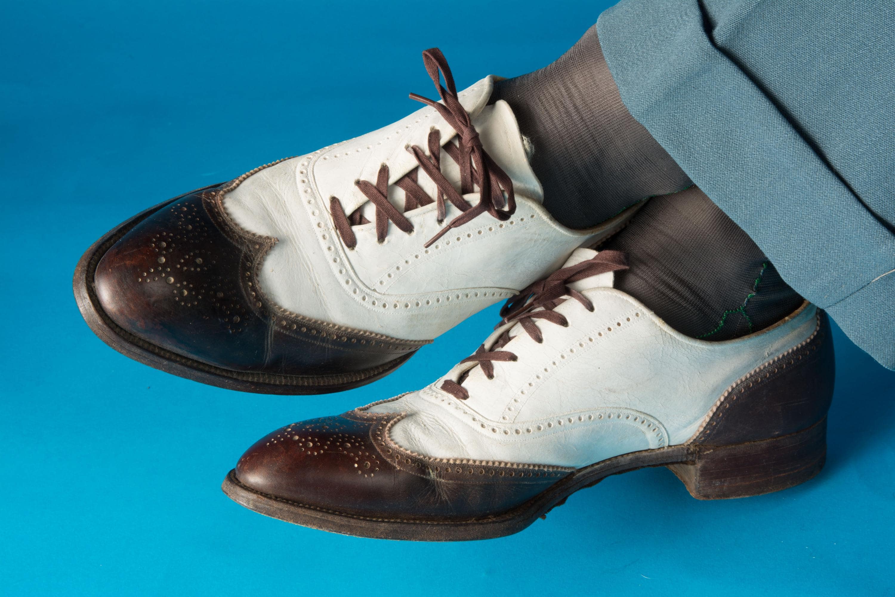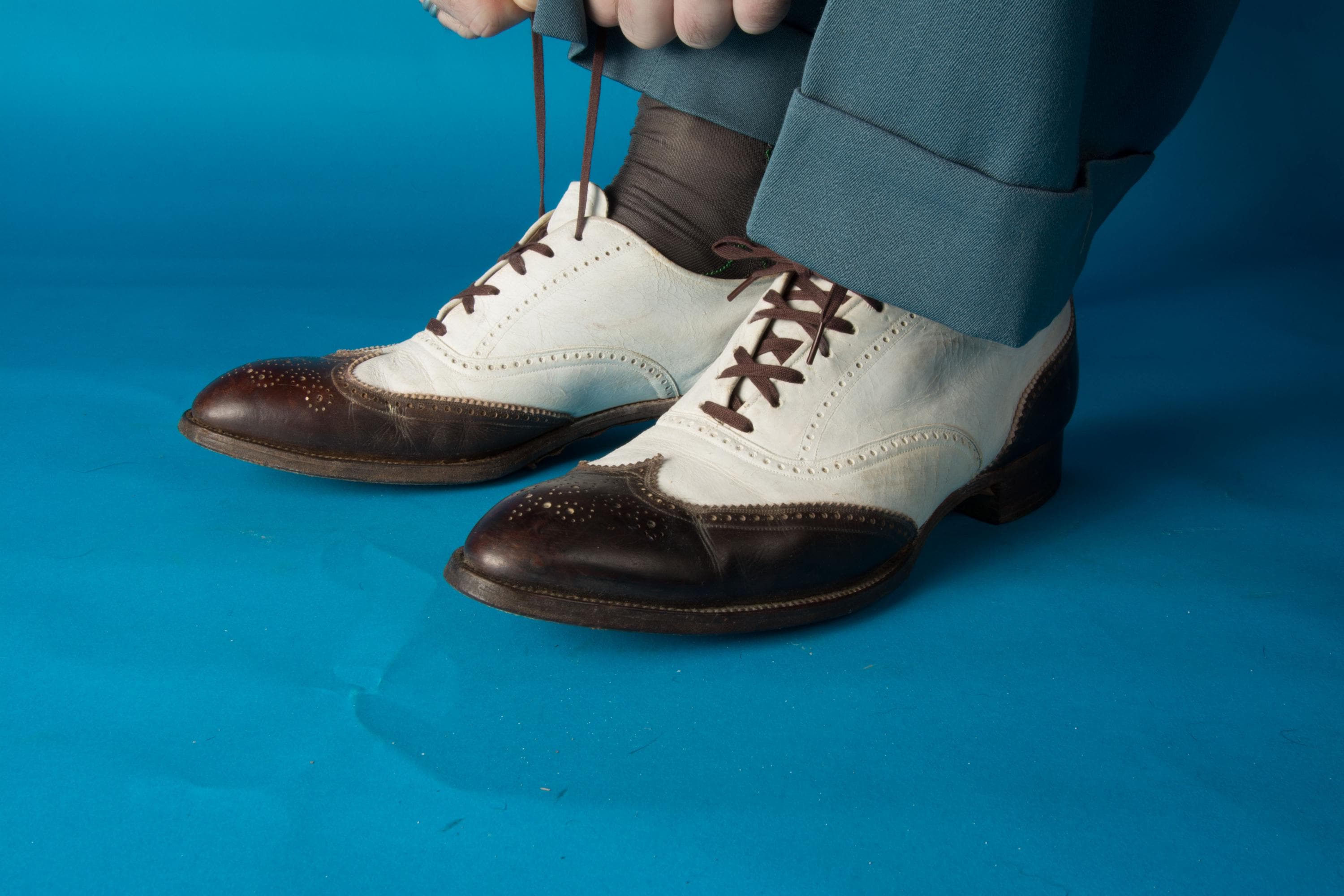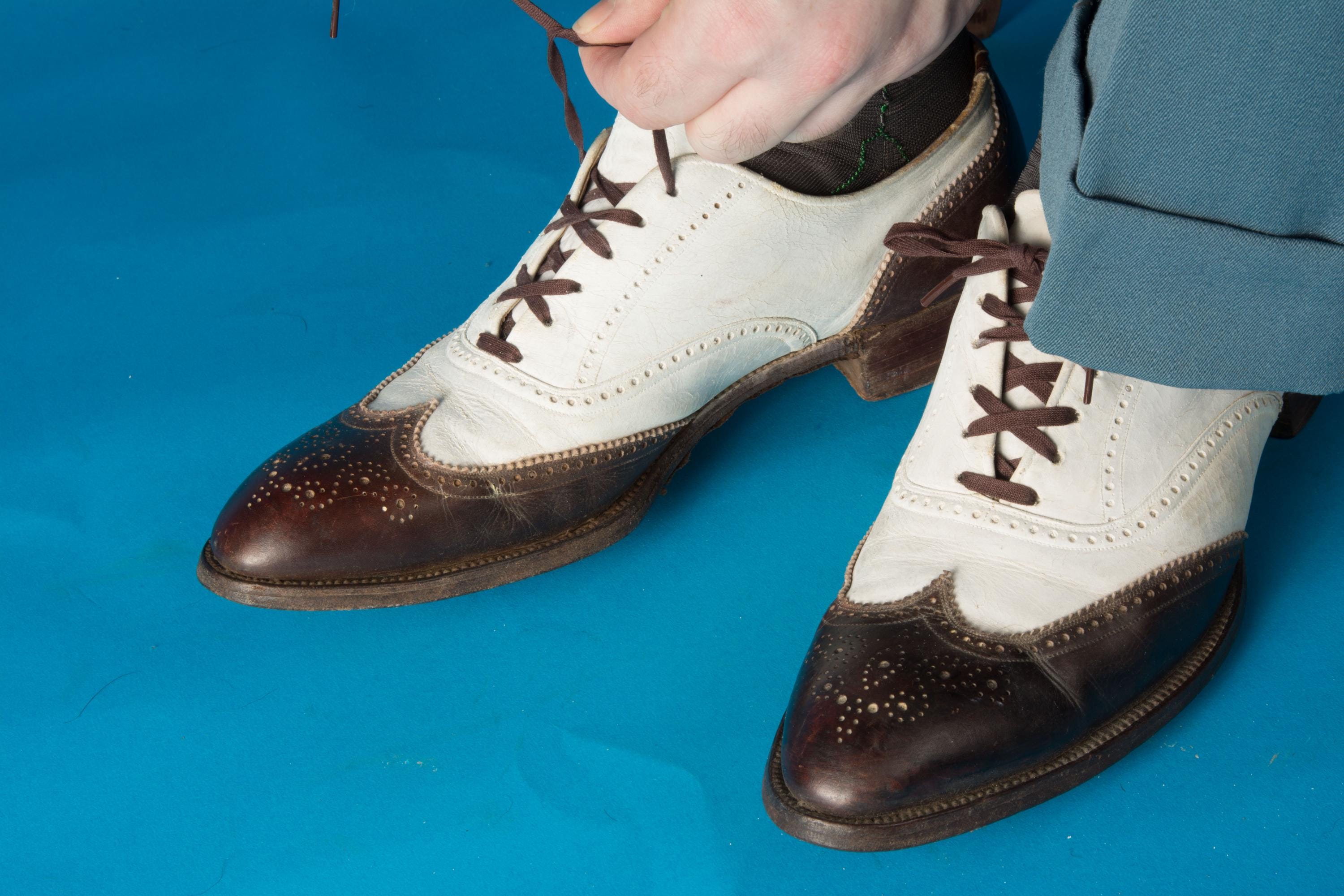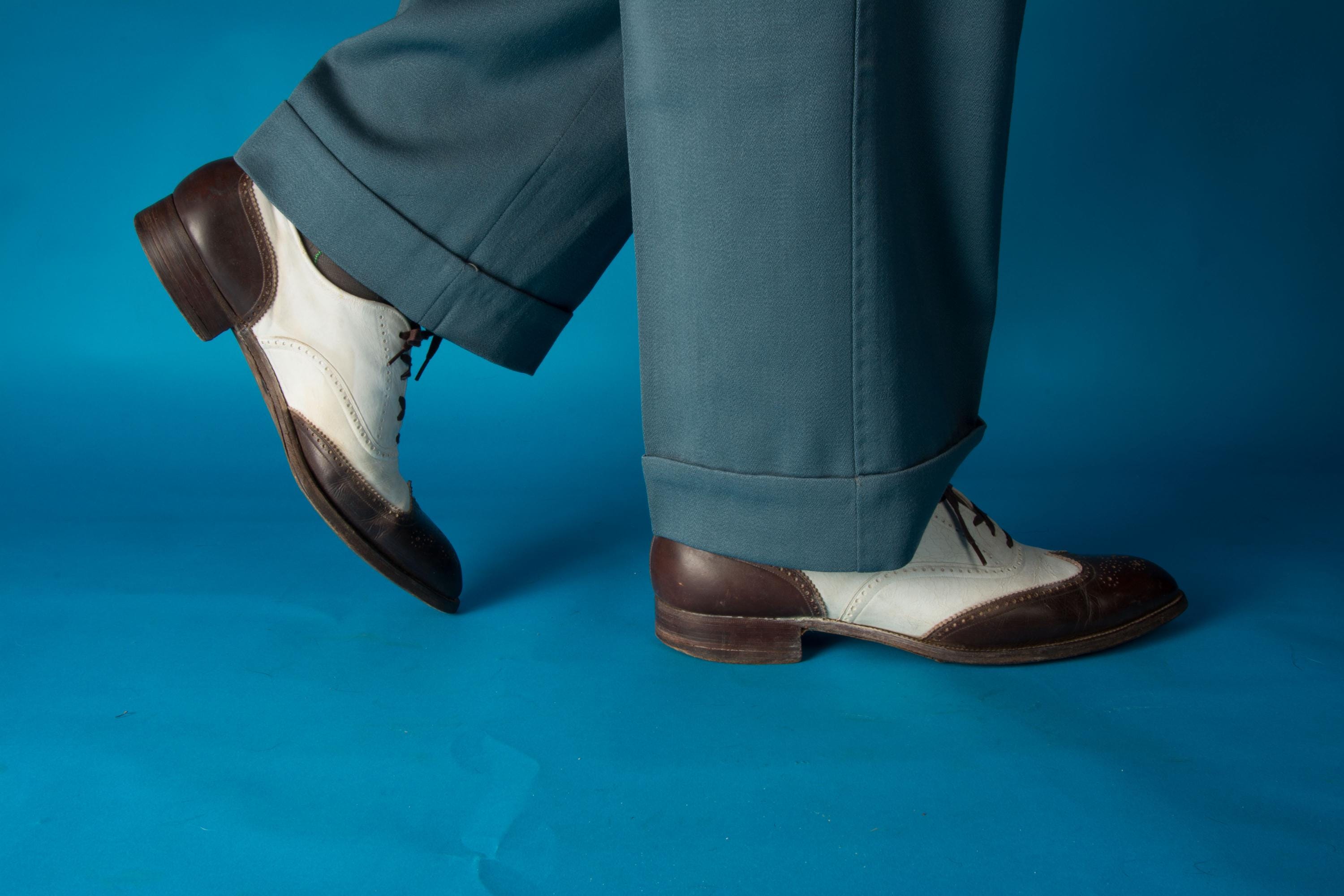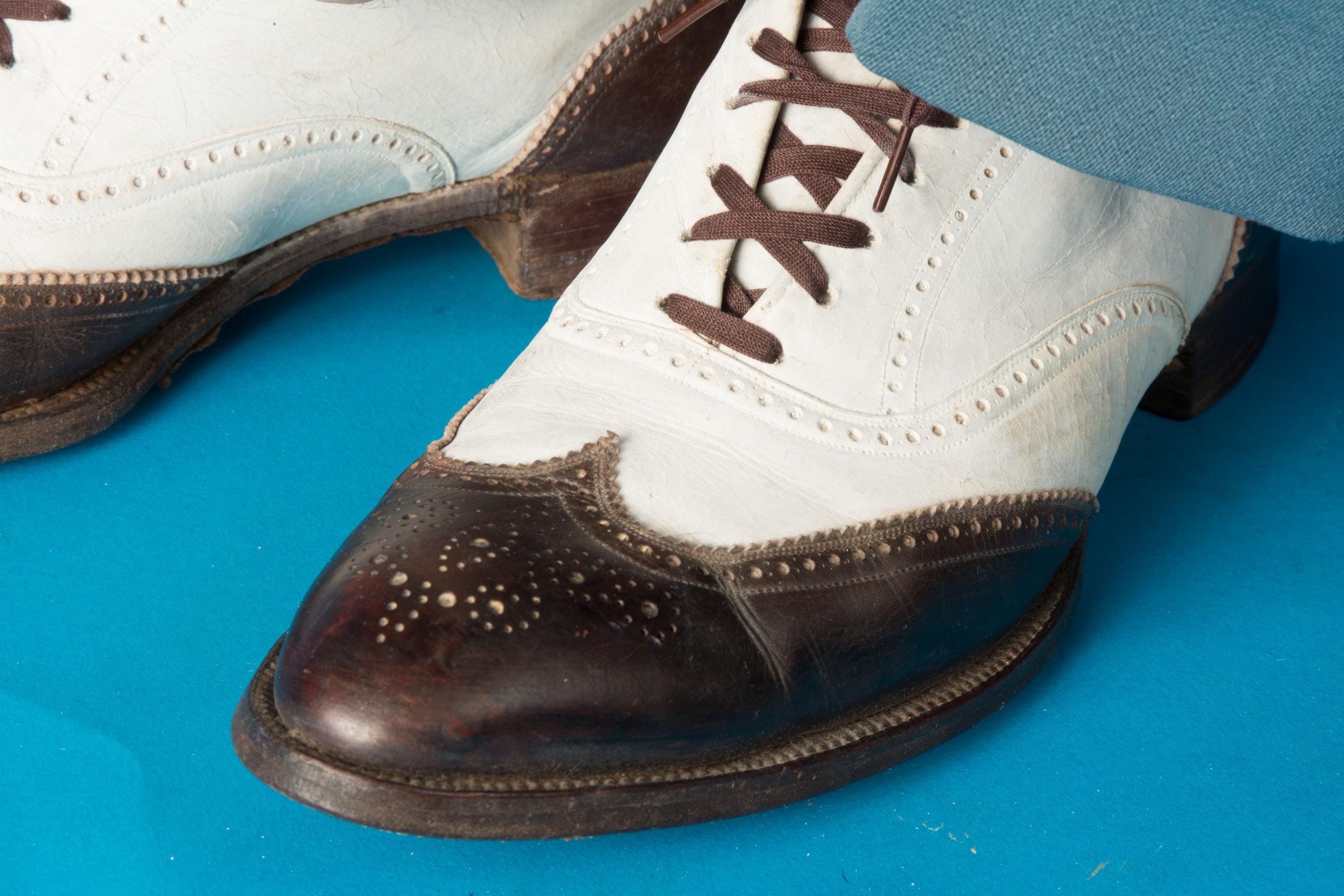 A striking pair of vintage 1930s or 1940s brogued spectators that are really show-stealing. Bright bright and crisply dark brown made a stunning contrast. The brogueing is spectacular - intricate and eye catching. Top stitched welt, and dark contrast laces finish the look. The heels are stacked wood, the soles are leather, insoles are leather and canvas.